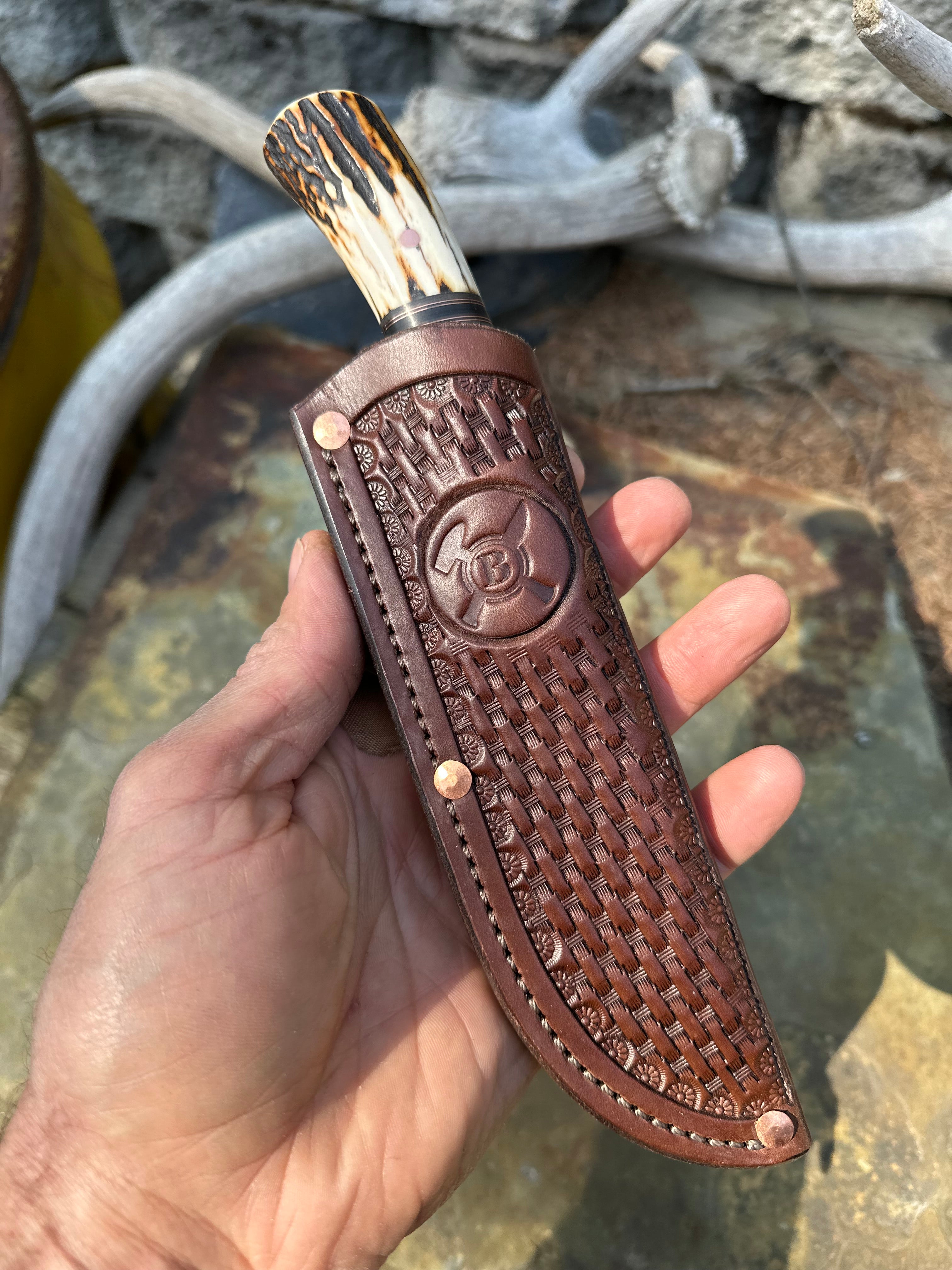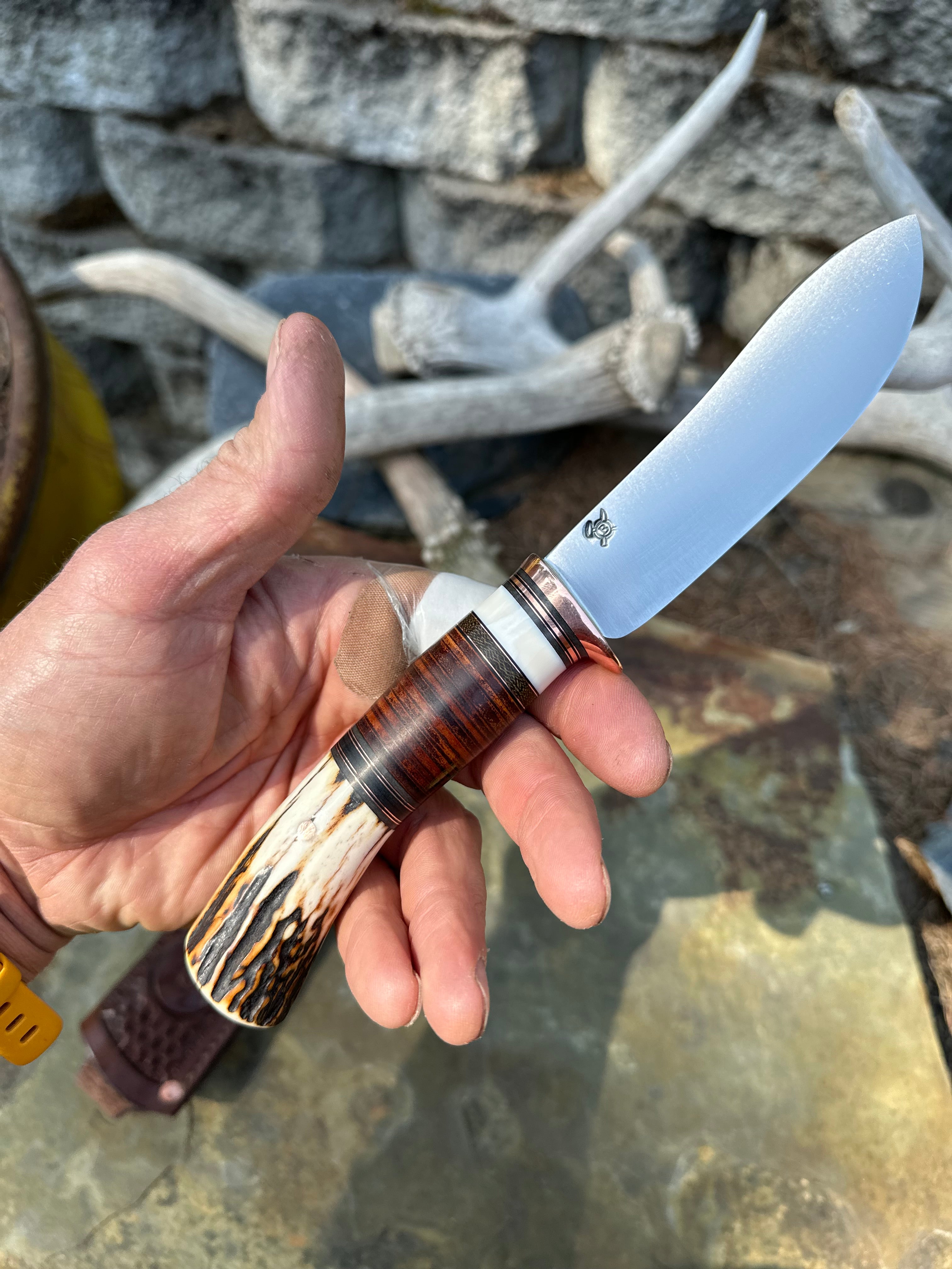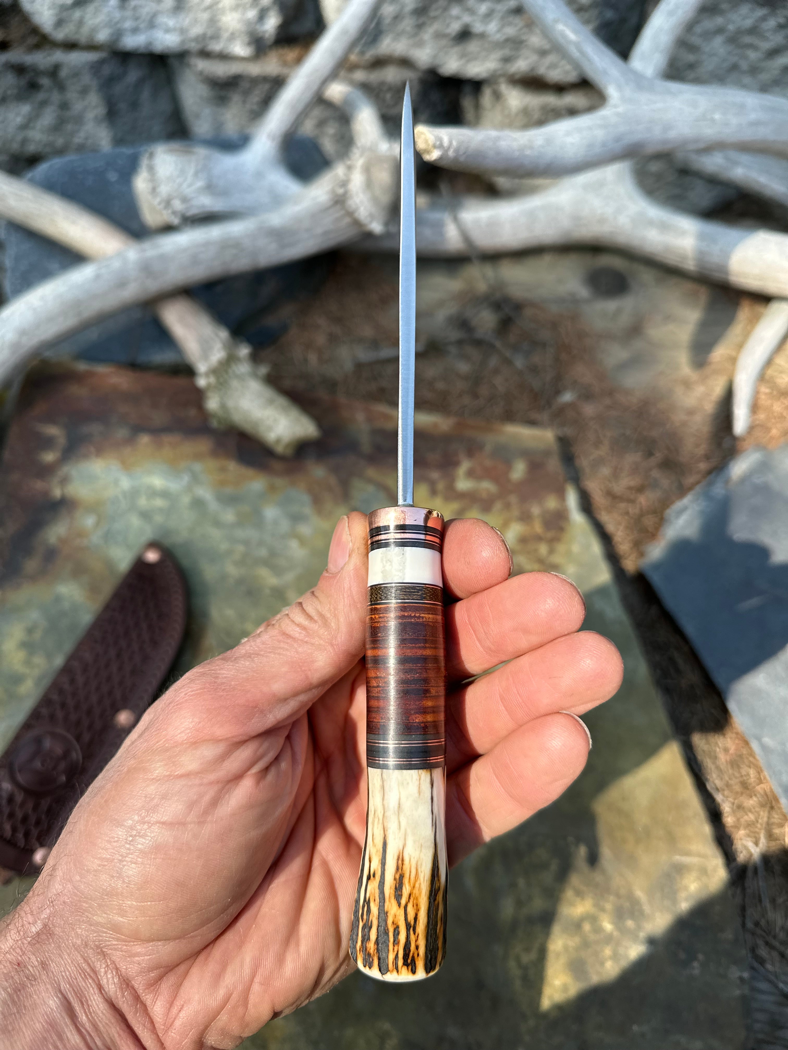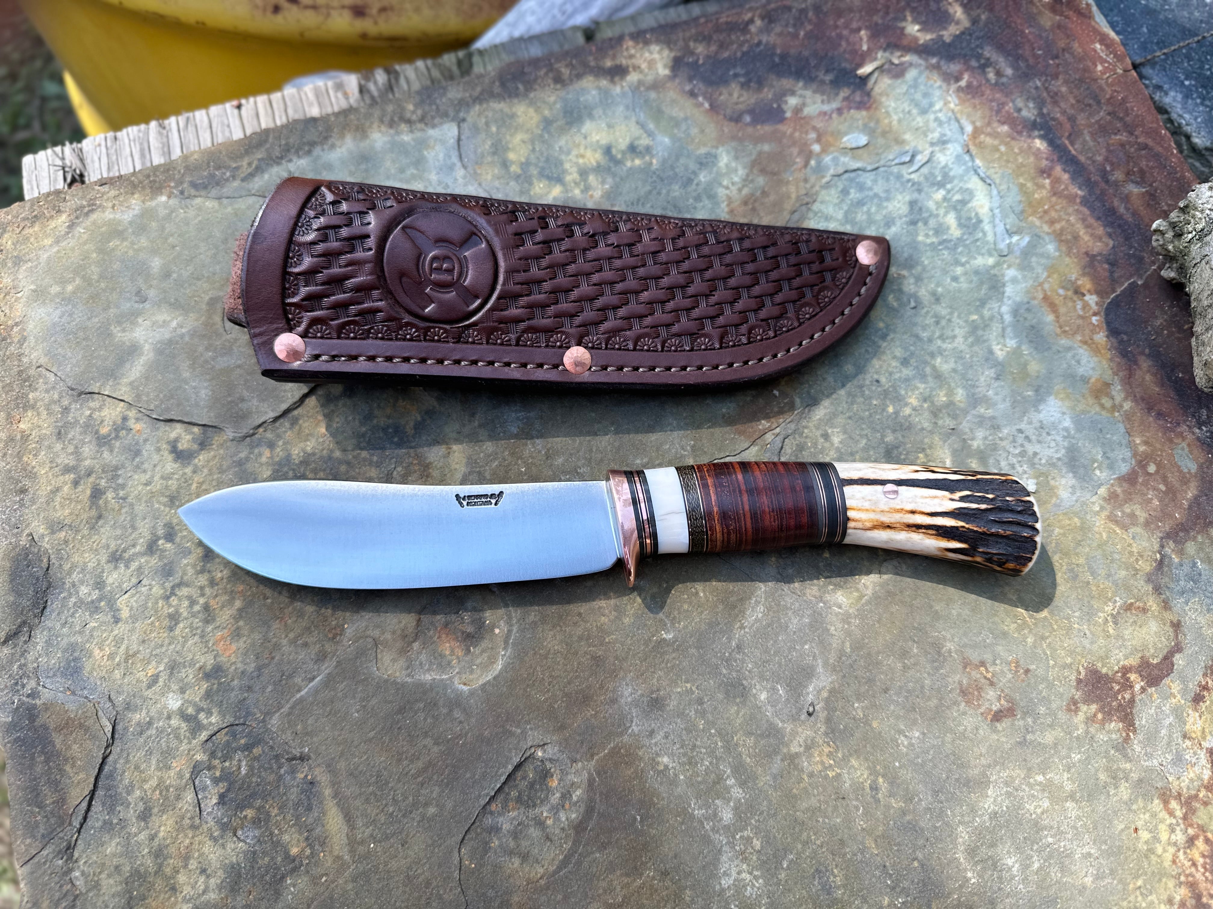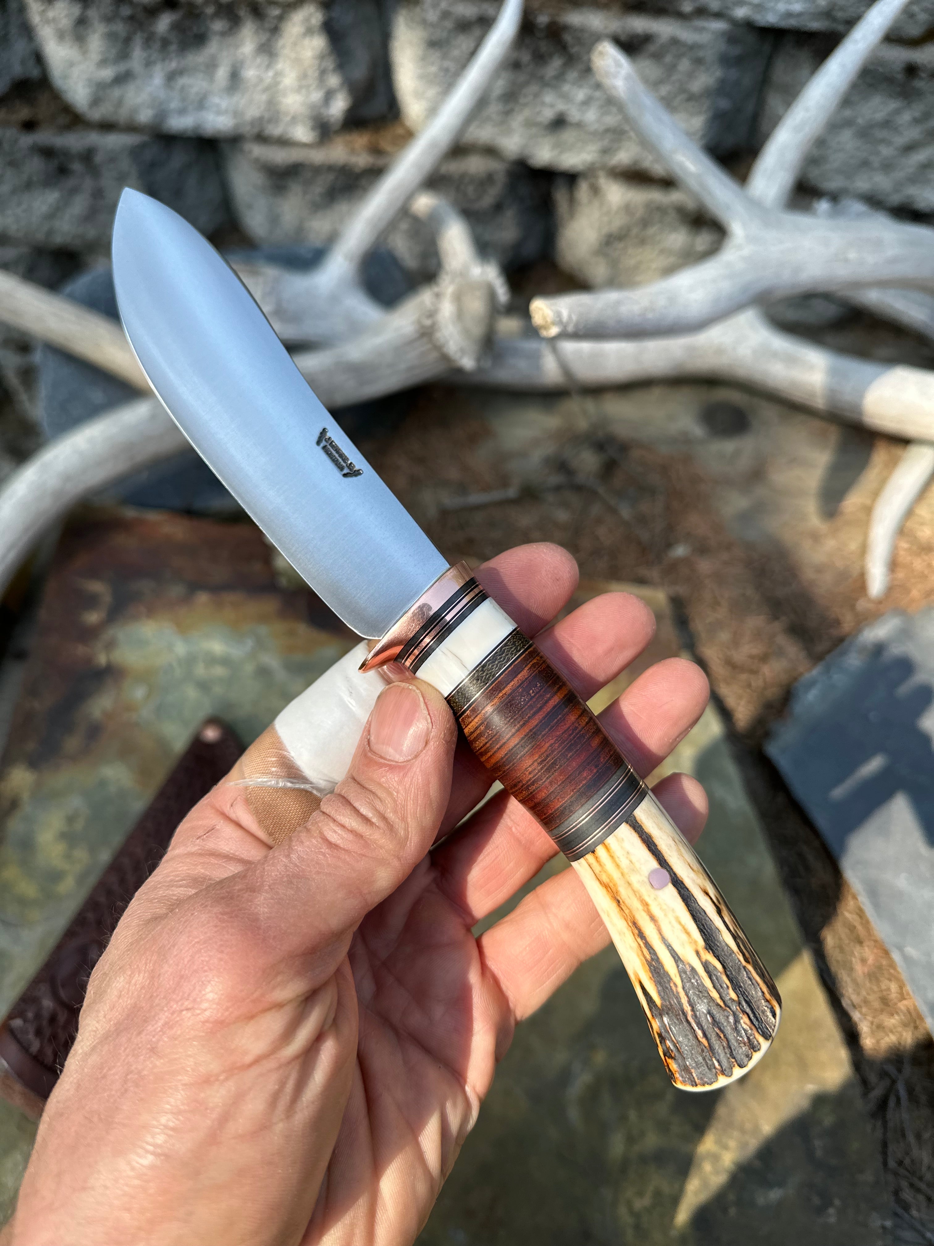 - Black Fiber, Green Micarta, Walrus Ivory, Horsehide, and Copper Handle