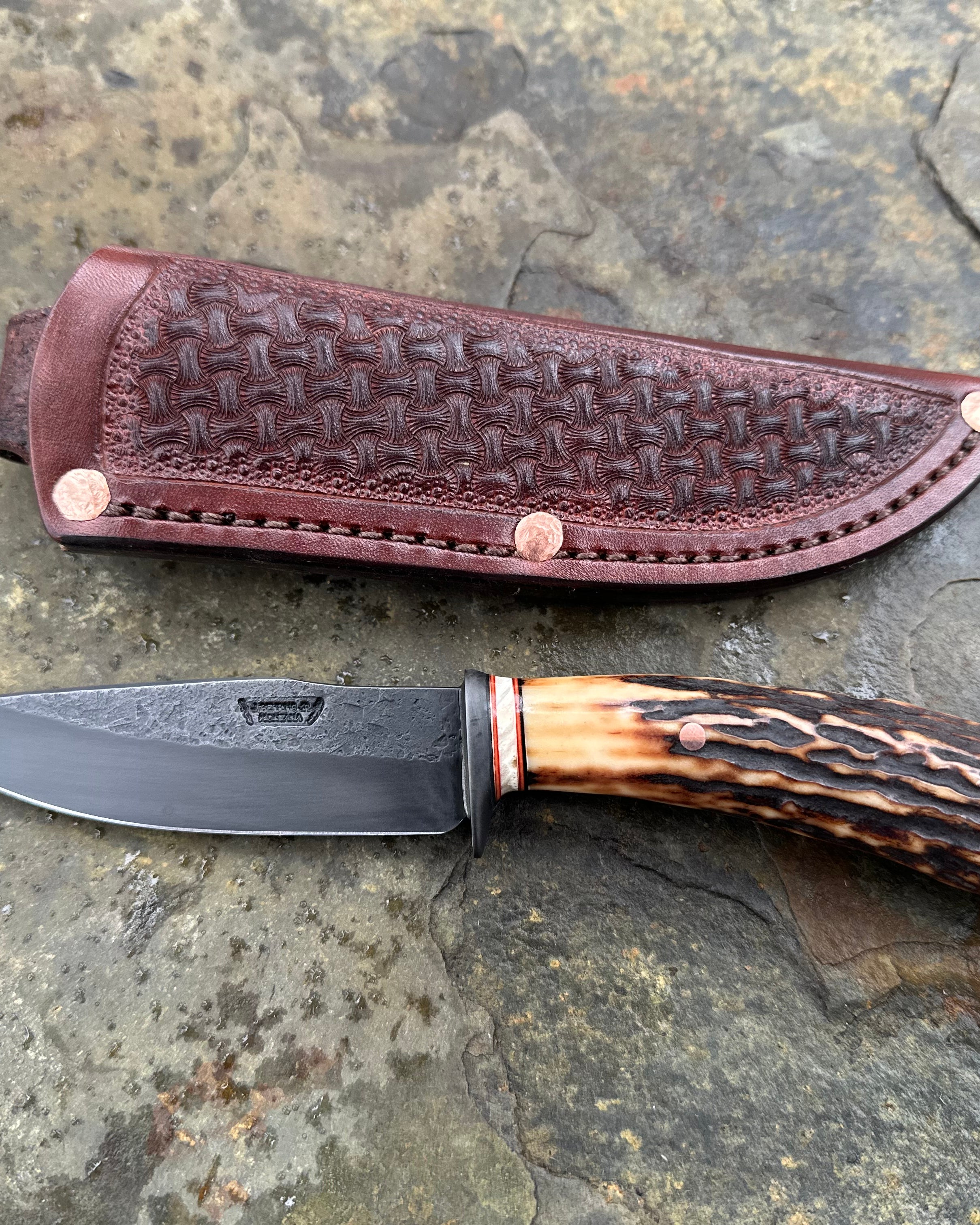 This incredible new Behring Made© Bowie is hand forged from 1/4" thick high carbon 01 tool steel and it measures 9 1/2" from tip to guard with a razor sharp hollow grind and our hammermark finish. The blued steel guard is soldered in place above black fiber, aluminum, copper and fossil walrus ivory spacers with a blued steel sub-hilt that yields a very comfortable grip. The handle is ancient mammoth ivory and pinned through the tang with copper, and we guarantee the construction and materials for life. The overall length measures 14 1/2" and it will come in a custom sheath from Rowe's Leather.