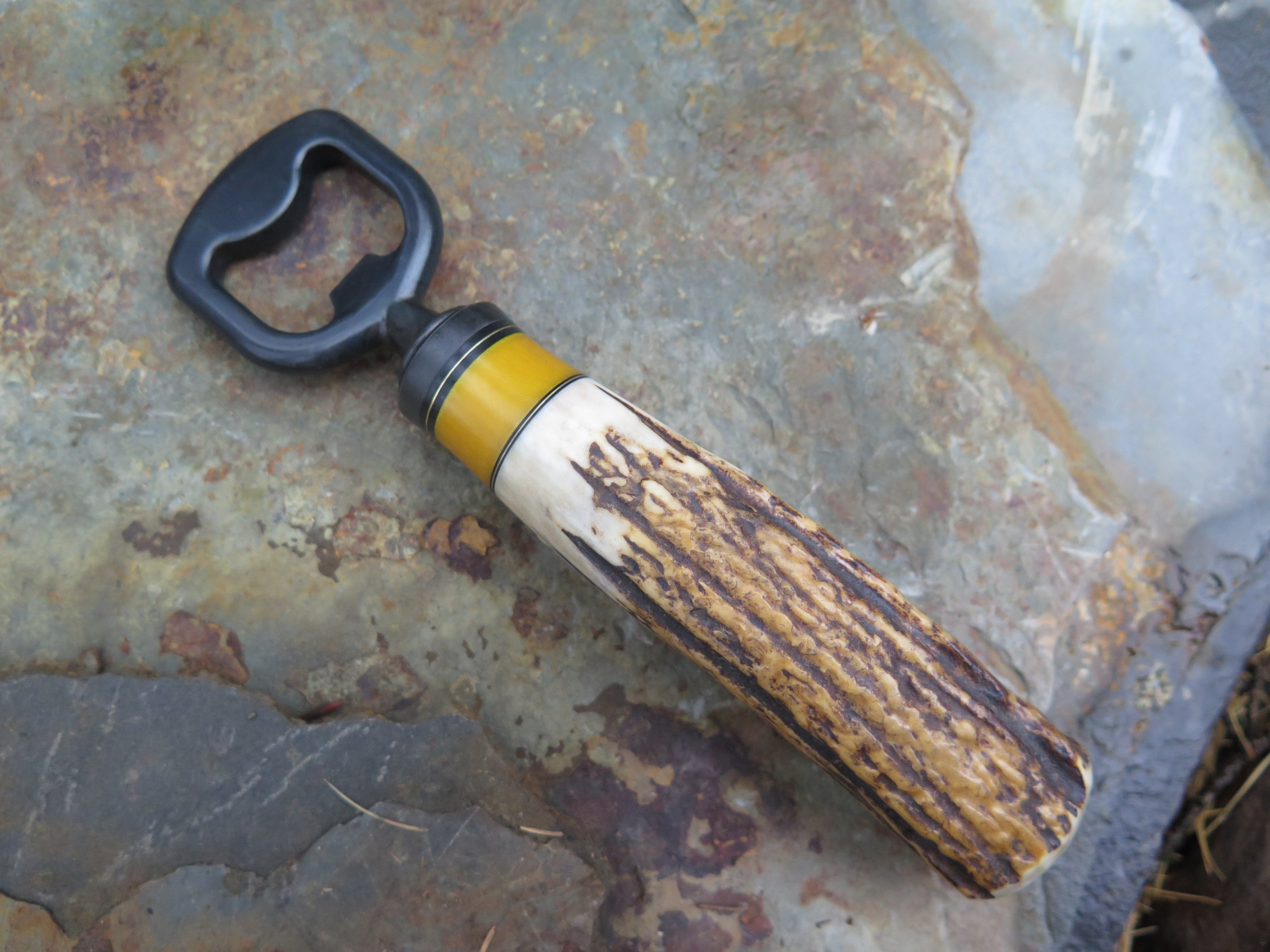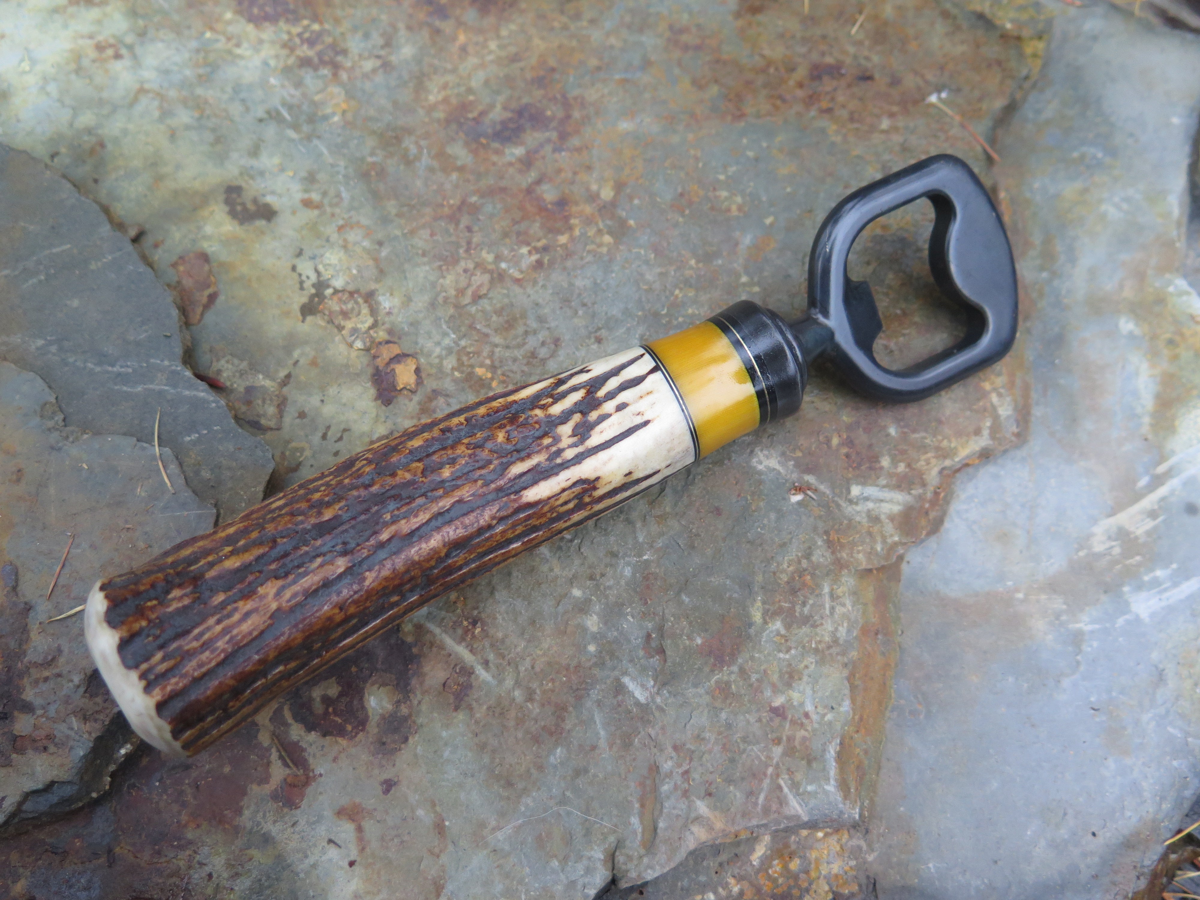Have some respect for the beer you drink, and crack it open in true style with the new Behring Made© bottle opener. It features a robust popper-topper complimented by a stacked set of black fiber, brass and yellow micarta spacers as well as the premium sambar stag handle. You'll find a Behring Made© copper medallion in the butt, making this the perfect gift for the BMK aficionado, plus it comes in a Behring Made© zipper case.