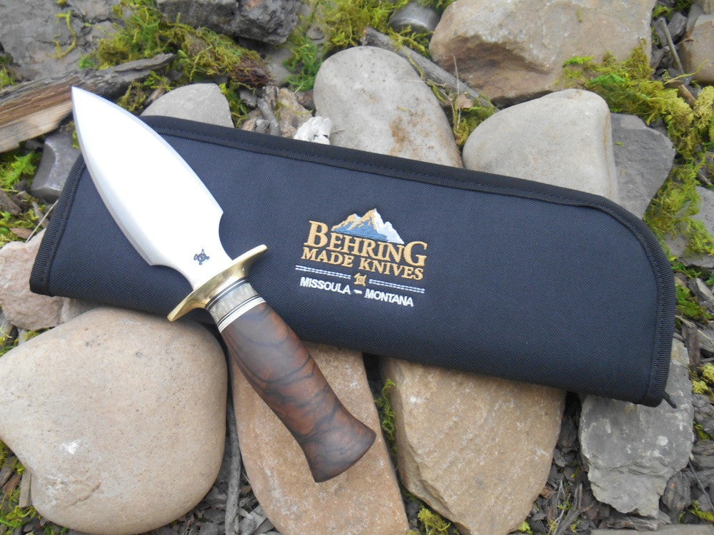 This Behring Made zipper case is ideal for the safe transport and storage of your knives, especially when stored out of their sheath. These are 100% made in America. The exterior is black nylon embroidered with the Behring Made mountain logo, and the interior has a soft fleece lining. Sized by the maker to fit your knife. If you have a size request add order note or email us at behringmadeknives@gmail.com.