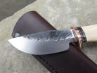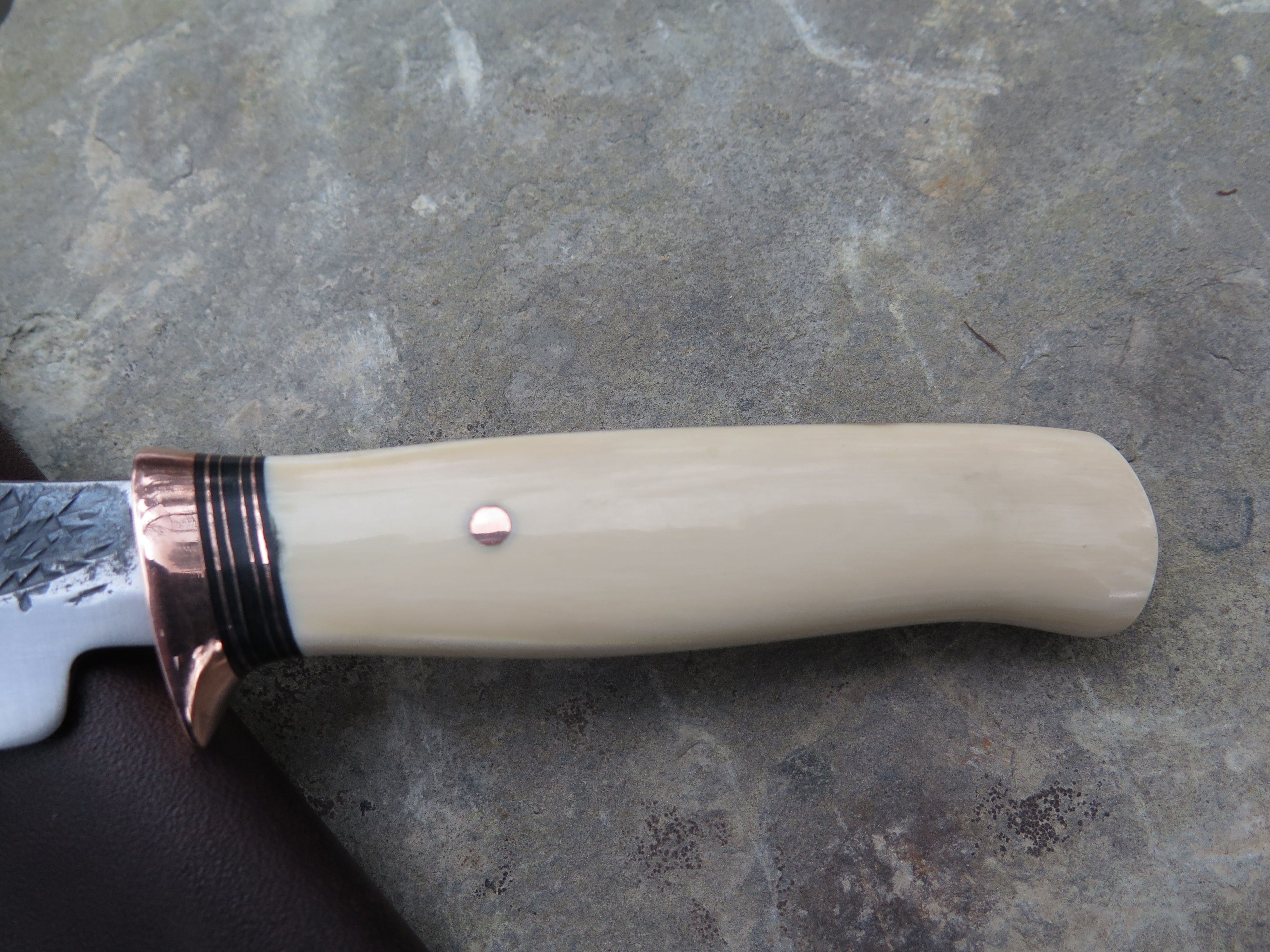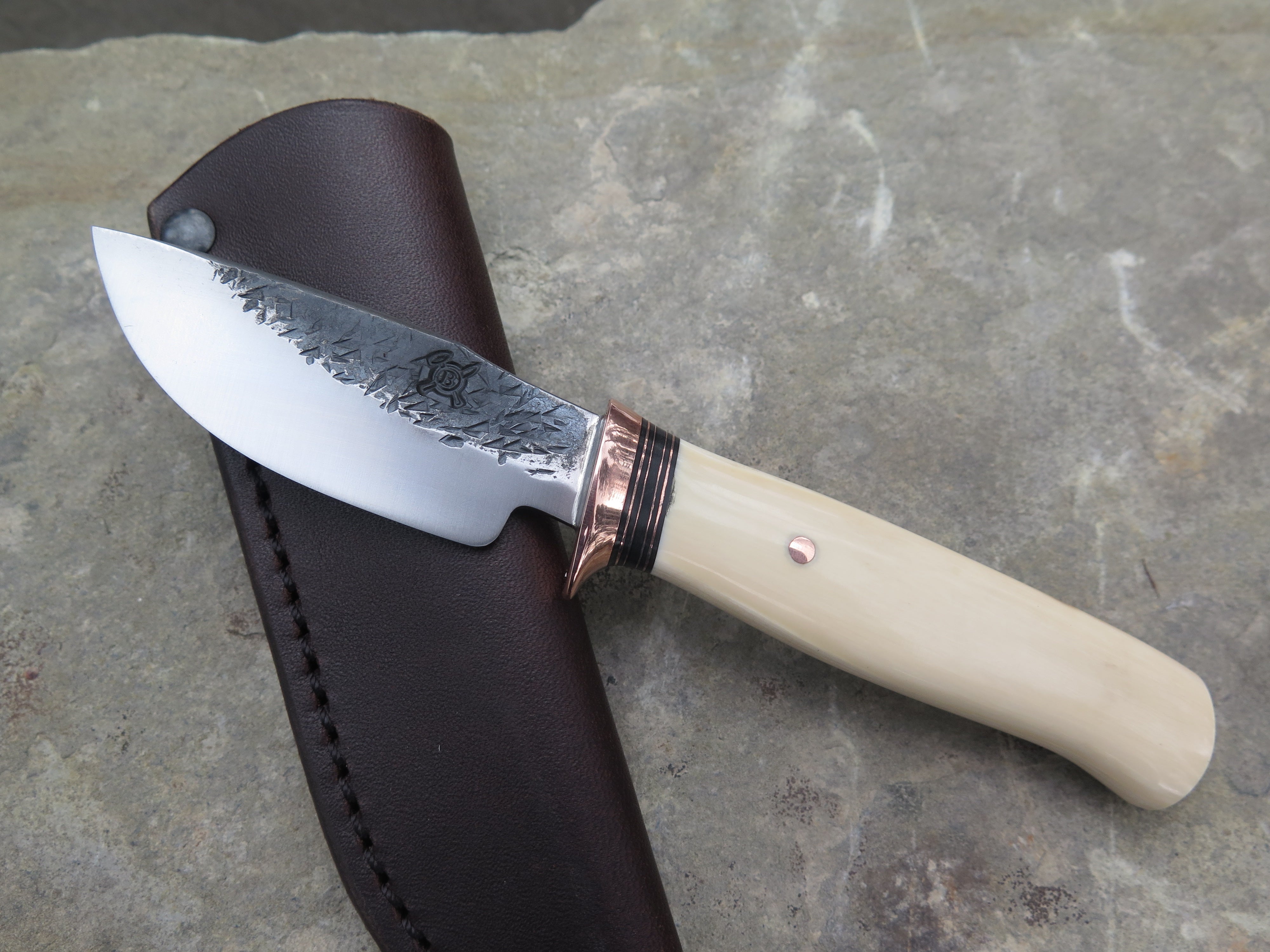 This beautiful Alaskan from Behring Made© is hand forged from 1/8" thick high carbon 01 tool steel and it measures 3" from tip to guard with a razor sharp hollow grind and our hammermark finish. The copper guard is soldered in place above black fiber and copper spacers with an outstanding handle made from ancient mammoth ivory and is pinned through the tang with copper. Overall length measures 6 1/2" and it comes in a classic belt pouch sheath.