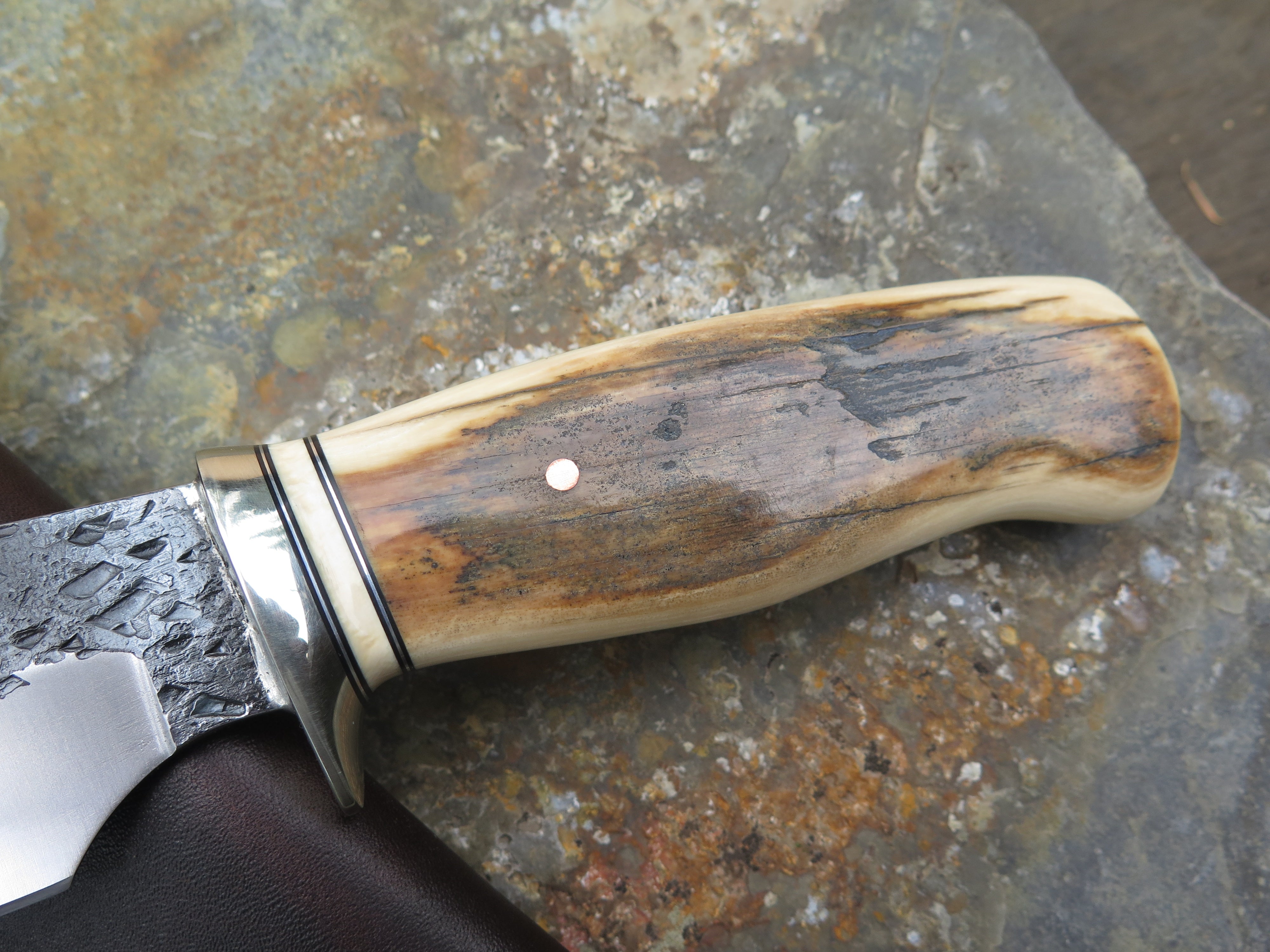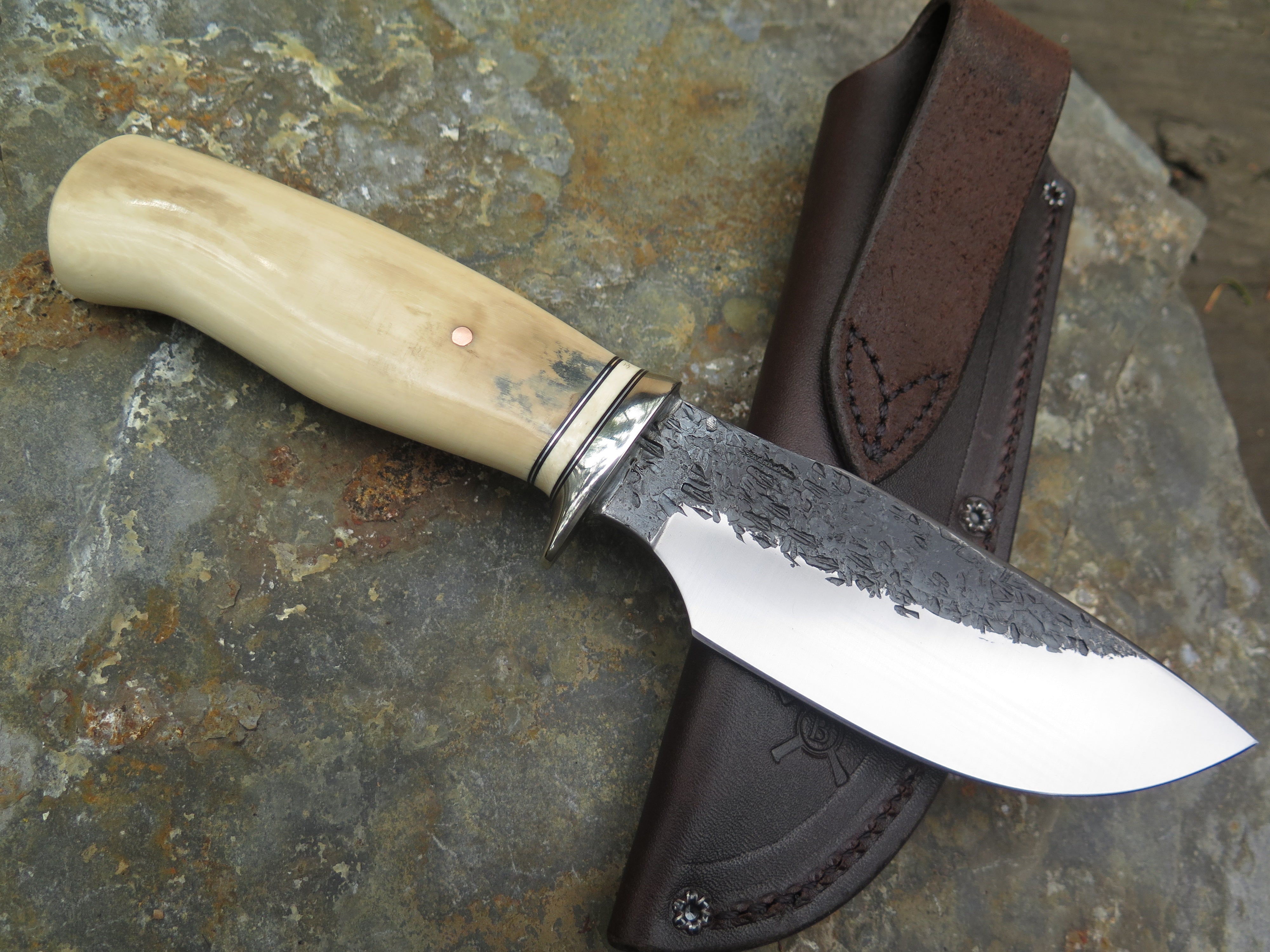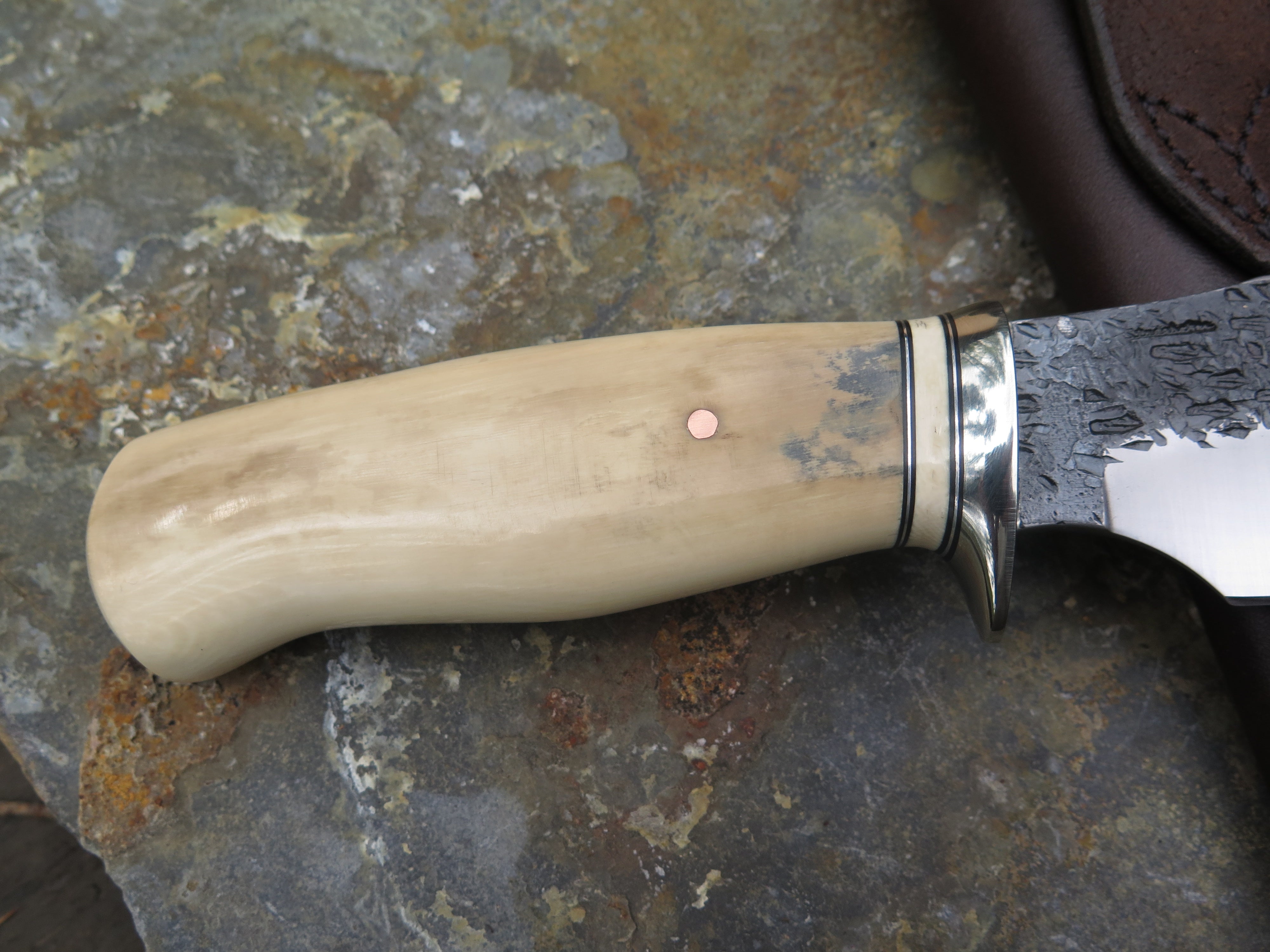 This outstanding new Behring Made© Alaskan is hand forged from Studebaker leaf springs from 1949-51 and it measures 5" from tip to guard with a razor sharp hollow grind and our hammermark finish. The brass guard is soldered in place above black fiber, aluminum and mammoth ivory spacers which top an ancient mammoth ivory handle that is pinned through the tang with copper. The overall length measures 9 3/4" and it comes in a classic leather belt pouch sheath.