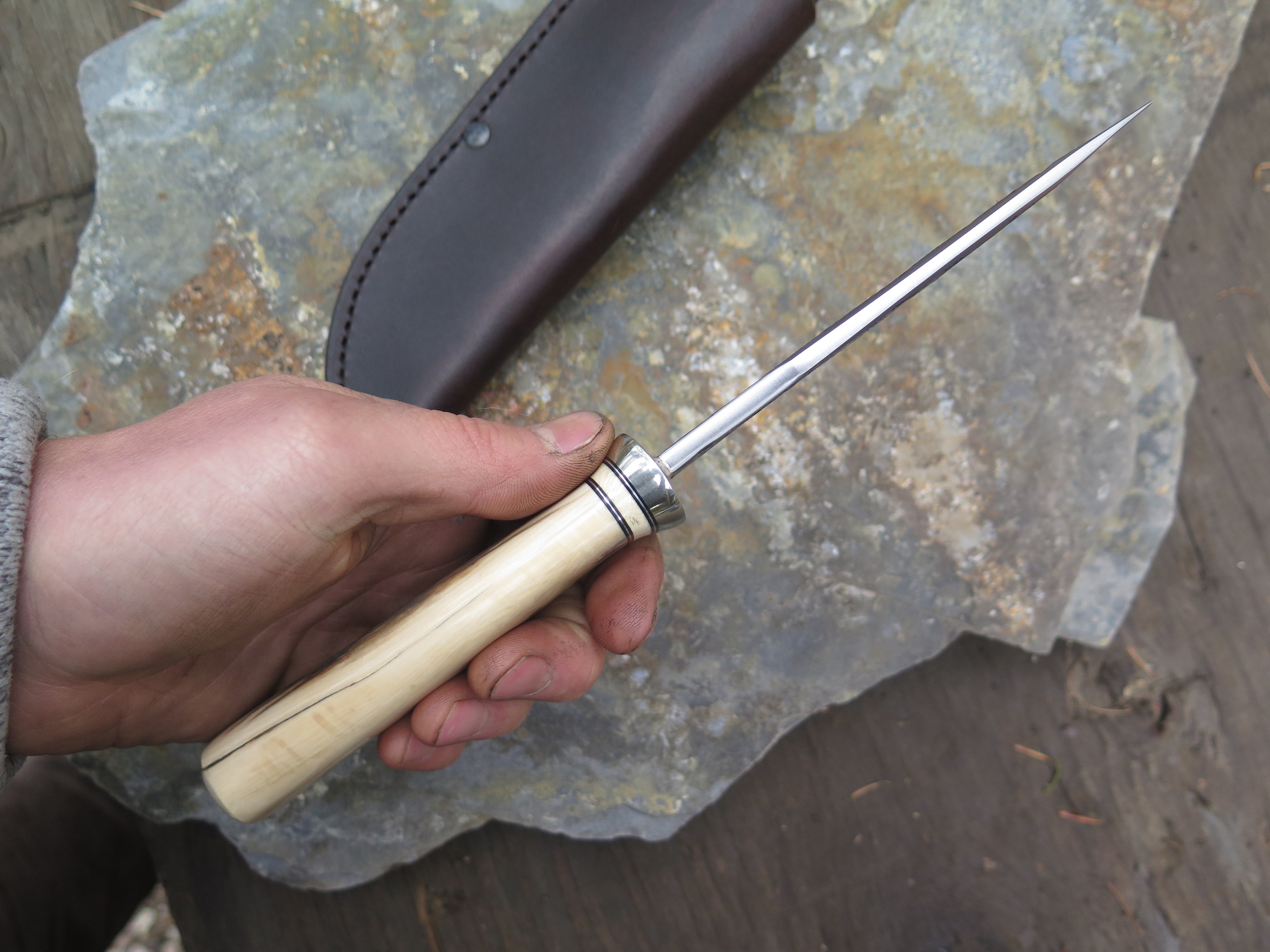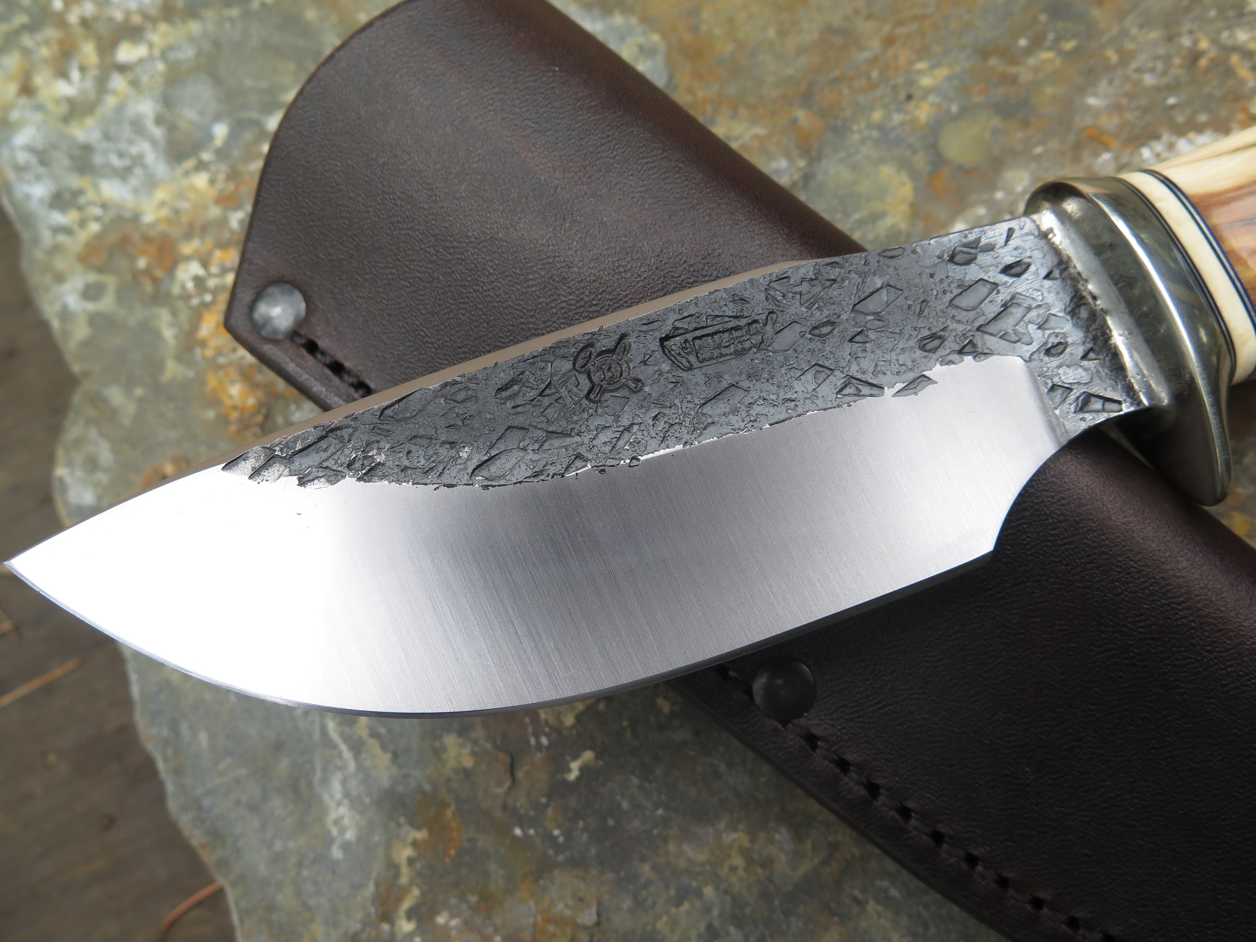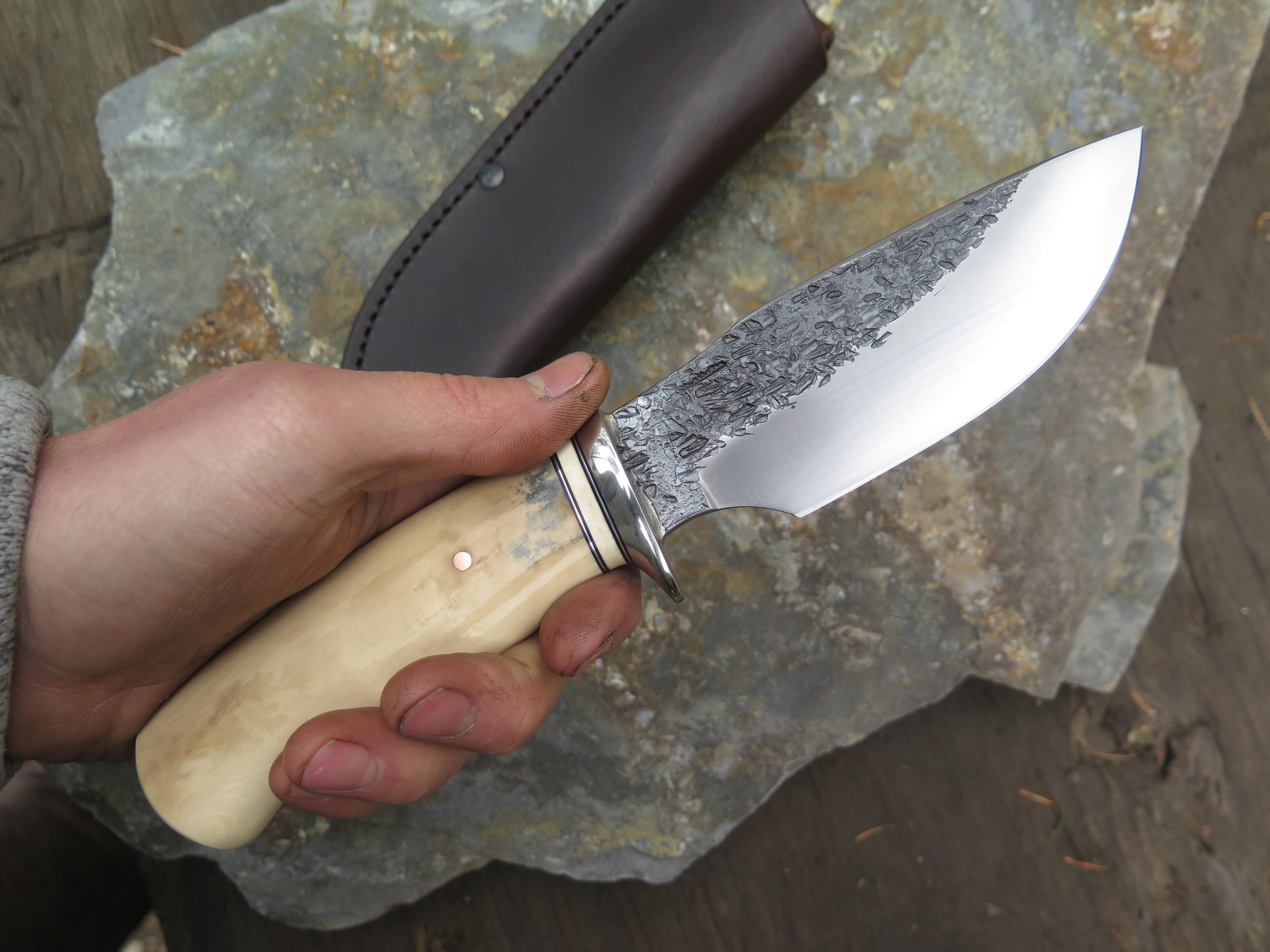 This outstanding new Behring Made© Alaskan is hand forged from Studebaker leaf springs from 1949-51 and it measures 5" from tip to guard with a razor sharp hollow grind and our hammermark finish. The brass guard is soldered in place above black fiber, aluminum and mammoth ivory spacers which top an ancient mammoth ivory handle that is pinned through the tang with copper. The overall length measures 9 3/4" and it comes in a classic leather belt pouch sheath.