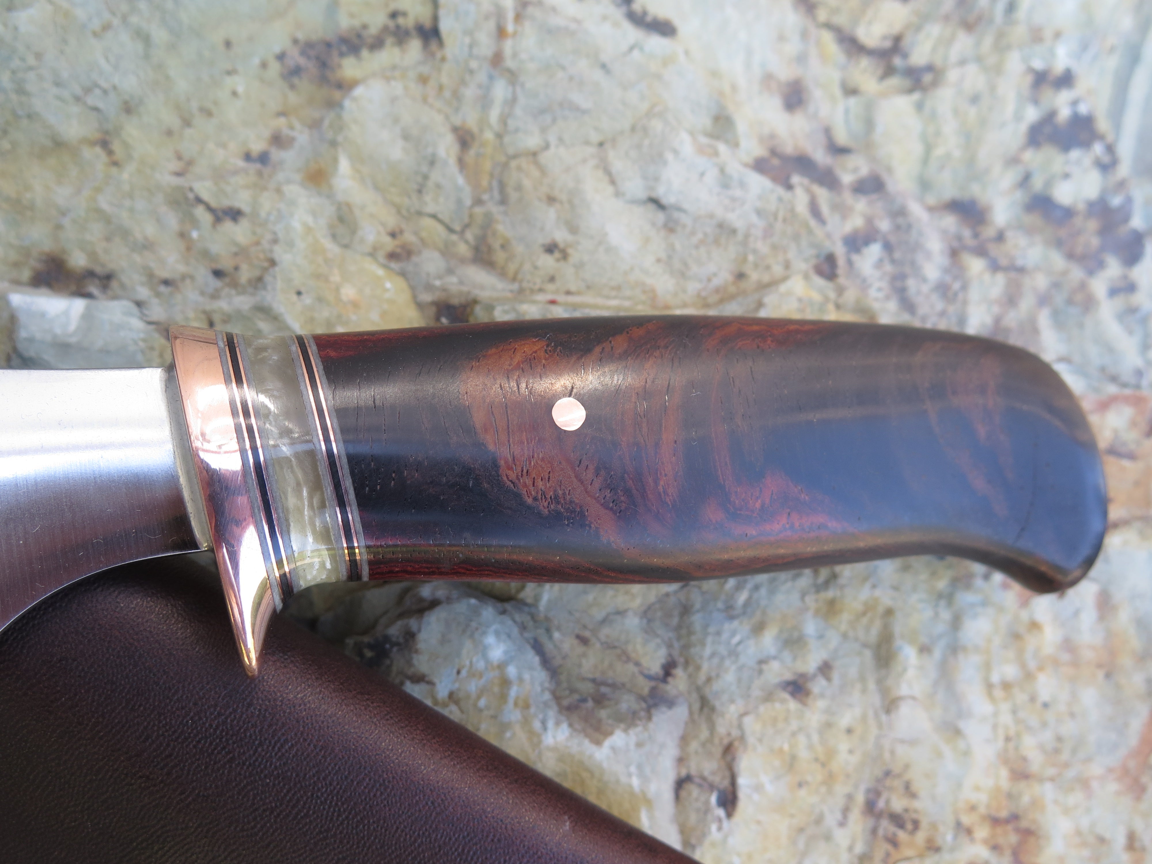 This outstanding new Alaskan from Behring Made© is hand forged from 3/16" thick high carbon 01 tool steel and it measures 4" from tip to guard with a razor sharp convex grind. The copper guard is soldered in place above black and gray fiber, copper and musk ox boss spacers that make a wonderful contrast against the premium cocobolo wood handle that's pinned through the tang with copper. The overall length measures 8 3/8" and it comes guaranteed for life in a premium leather belt pouch sheath.