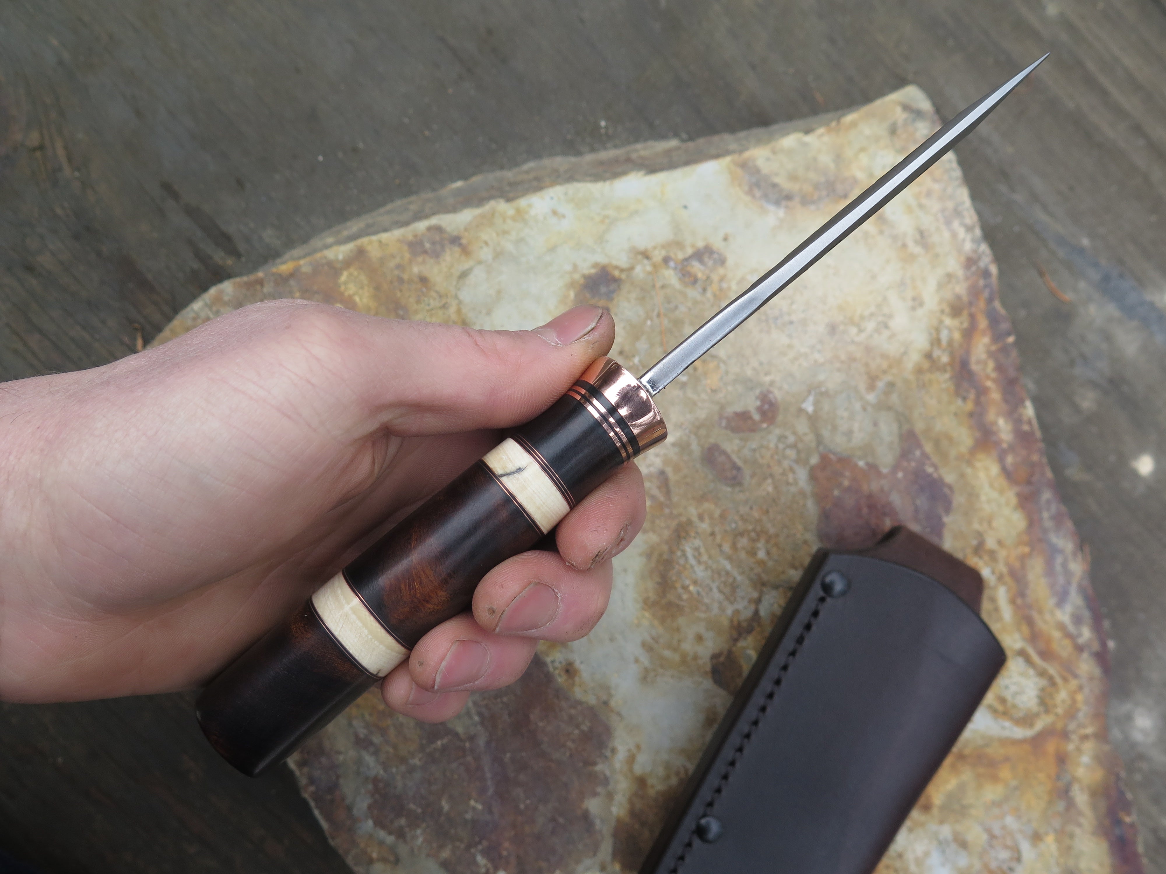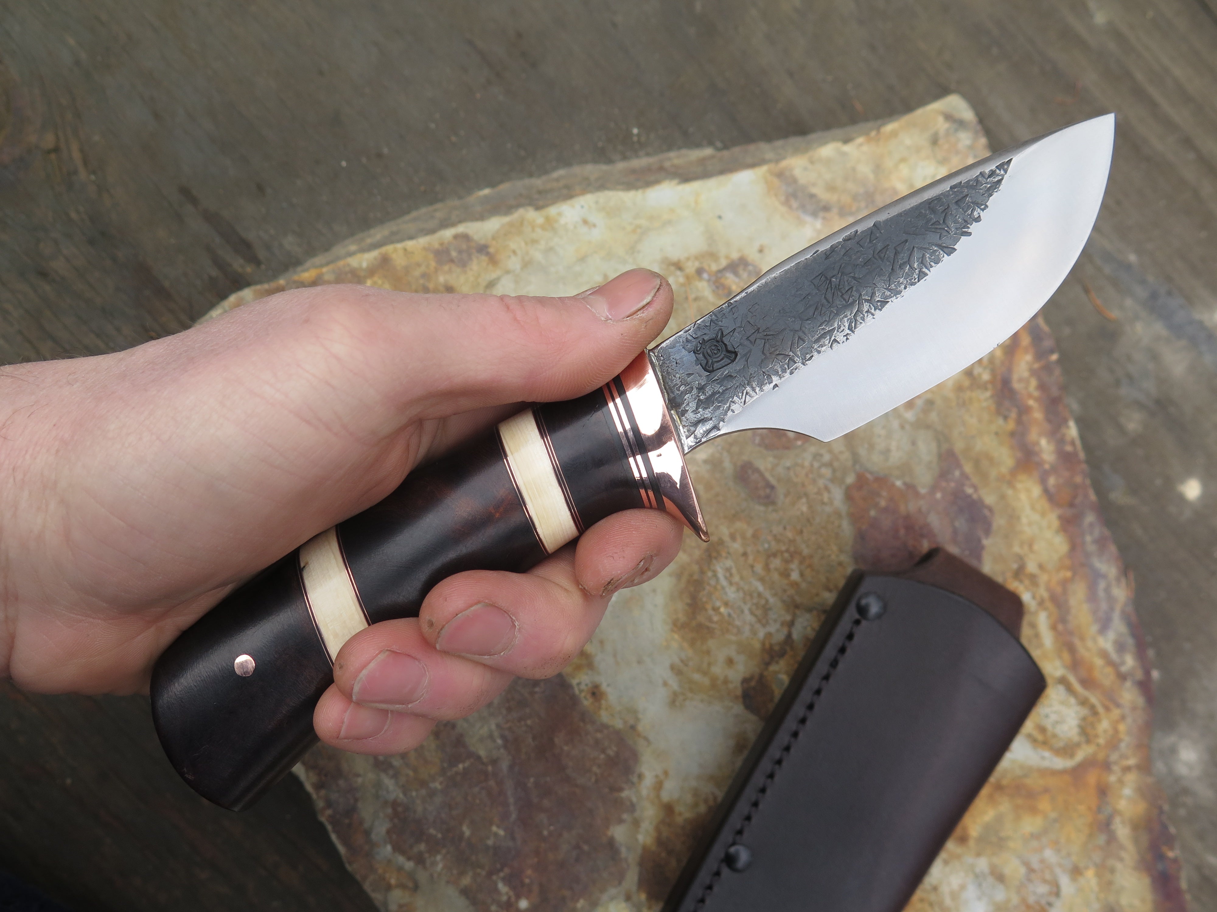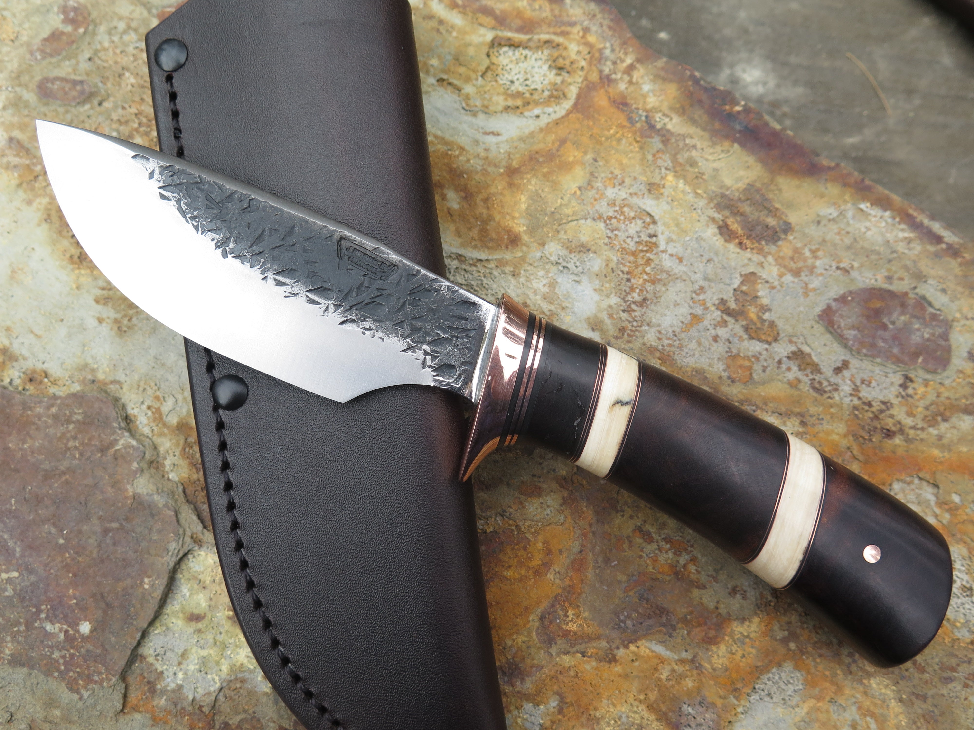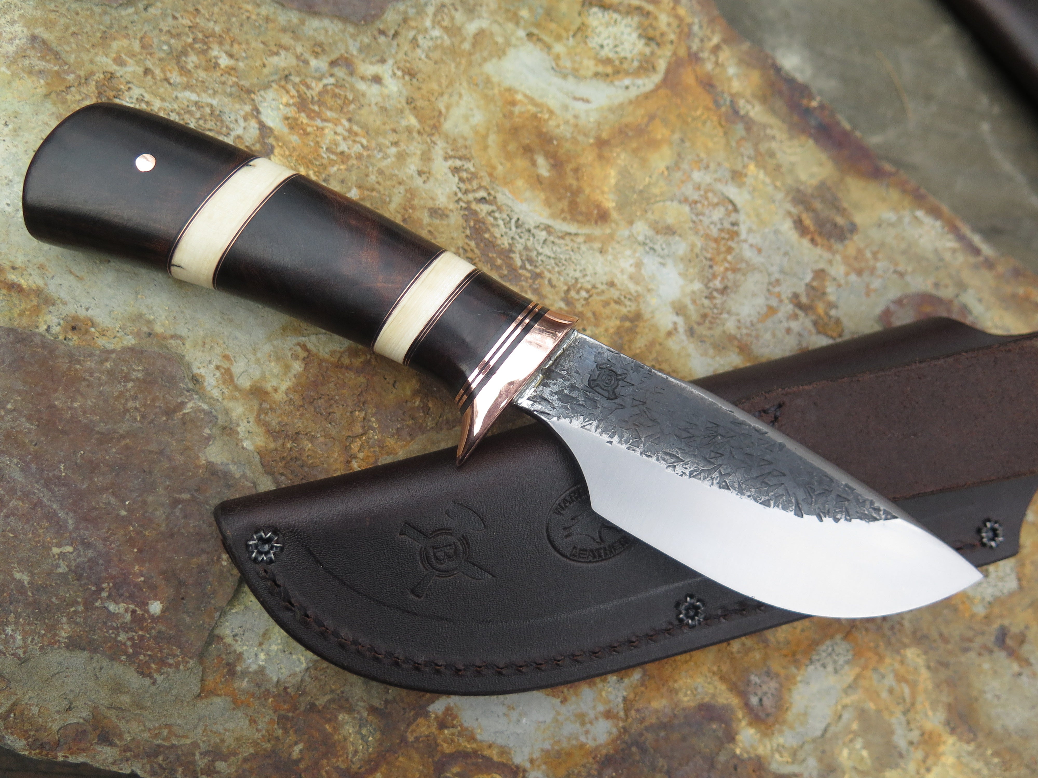 This incredible new Alaskan from Behring Made© is hand forged from 3/16" thick high carbon 01 tool steel and it measures 4 1/2" from tip to guard with a razor sharp hollow grind and our hammermark finish. The copper guard is soldered in place above black and copper spacers with an array of intense desert ironwood burl and contrasting accents of ancient mammoth ivory spacers to boot. The butt is pinned through the tang with copper and overall length rings in at 8 7/8". This one comes in a leather belt pouch sheath and we guarantee it for life.