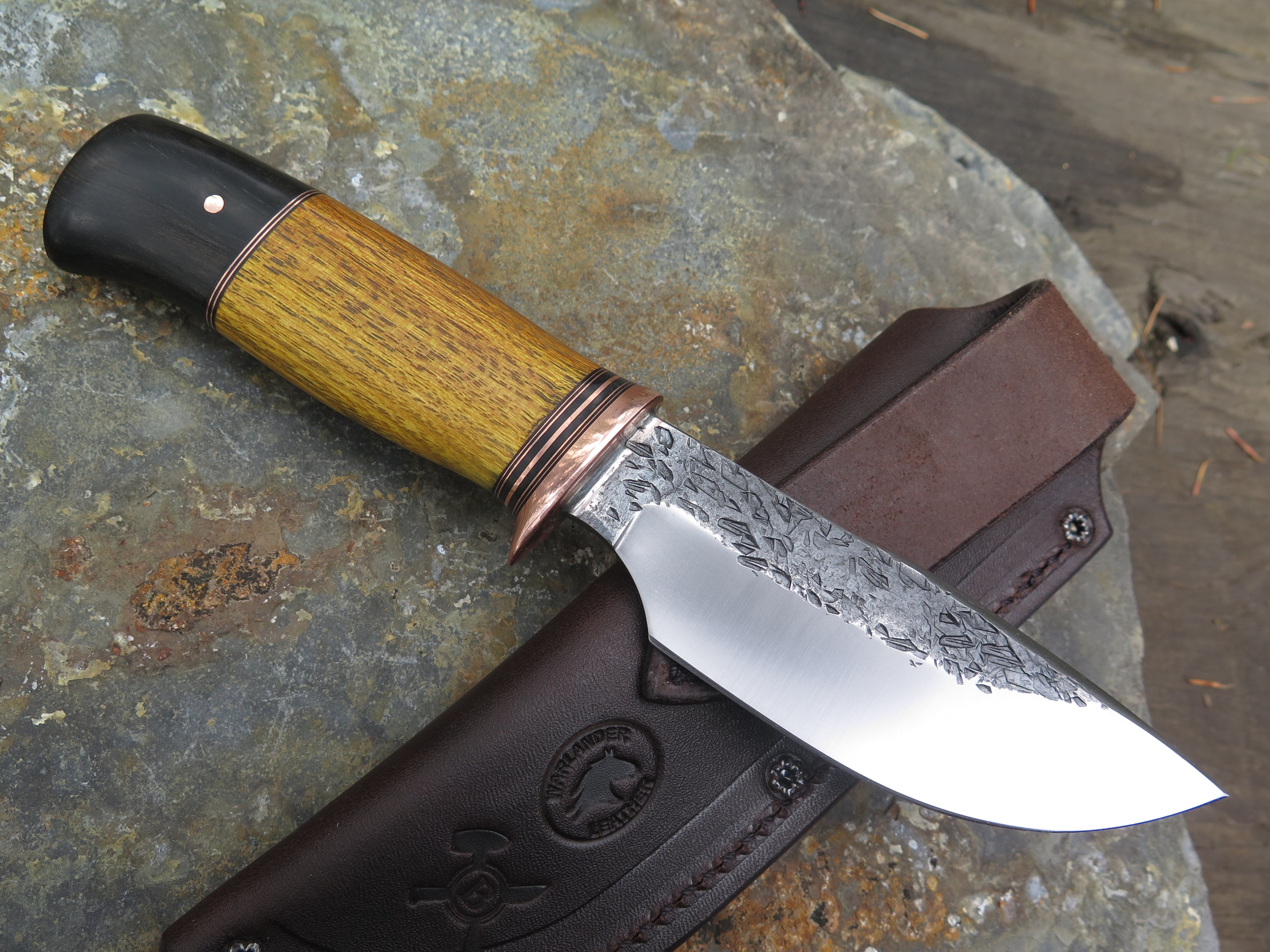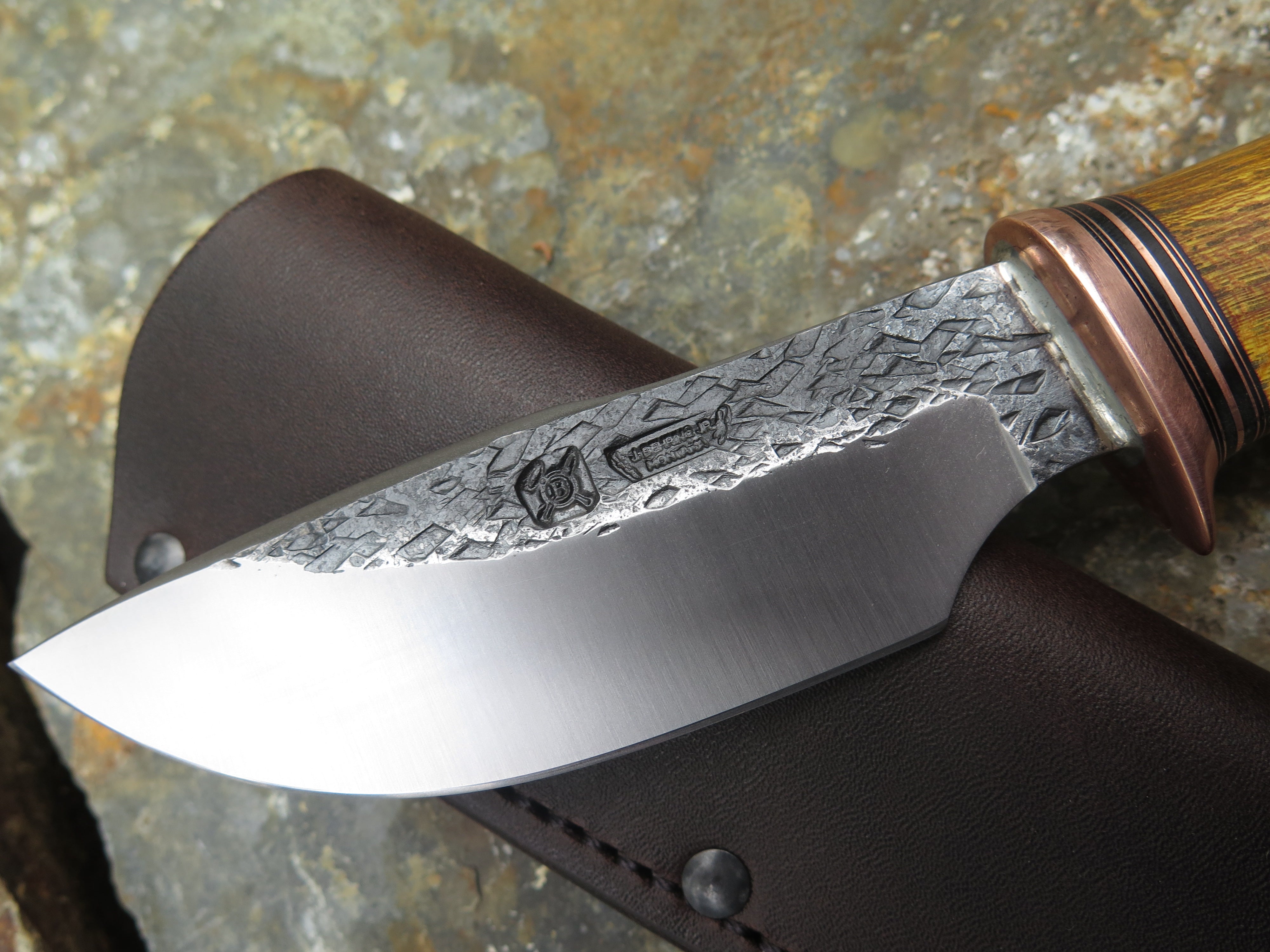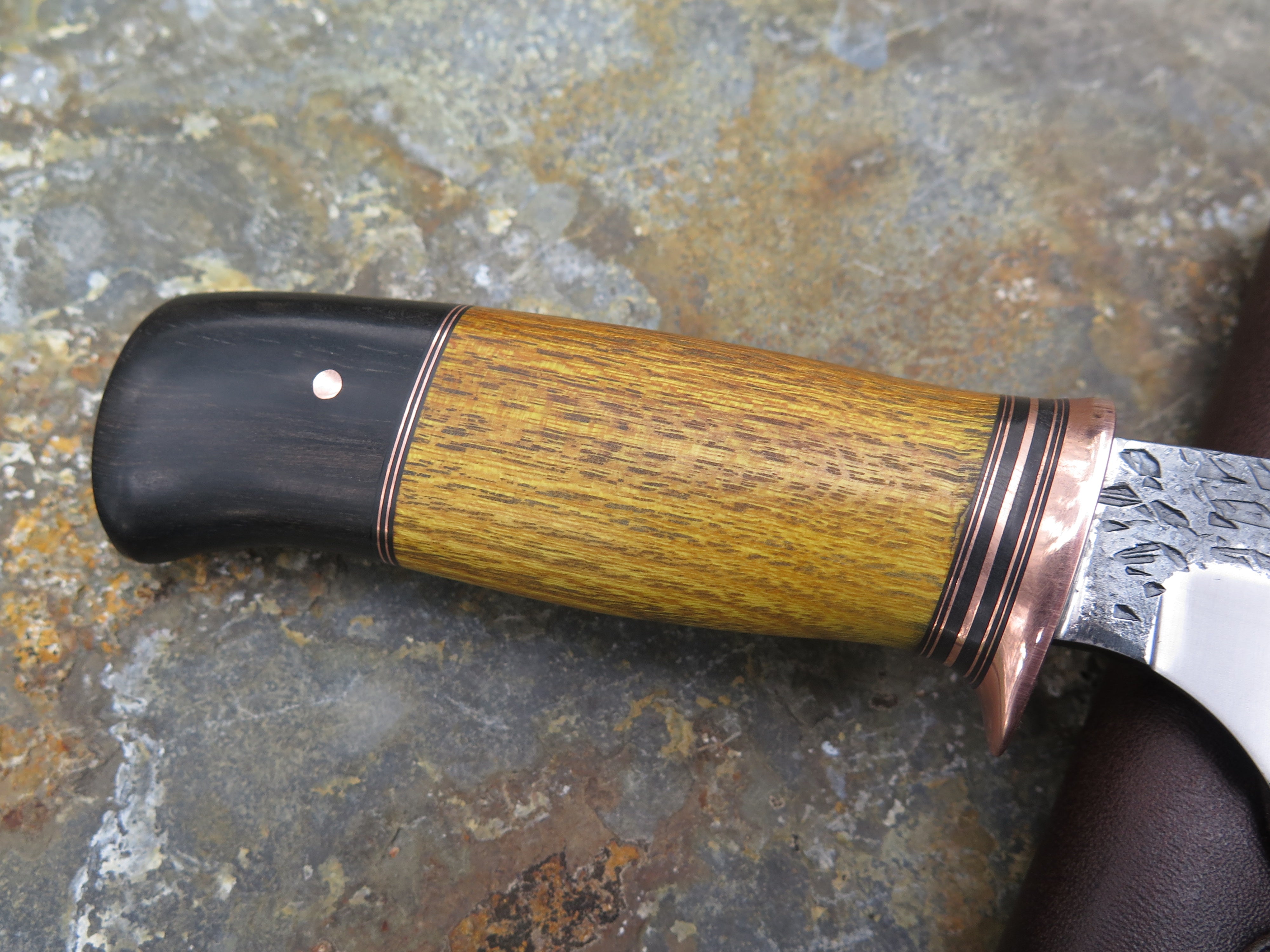 This purty new Alaskan from Behring Made© is hand forged from 3/16" thick high carbon 01 tool steel and it measures 4 3/4" from tip to guard with a razor sharp hollow grind and our hammermark finish. The copper guard is soldered in place above black fiber and copper spacers with a two-piece construction of beautiful osage and ebony hardwoods, which is pinned through the tang with copper. The overall length measures 9 3/8" and it comes in a brown leather belt pouch sheath.