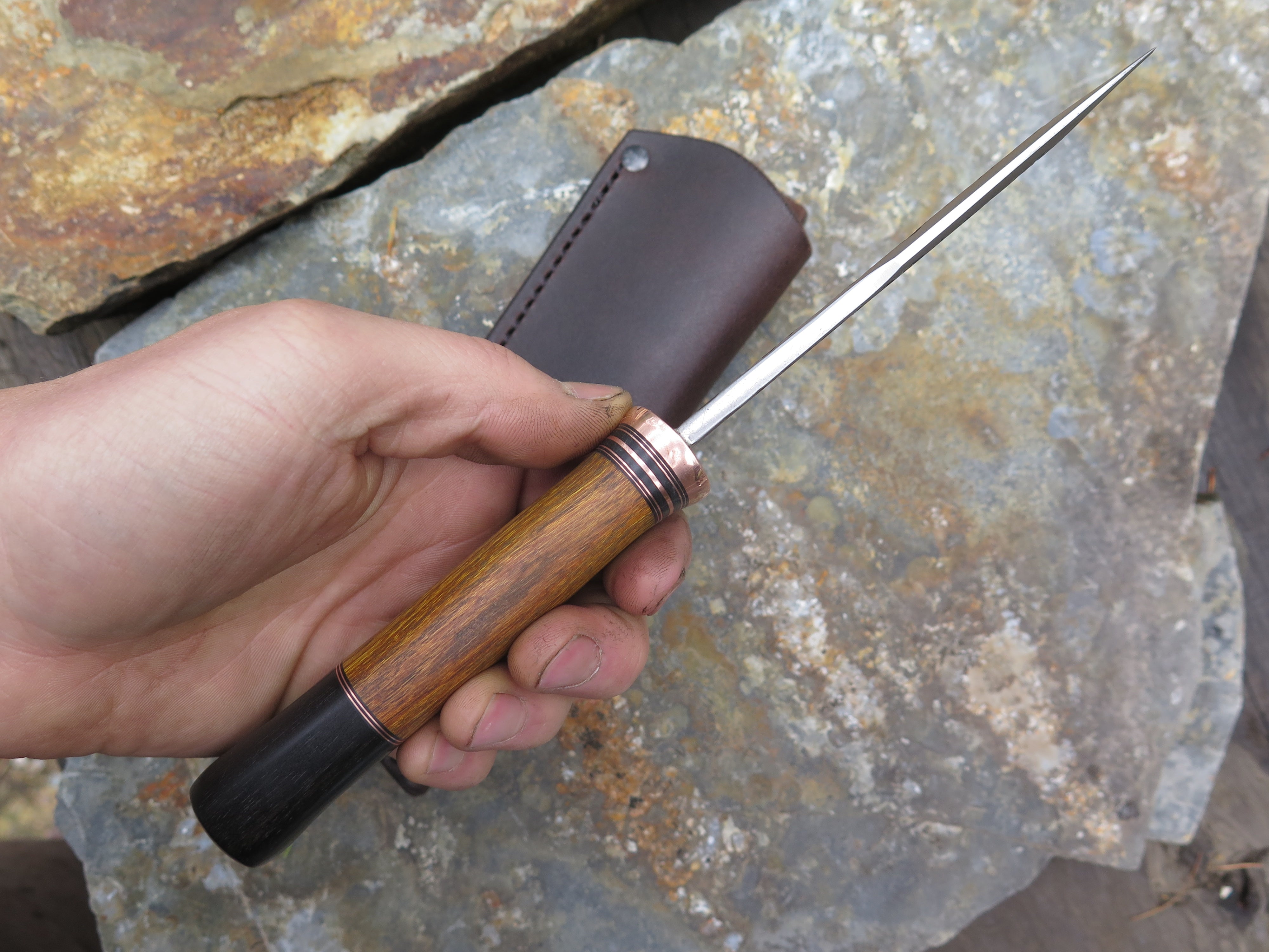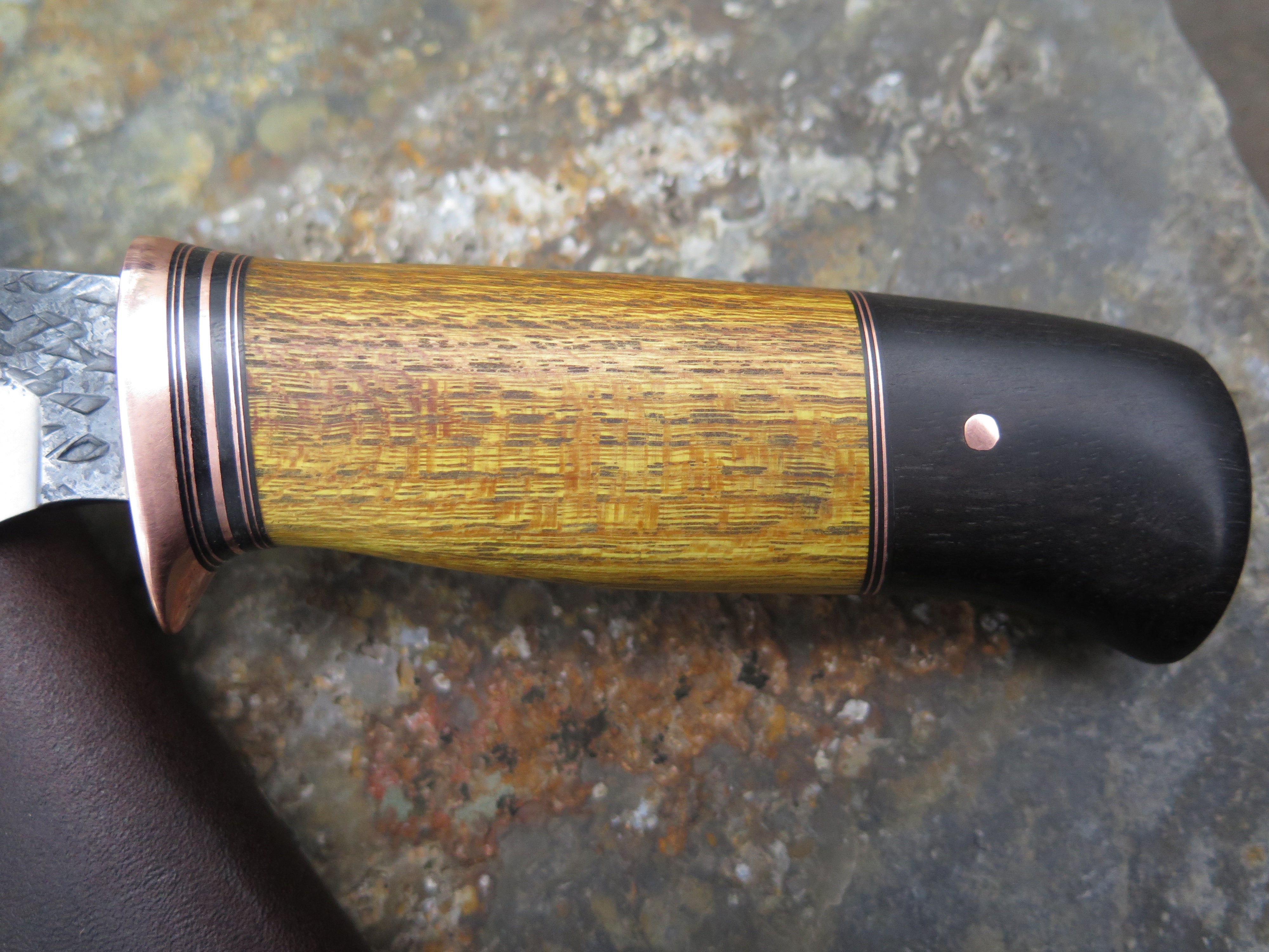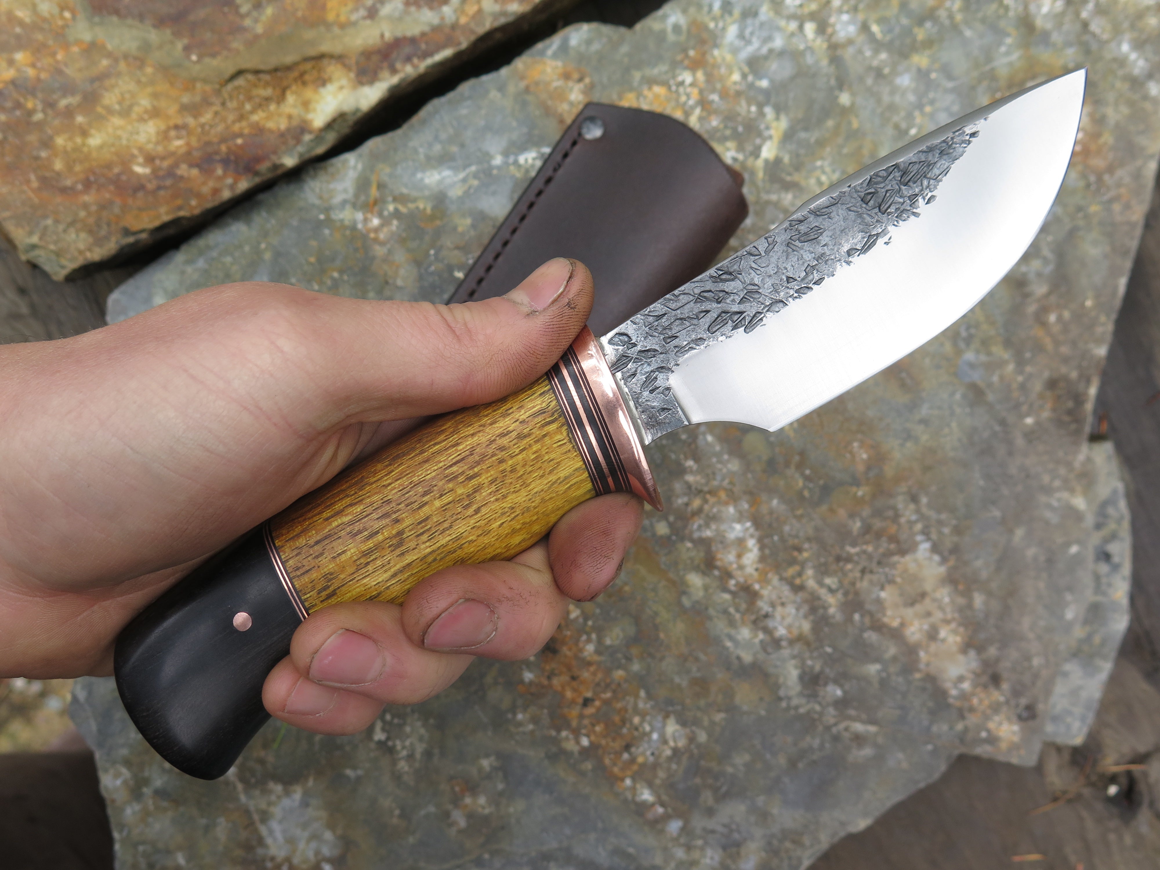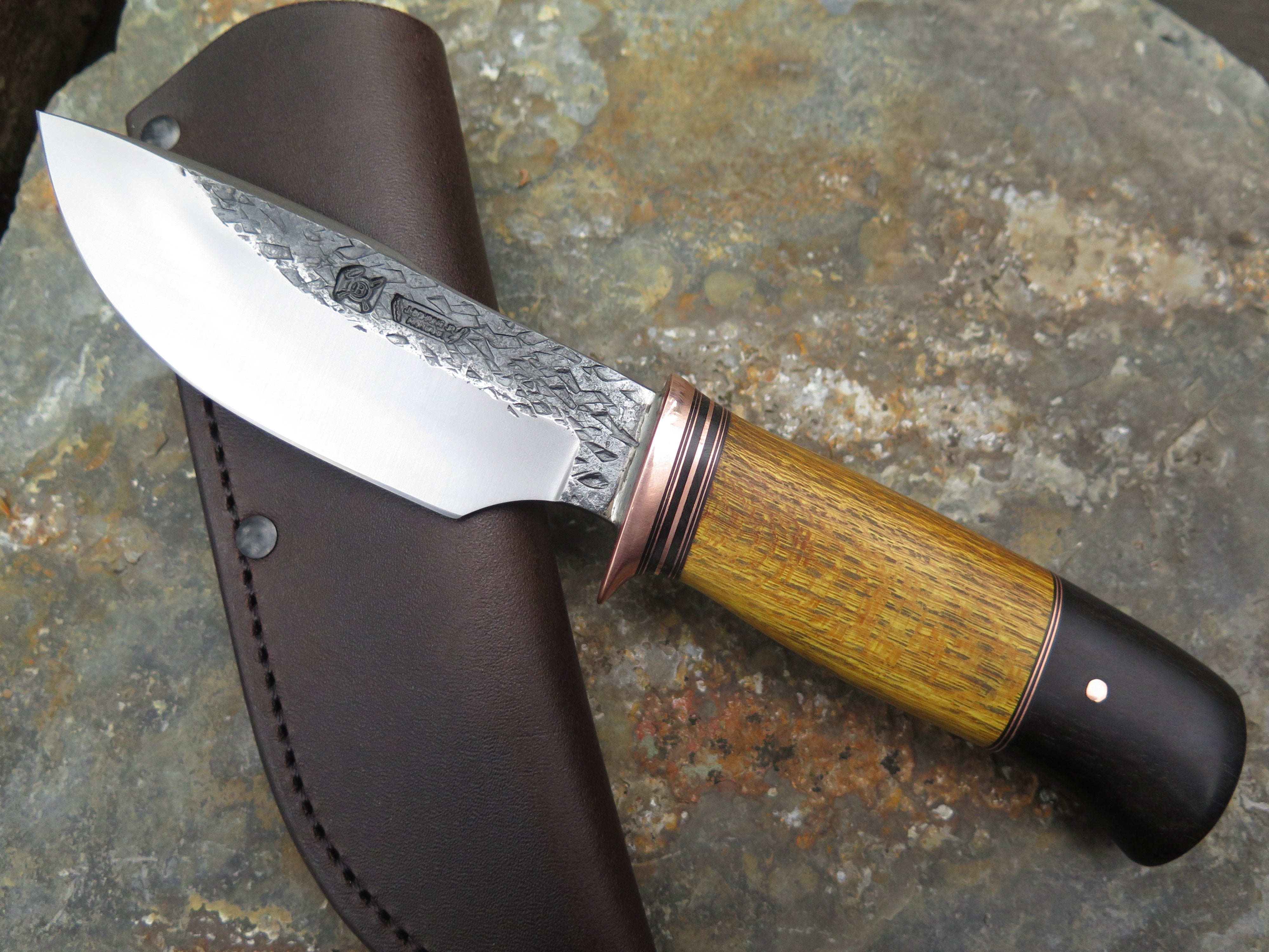 This purty new Alaskan from Behring Made© is hand forged from 3/16" thick high carbon 01 tool steel and it measures 4 3/4" from tip to guard with a razor sharp hollow grind and our hammermark finish. The copper guard is soldered in place above black fiber and copper spacers with a two-piece construction of beautiful osage and ebony hardwoods, which is pinned through the tang with copper. The overall length measures 9 3/8" and it comes in a brown leather belt pouch sheath.