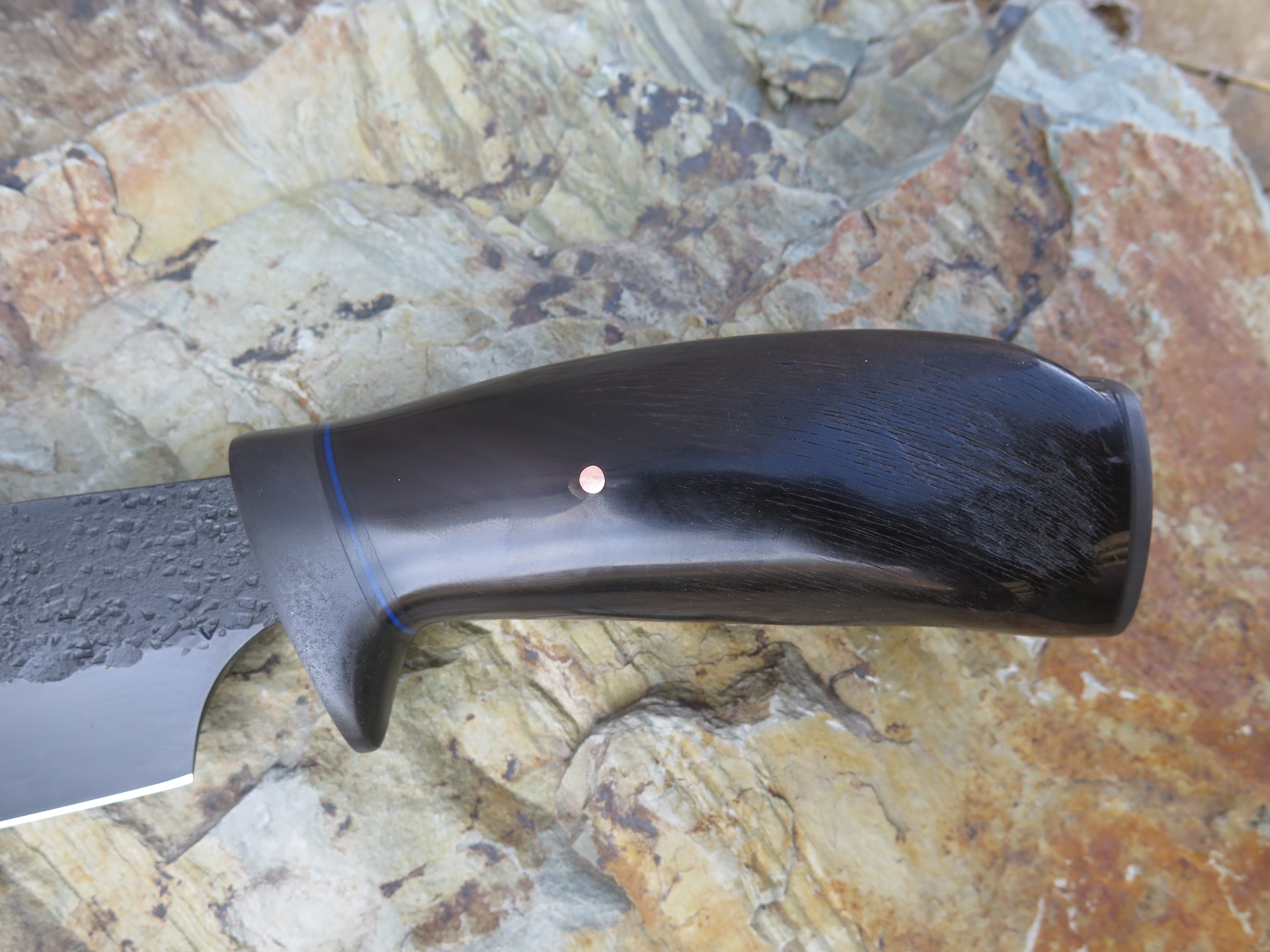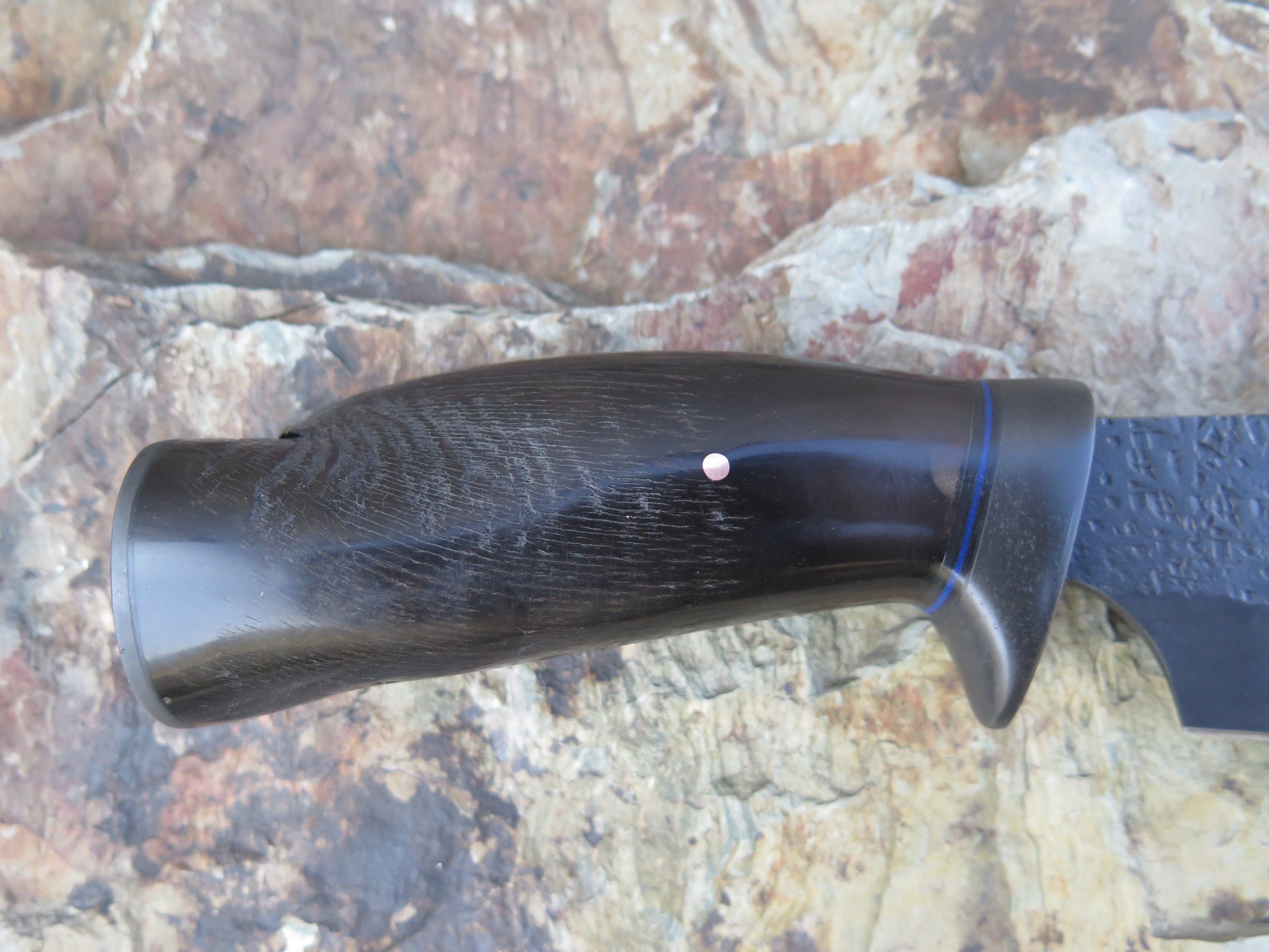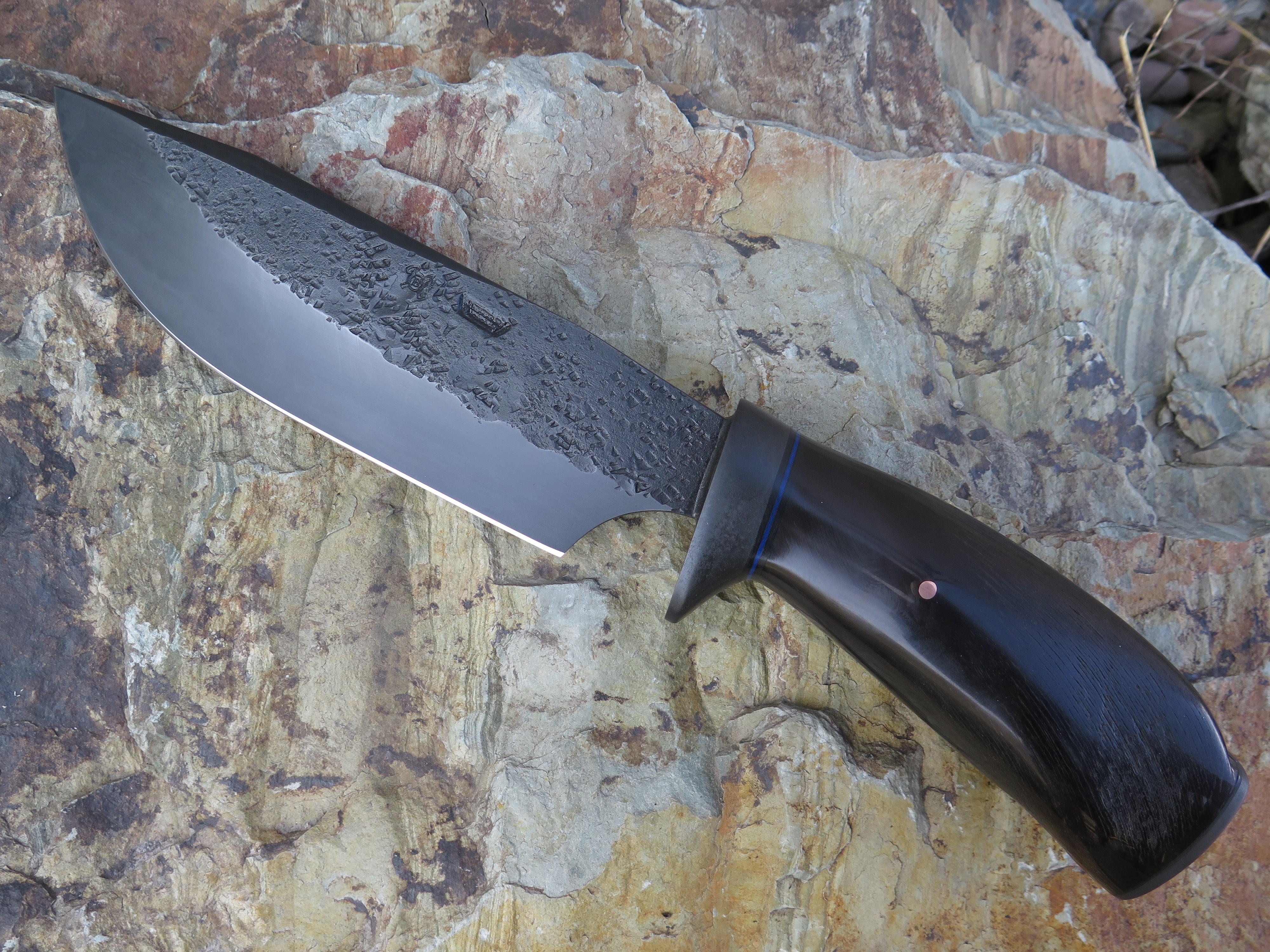 This unique beast from Behring Made© is an Alaskan style Camp Knife and it's hand forged from 1/4" thick 5160 spring steel, measuring 7 1/2" with a razor sharp hollow grind, hammermarks and our forced patina blued finish. The blued steel guard is soldered in place above black and blue fiber spacers as well as a surprisingly ergonomic eland horn handle that's pinned with copper and capped with blued steel as well. Overall length measures 12 3/8" and it comes in the custom sheath design of your choosing.