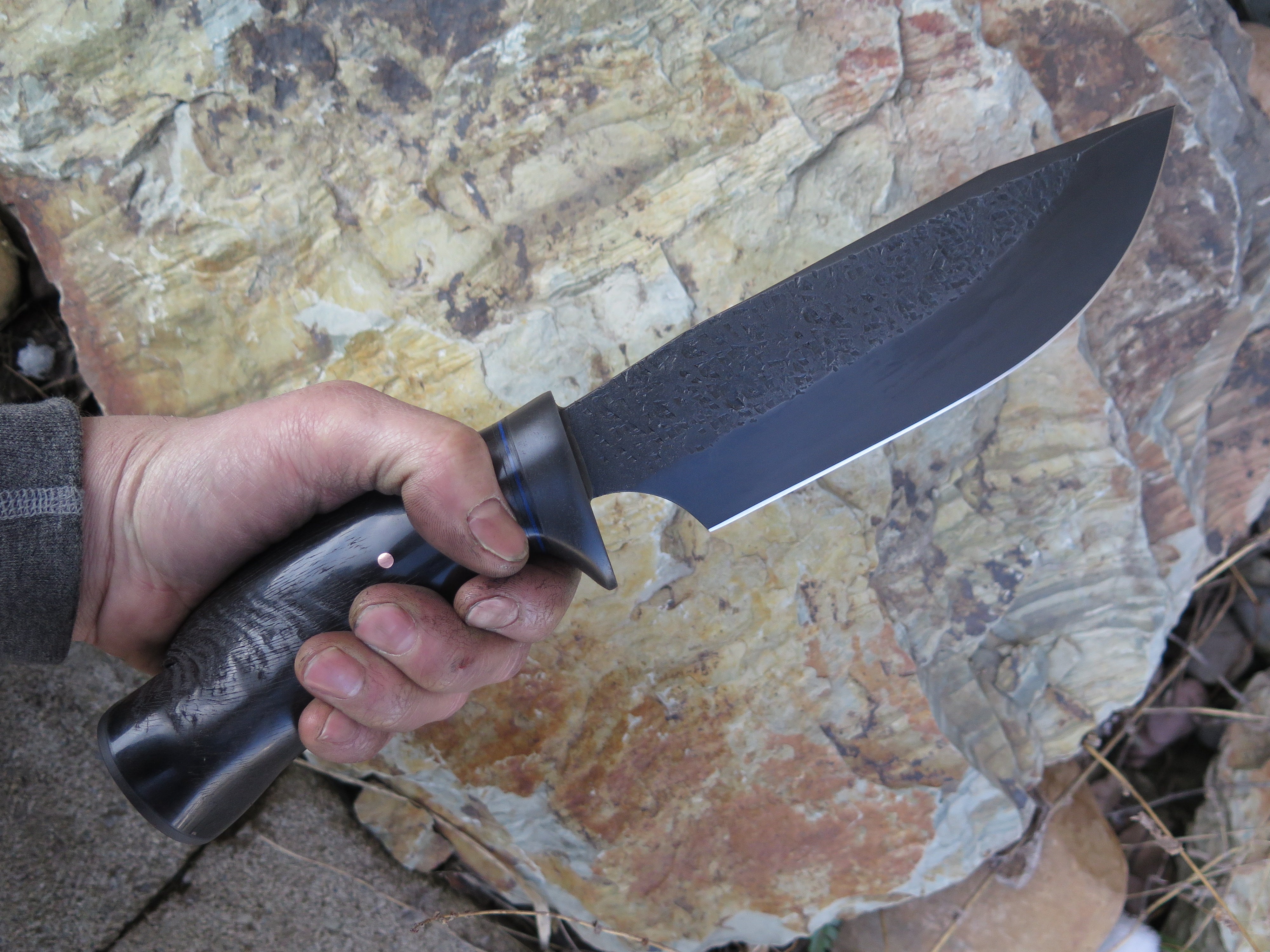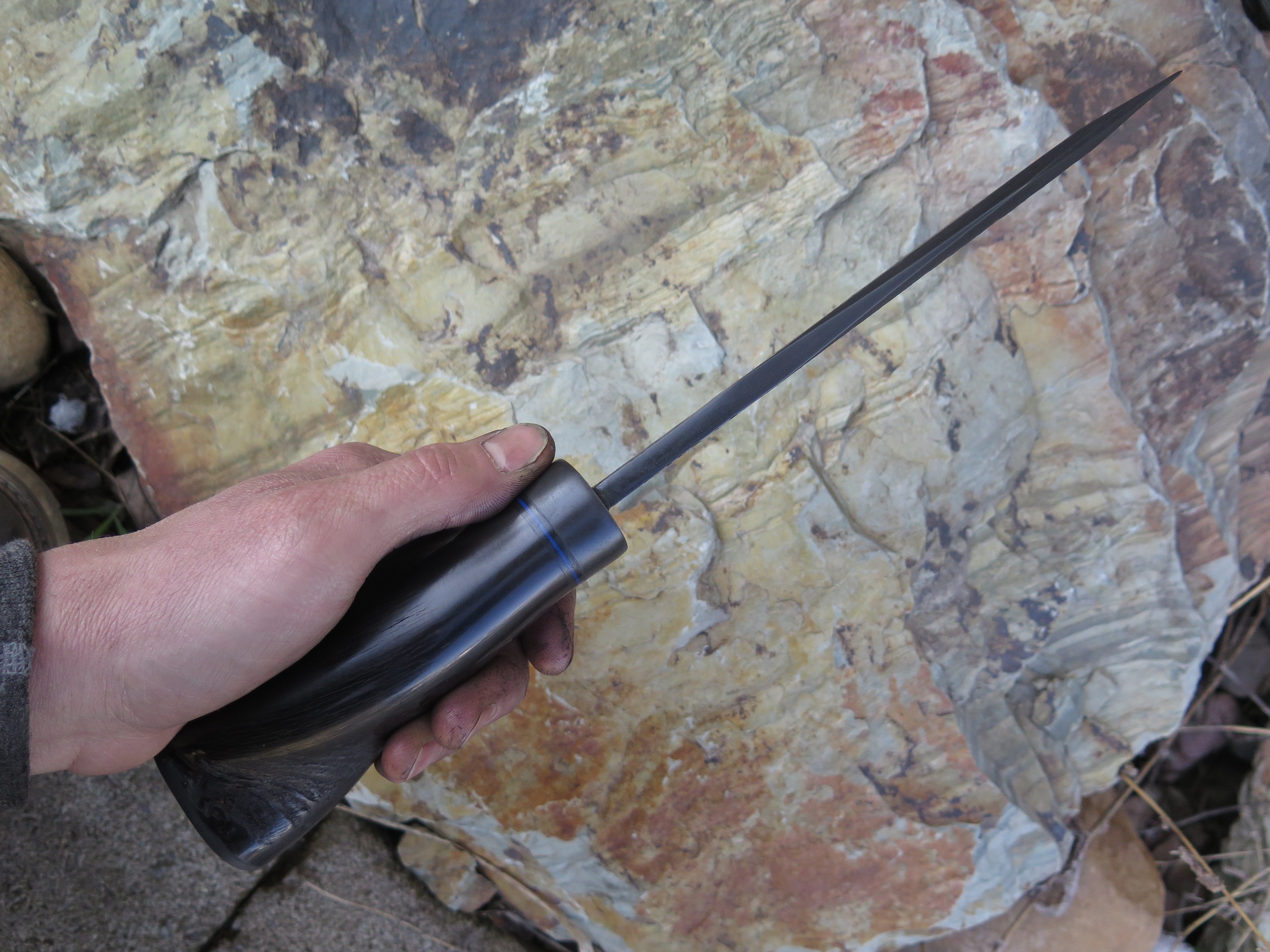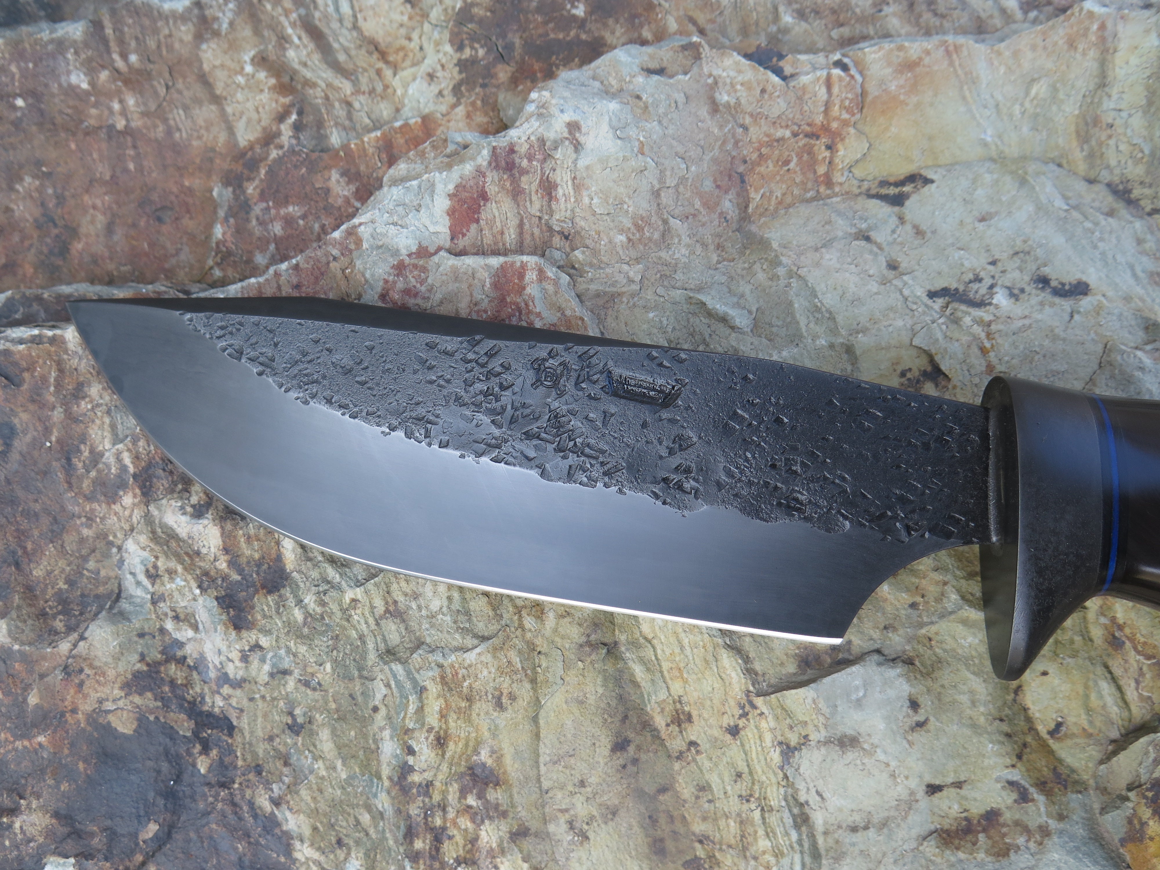 This unique beast from Behring Made© is an Alaskan style Camp Knife and it's hand forged from 1/4" thick 5160 spring steel, measuring 7 1/2" with a razor sharp hollow grind, hammermarks and our forced patina blued finish. The blued steel guard is soldered in place above black and blue fiber spacers as well as a surprisingly ergonomic eland horn handle that's pinned with copper and capped with blued steel as well. Overall length measures 12 3/8" and it comes in the custom sheath design of your choosing.