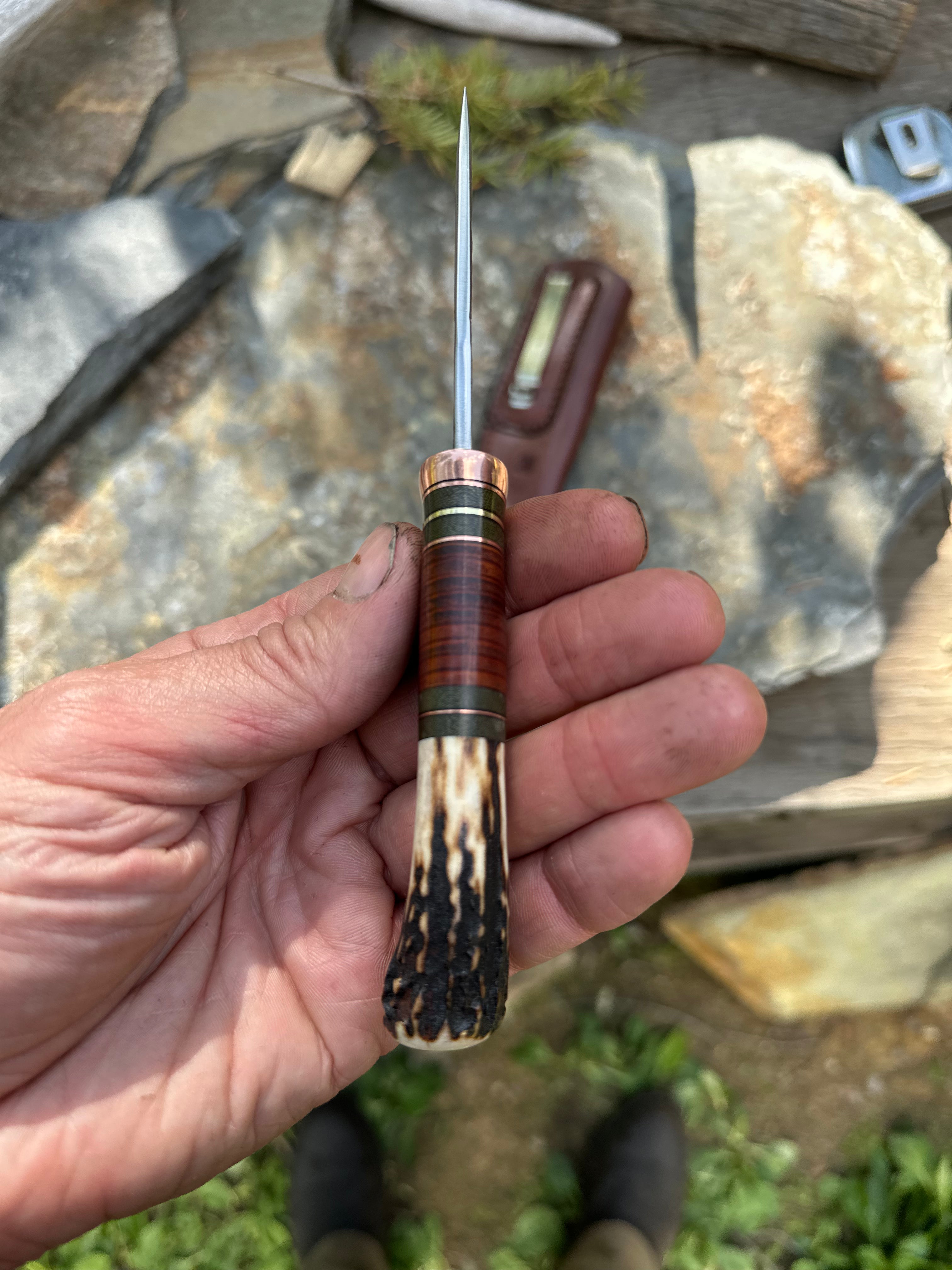 - Brass, Green Micarta, Horse Hide, Copper, & Black Fiber Spacers