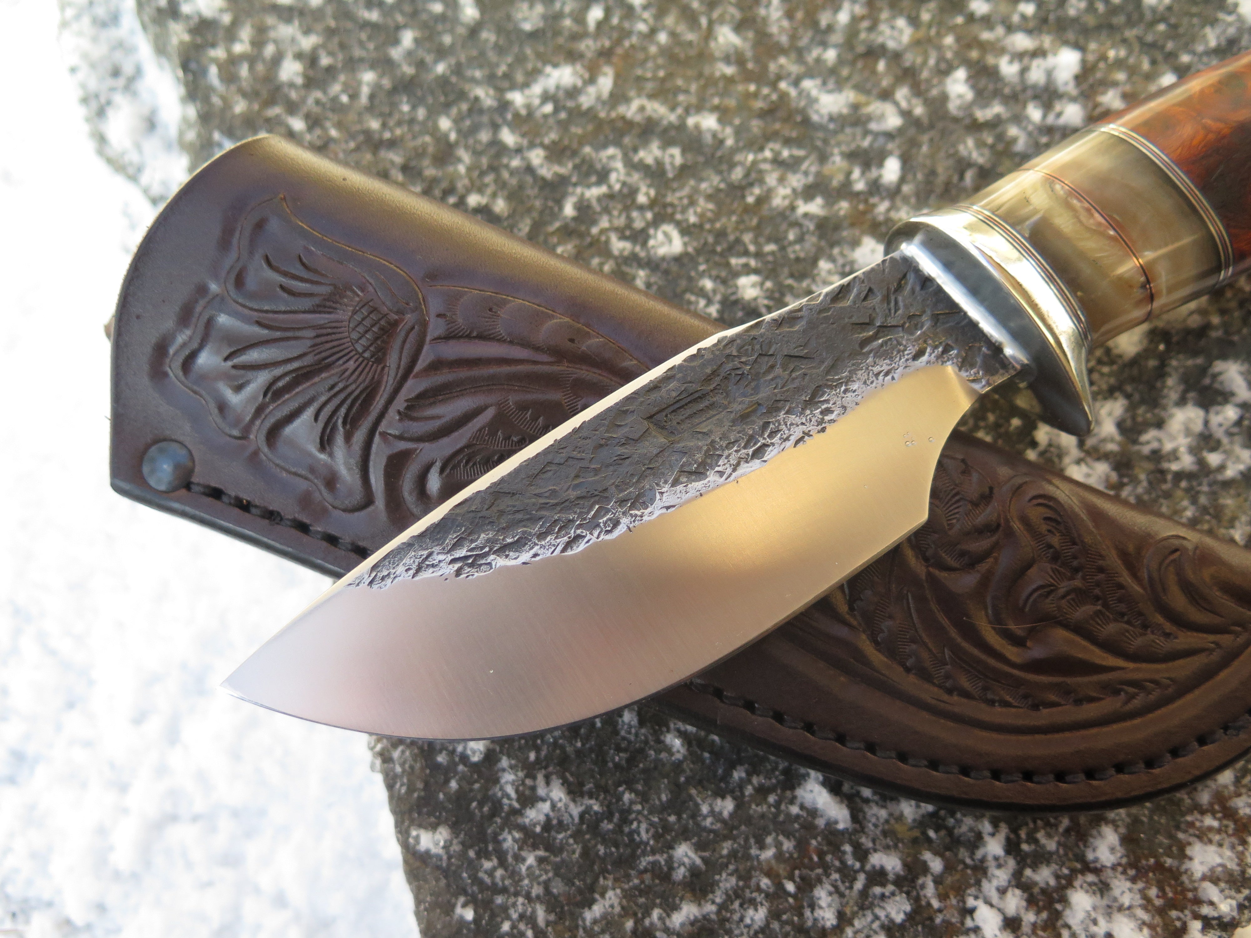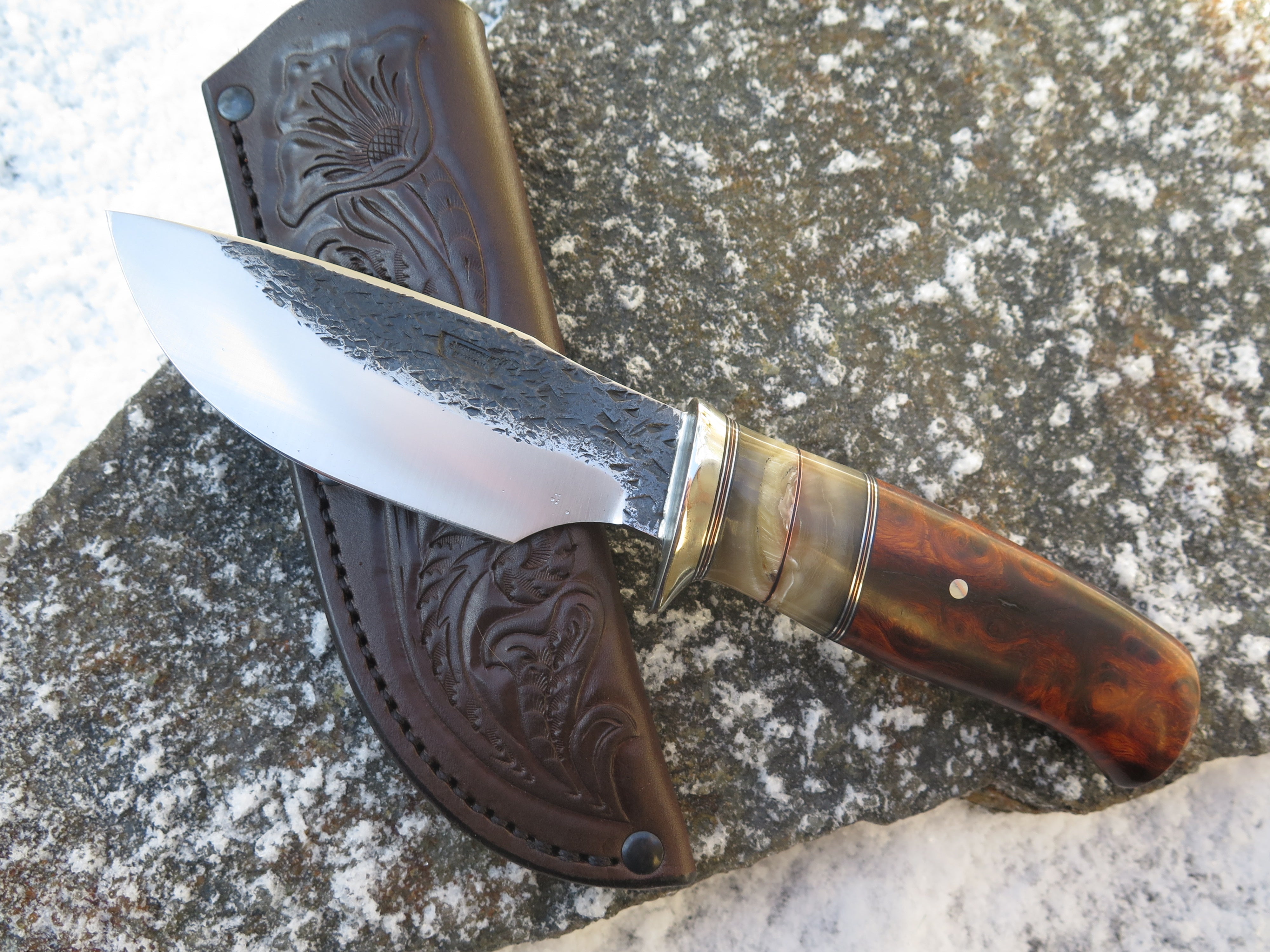 This gorgeous new Alaskan from Behring Made© is hand forged from 3/16" thick high carbon 01 tool steel and it measures 4 3/4" from tip to guard with a razor sharp hollow grind and a hammermark finish. The nickel silver guard is soldered in place above black fiber, copper, aluminum and two beautiful Dall's sheep horn spacers which top a premium desert ironwood burl handle that's pinned through the tang with aluminum. The overall length measures 9 1/4" and it comes in a floral tooled leather belt pouch sheath.