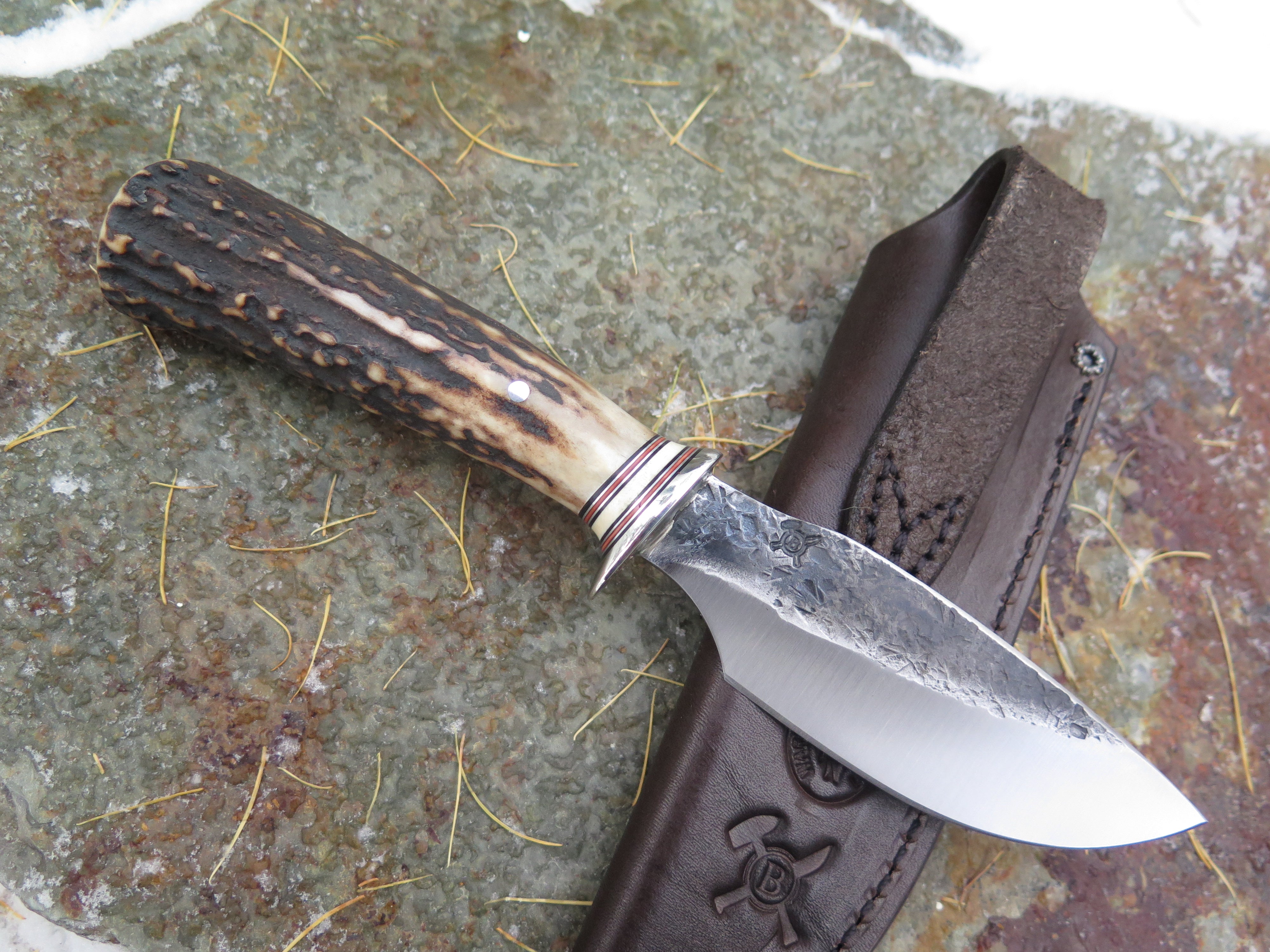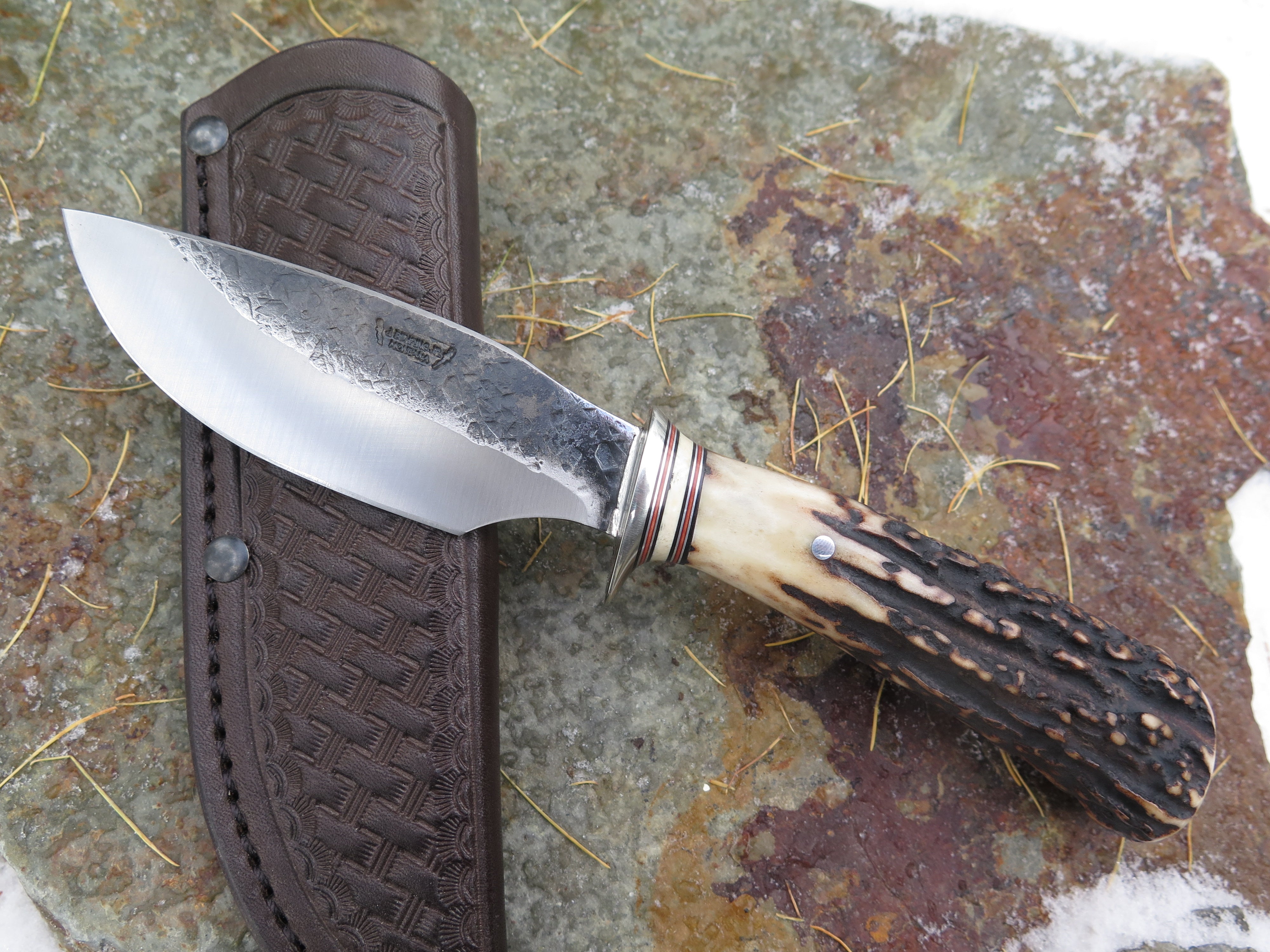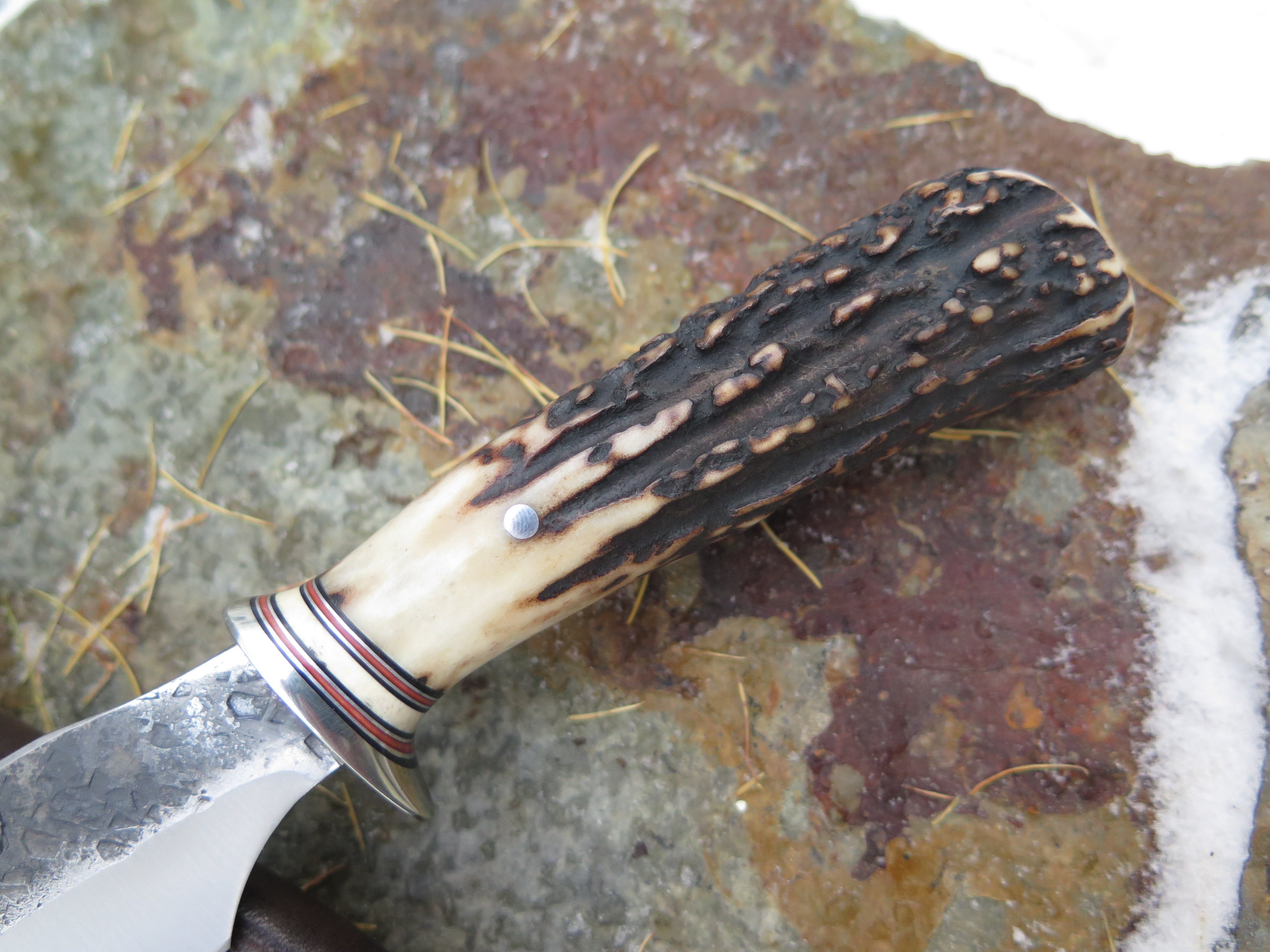 This beautiful new Alaskan from Behring Made© is hand forged from 1/8" thick high carbon 01 tool steel and measures 4" from tip to guard with a razor sharp hollow grind and our hammermark finish. The nickel silver guard is soldered in place above black and maroon fiber, aluminum and ancient mammoth ivory spacers as well as a premium sambar stag handle that is pinned through the tang with aluminum. The overall length measures 8 1/4" and it comes in the shown leather belt pouch sheath, though substitutions are available upon request.