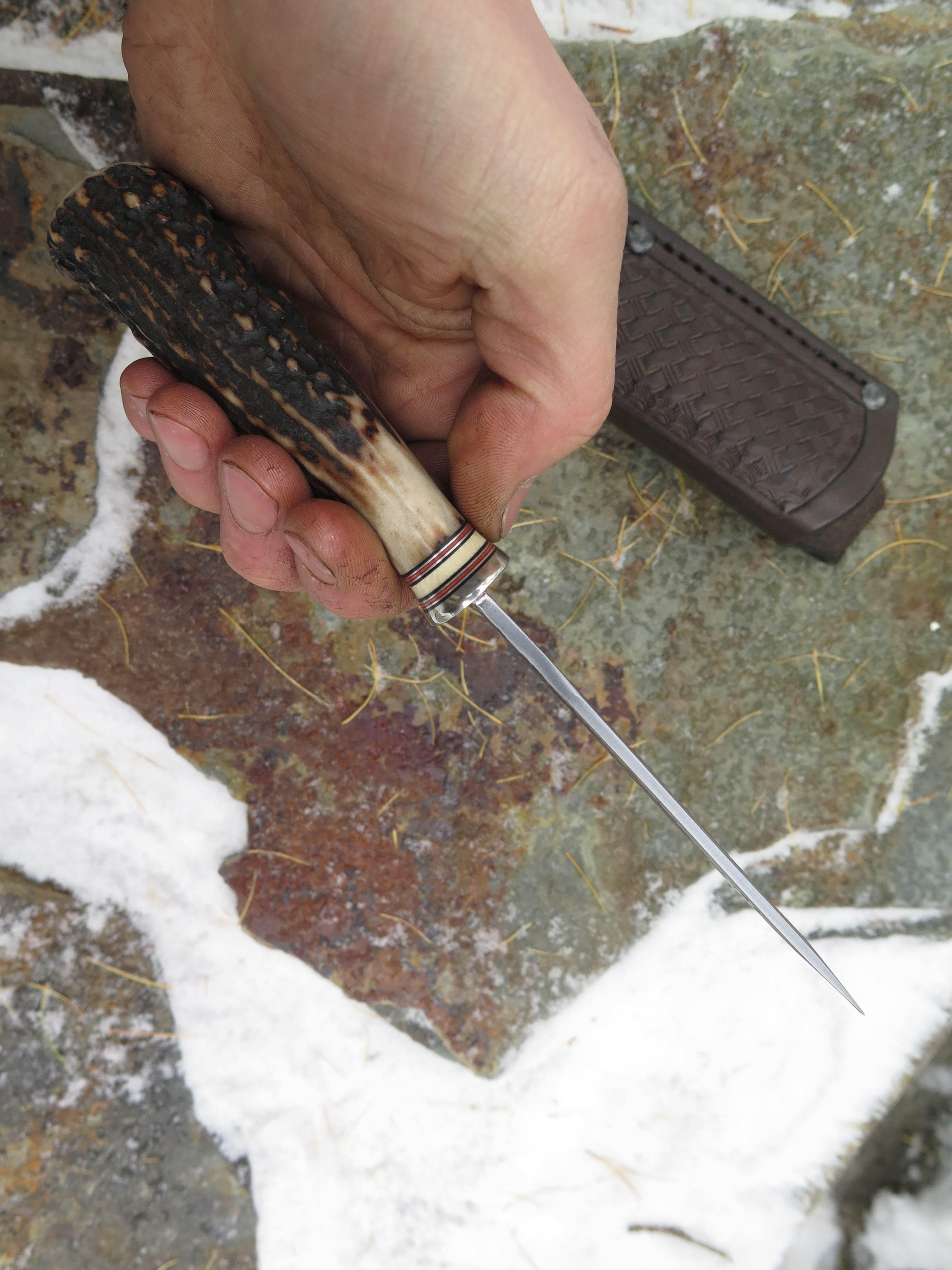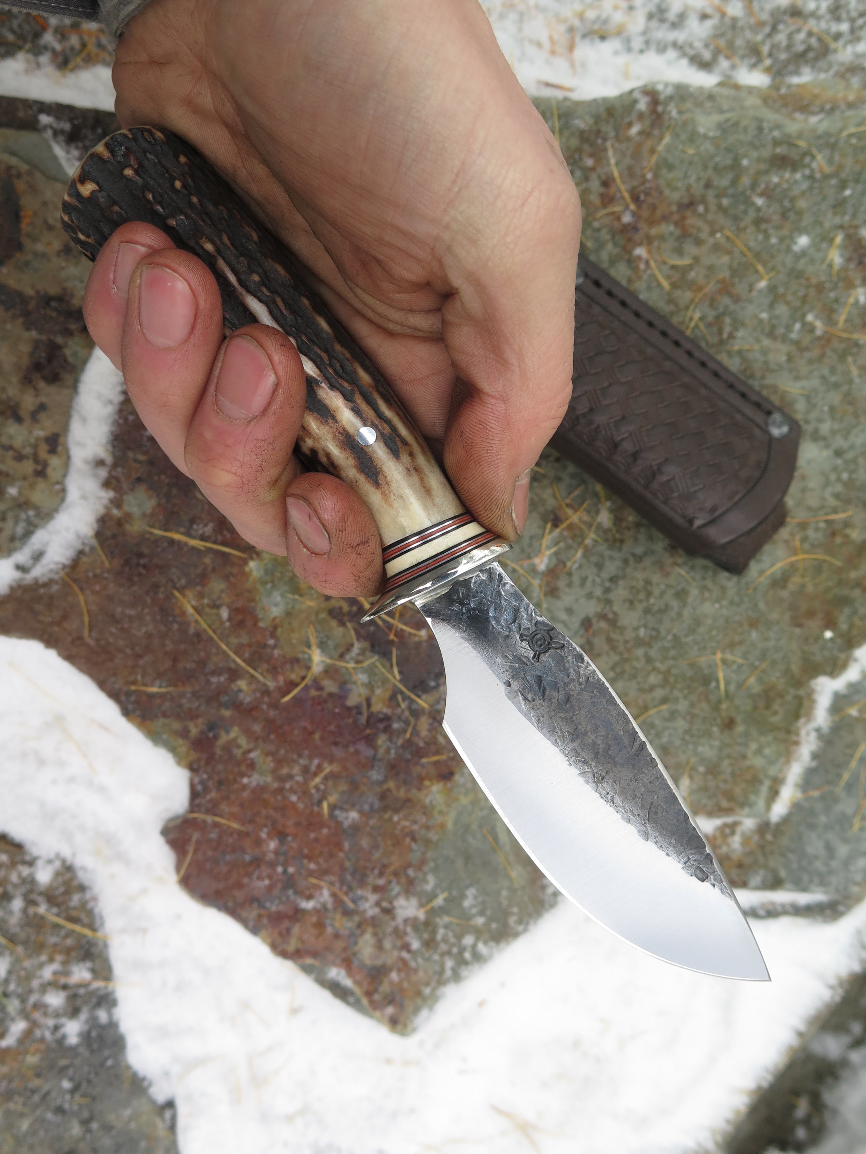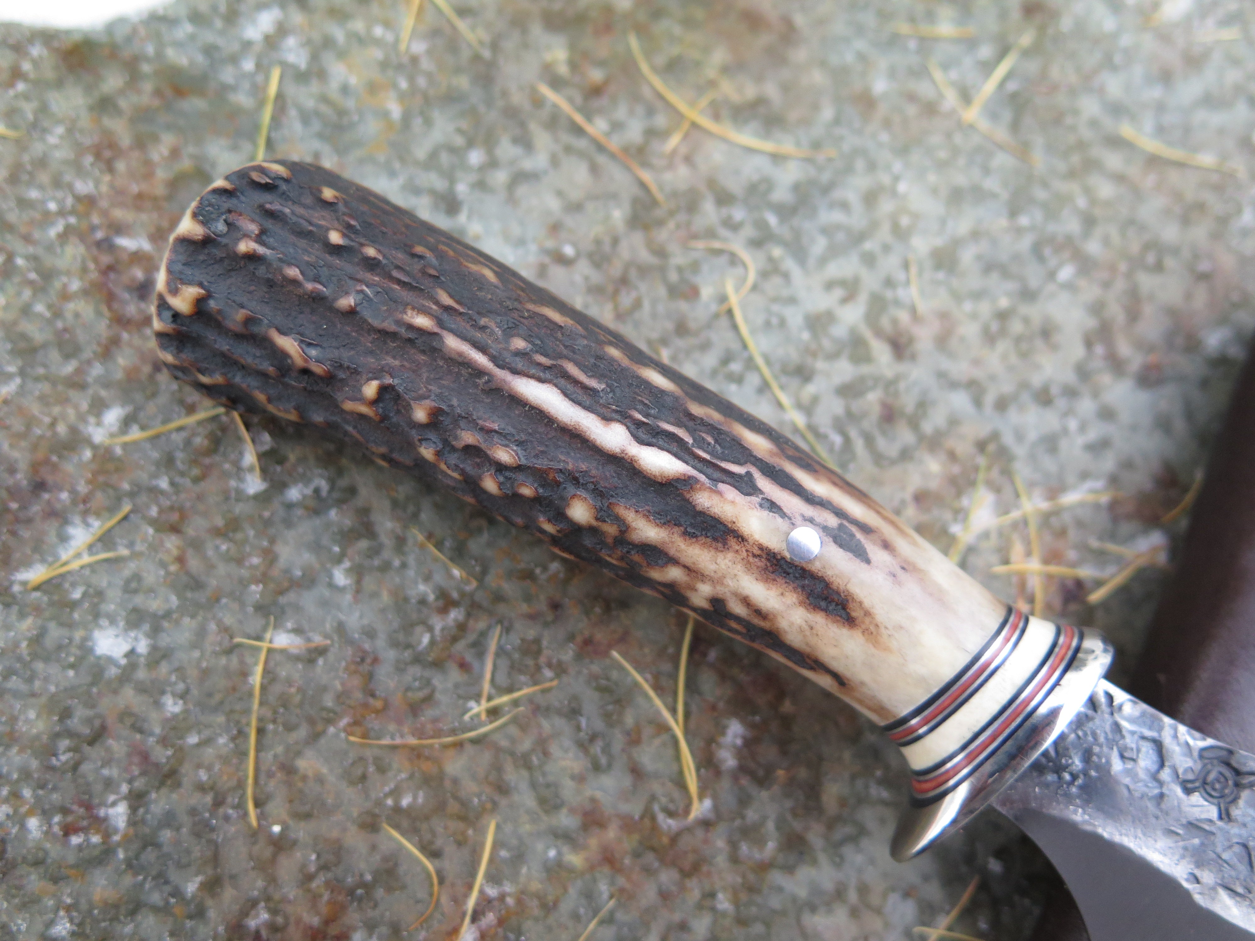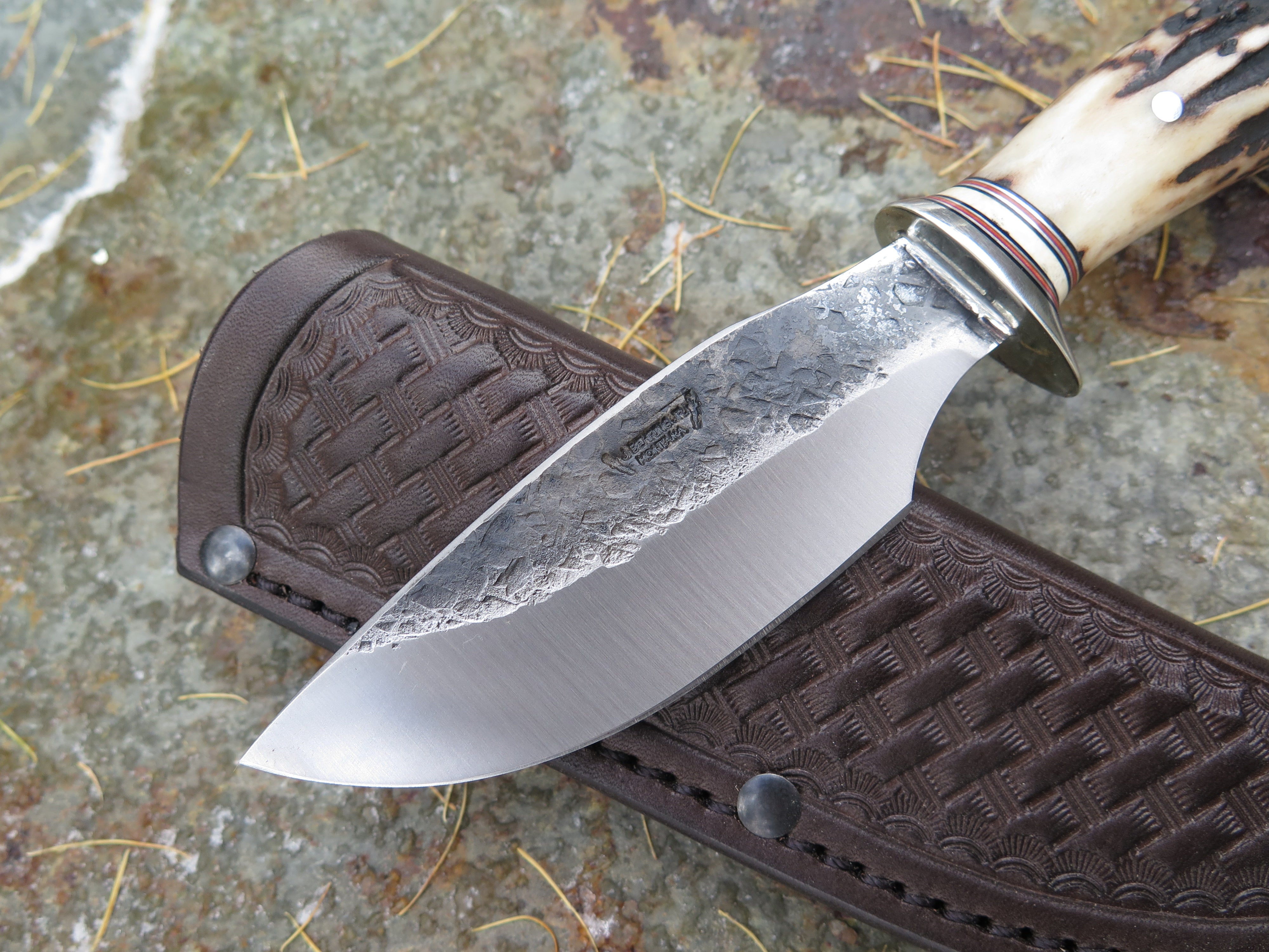 This beautiful new Alaskan from Behring Made© is hand forged from 1/8" thick high carbon 01 tool steel and measures 4" from tip to guard with a razor sharp hollow grind and our hammermark finish. The nickel silver guard is soldered in place above black and maroon fiber, aluminum and ancient mammoth ivory spacers as well as a premium sambar stag handle that is pinned through the tang with aluminum. The overall length measures 8 1/4" and it comes in the shown leather belt pouch sheath, though substitutions are available upon request.