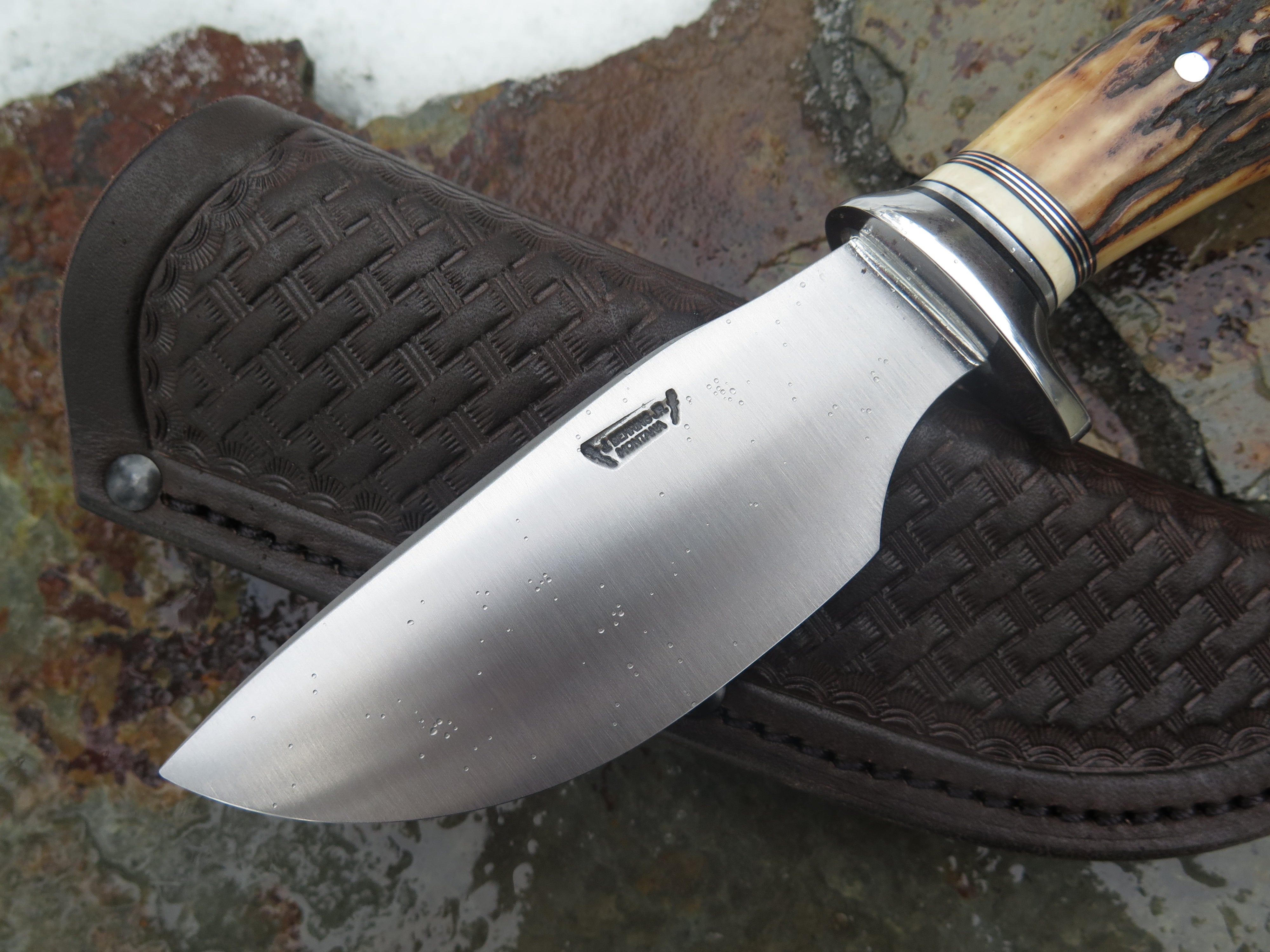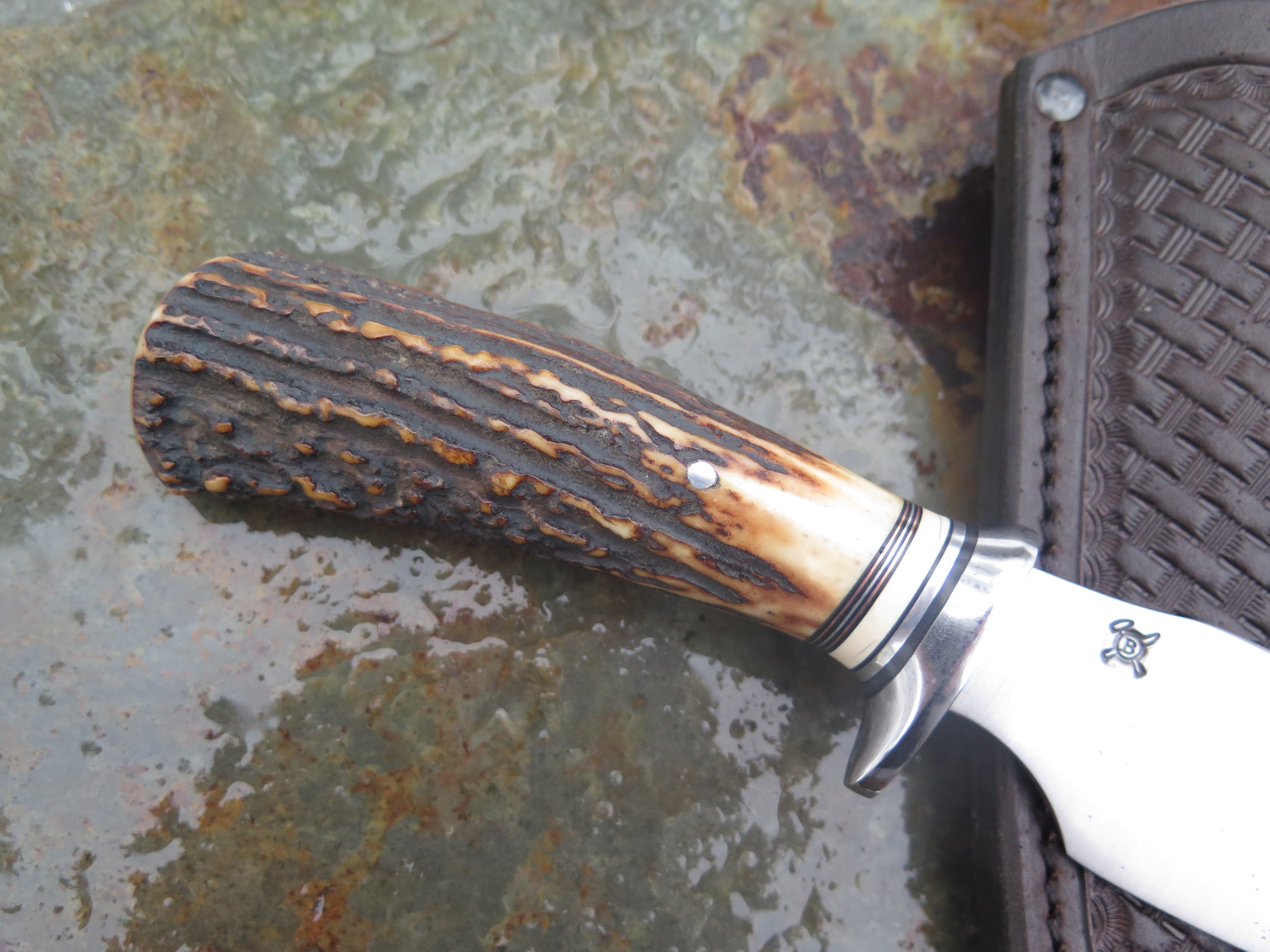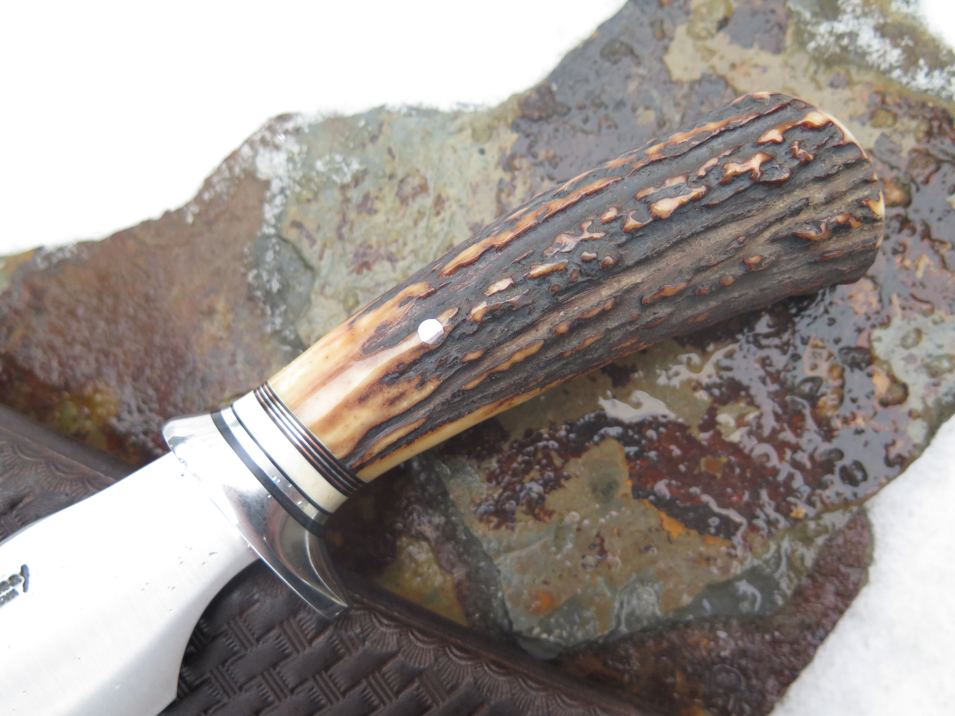 This beautiful new Alaskan from Behring Made© is hand forged from 3/16" thick high carbon 01 tool steel and measures 4 1/2" from tip to guard with a razor sharp convex grind. The stainless steel guard is soldered in place above black fiber, aluminum, copper and ancient mammoth ivory spacers as well as a premium sambar stag handle that is pinned through the tang with aluminum. The overall length measures 9 1/8" and it comes in the shown premium leather belt pouch sheath, though substitutions are available upon request.