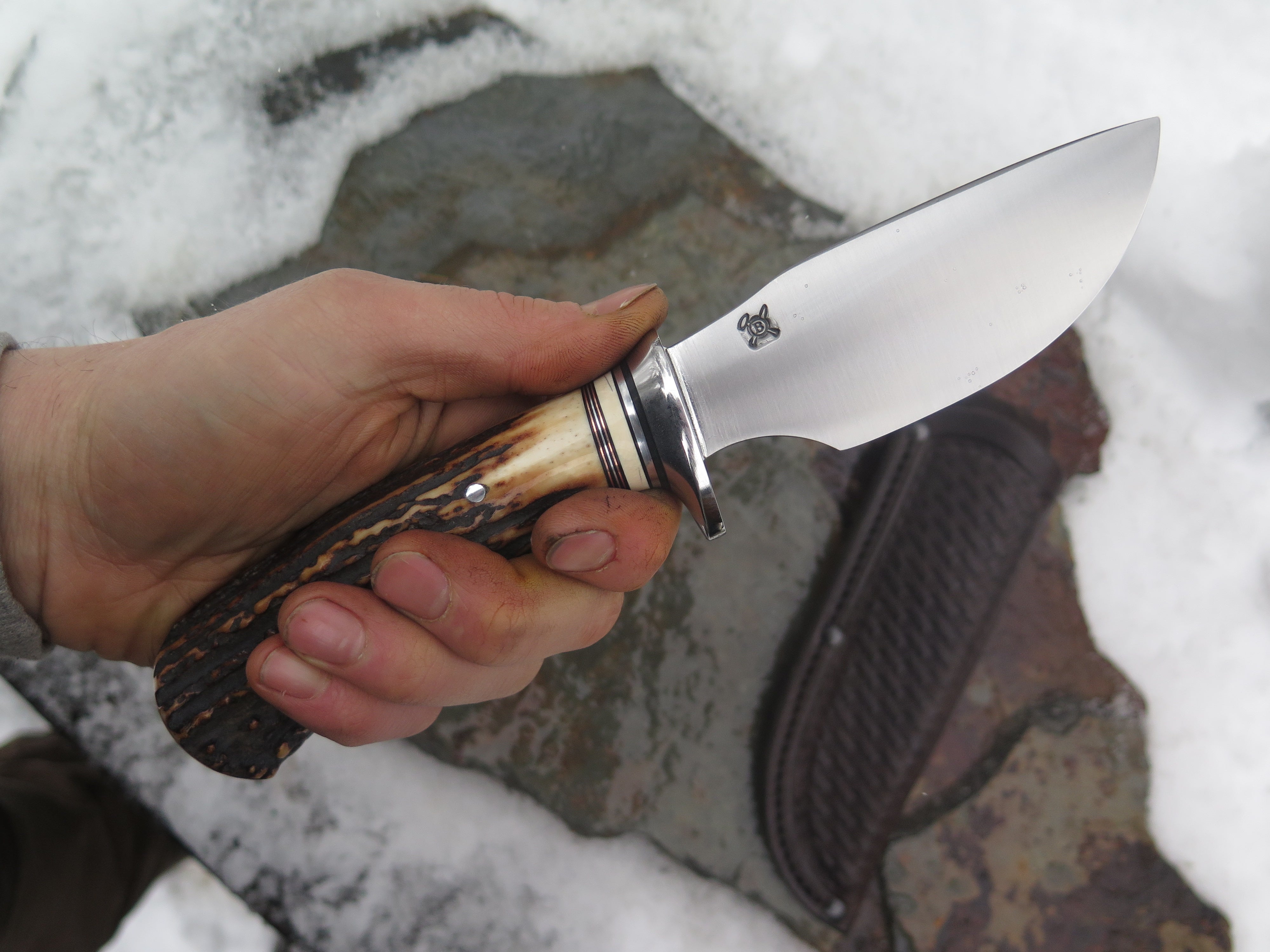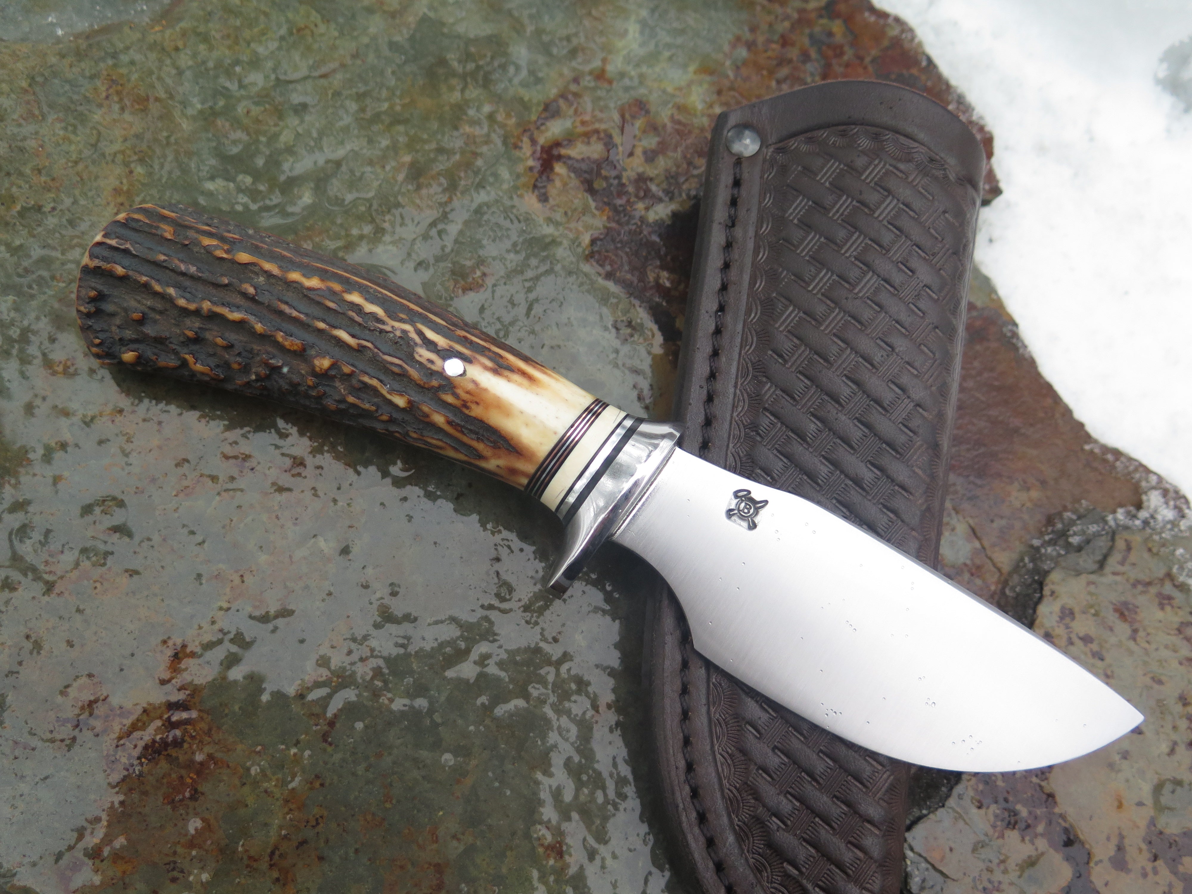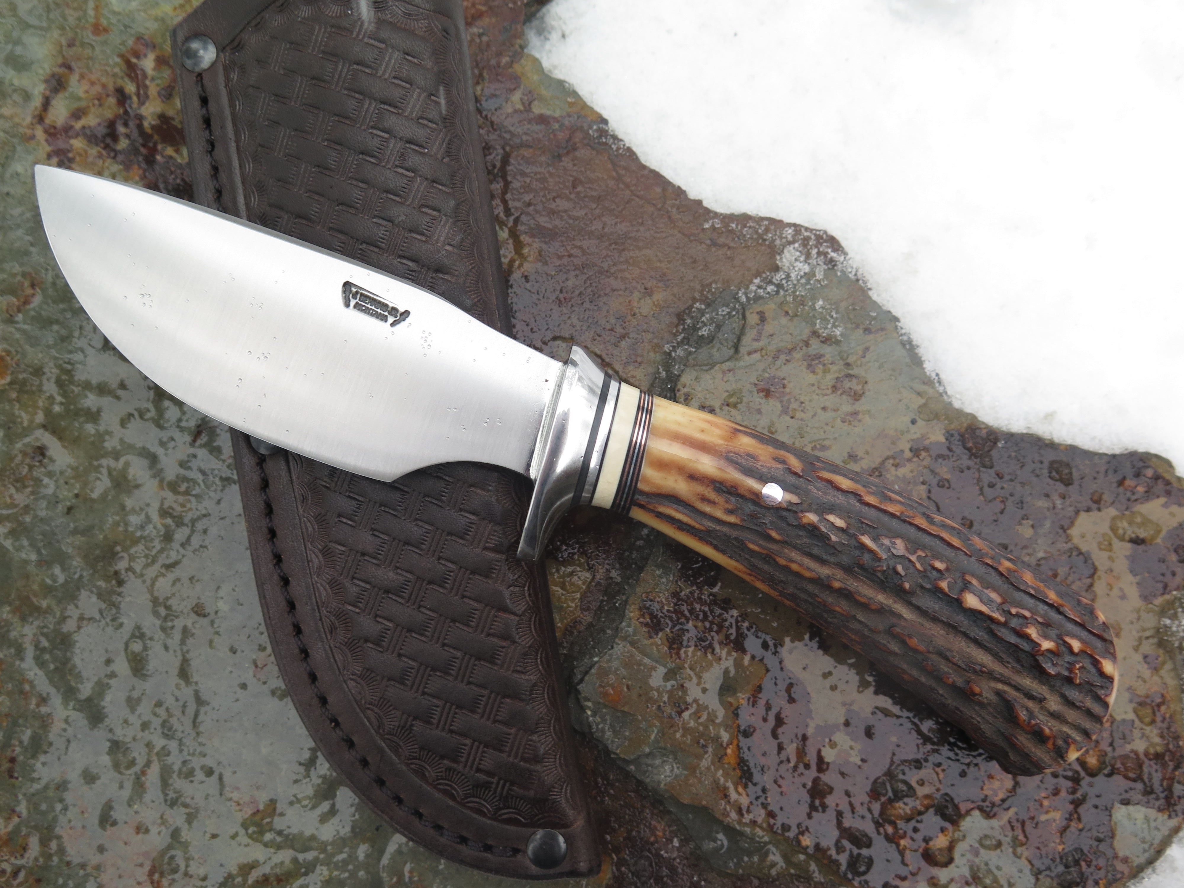 This beautiful new Alaskan from Behring Made© is hand forged from 3/16" thick high carbon 01 tool steel and measures 4 1/2" from tip to guard with a razor sharp convex grind. The stainless steel guard is soldered in place above black fiber, aluminum, copper and ancient mammoth ivory spacers as well as a premium sambar stag handle that is pinned through the tang with aluminum. The overall length measures 9 1/8" and it comes in the shown premium leather belt pouch sheath, though substitutions are available upon request.
