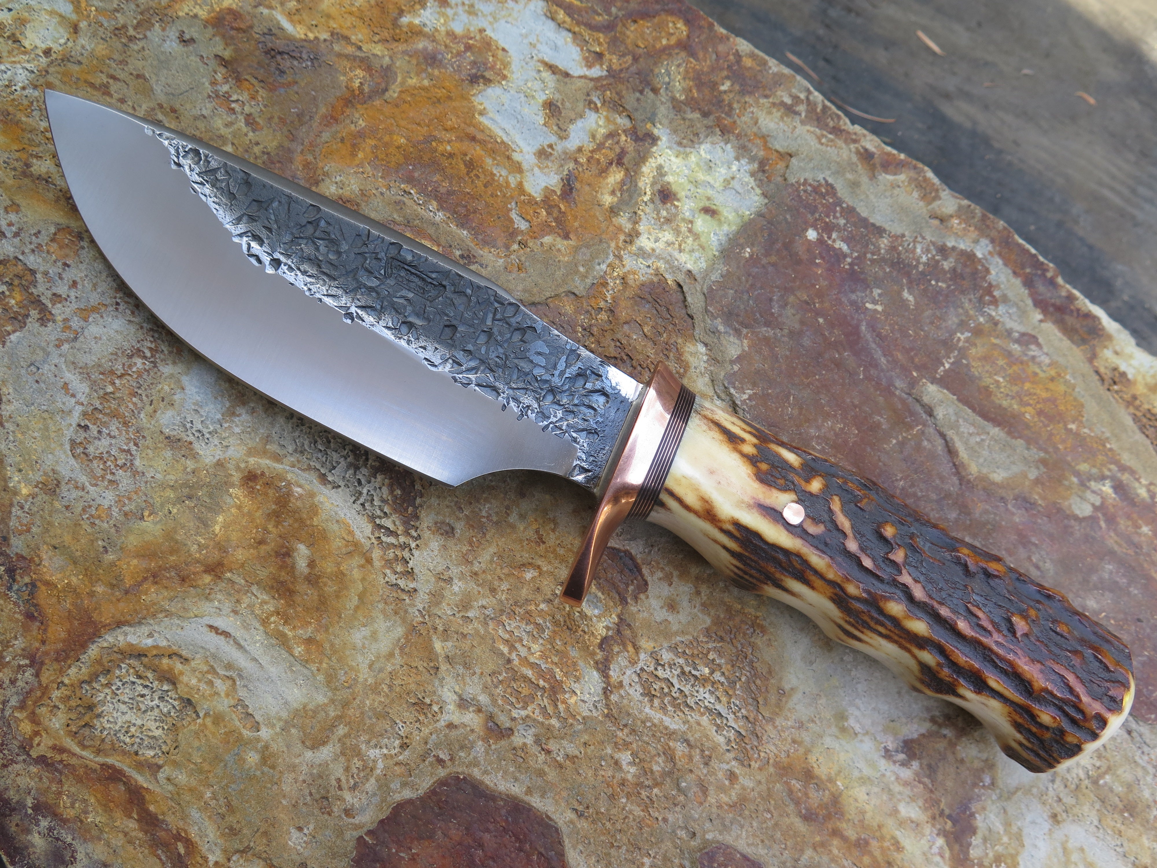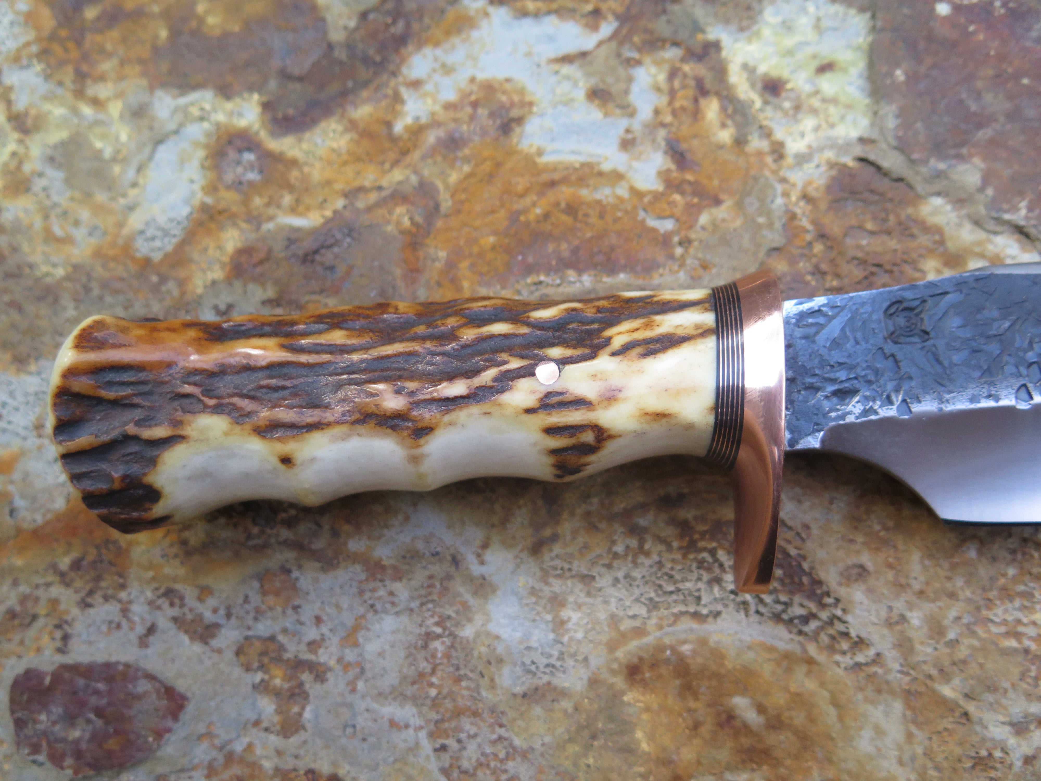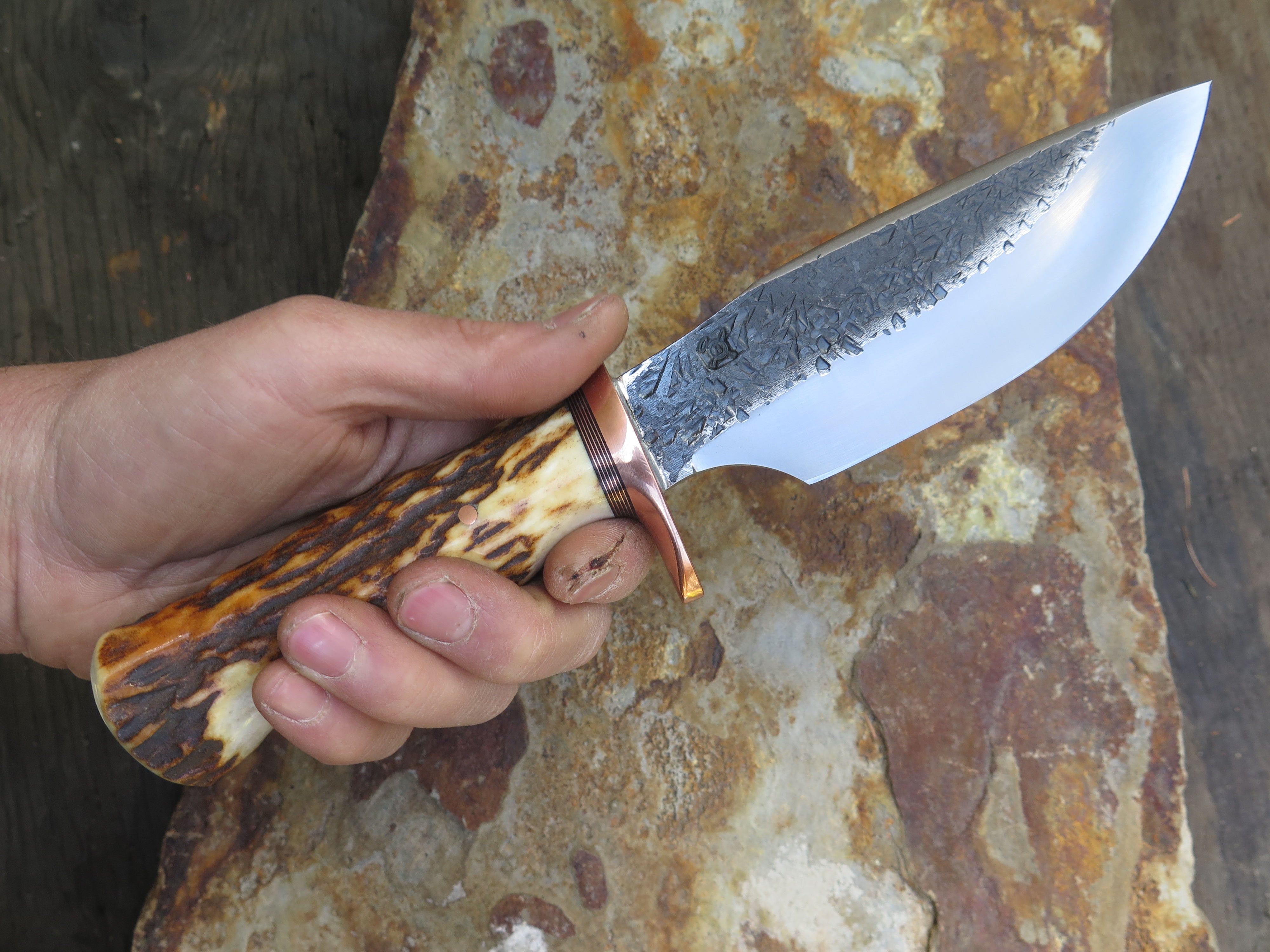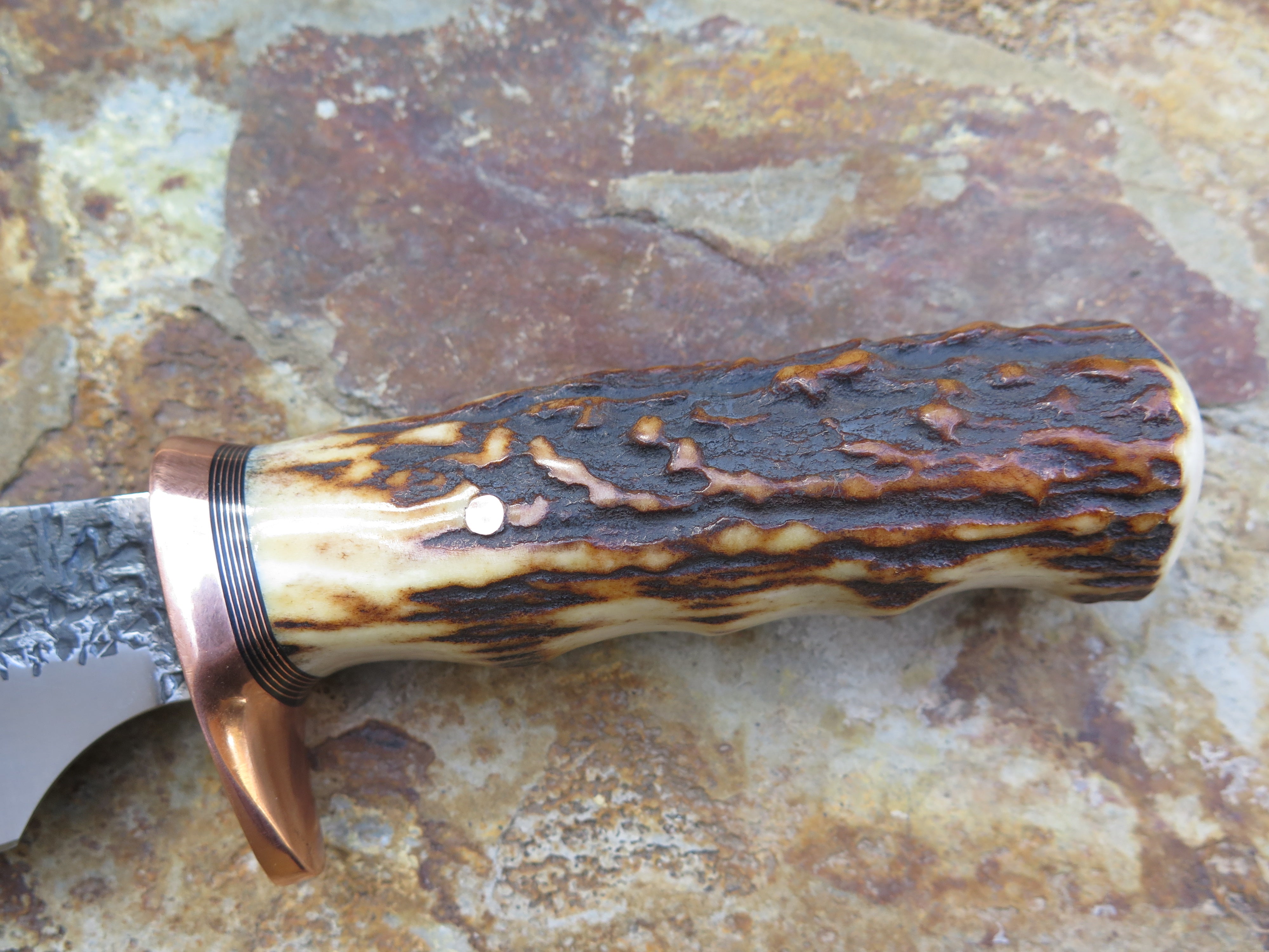 This incredible new Alaskan from Behring Made© is hand forged from 3/16" thick 5160 spring steel and it measures 5 3/4" from tip to guard with a razor sharp hollow grind and our hammermark finish. The copper guard is soldered in place above black fiber and copper spacers with a finger grip sambar stag handle that's pinned through the tang with copper. The overall length measures just over 10 1/2" and it'll come in a custom fitting pouch sheath from Warlander Leather.