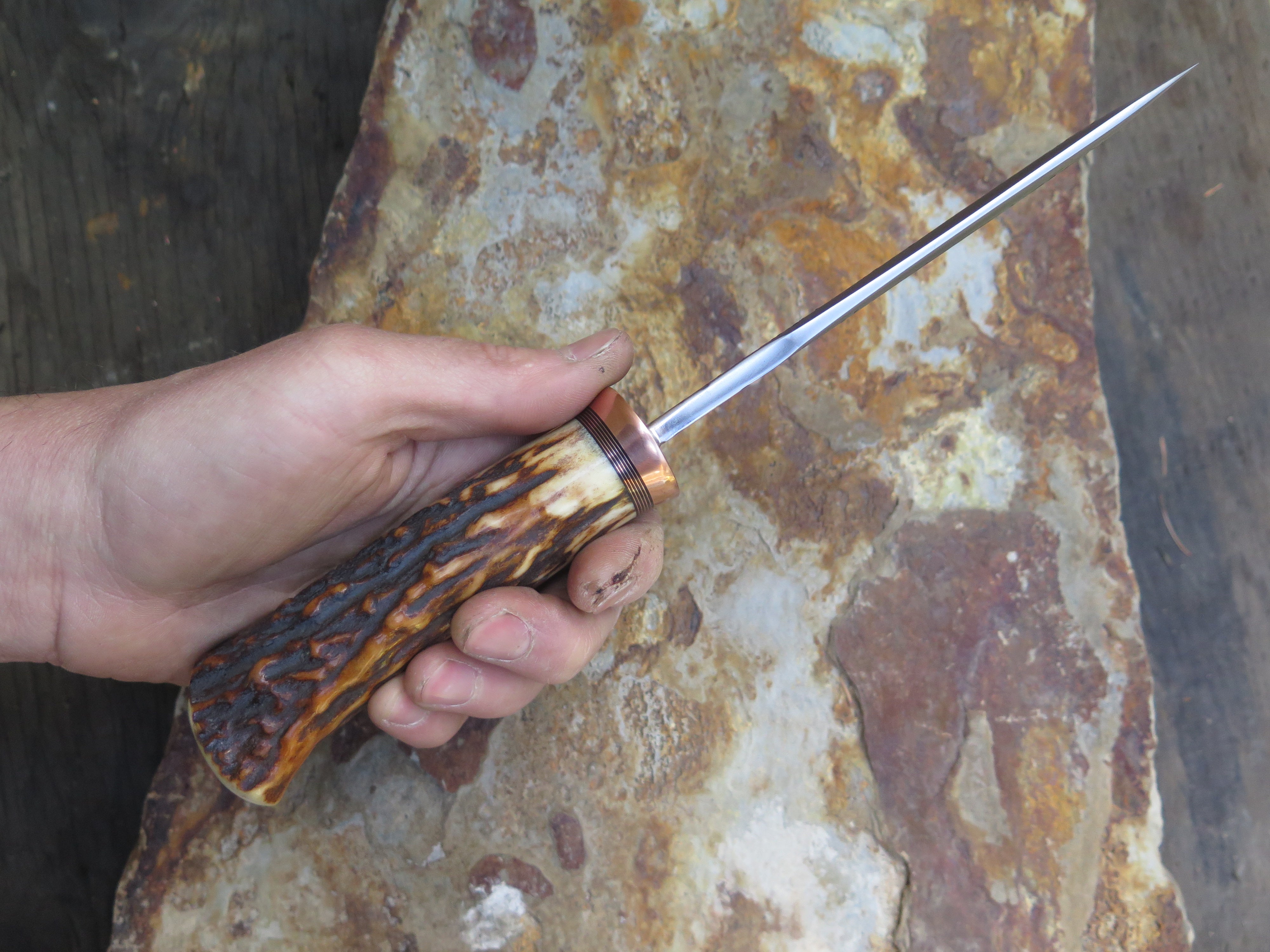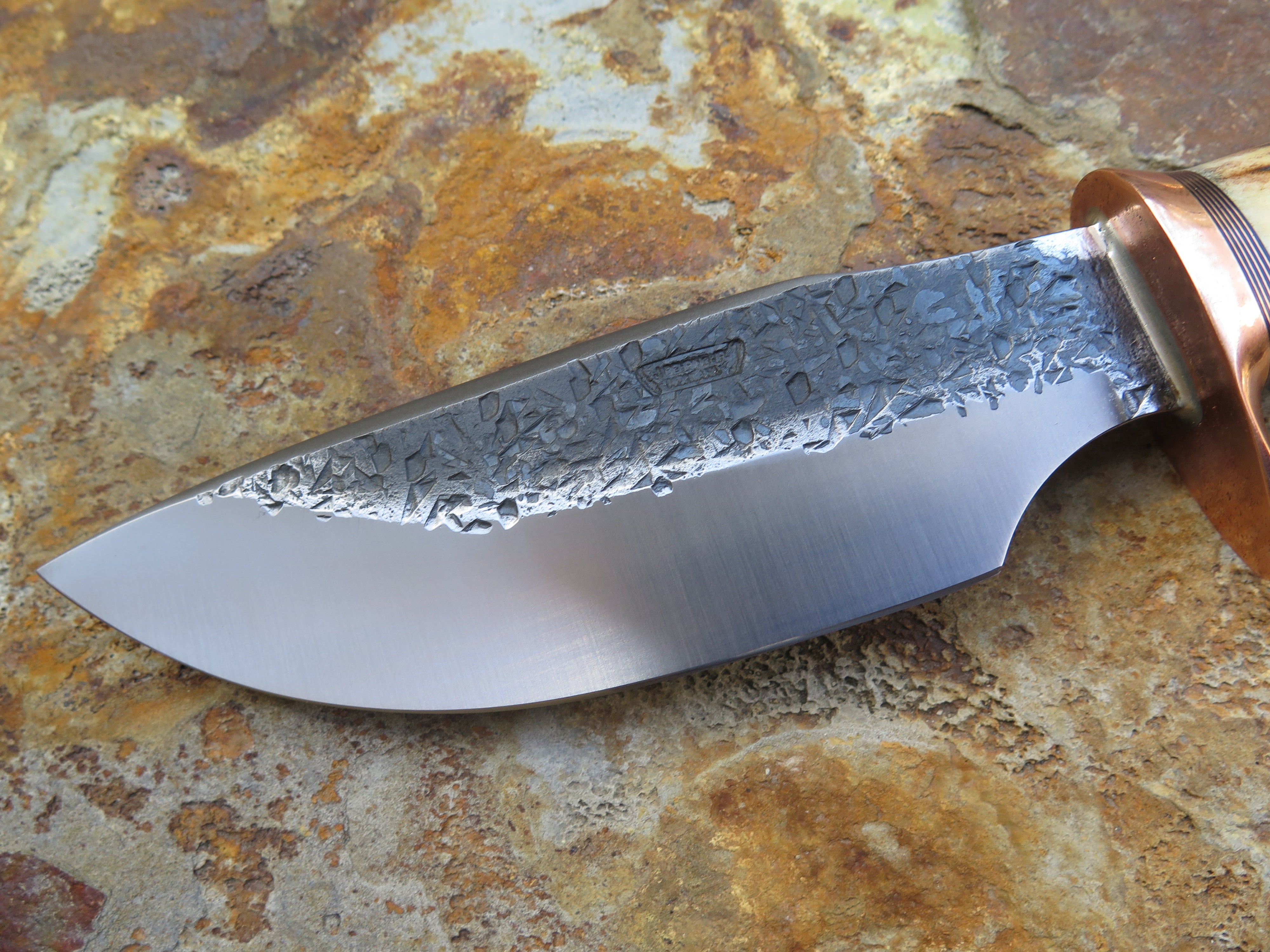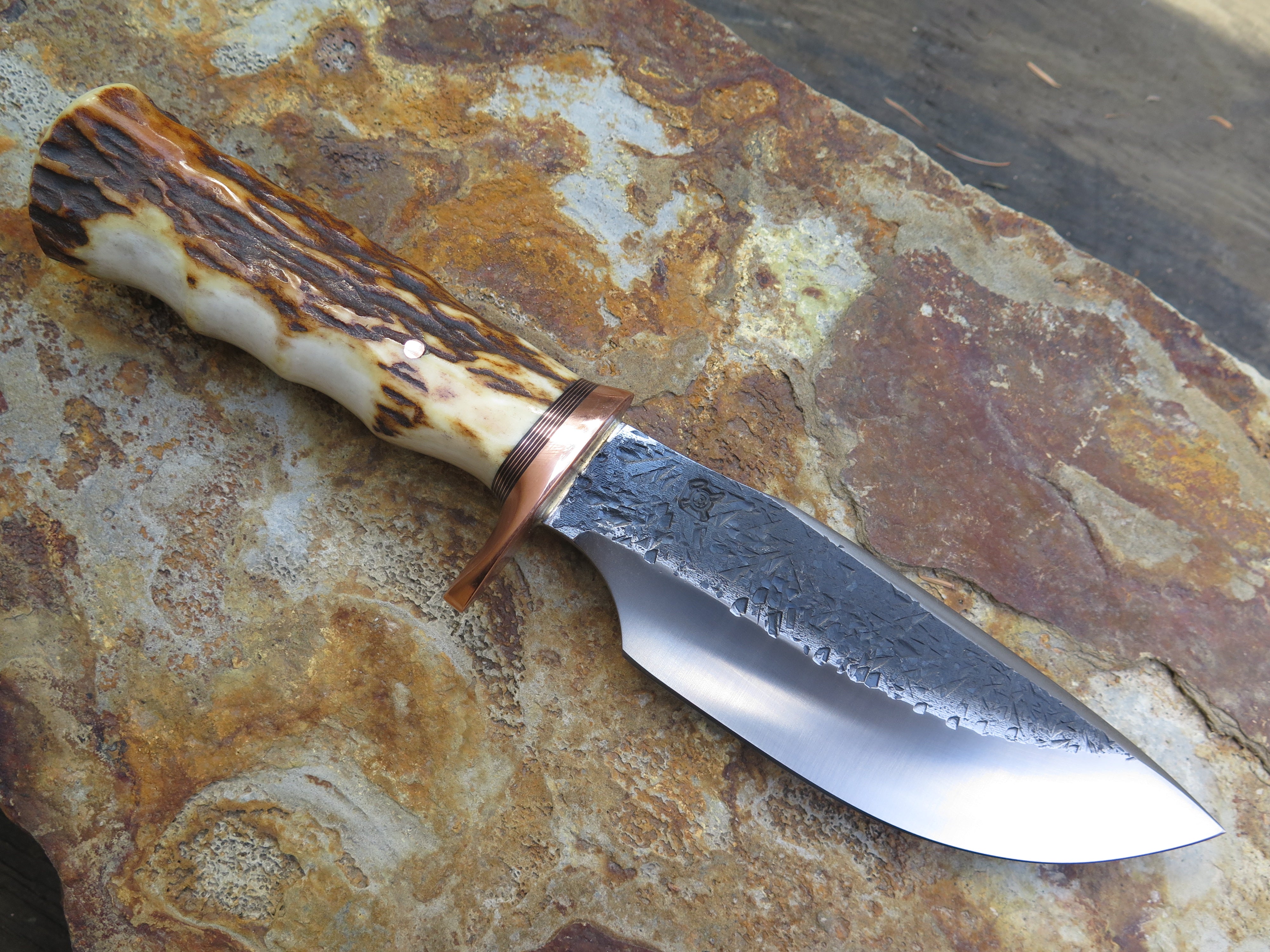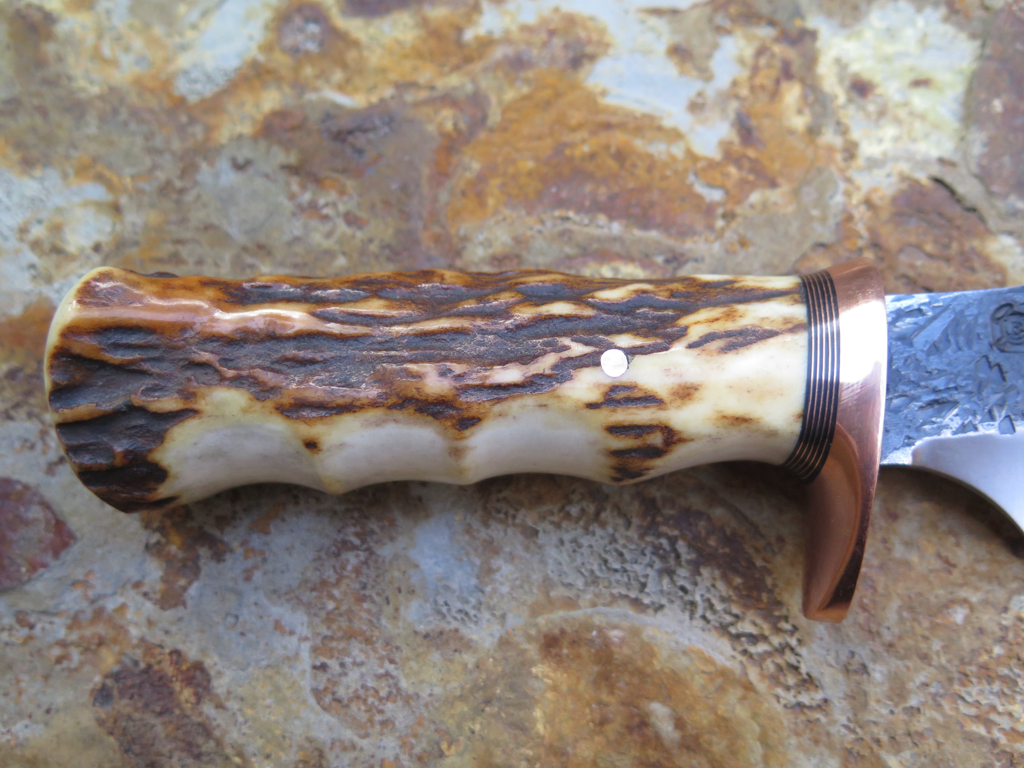 This incredible new Alaskan from Behring Made© is hand forged from 3/16" thick 5160 spring steel and it measures 5 3/4" from tip to guard with a razor sharp hollow grind and our hammermark finish. The copper guard is soldered in place above black fiber and copper spacers with a finger grip sambar stag handle that's pinned through the tang with copper. The overall length measures just over 10 1/2" and it'll come in a custom fitting pouch sheath from Warlander Leather.