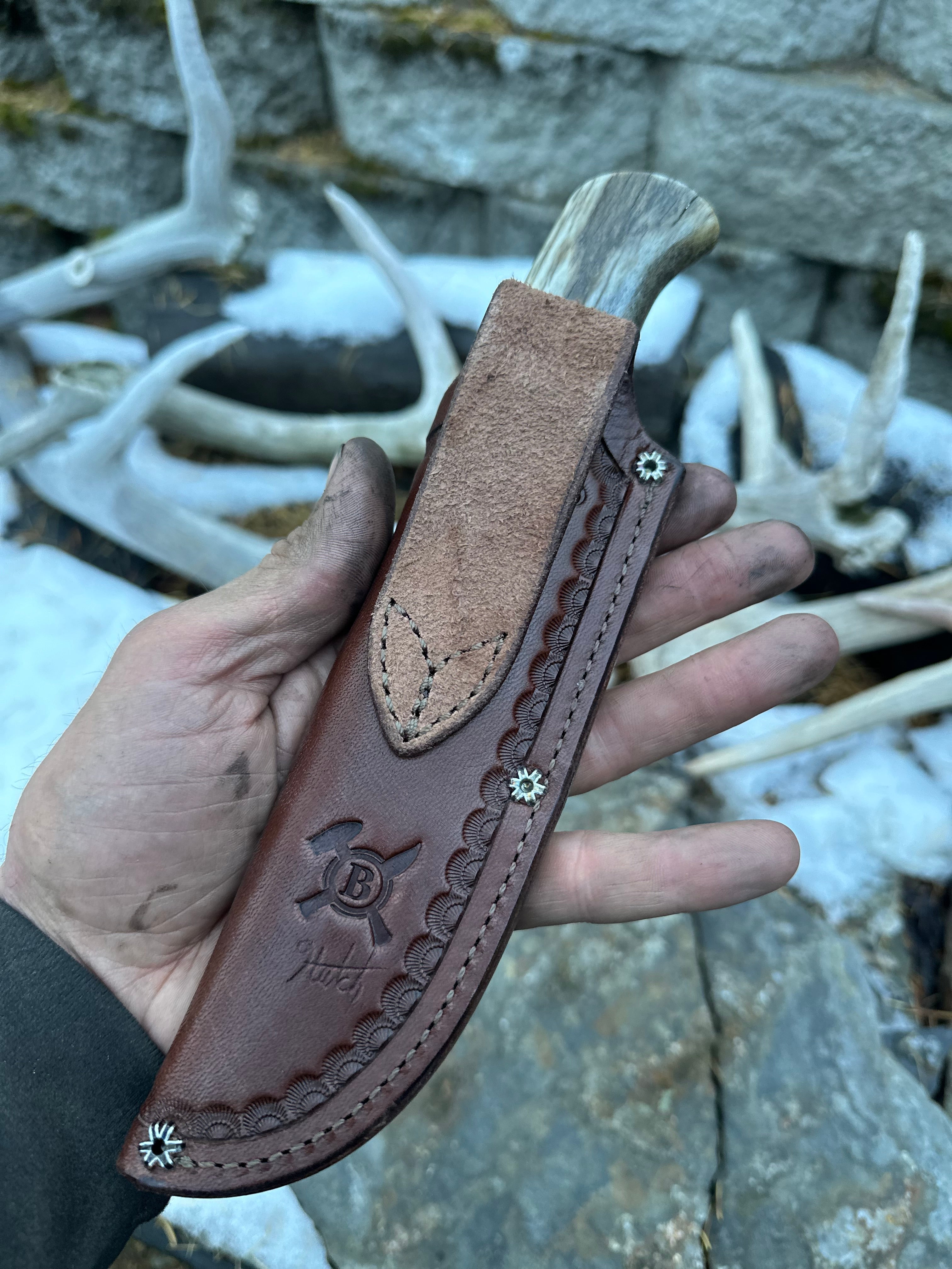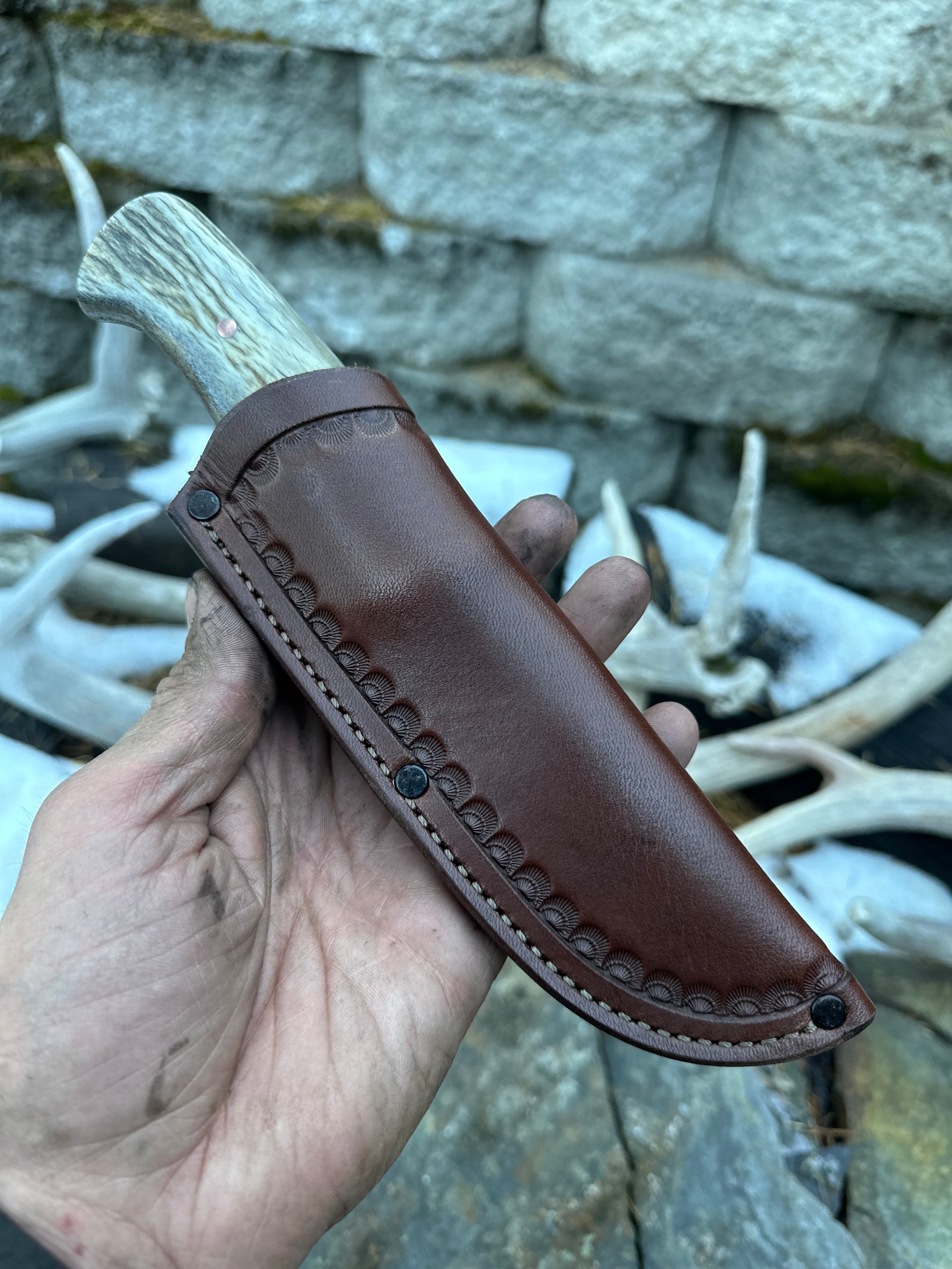 - Dark Brown Border Tooled Pouch Sheath w/ Black Rivets