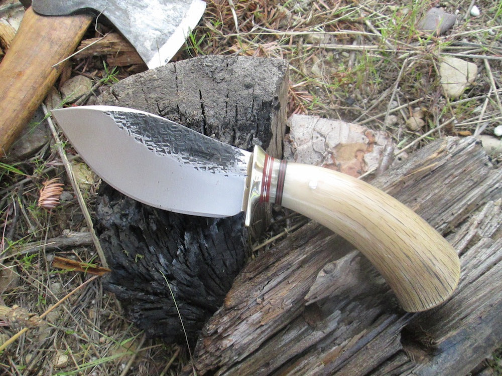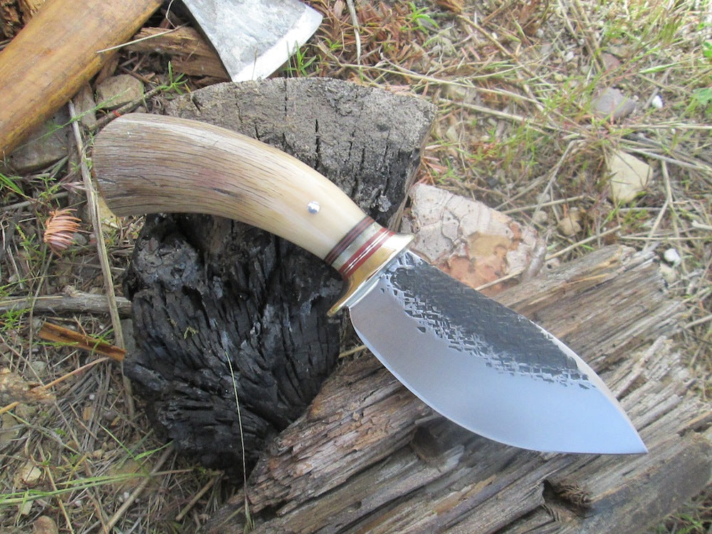 This Behring Made is a 4 5/8" hand forged hammer marked Nessmuk, joined by a perfectly soldered joint to a nickel silver guard. Below are maroon, black, and aluminum spacers that crown the beefy but comfortable Musk Ox Carver handle that is pinned with aluminum. At 9" overall, you have an ideal outdoor companion. It comes in a Warlander Leather sheath as well.