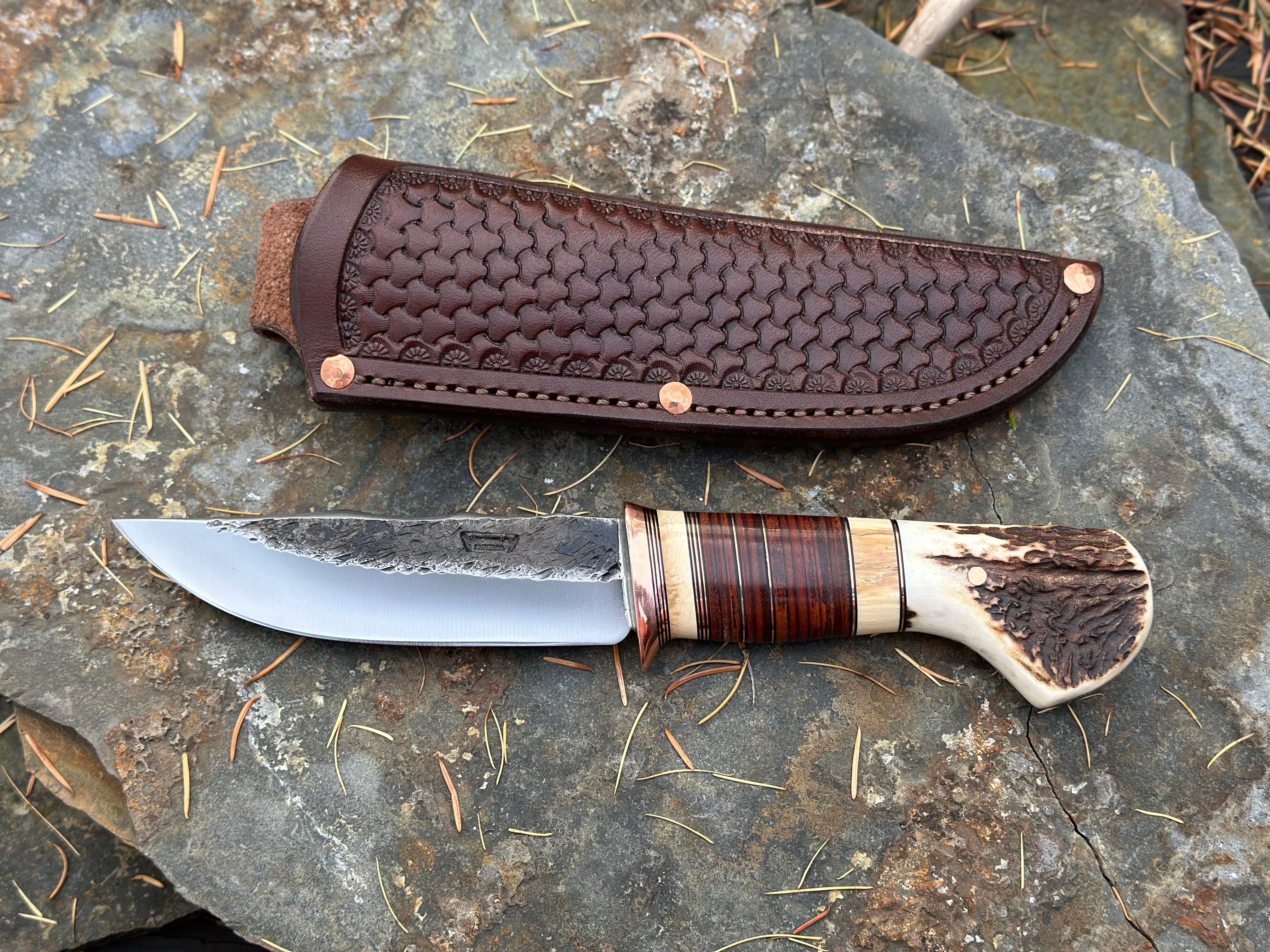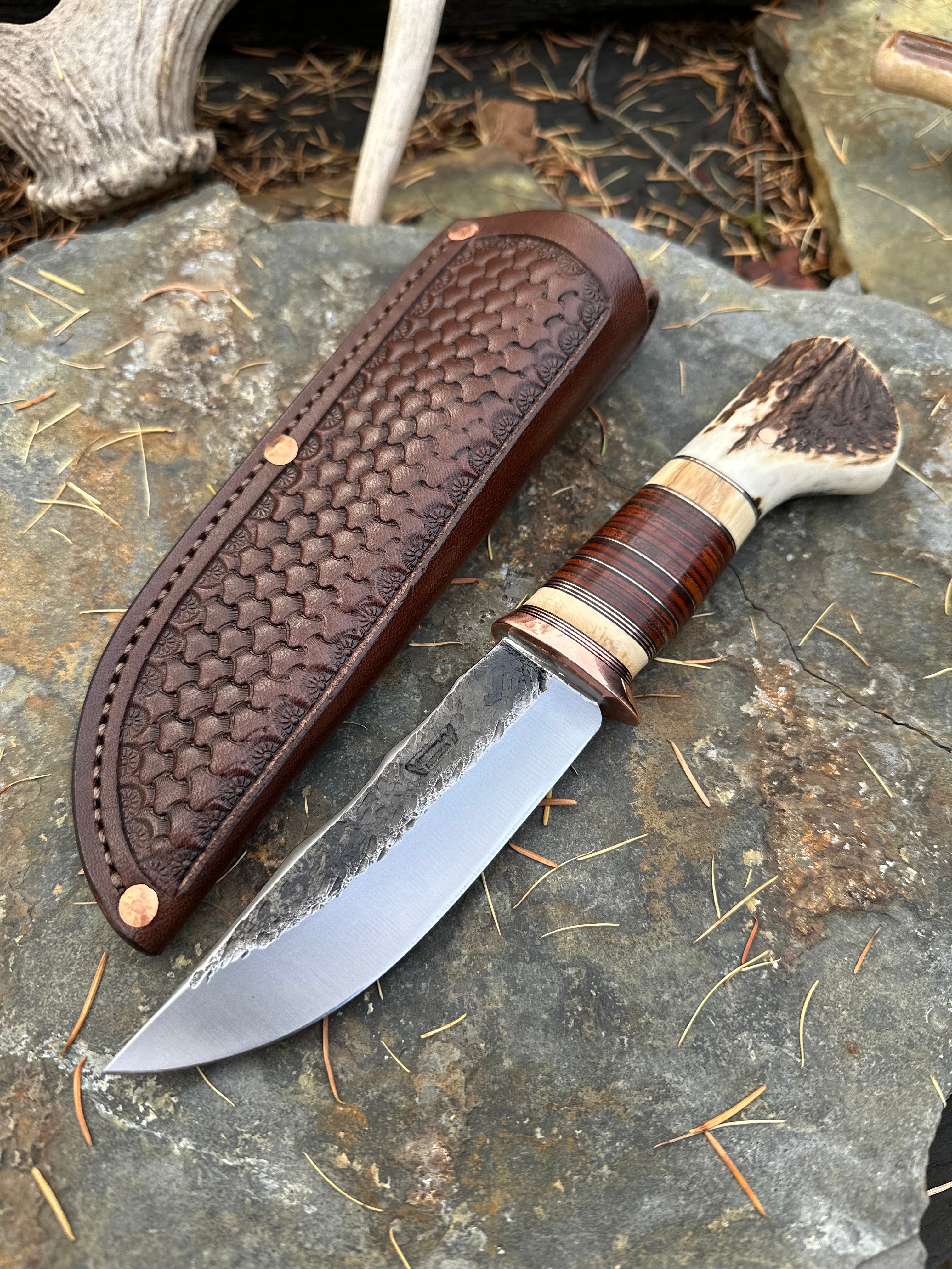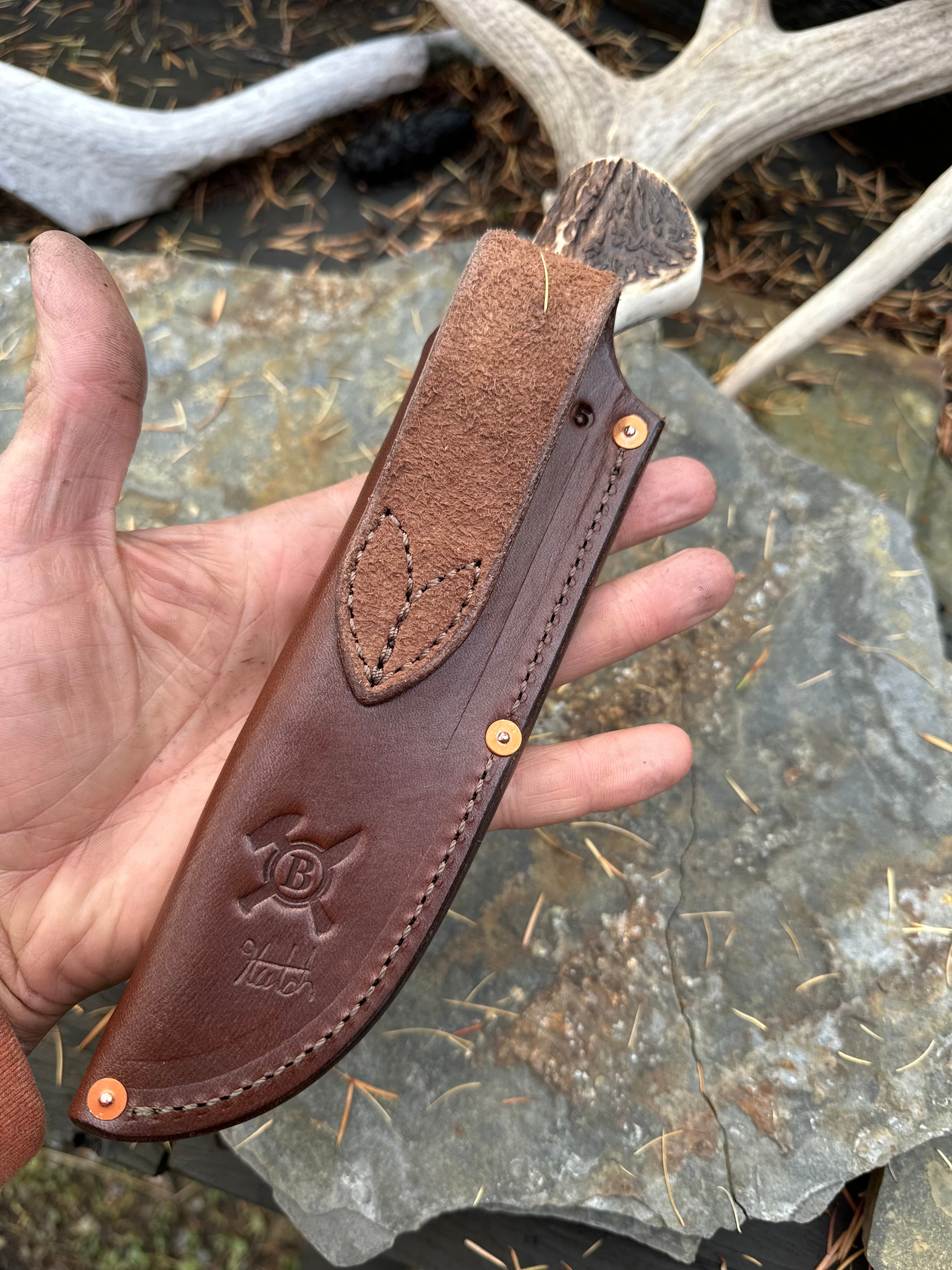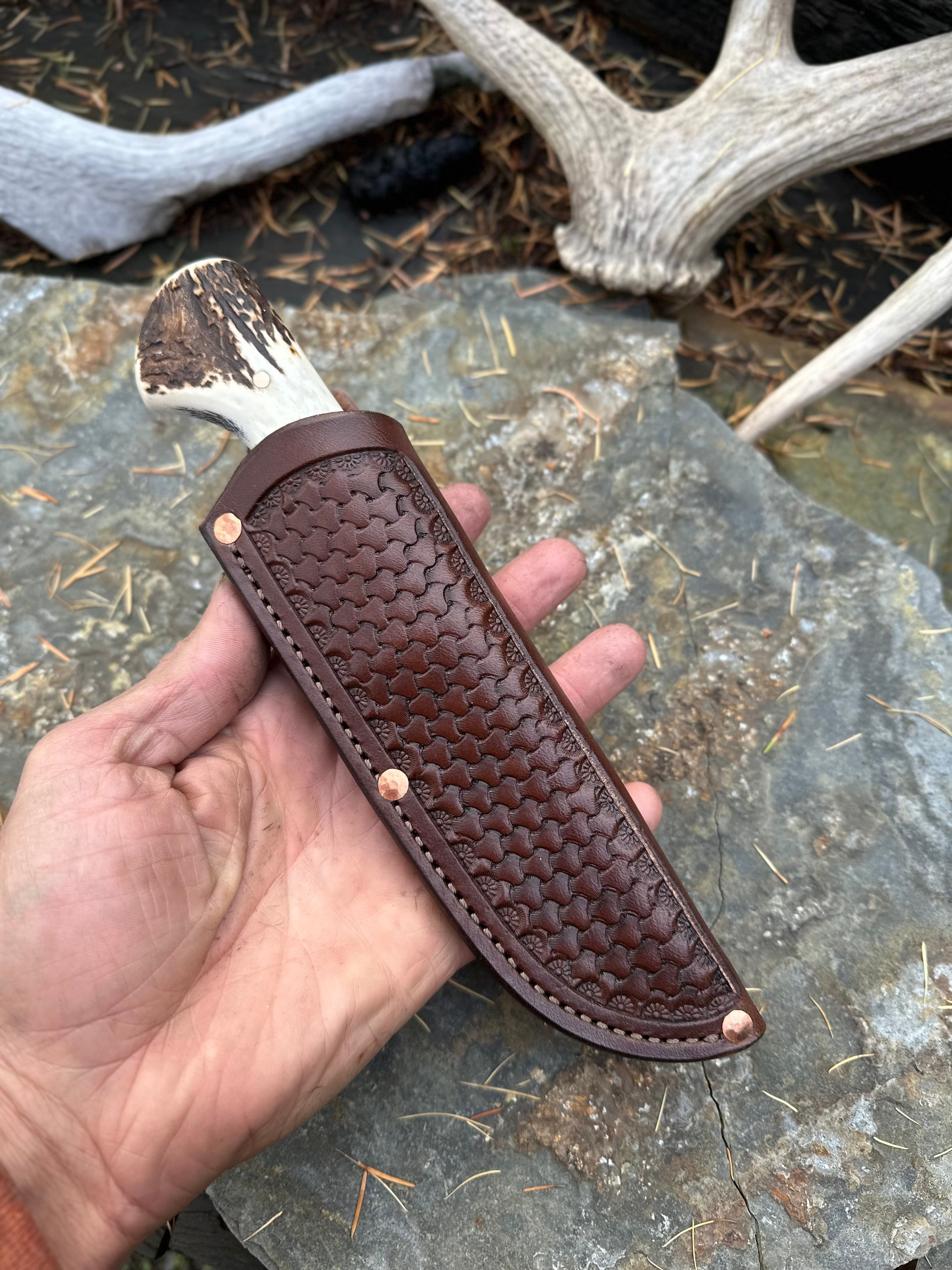 - Dark Brown Tooled Pouch Sheath w/ Copper Rivets