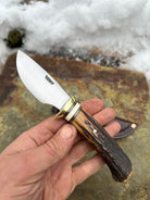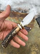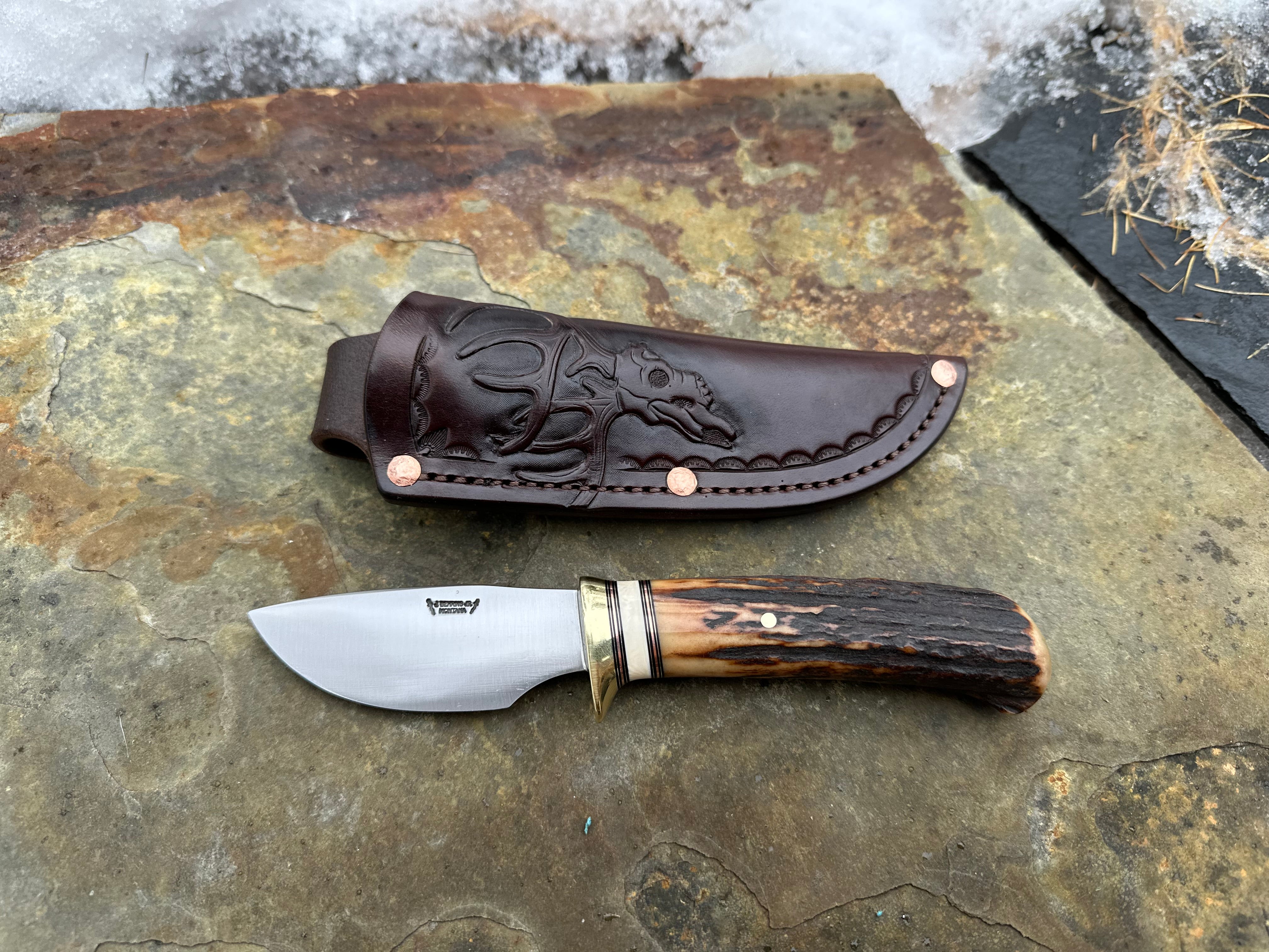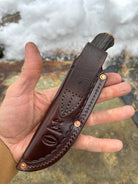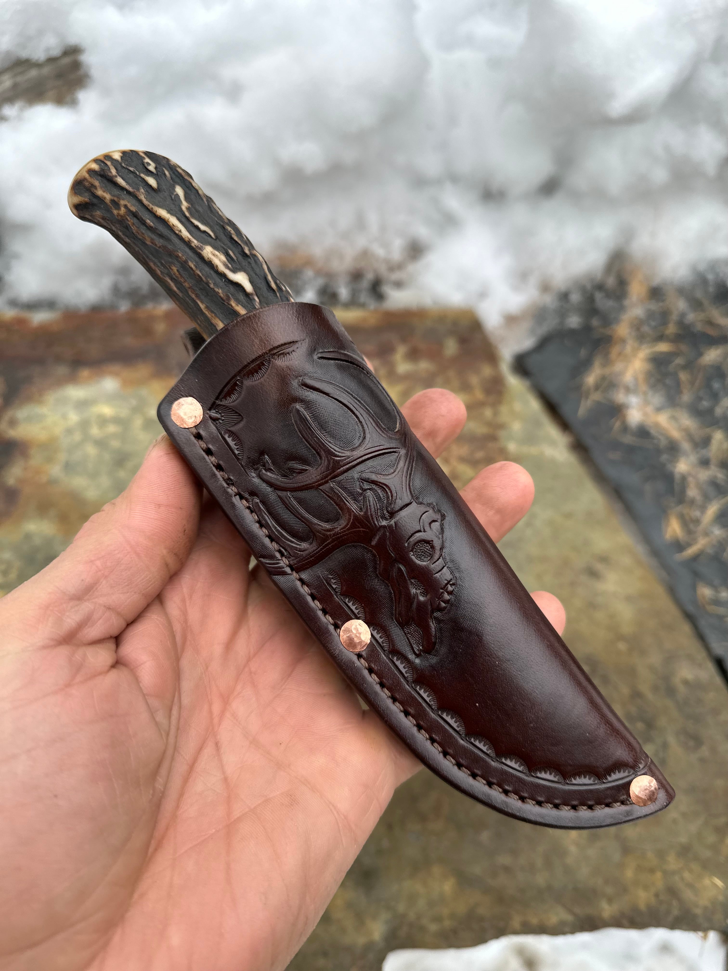 - Brown Pouch Sheath with Carved Deer Skull and Copper Rivets