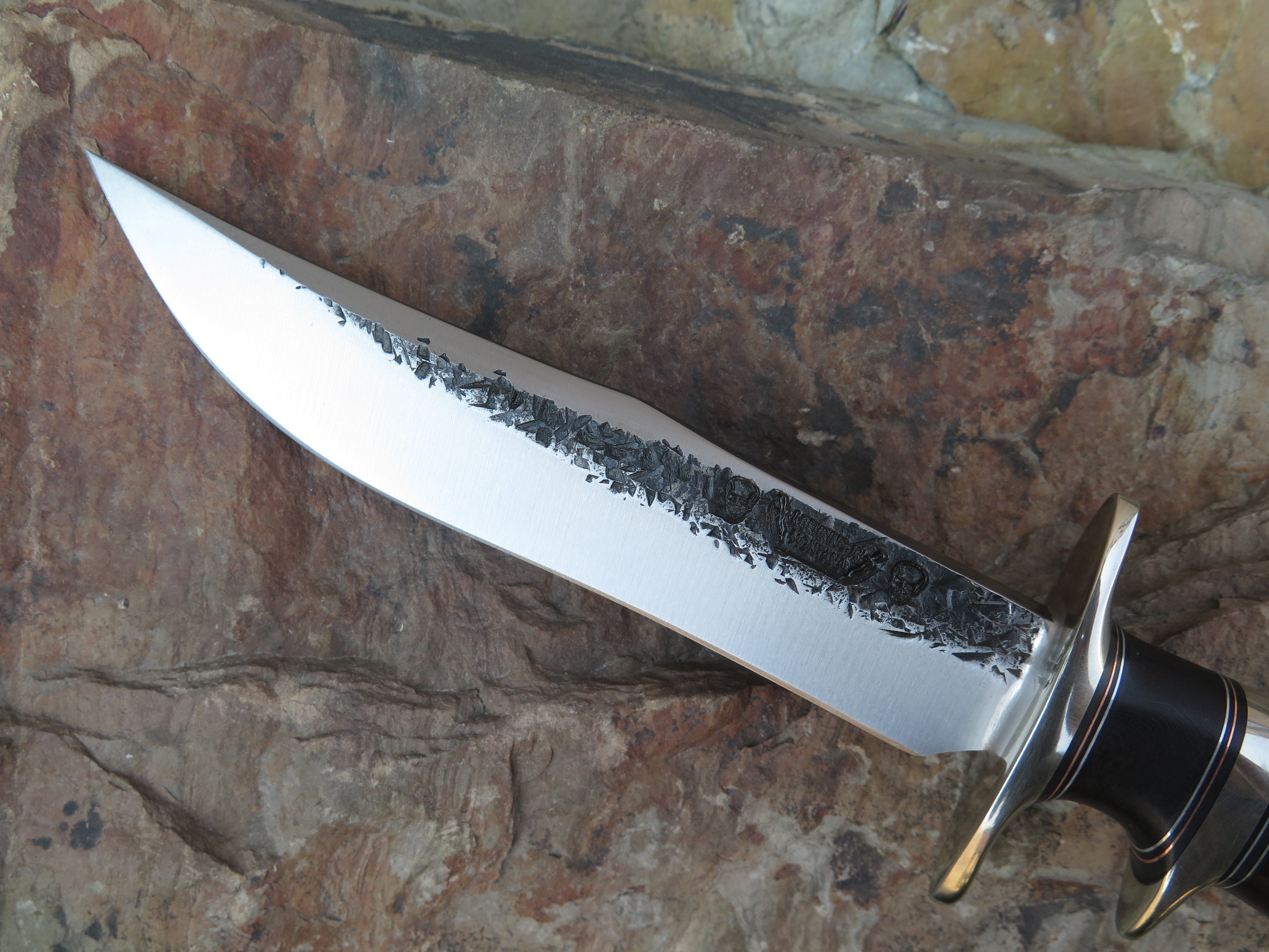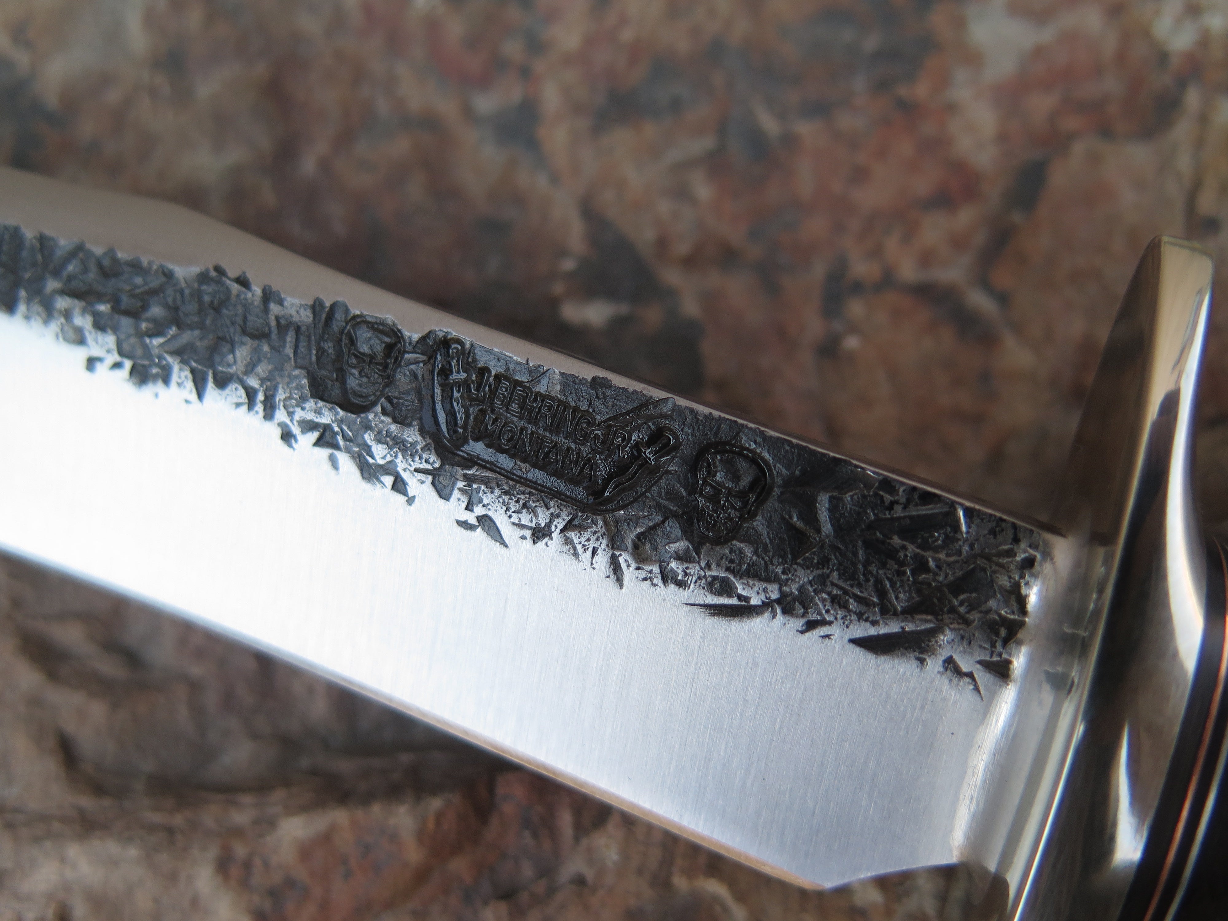 This beautiful new Recurve Fighter from Behring Made™ is hand forged from 3/8" thick high carbon 01 tool steel and it measures 6 1/2" from tip to guard with a razor sharp hollow grind and a hammermark finish. The tall nickel silver guard is soldered in place above black fiber, copper, and aluminum spacers along with ironwood burl and a nickel silver sub-hilt. The handle is also premium ironwood burl and it's pinned through the tang with aluminum for a rock solid, guaranteed construction. Overall length measures 11 5/8" and it comes in a custom sheath from Rowe's Leather.
