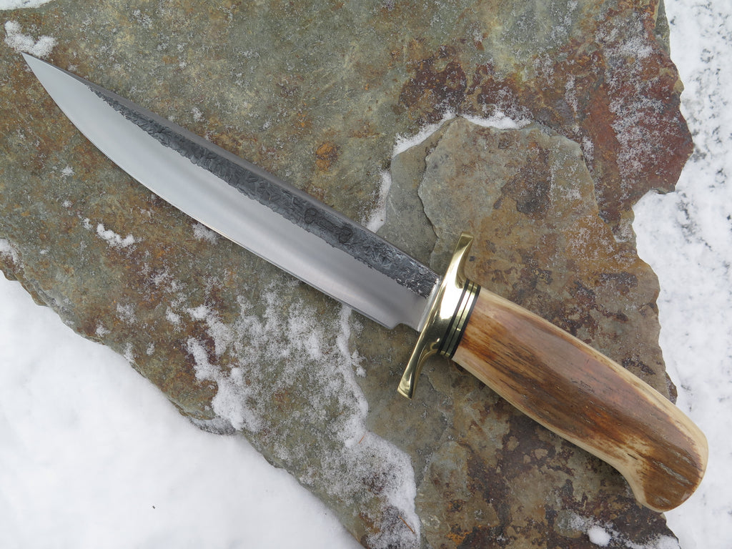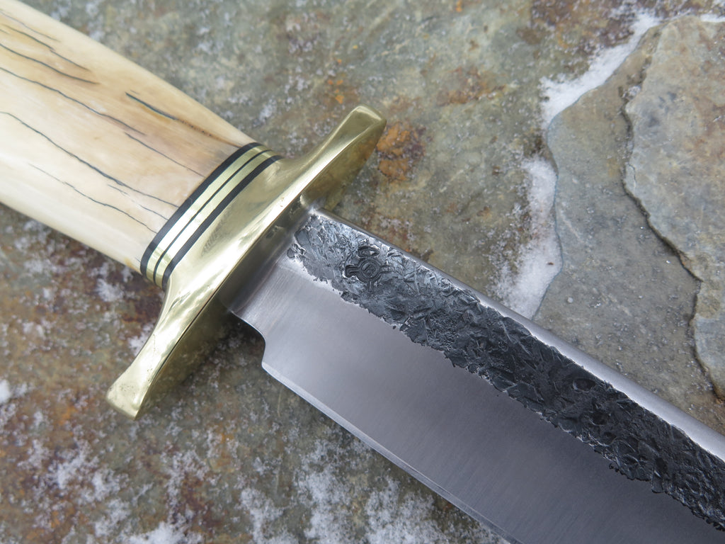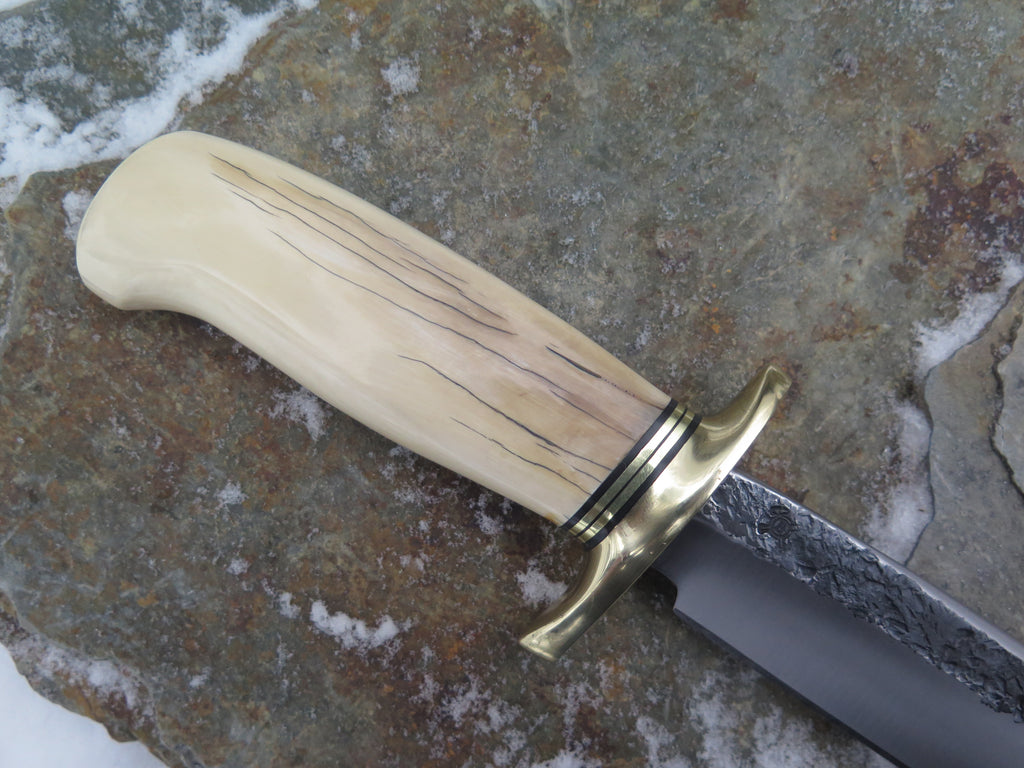 This beastly new creation is the Behring Made© XL Field Knife It's hand forged from 13/64" 5160 spring steel and the blade measures 8 1/2" from tip to guard with a razor sharp hollow grind and our hammermark finish. The tall brass guard is soldered in place above black fiber and brass spacers as well as a beautiful ancient mammoth ivory handle featuring a crow's beak grind. The overall length measures 13 3/4" and it will come in a custom sheath.