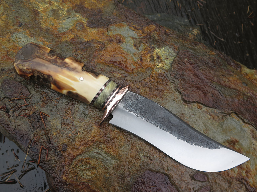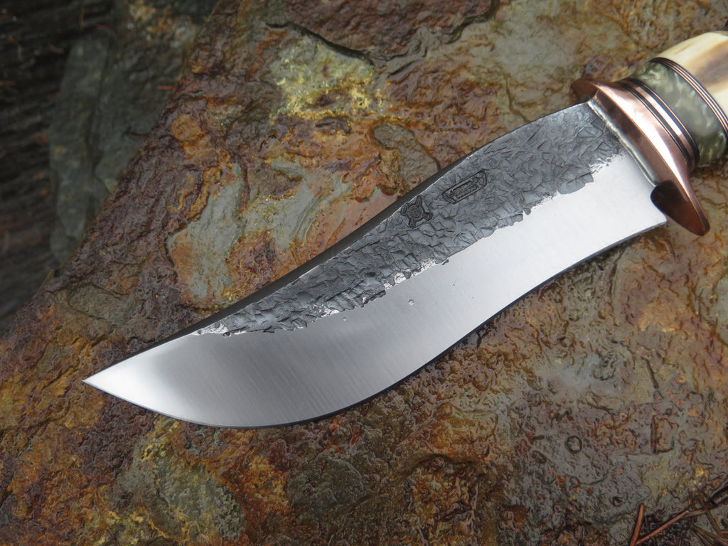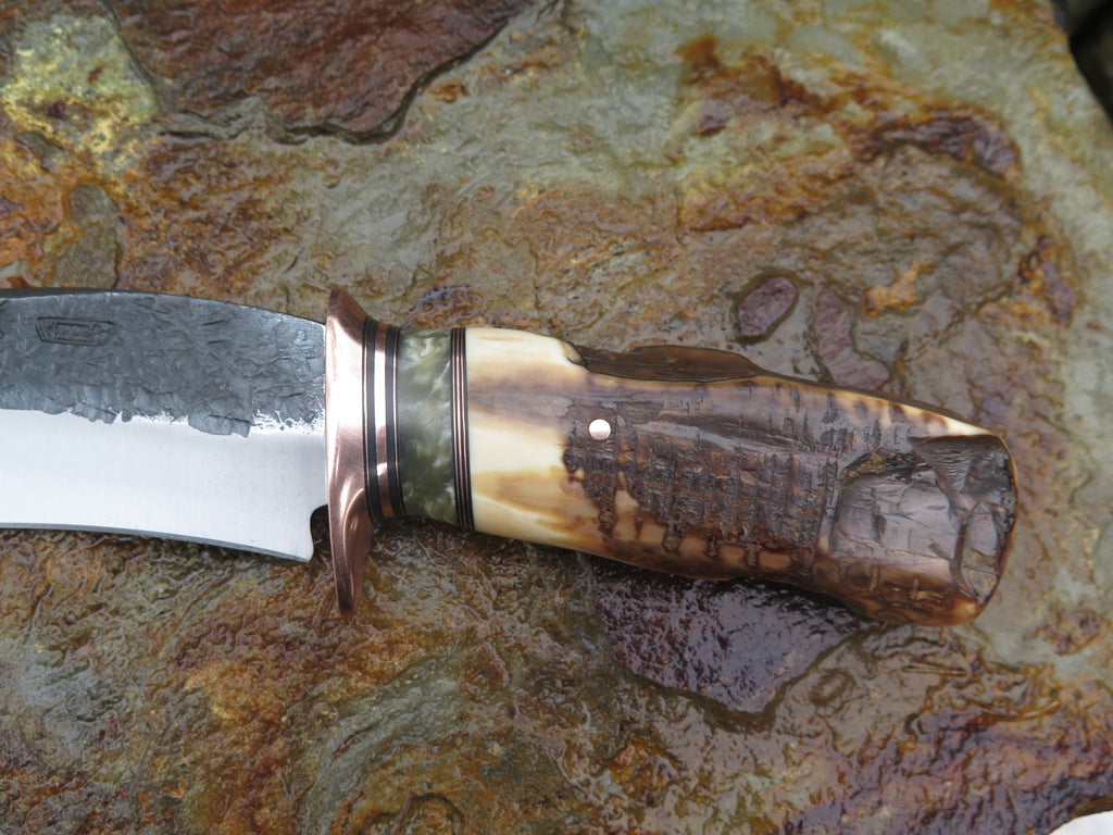This beastly new Recurve Bowie from Behring Made© is hand forged from 13/64" thick 5160 spring steel and it measures 6 3/4" with a razor sharp hollow grind and our hammermark finish. The copper guard is soldered in place above black fiber, copper and musk ox boss spacers as well as a premium artifact walrus ivory handle that's pinned through the tang with copper. The overall length measures 11 5/8" and this one will come in a custom sheath from Imperial Leather.