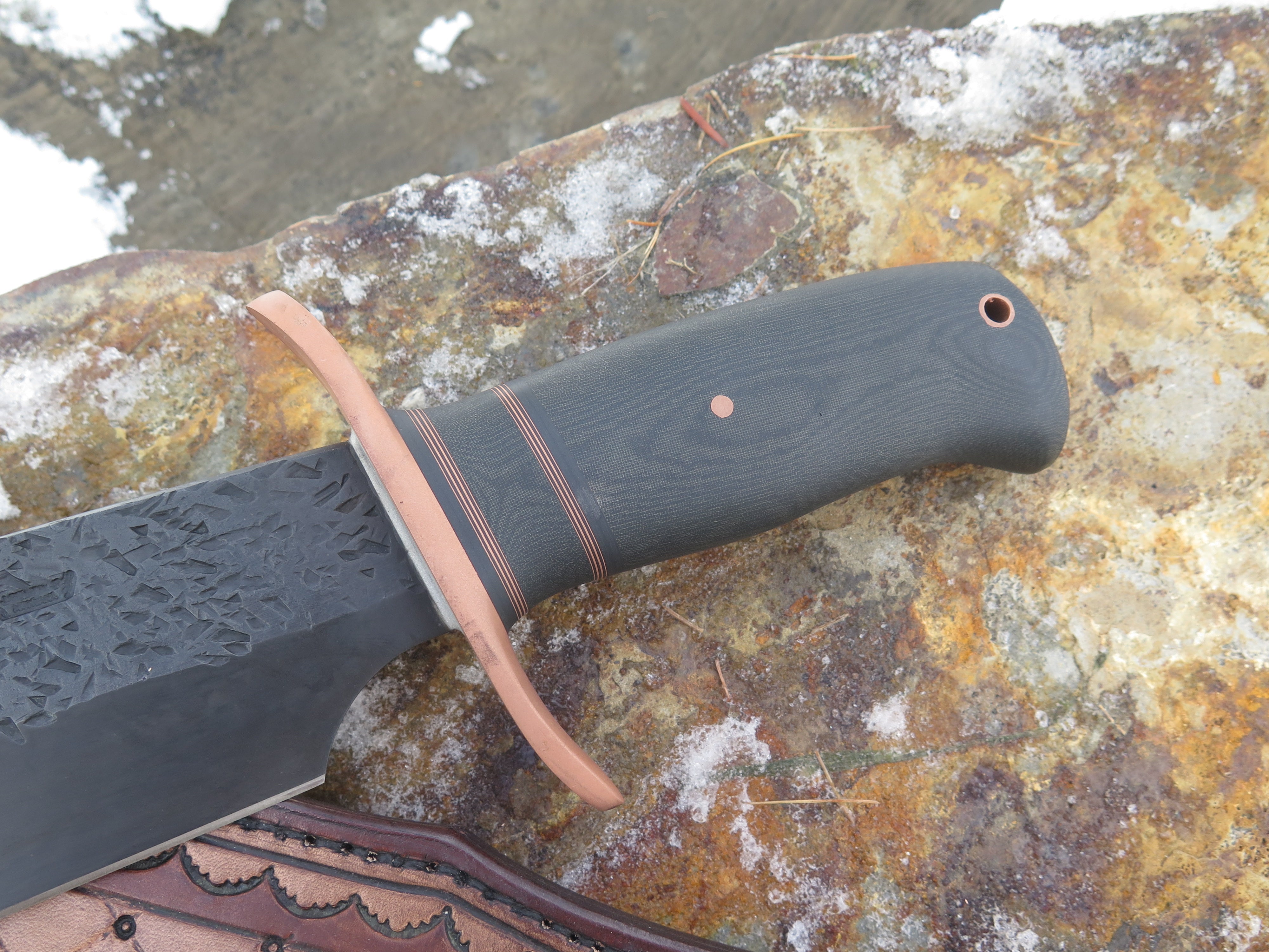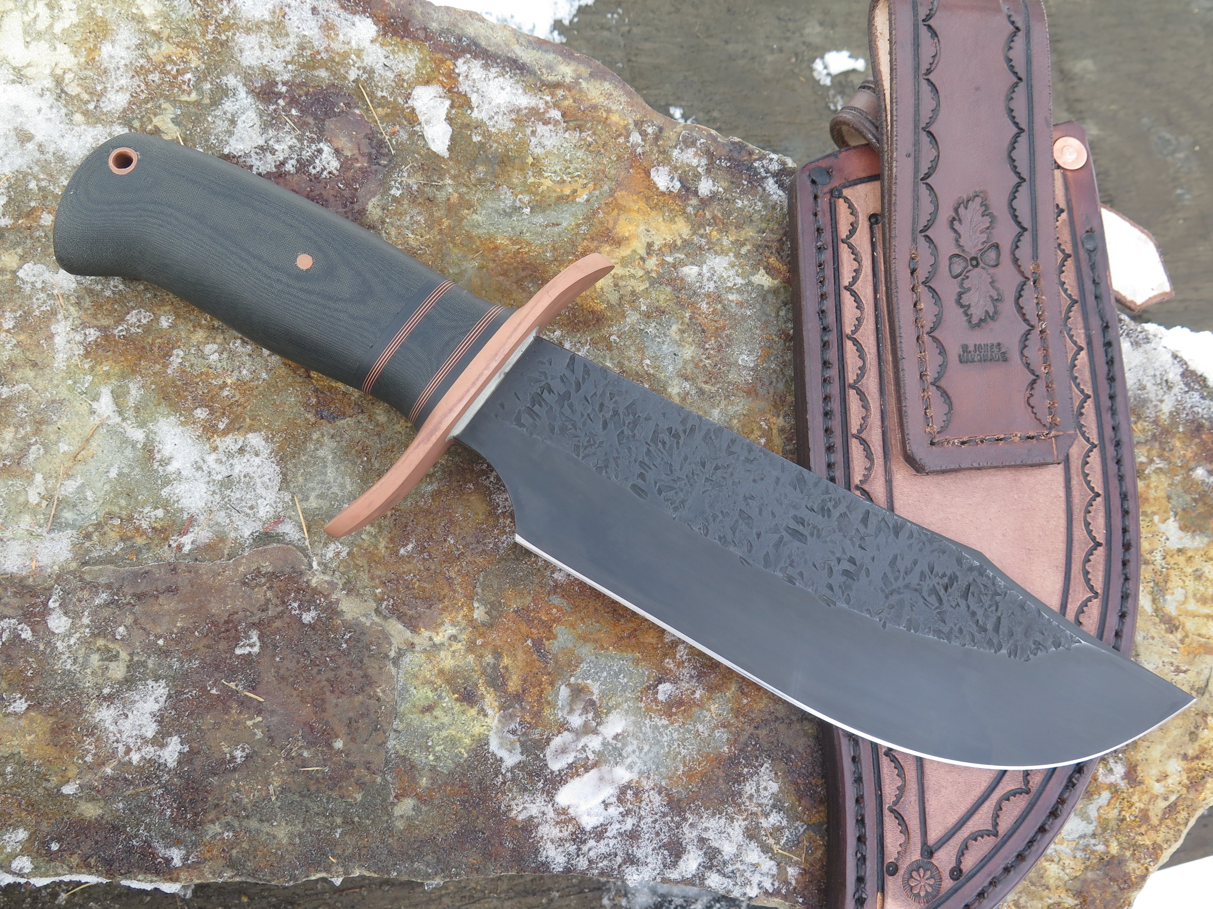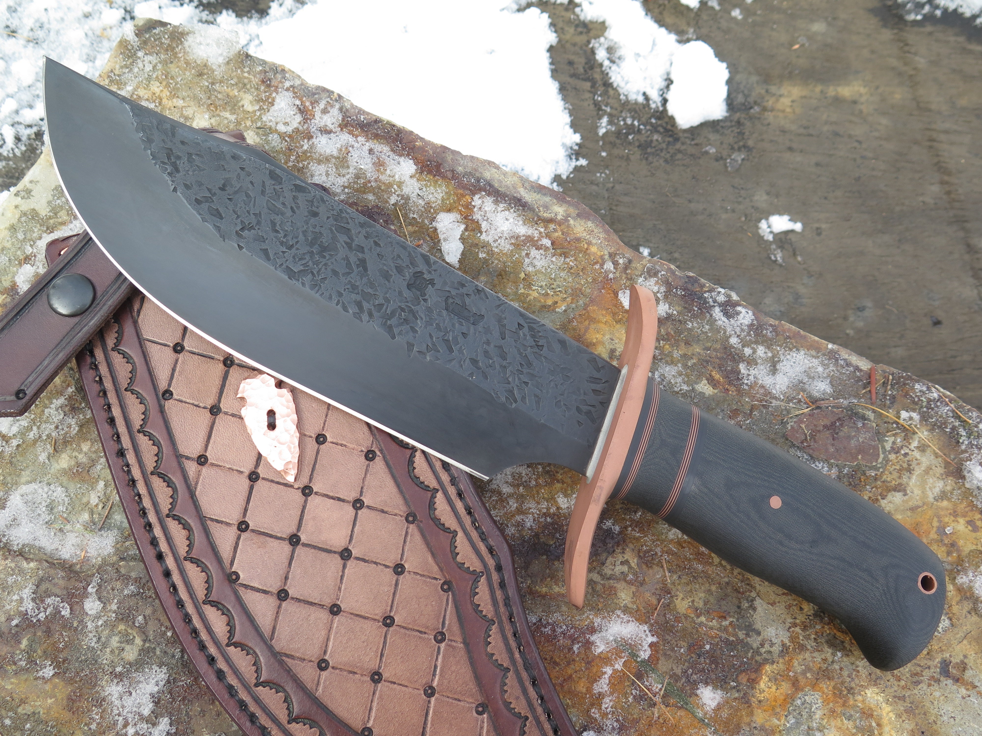 This spankin' new Behring Made© South West Bowie is a serious bruiser with a 1/4" thick high carbon 01 tool steel blade that we hand forged to 9" that features a razor sharp hollow grind, hammermarks and our forced patina blued finish. The forged copper s-guard is soldered in place above black and copper spacers as well as a black linen micarta crow's beak handle that comes together for a truly bad ass personality. Overall it measures just over 13 1/2" and the handle is pinned through the tang with copper for a rugged construction we guarantee for life. This one couldn't come in just any sheath, so we sent it to Mudbone for a custom and he really worked his magic with the cross-hatch and handmade copper arrowheads.