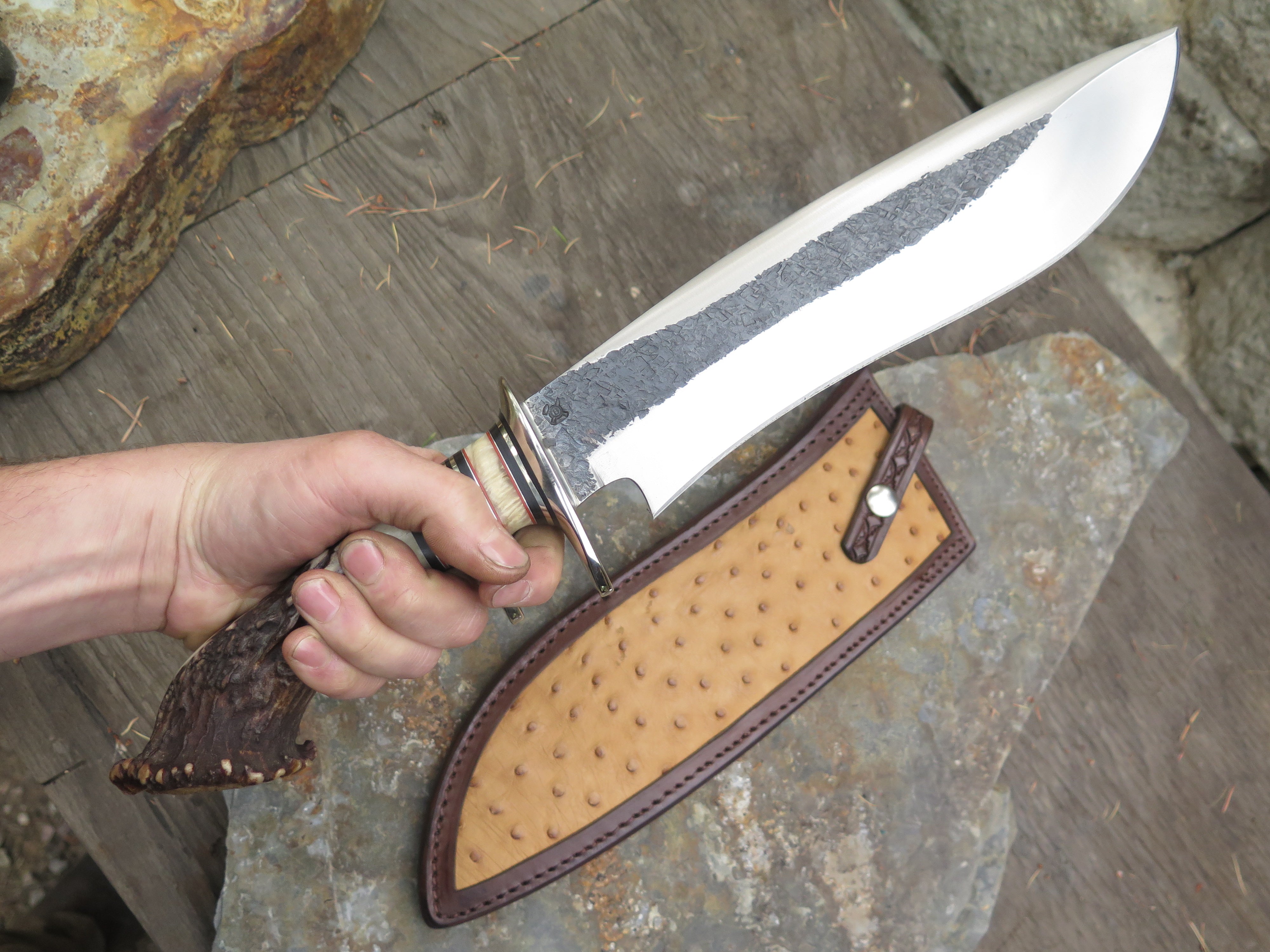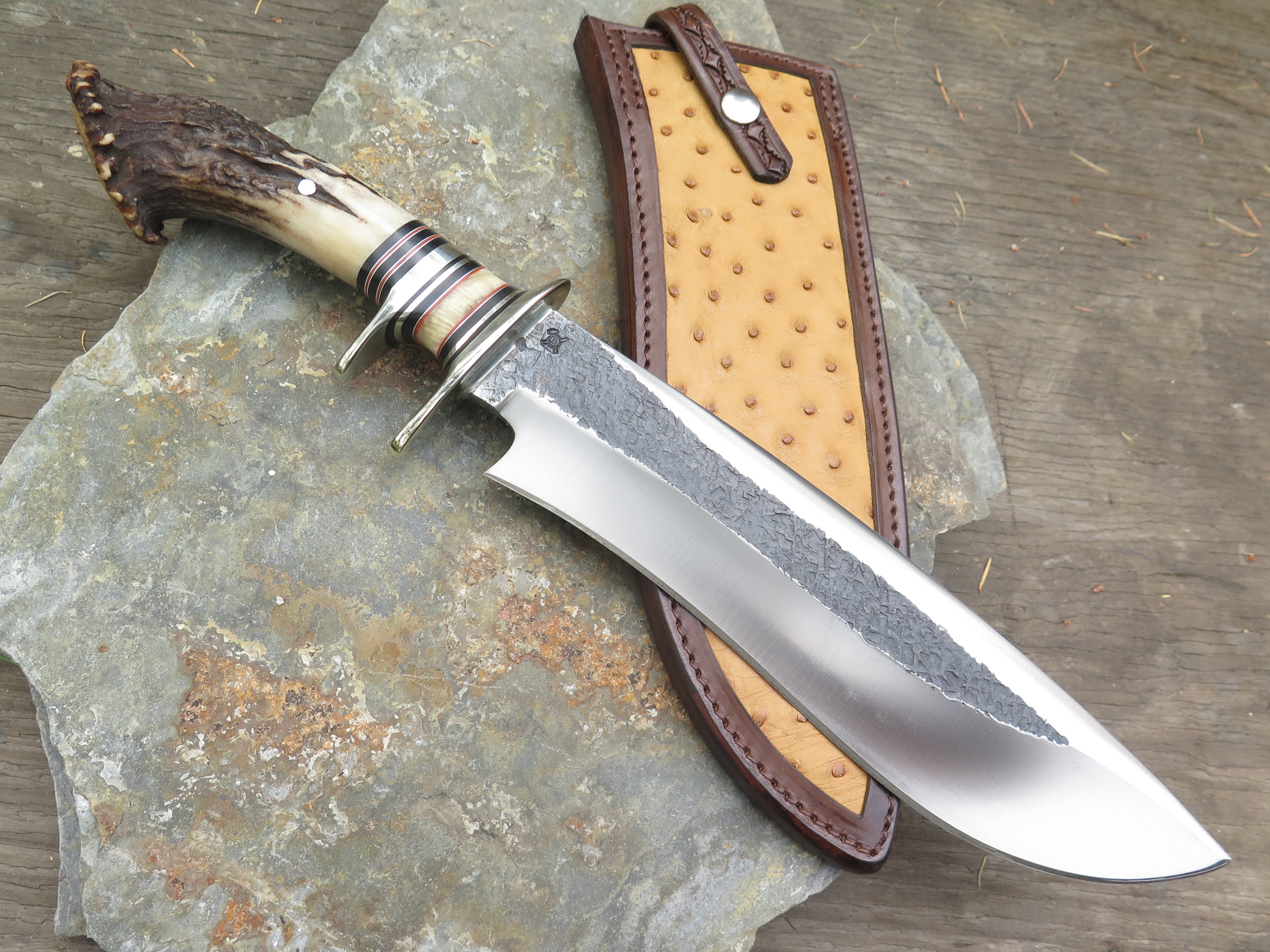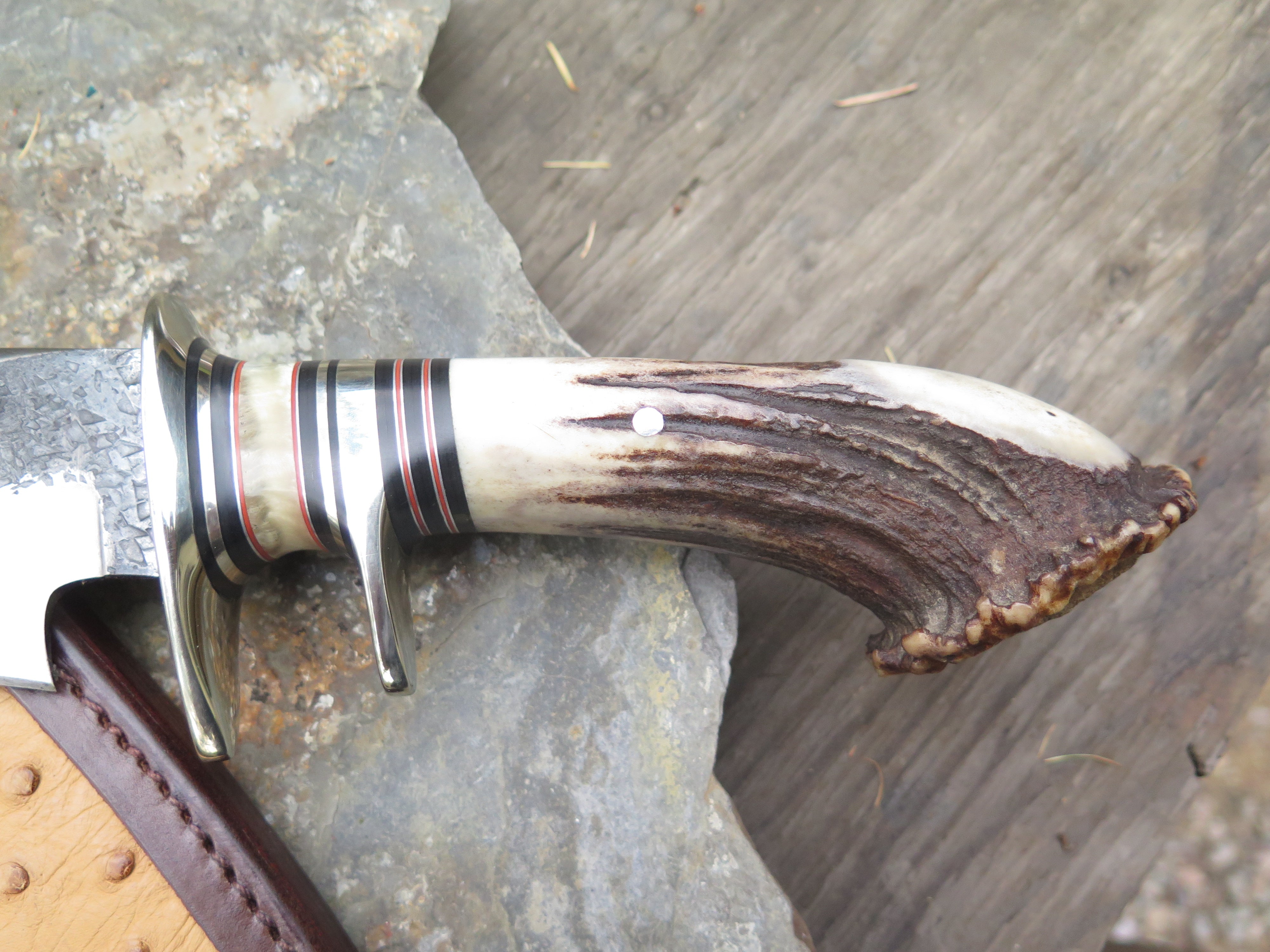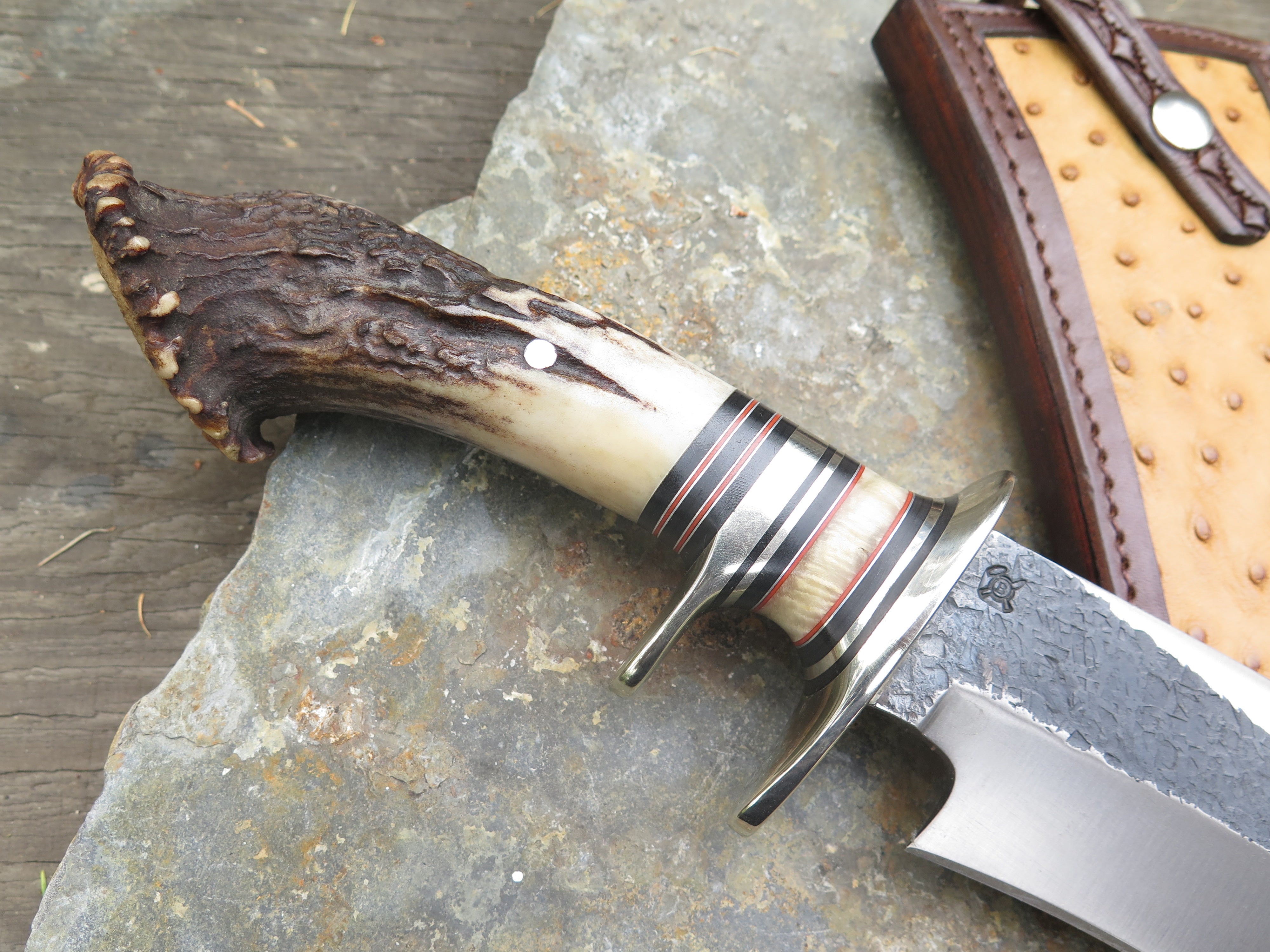This Sasquatch from Behring Made© couldn't be more appropriately named with a whopping 11" blade that's hand forged from 3/8" thick high carbon 01 tool steel with a razor sharp hollow grind that's got a hammermark finish with a sharpened clip. The nickel silver guard is soldered in place above black and maroon fiber, aluminum and musk ox boss spacers with a nickel silver sub-hilt. The premium sambar crown stag handle is pinned through the tang with aluminum and it measures 17 3/4". To top it off this one ones in a custom ostrich inlaid sheath from Rowe's Leather.