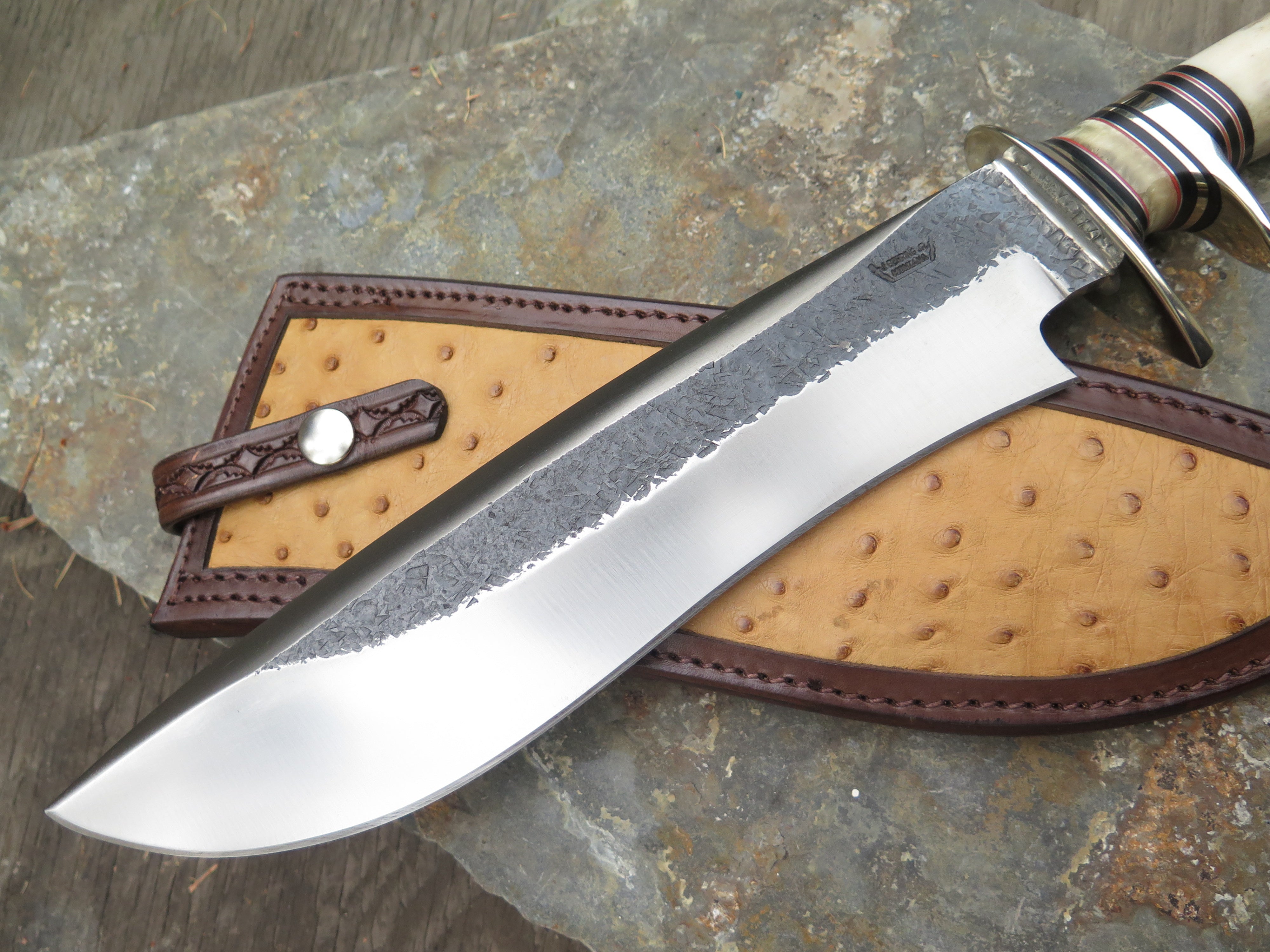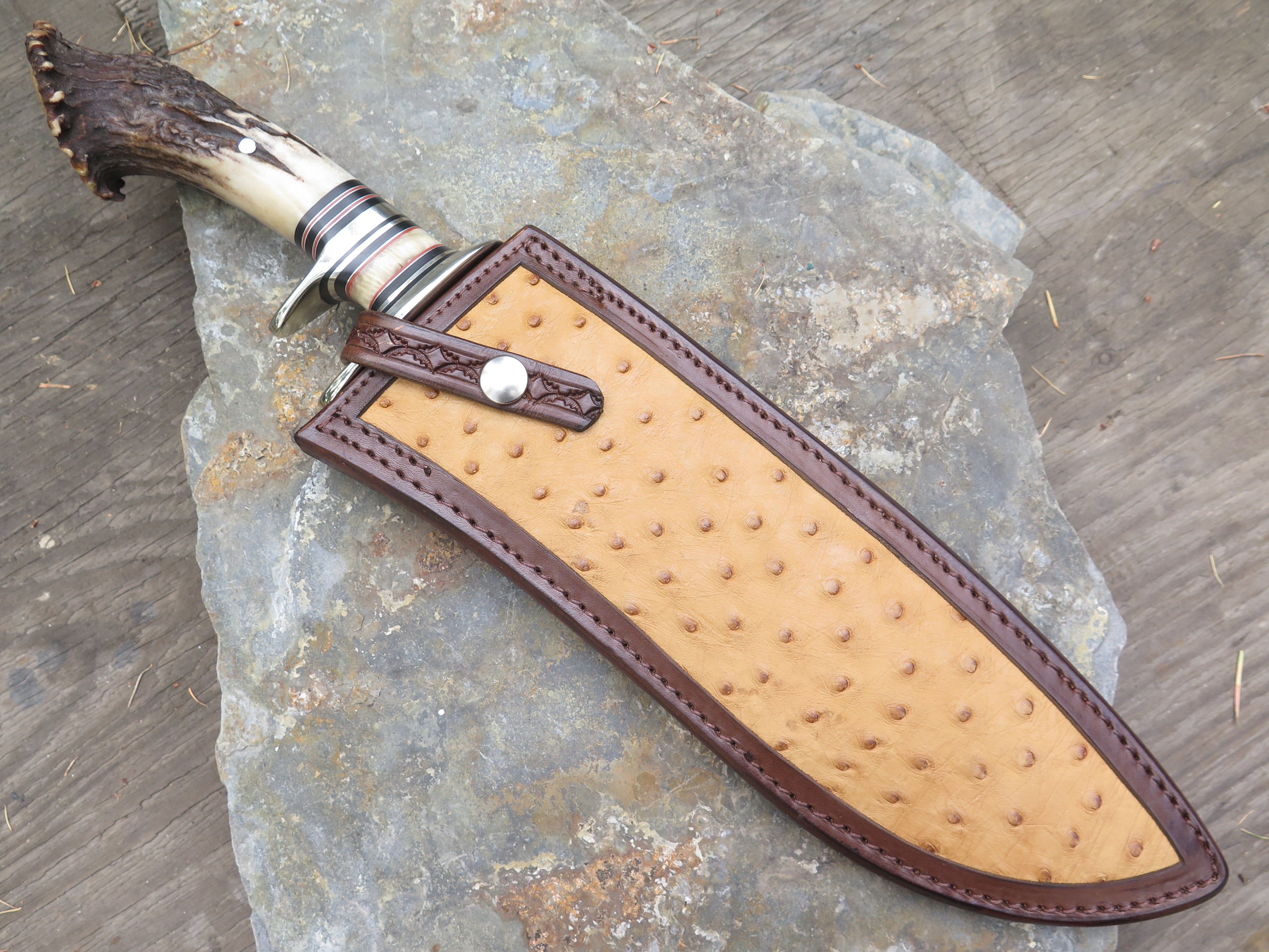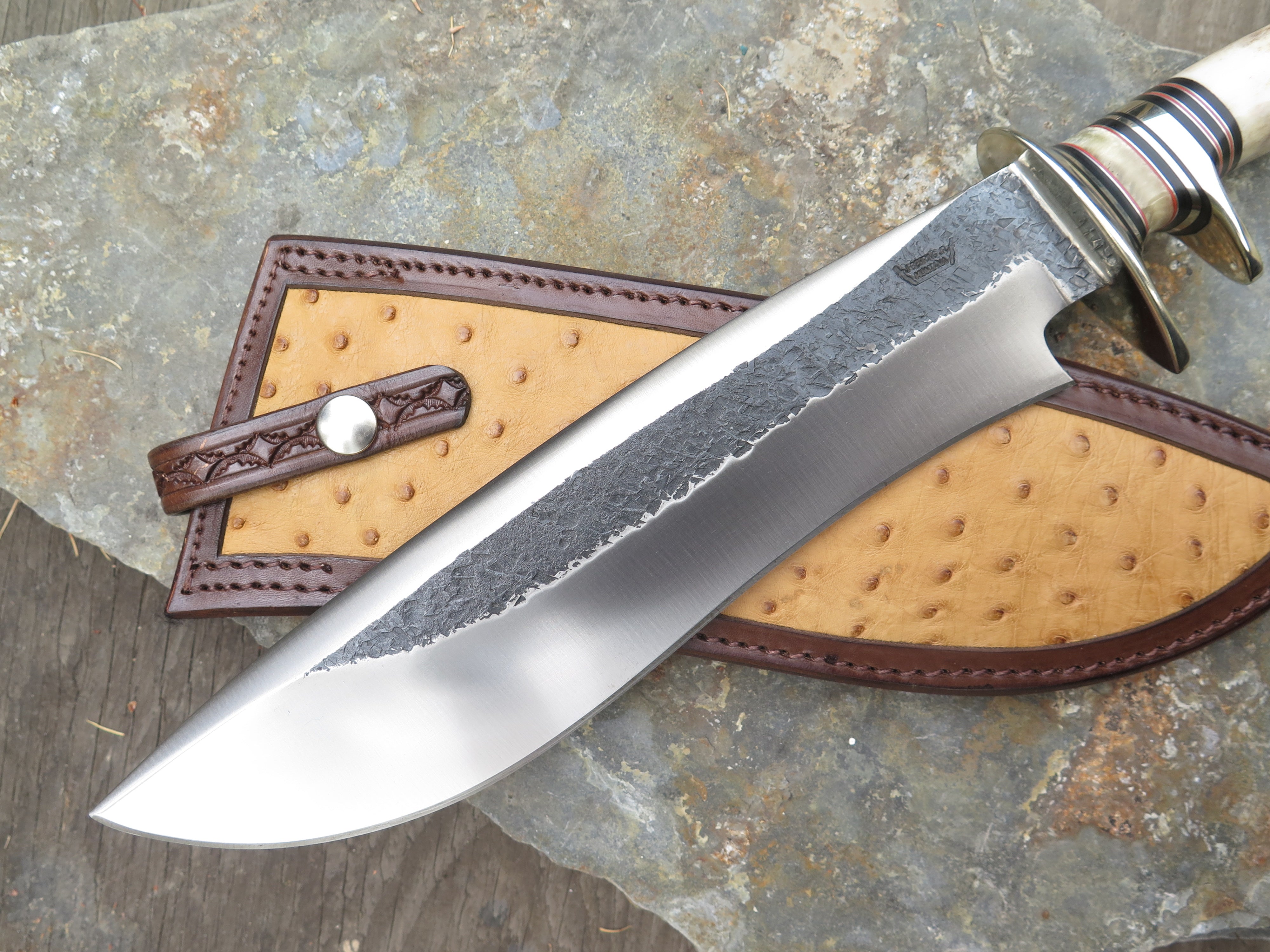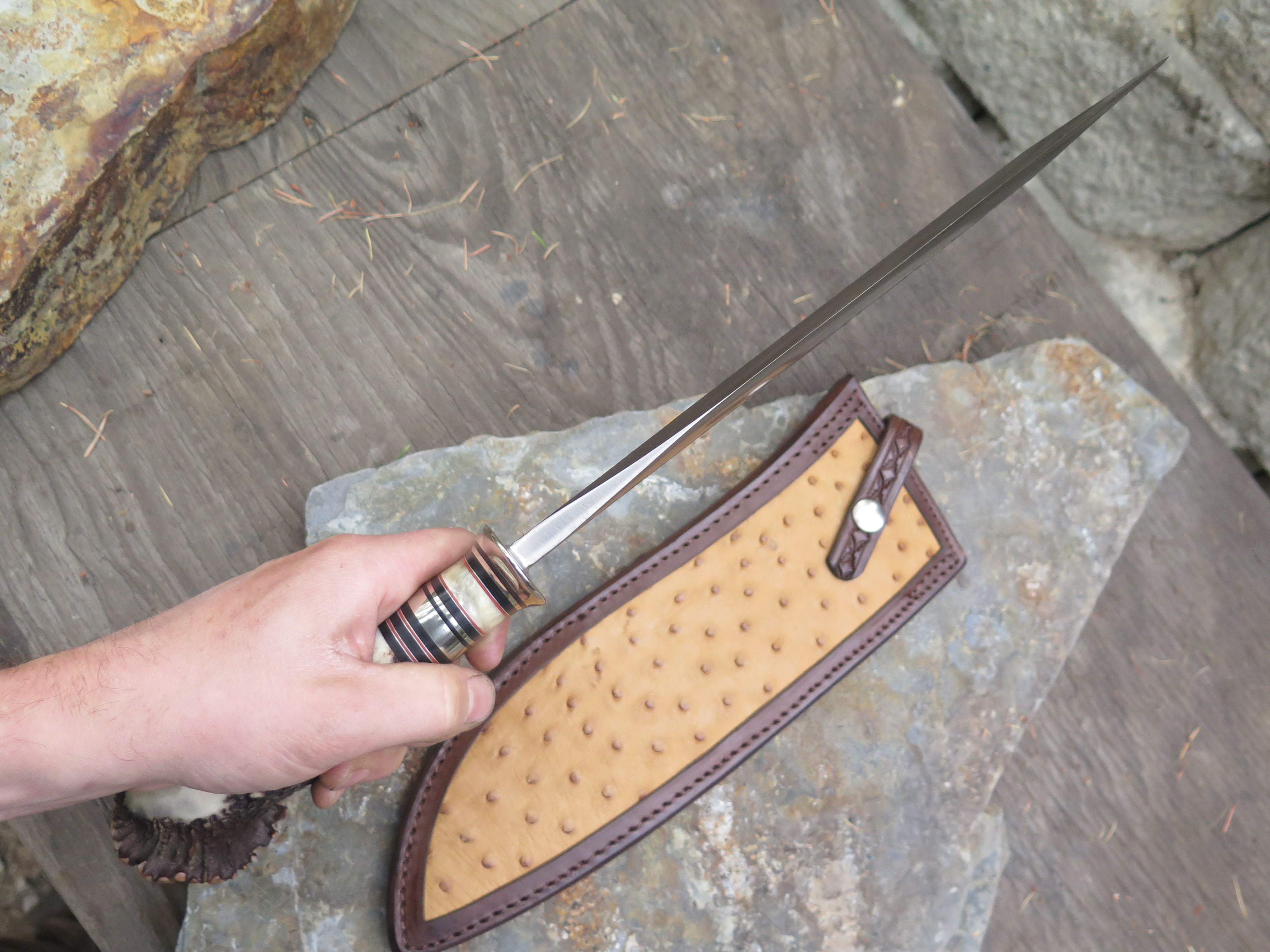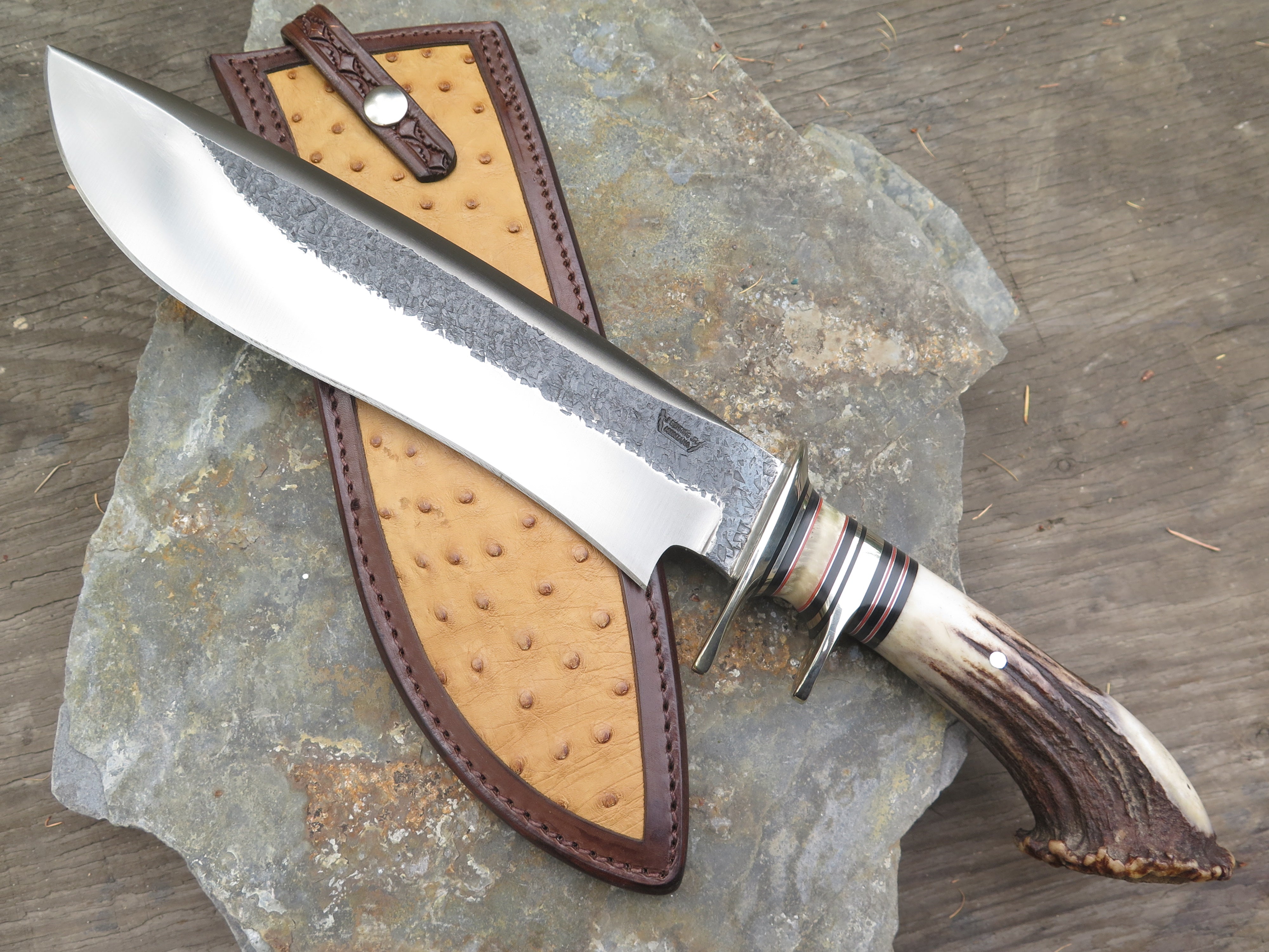 This Sasquatch from Behring Made© couldn't be more appropriately named with a whopping 11" blade that's hand forged from 3/8" thick high carbon 01 tool steel with a razor sharp hollow grind that's got a hammermark finish with a sharpened clip. The nickel silver guard is soldered in place above black and maroon fiber, aluminum and musk ox boss spacers with a nickel silver sub-hilt. The premium sambar crown stag handle is pinned through the tang with aluminum and it measures 17 3/4". To top it off this one ones in a custom ostrich inlaid sheath from Rowe's Leather.