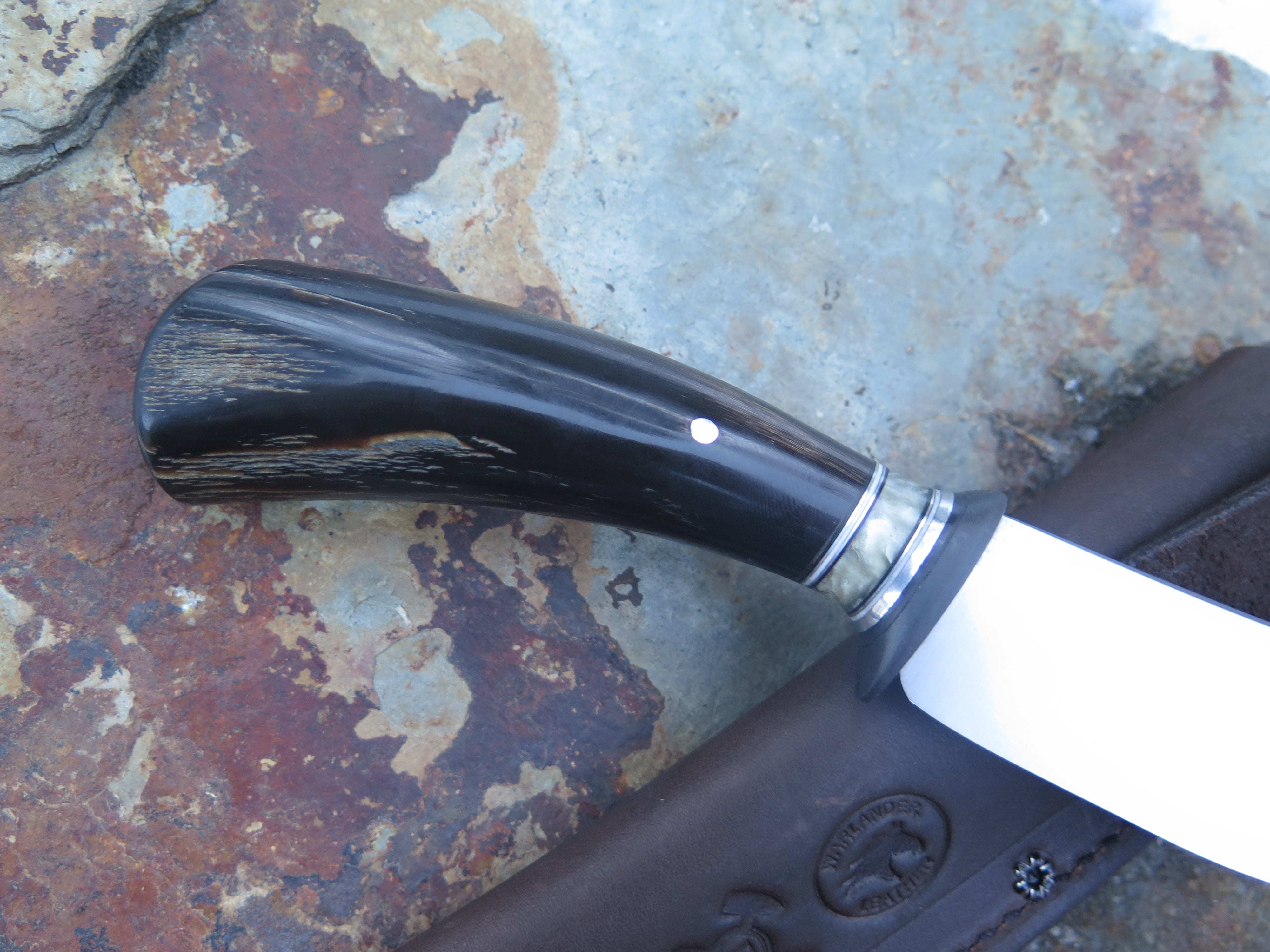 This beautiful new Clip Point from Behring Made© is hand forged from 3/16” thick high carbon 01 tool steel and it measures 4 1/2“ from tip to guard with a razor sharp convex grind. The blued steel guard is soldered in place above black, white, aluminum and musk ox boss spacers and a buffalo horn handle that's pinned through the tang with aluminum. The overall length measures 9“ and it comes in a ripple tooled leather sheath from Warlander.