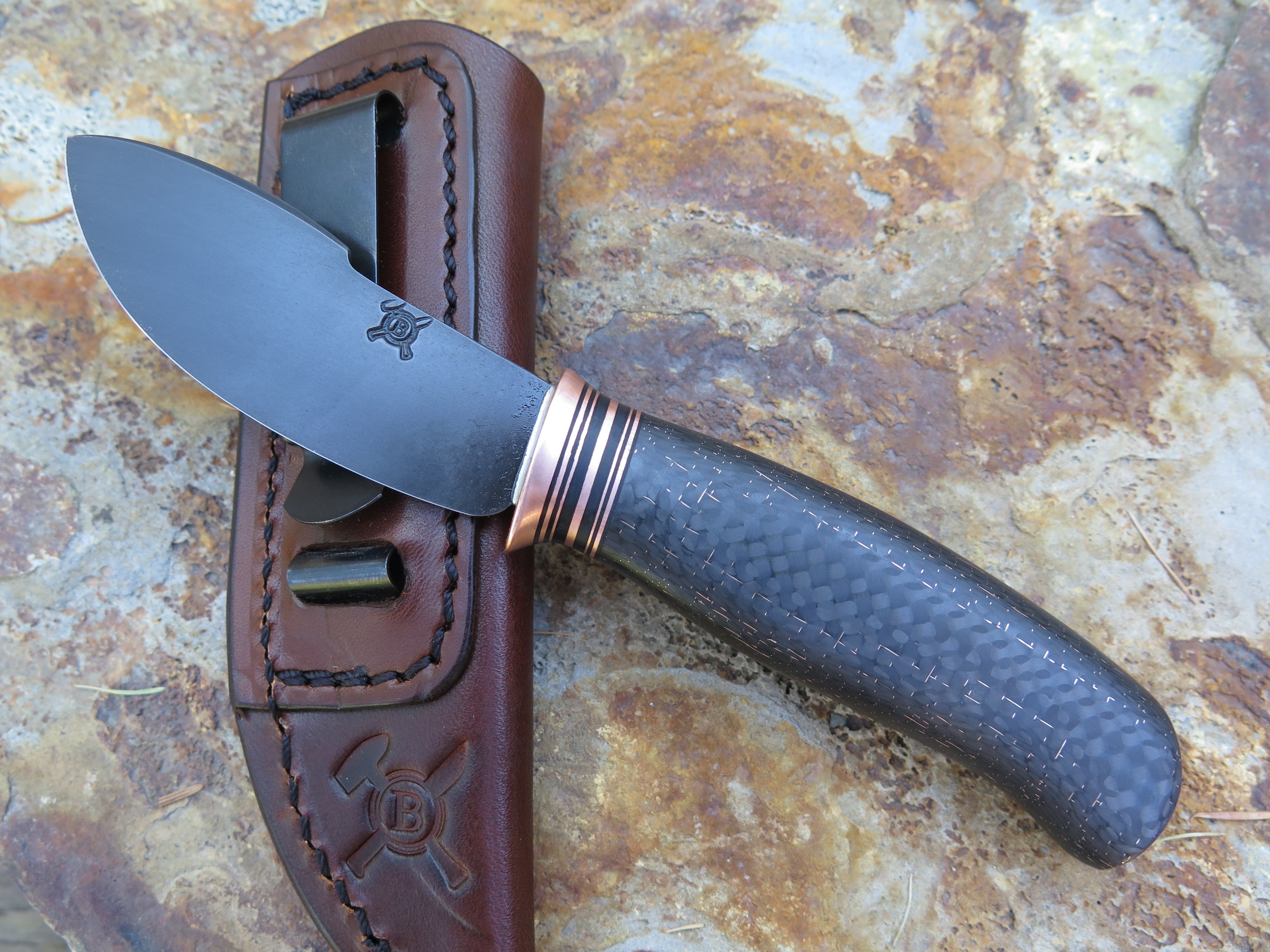 This beautiful new Canoe Knife from Behring Made© is hand forged from 1/8" thick high carbon 01 tool steel and it measures 2 3/4" from tip to guard with a razor sharp convex and a forced patina blued finish. The copper guard is soldered in place above black fiber and copper spacers with a copperweave carbon fiber handle. The overall length measures 6 3/8" and this one comes in a custom tooled spring clip pocket sheath designed for the inside the pocket. *Archive listing, please allow 4-8 weeks for delivery