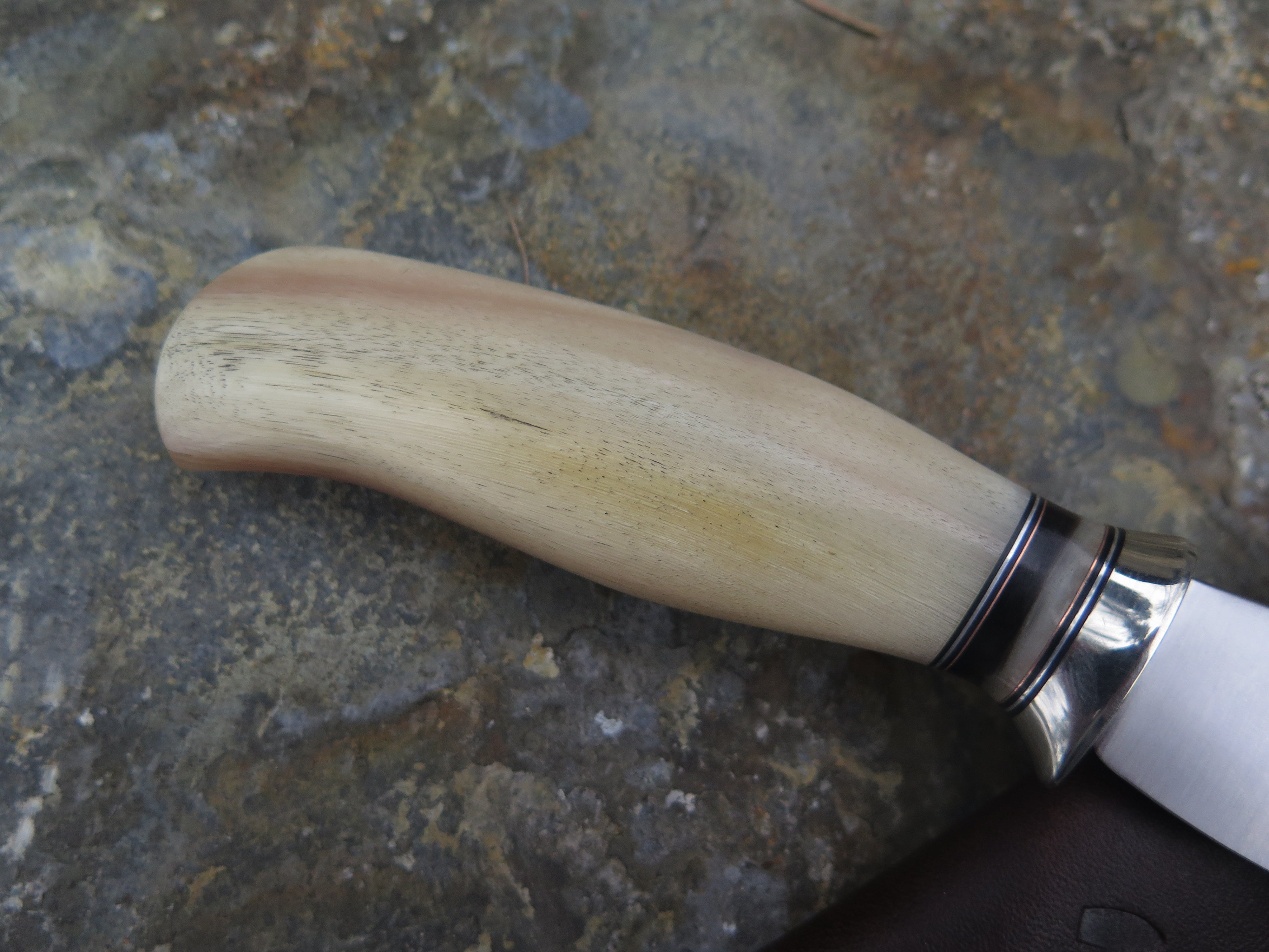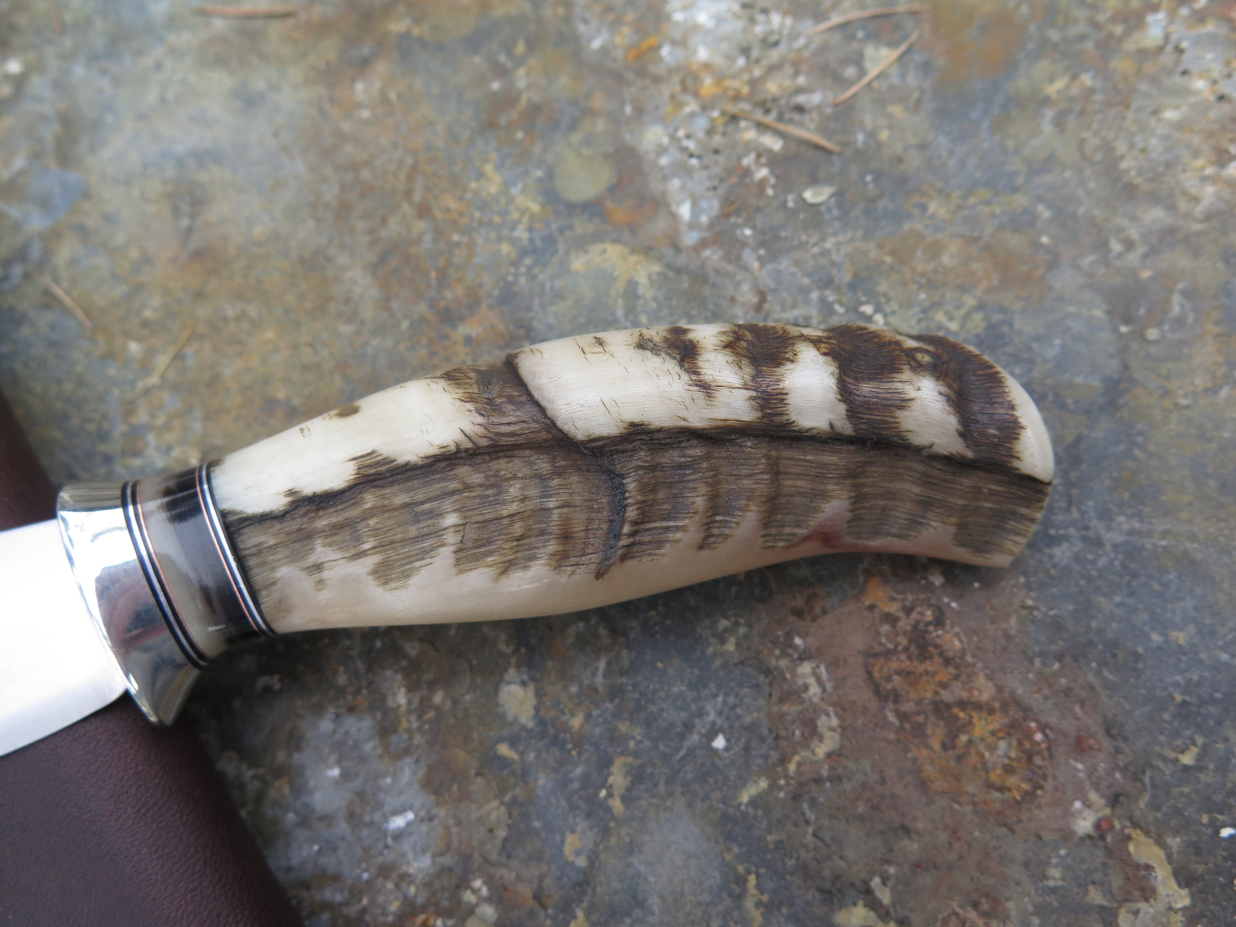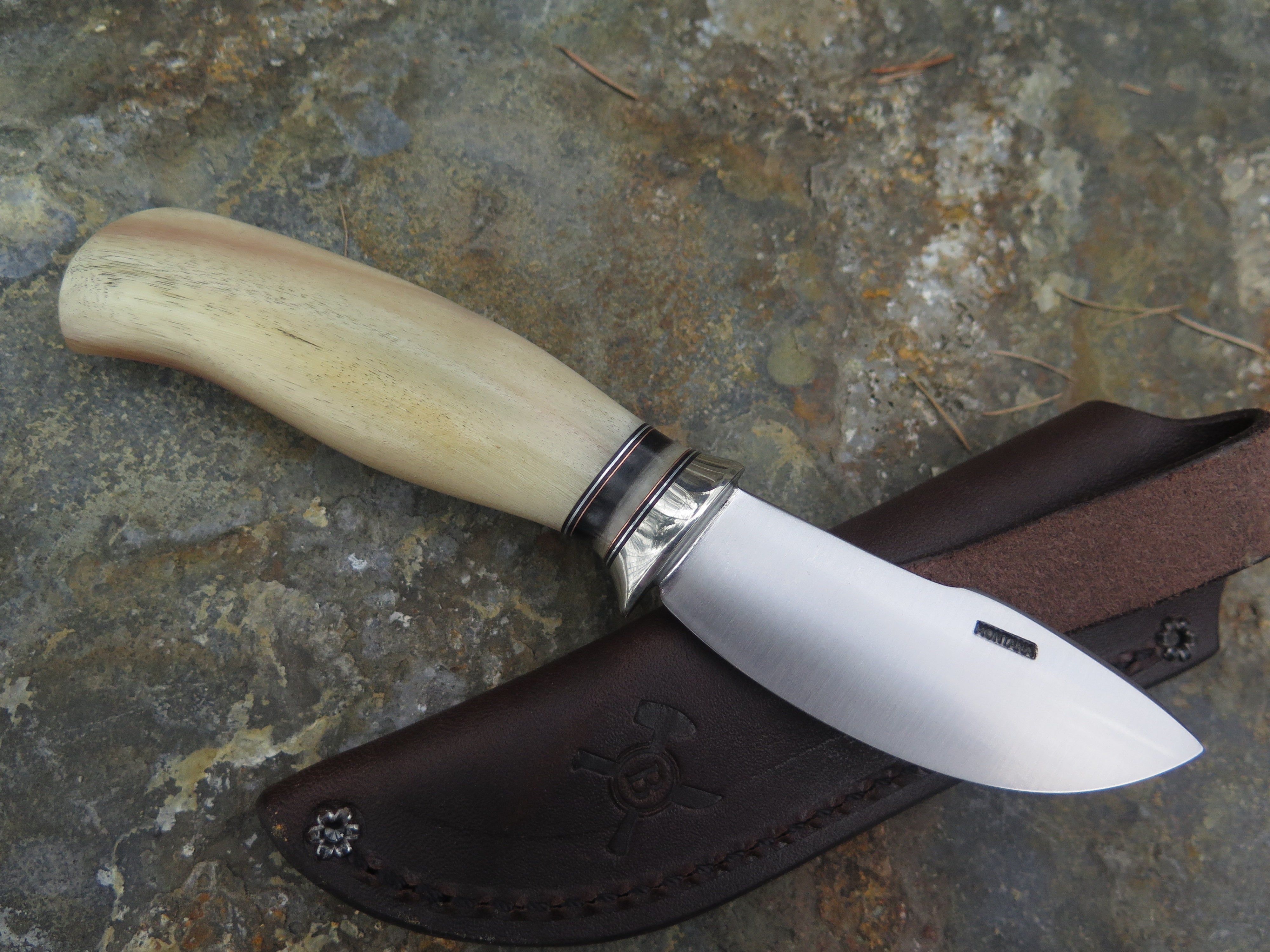 This new Canoe Knife from Behring Made© is hand forged from 1/8" thick high carbon 01 tool steel and it measures 3" from tip to guard with a razor sharp convex grind. The nickel silver guard is soldered in place above black fiber, aluminum, copper and Dall's sheep horn spacers as well as a Dall's sheep horn handle with a cozy texture you'll have to feel to believe. The overall length measures 7" and it comes in a classic leather belt pouch sheath.