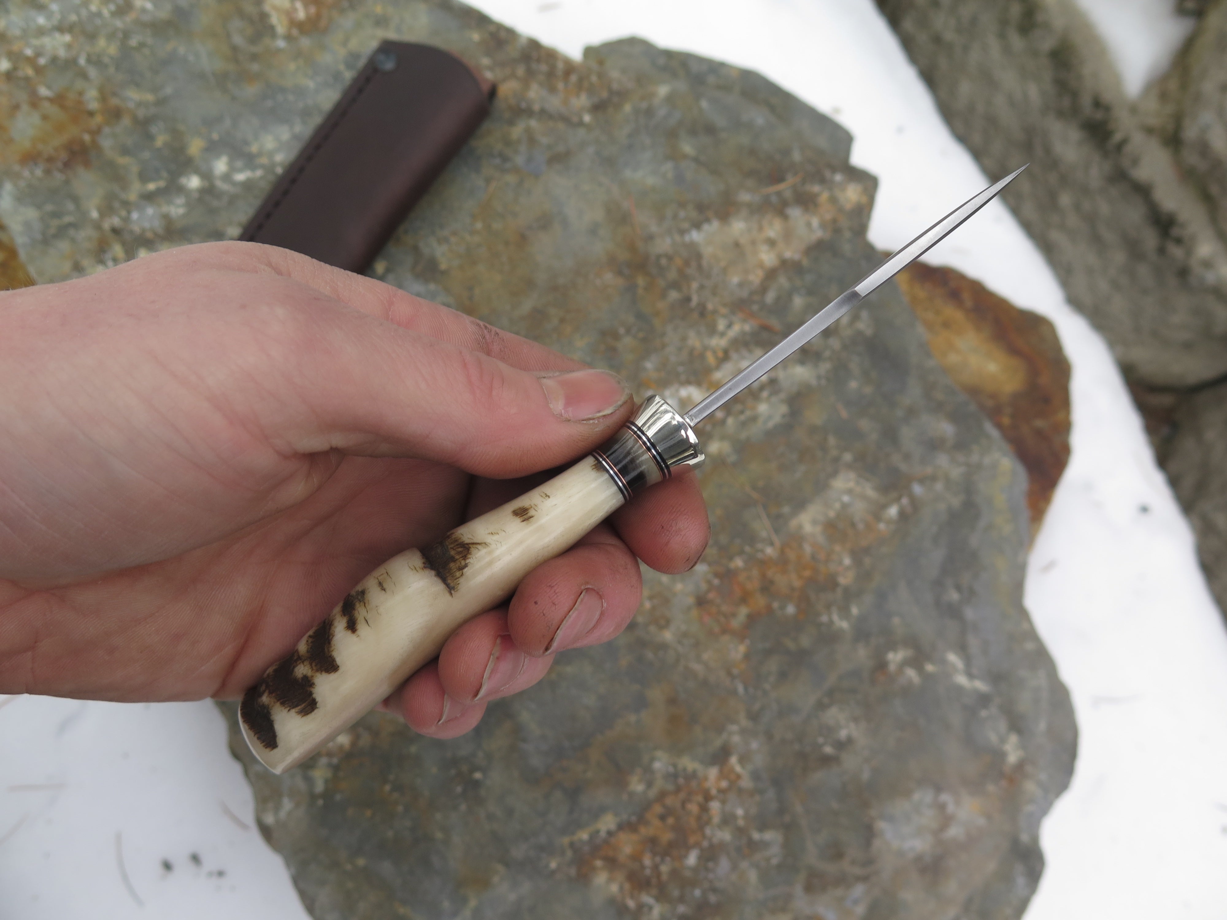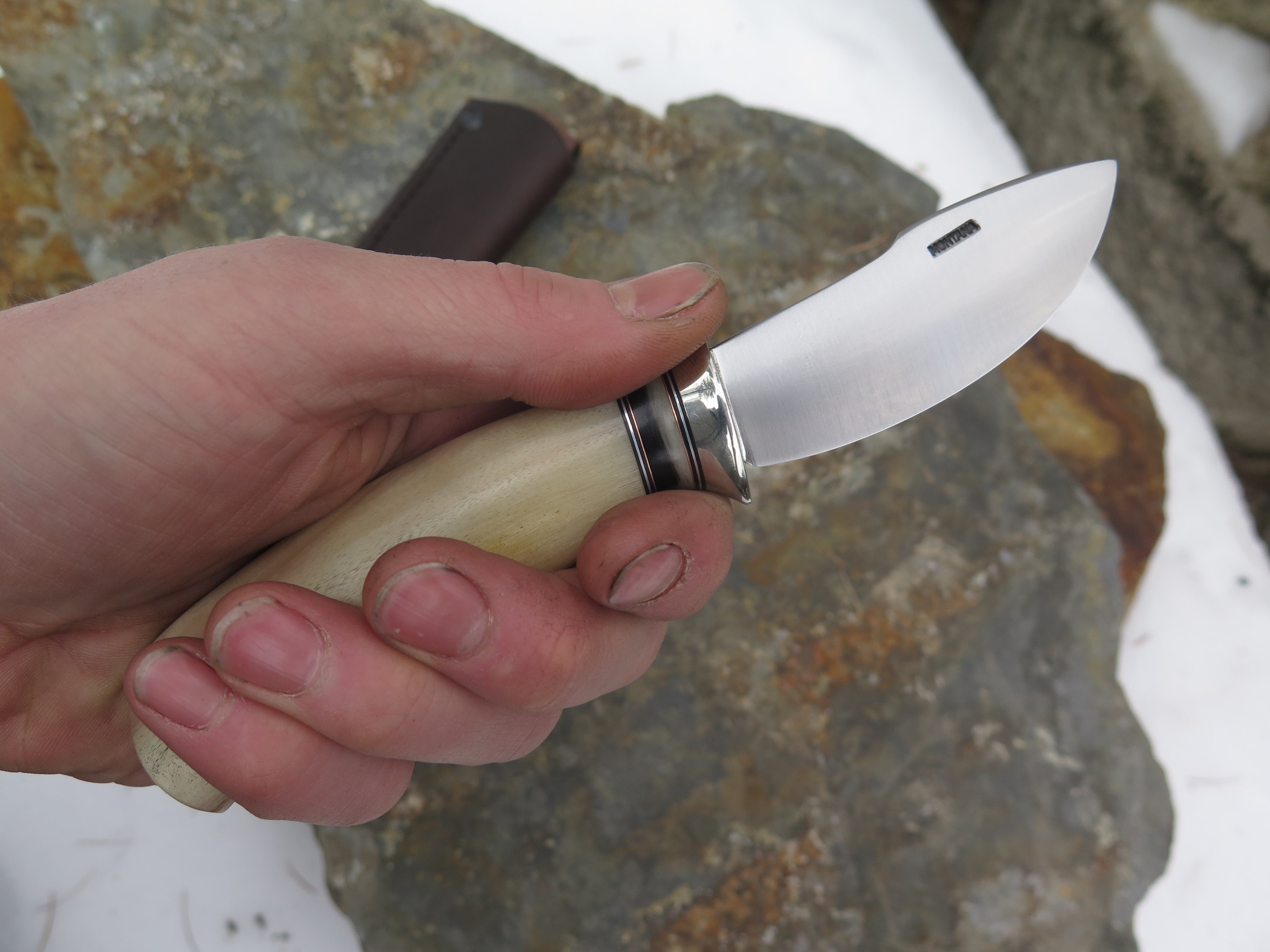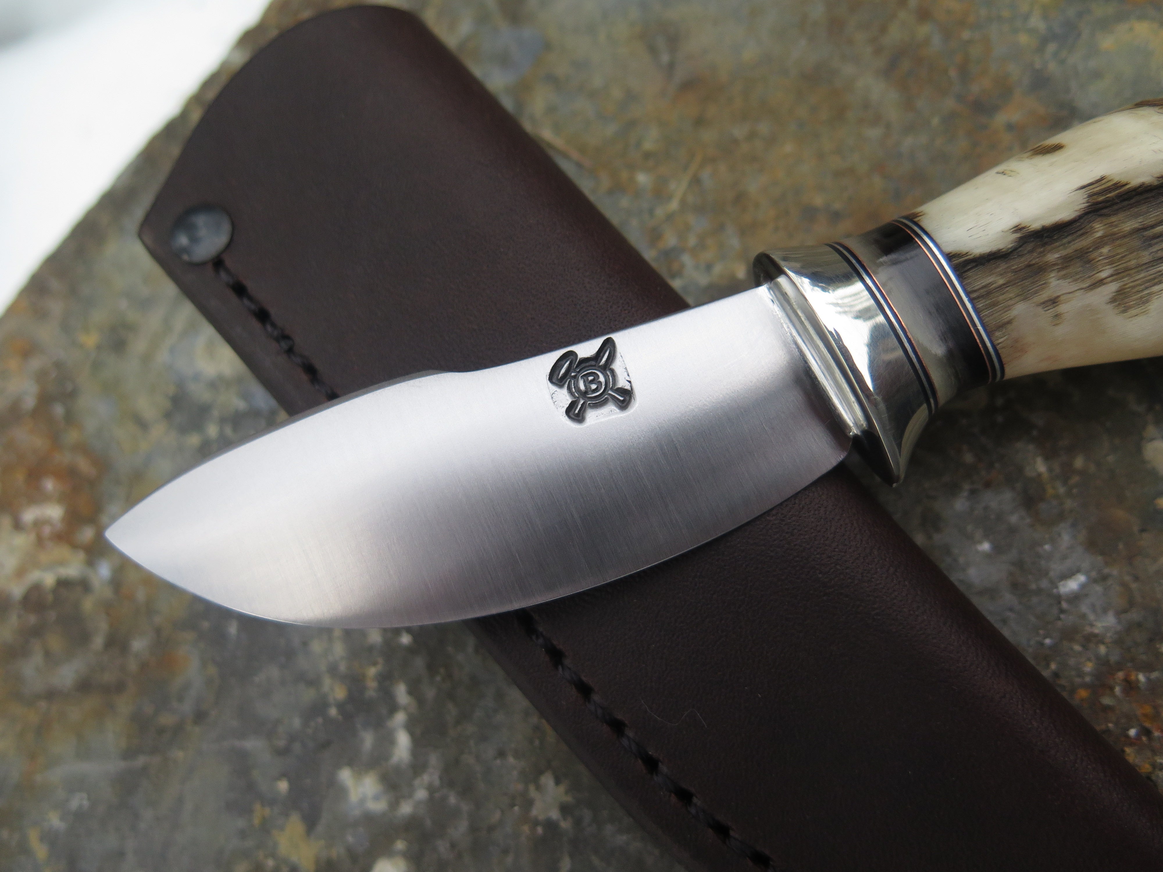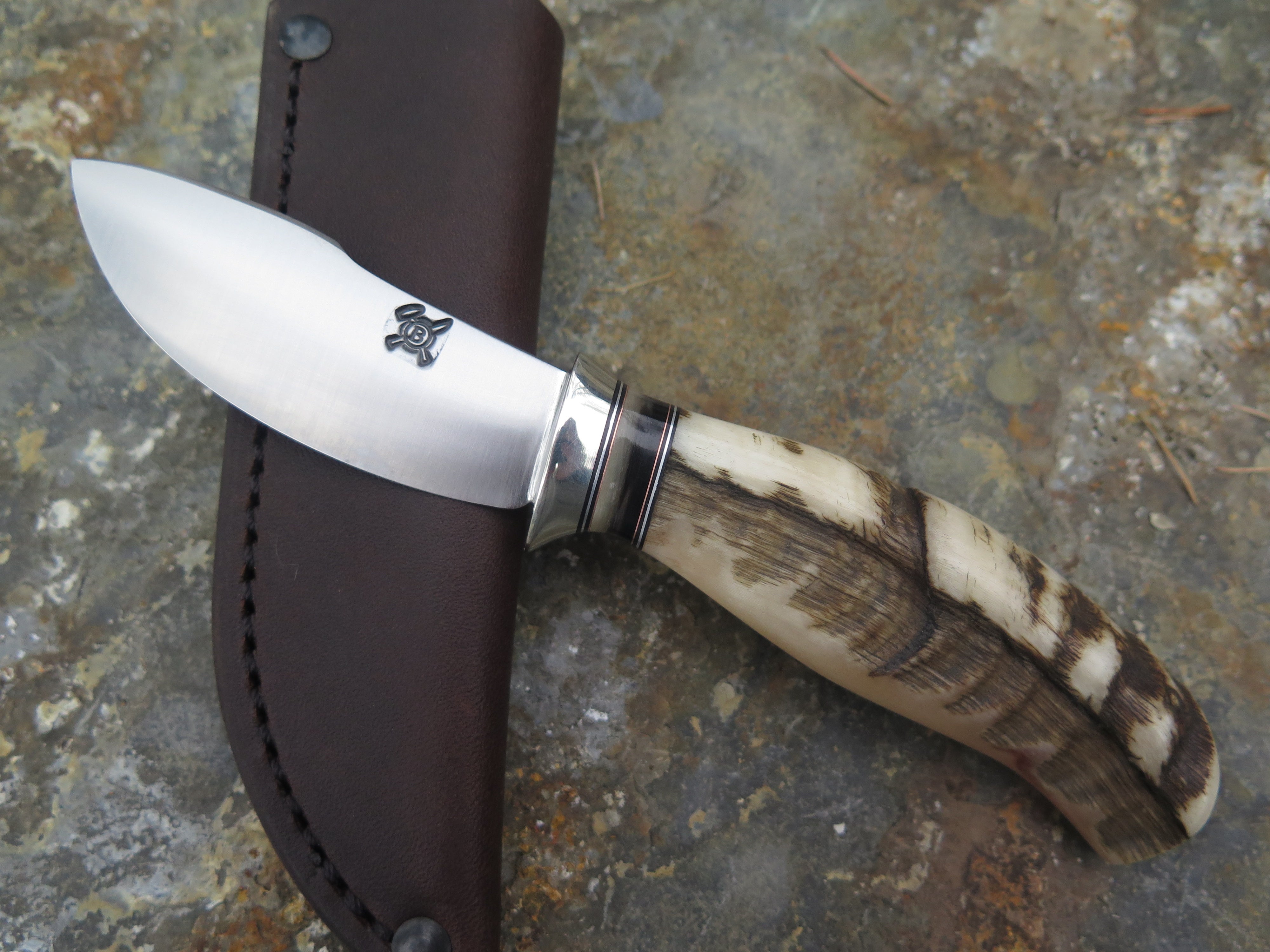 This new Canoe Knife from Behring Made© is hand forged from 1/8" thick high carbon 01 tool steel and it measures 3" from tip to guard with a razor sharp convex grind. The nickel silver guard is soldered in place above black fiber, aluminum, copper and Dall's sheep horn spacers as well as a Dall's sheep horn handle with a cozy texture you'll have to feel to believe. The overall length measures 7" and it comes in a classic leather belt pouch sheath.