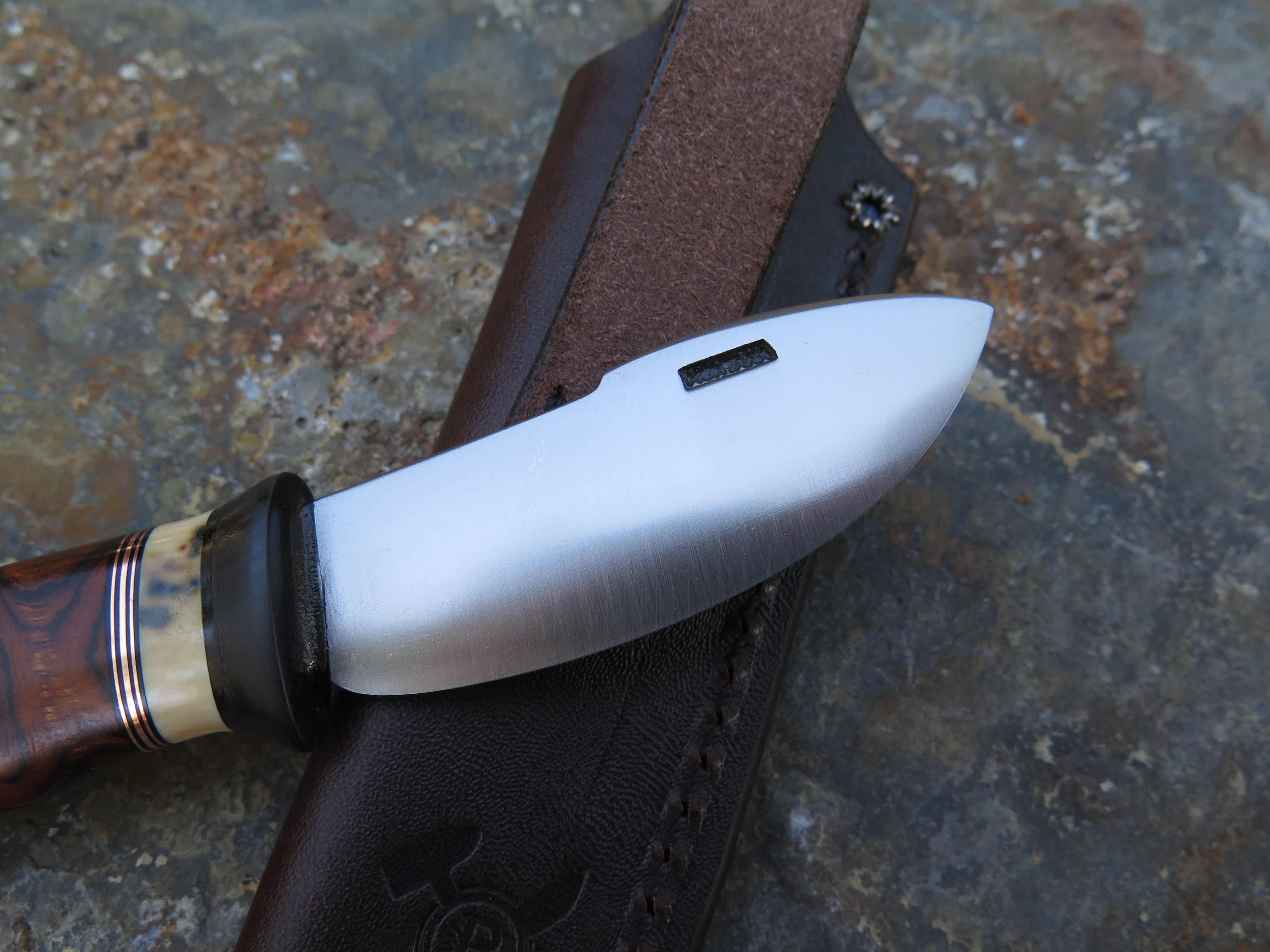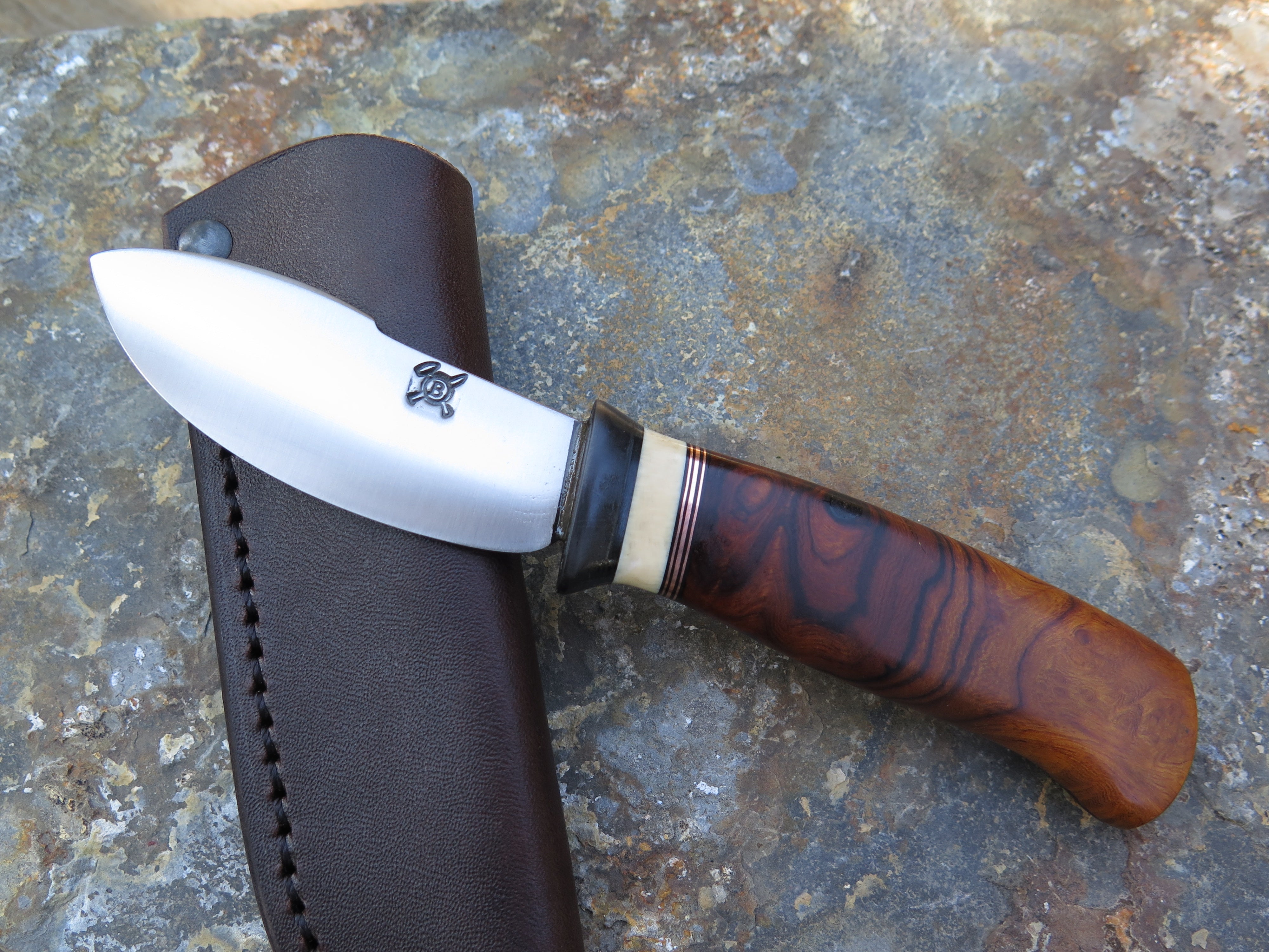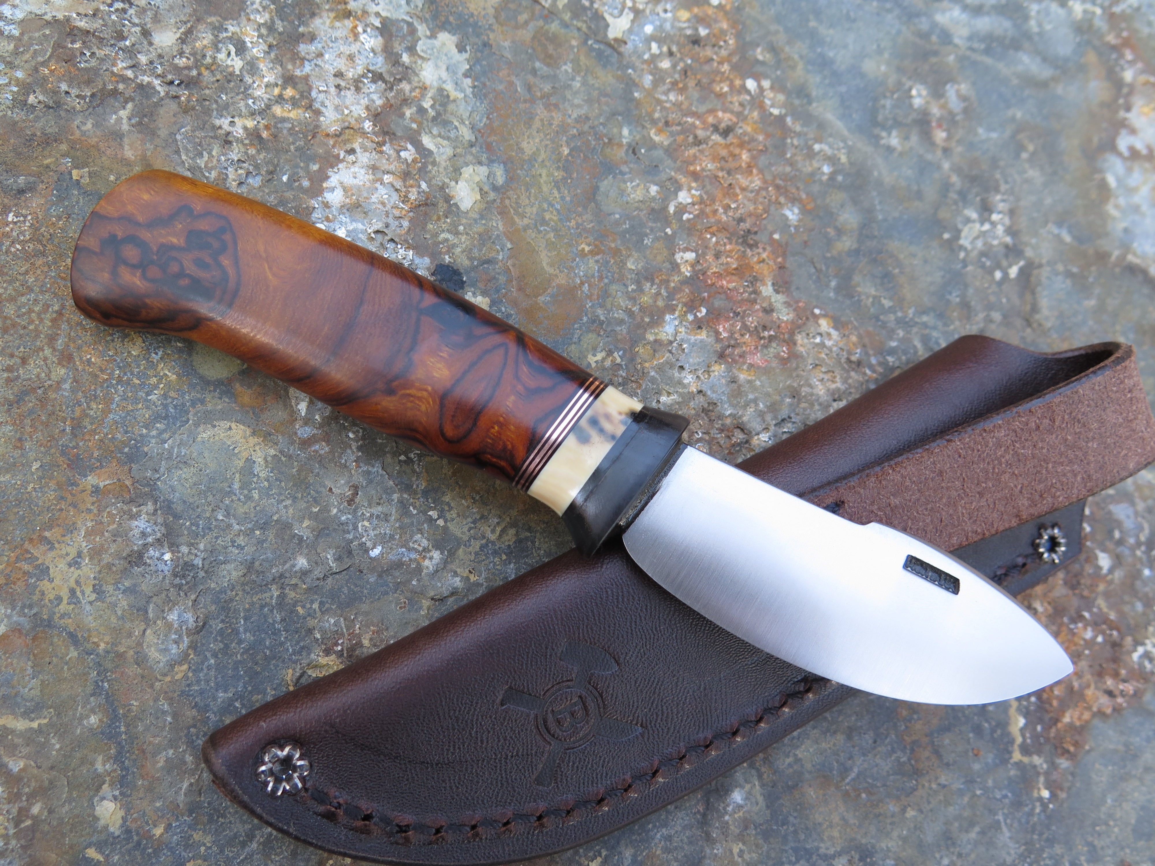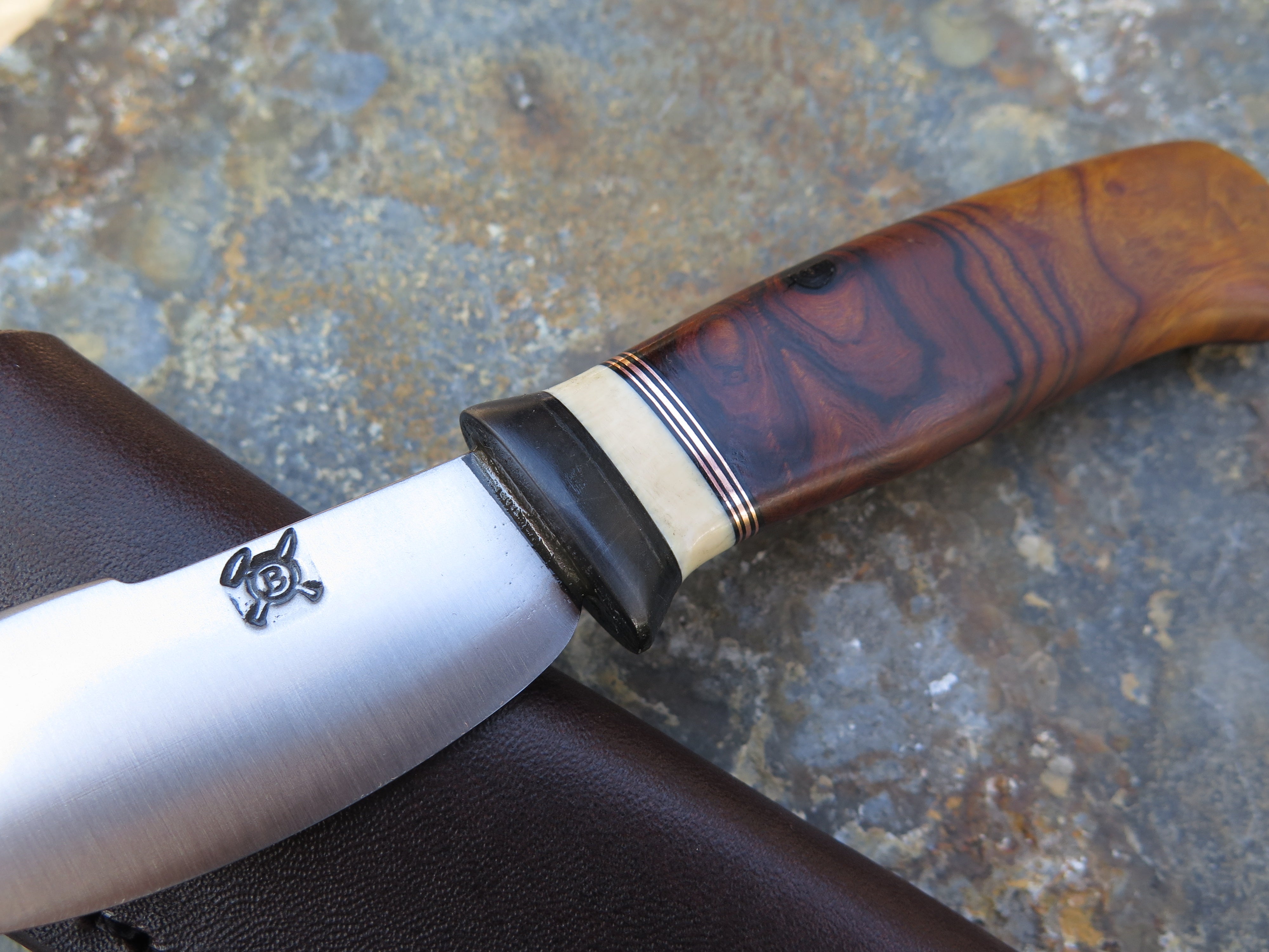This handsome new Canoe Knife from Behring Made© is hand forged from 1/8" thick high carbon 01 tool steel and it measures 2 3/4" from tip to guard with a razor sharp convex grind. The blued steel guard is soldered in place above black fiber, copper and mammoth ivory spacers as well as a premium desert ironwood burl handle. The overall length measures 6 1/2" and it will come in the classic leather belt pouch sheath.