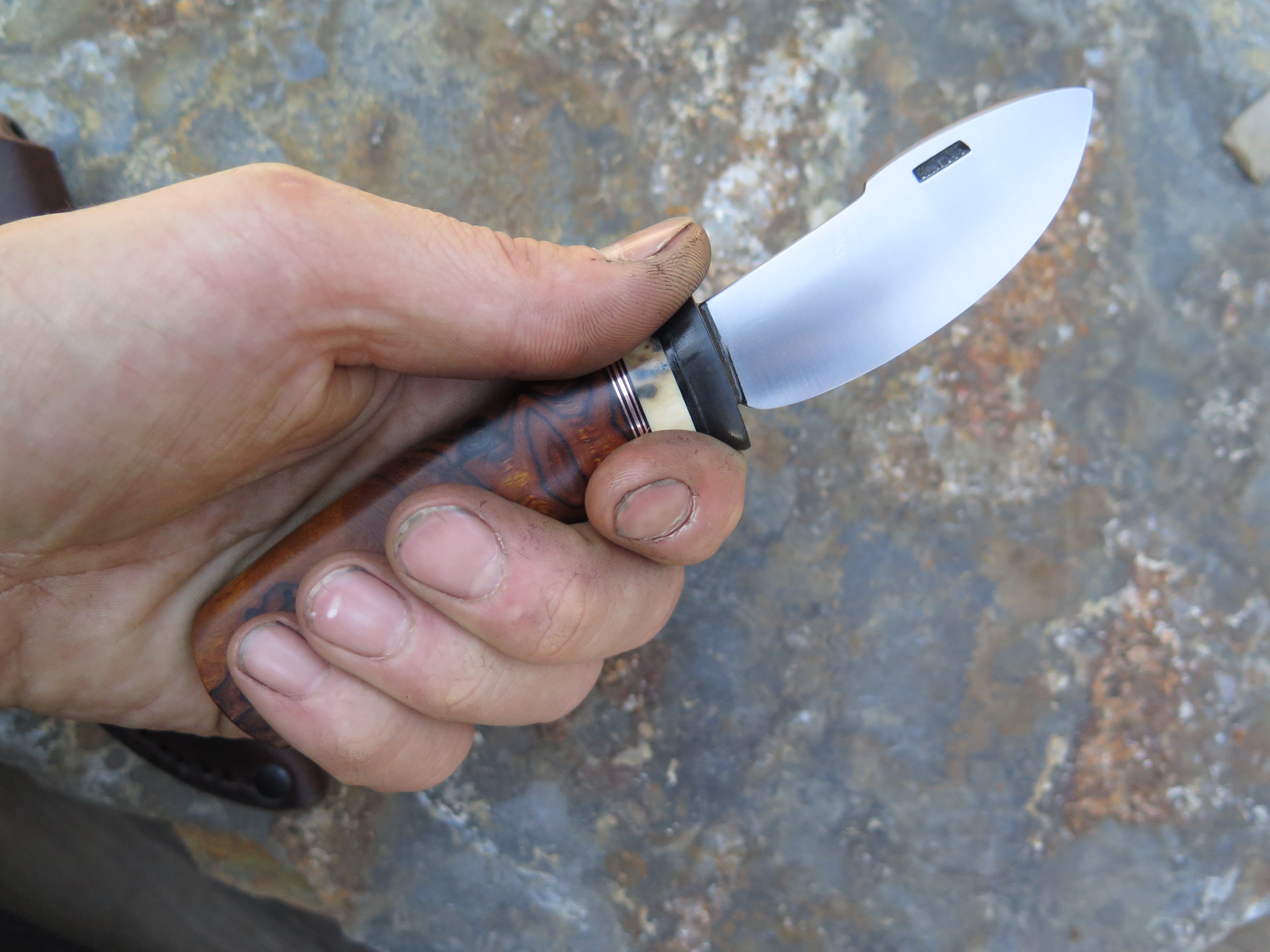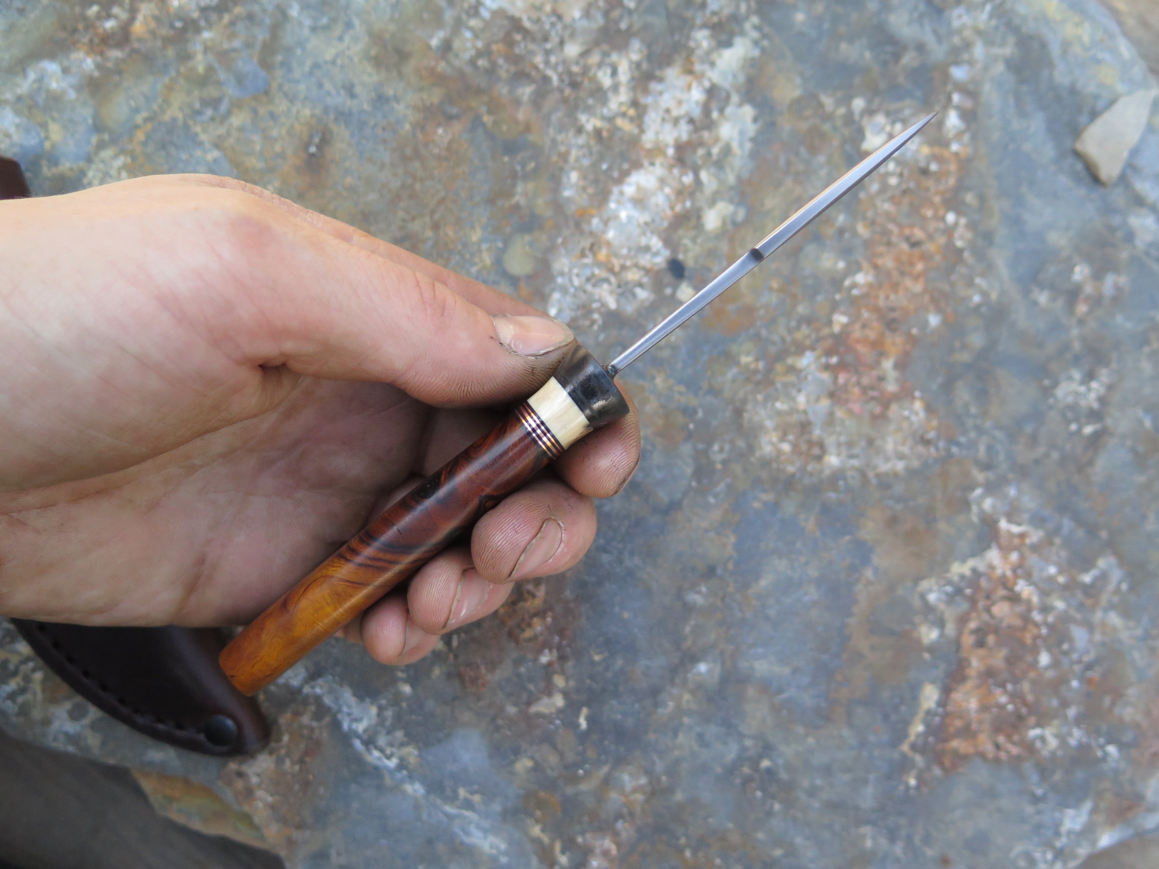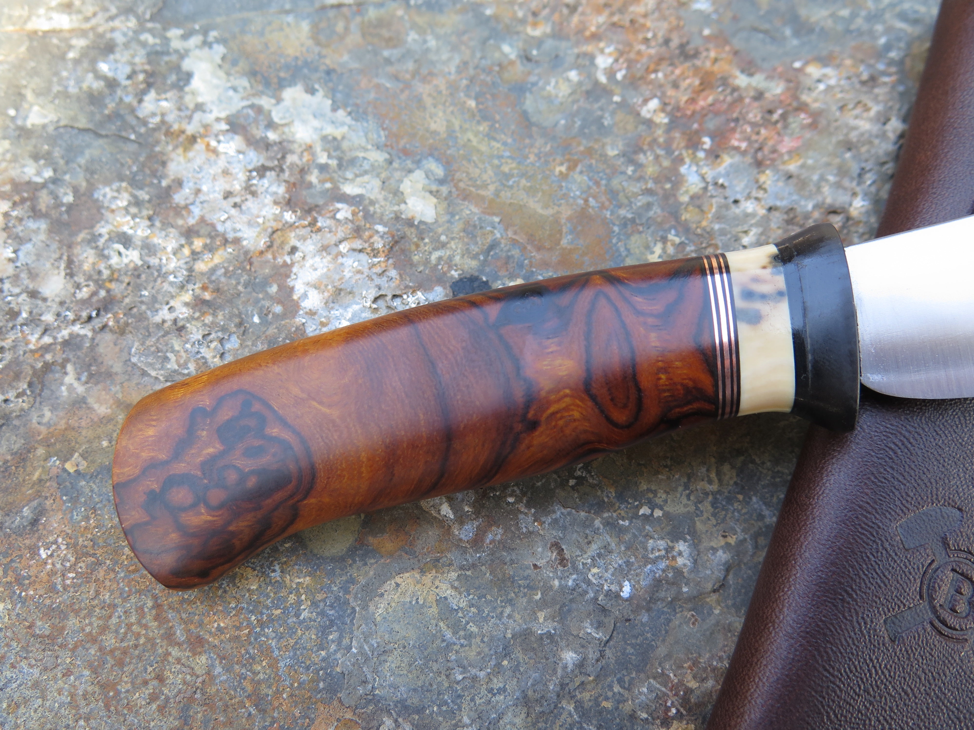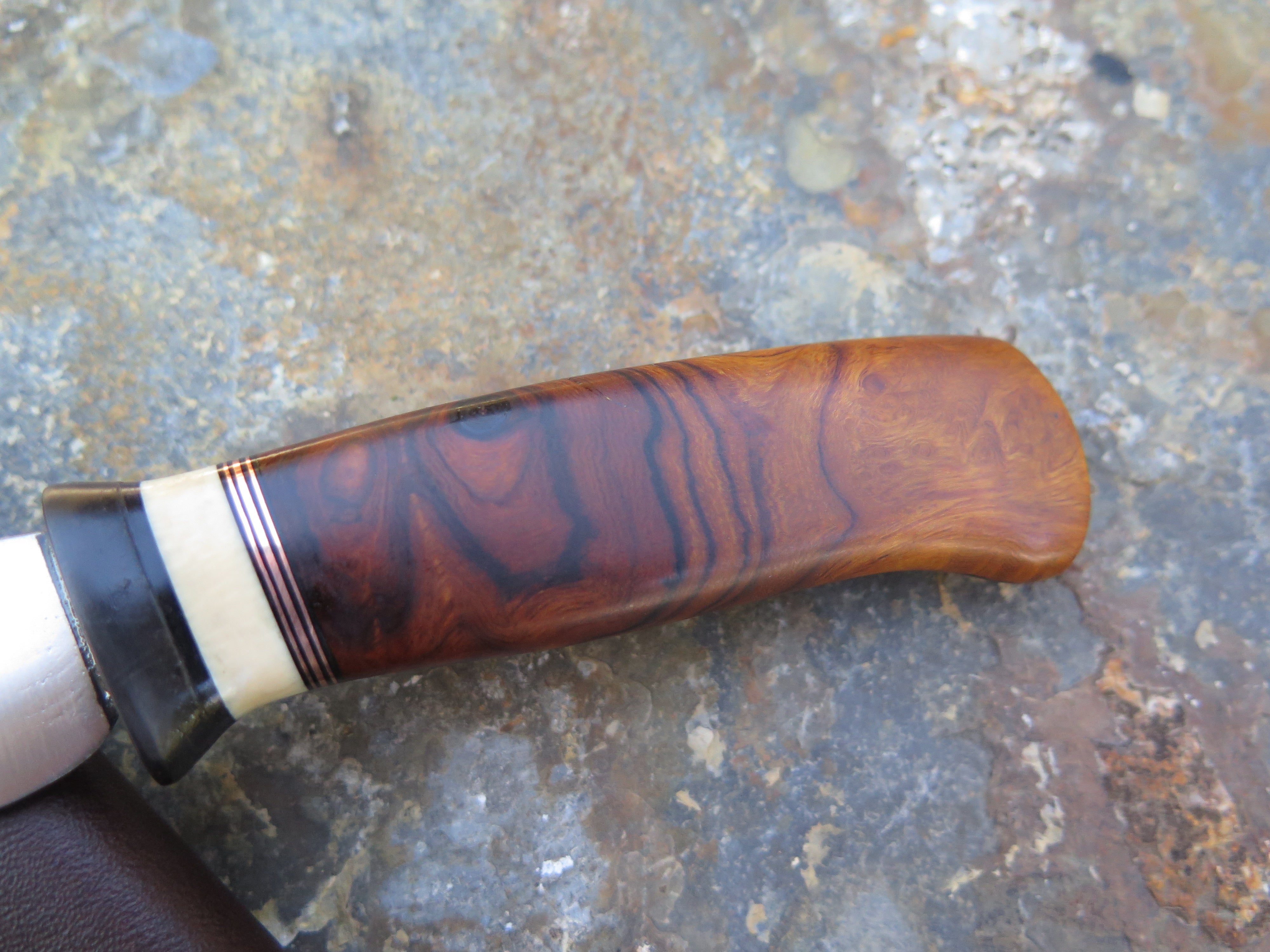 This handsome new Canoe Knife from Behring Made© is hand forged from 1/8" thick high carbon 01 tool steel and it measures 2 3/4" from tip to guard with a razor sharp convex grind. The blued steel guard is soldered in place above black fiber, copper and mammoth ivory spacers as well as a premium desert ironwood burl handle. The overall length measures 6 1/2" and it will come in the classic leather belt pouch sheath.
