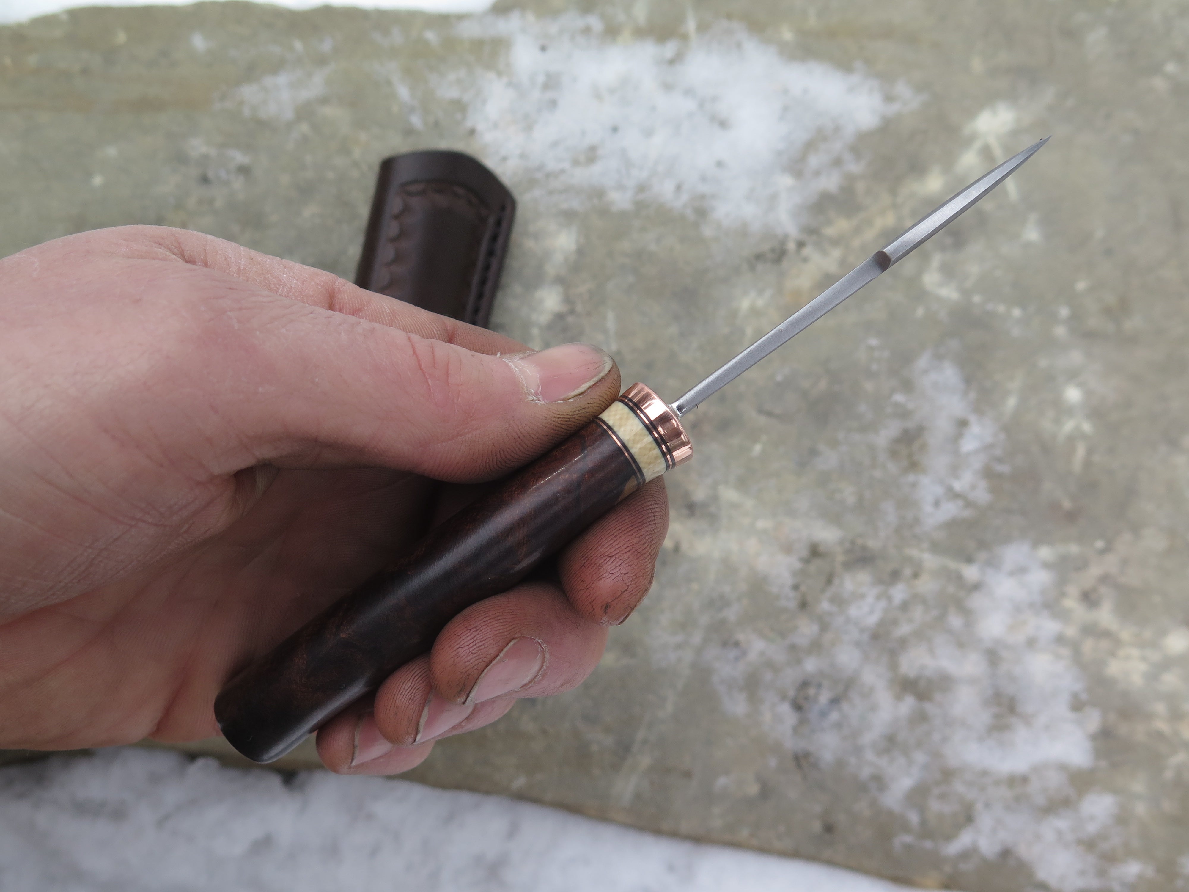 This beautiful new Canoe Pocket knife from Behring Made© is hand forged from 1/8" thick high carbon 01 tool steel and it measures 2 3/4" from tip to guard with a razor sharp convex grind. The copper guard is soldered in place above black fiber, copper and mammoth ivory spacers that yield a wonderful contrast against the premium desert ironwood burl handle. The overall length measures 6 1/8" and it comes in a right hand pocket clip sheath. *This is an Archive listing so please allow 6-8 weeks for reorders, in which case modifications are also welcome!