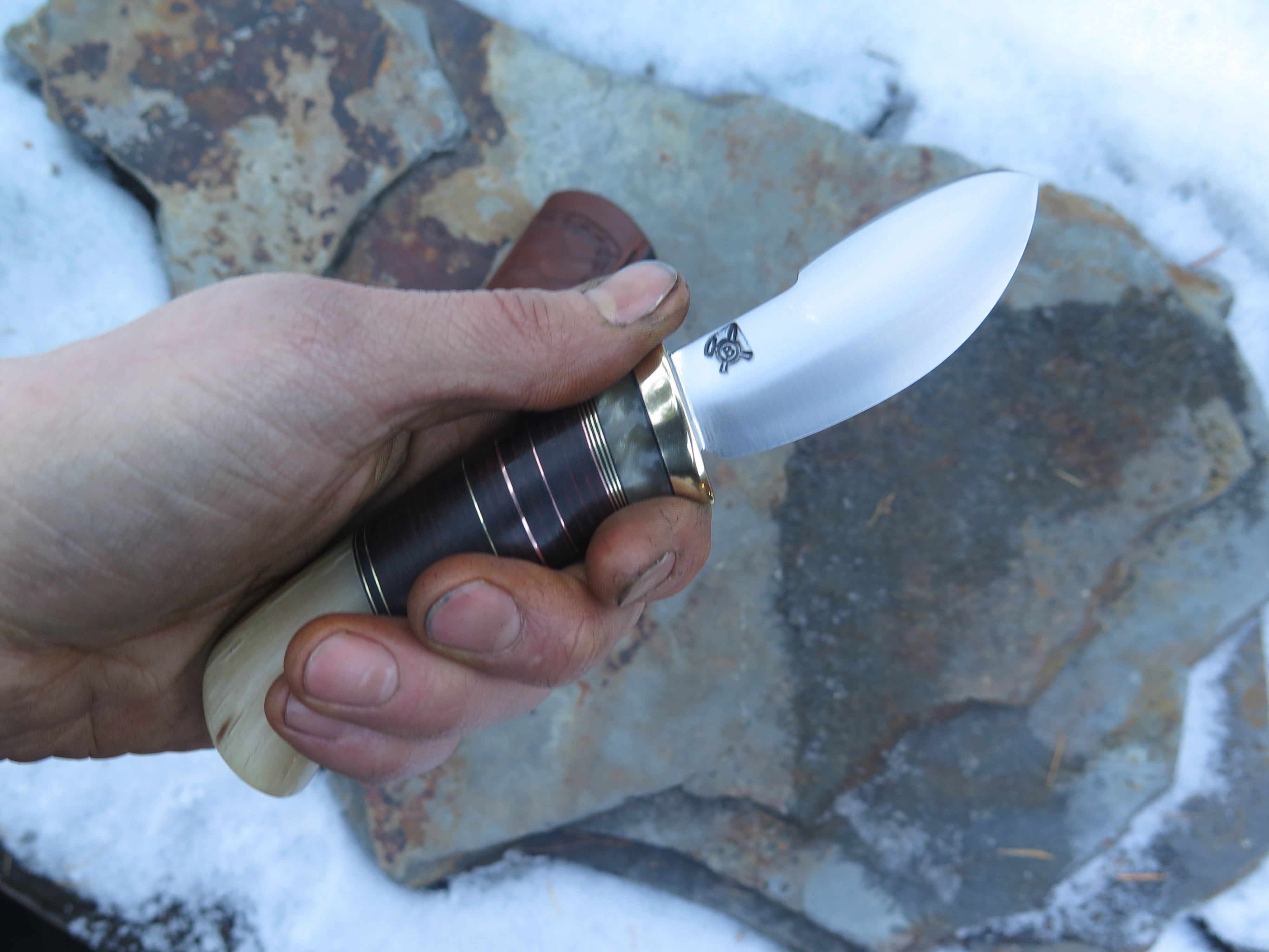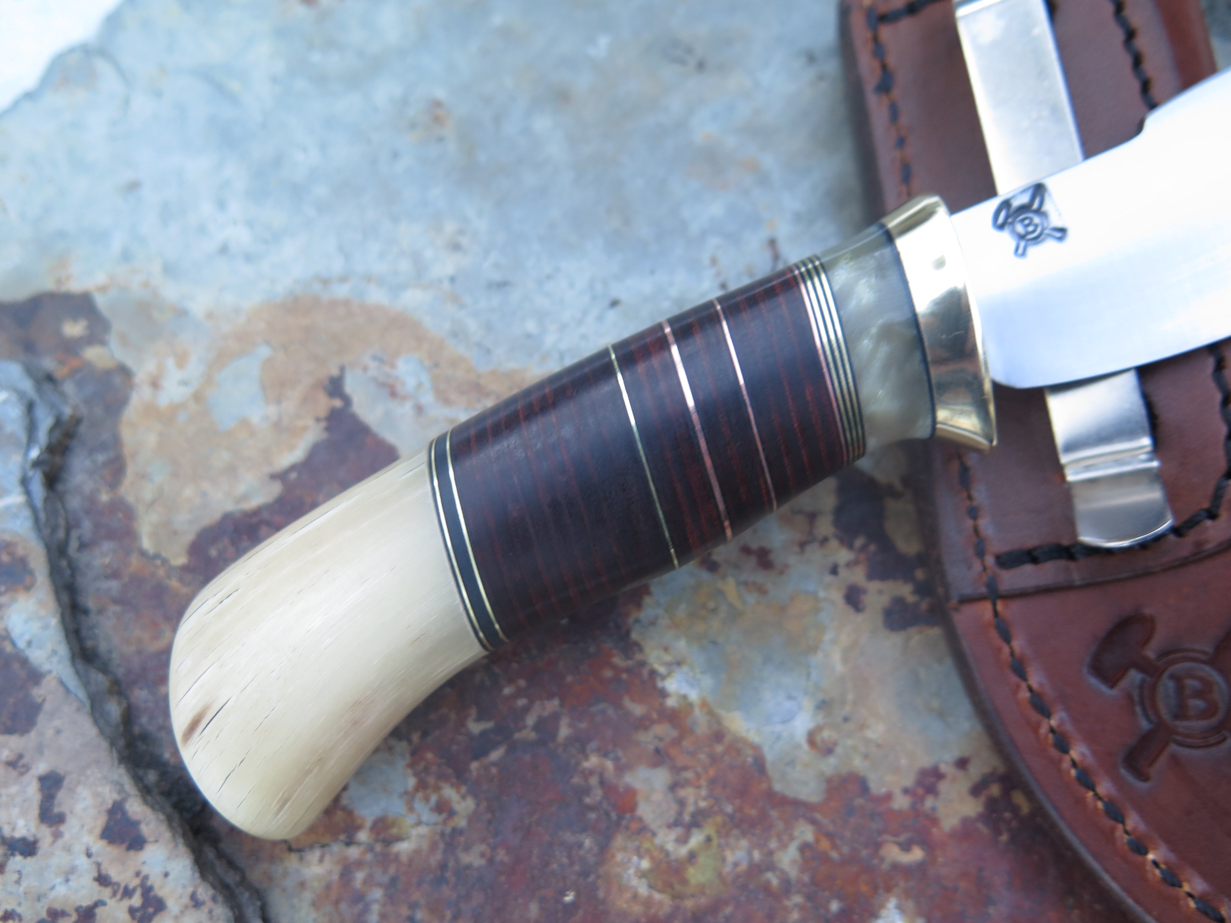 This beautiful new Canoe Pocket Knife from Behring Made© is hand forged from 1/8” thick high carbon 01 tool steel and it measures 3“ from tip to guard with a razor sharp convex grind. The brass guard is soldered in place above black, copper, brass, musk ox boss and horsehide leather spacers with a musk ox horn butt. The overall length measures 6 3/4“ and it comes in a spring clip pocket leather sheath from Warlander.