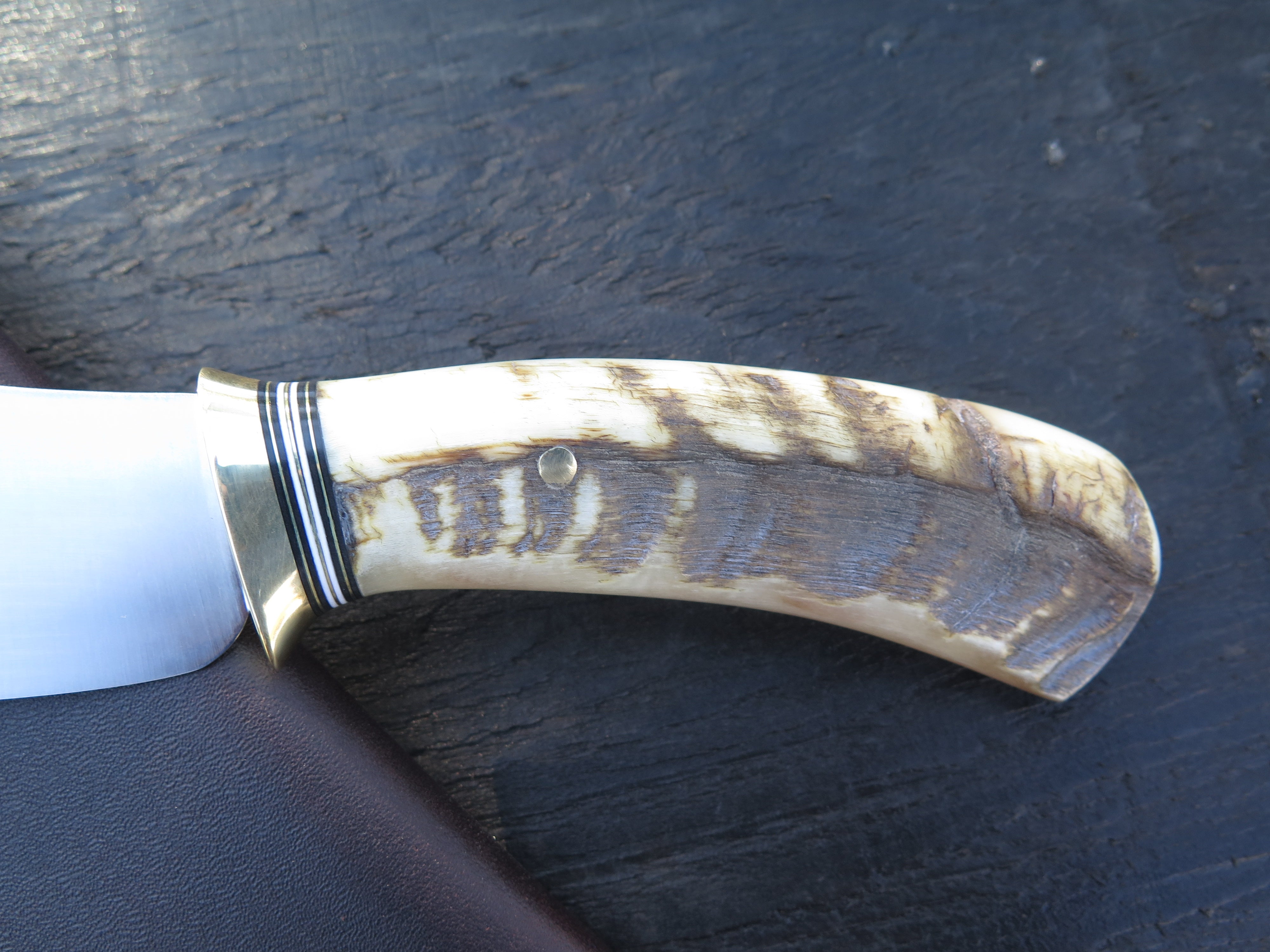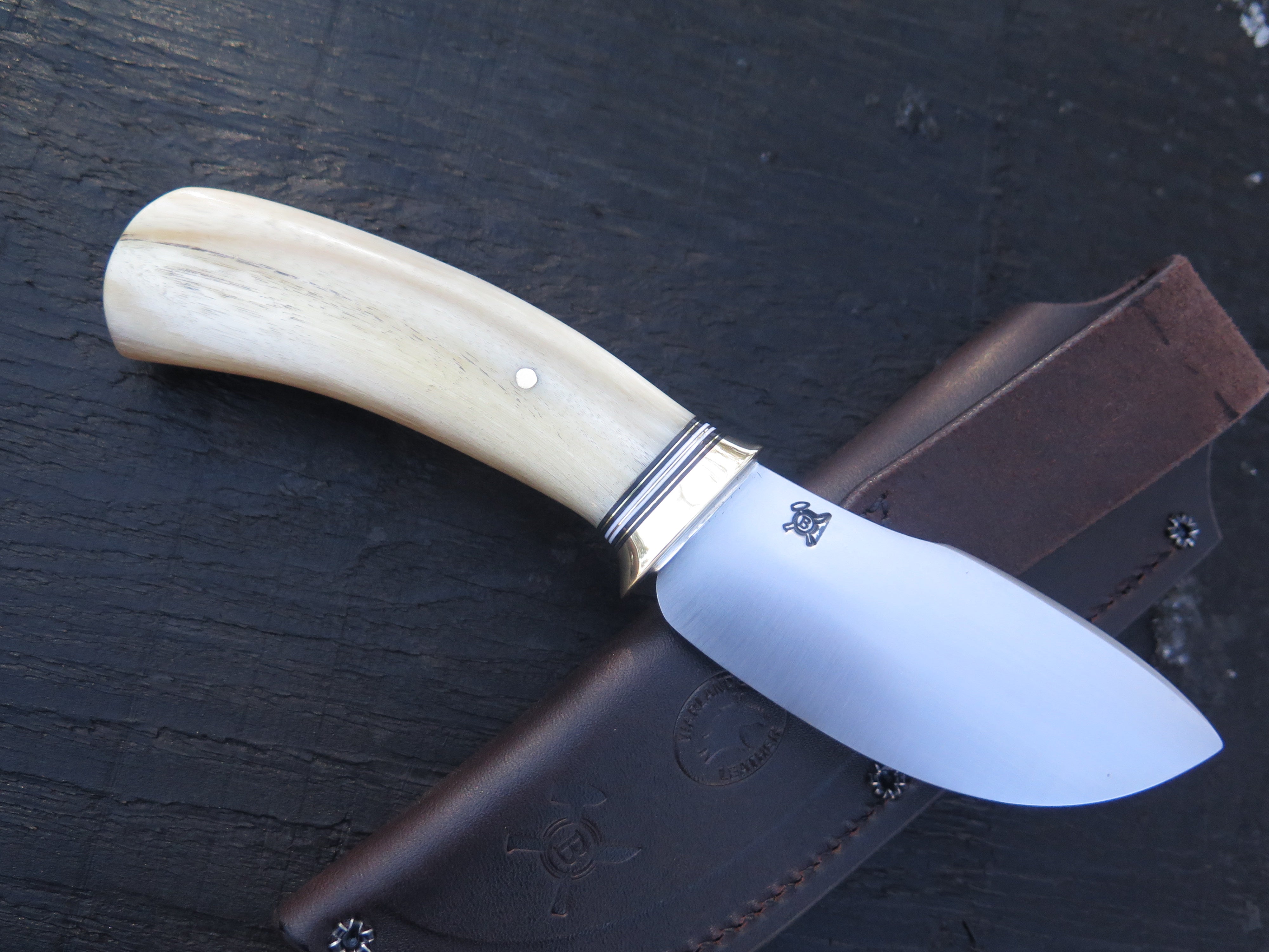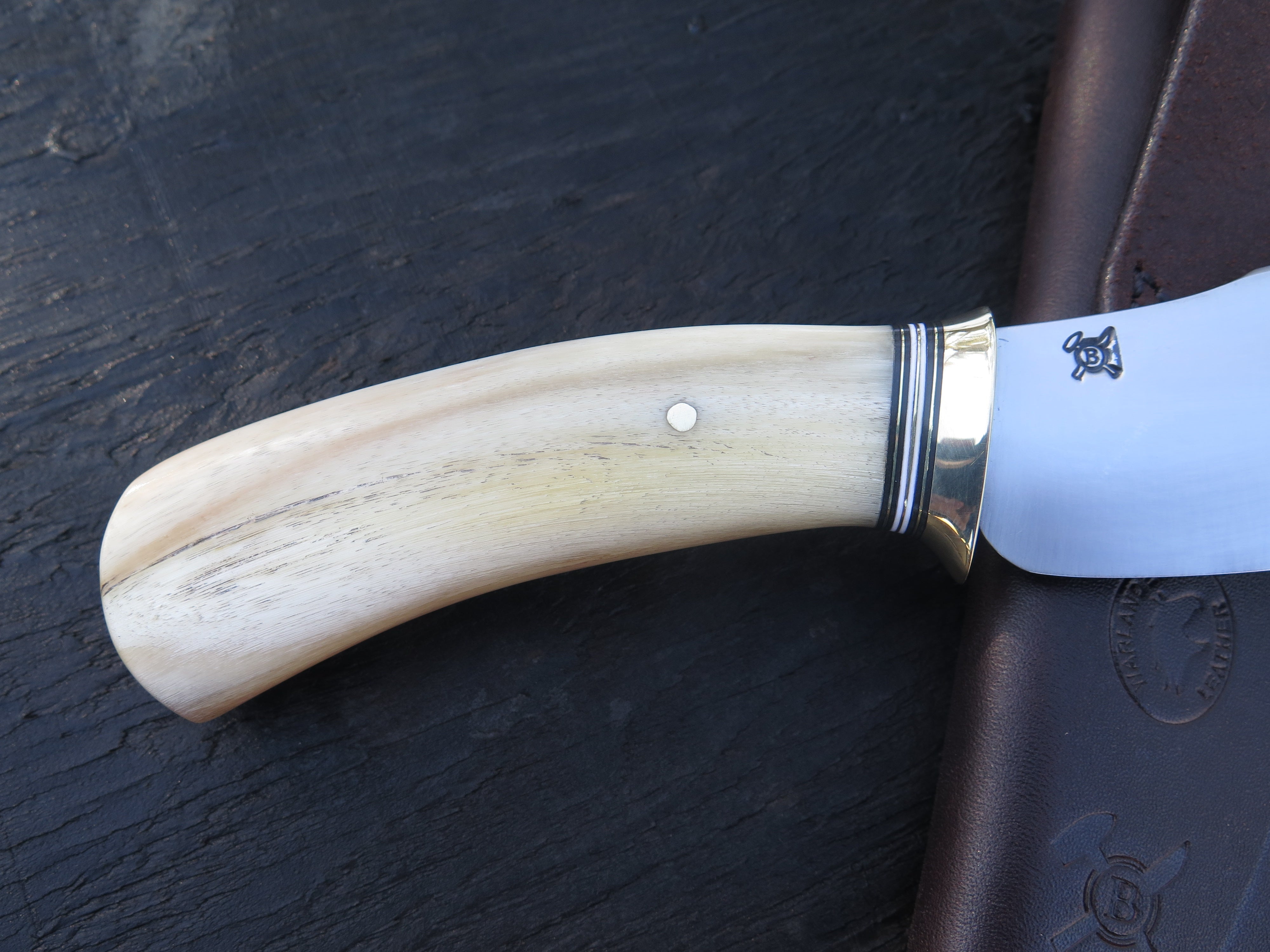This new Canoe Knife from Behring Made© is the first to be outfitted with a Dall sheep horn handle, and what a wonderful thing it is! The blade is hand forged from 3/16" thick high carbon 01 tool steel and it measures 4 1/4" from tip to guard with a razor sharp convex grind. The brass guard is soldered in place above black and white fiber with brass spacers that top the aforementioned sheep horn handle, which is also pinned through the tang with brass. The overall length measures 8 1/2" and it comes in a classic leather belt pouch sheath.