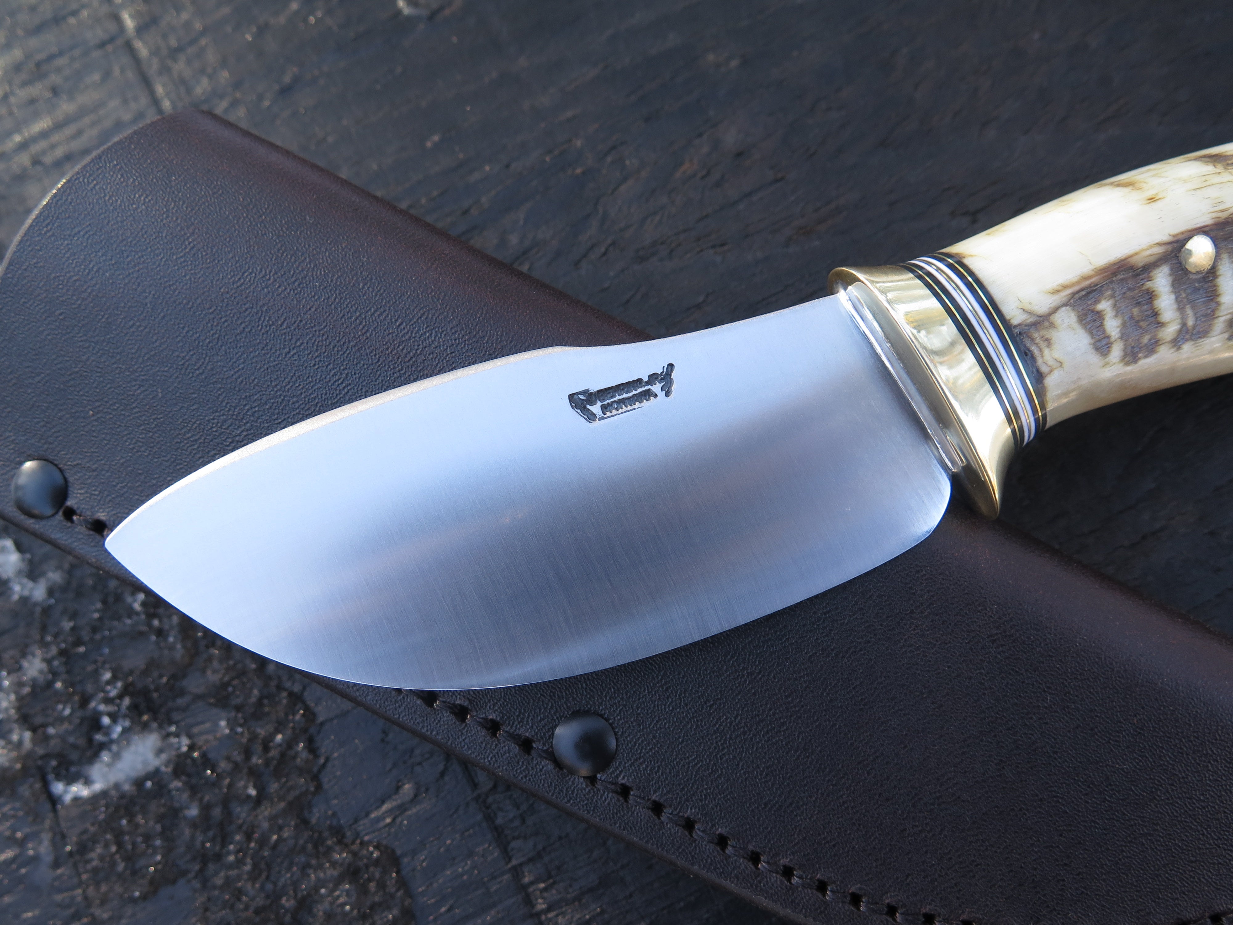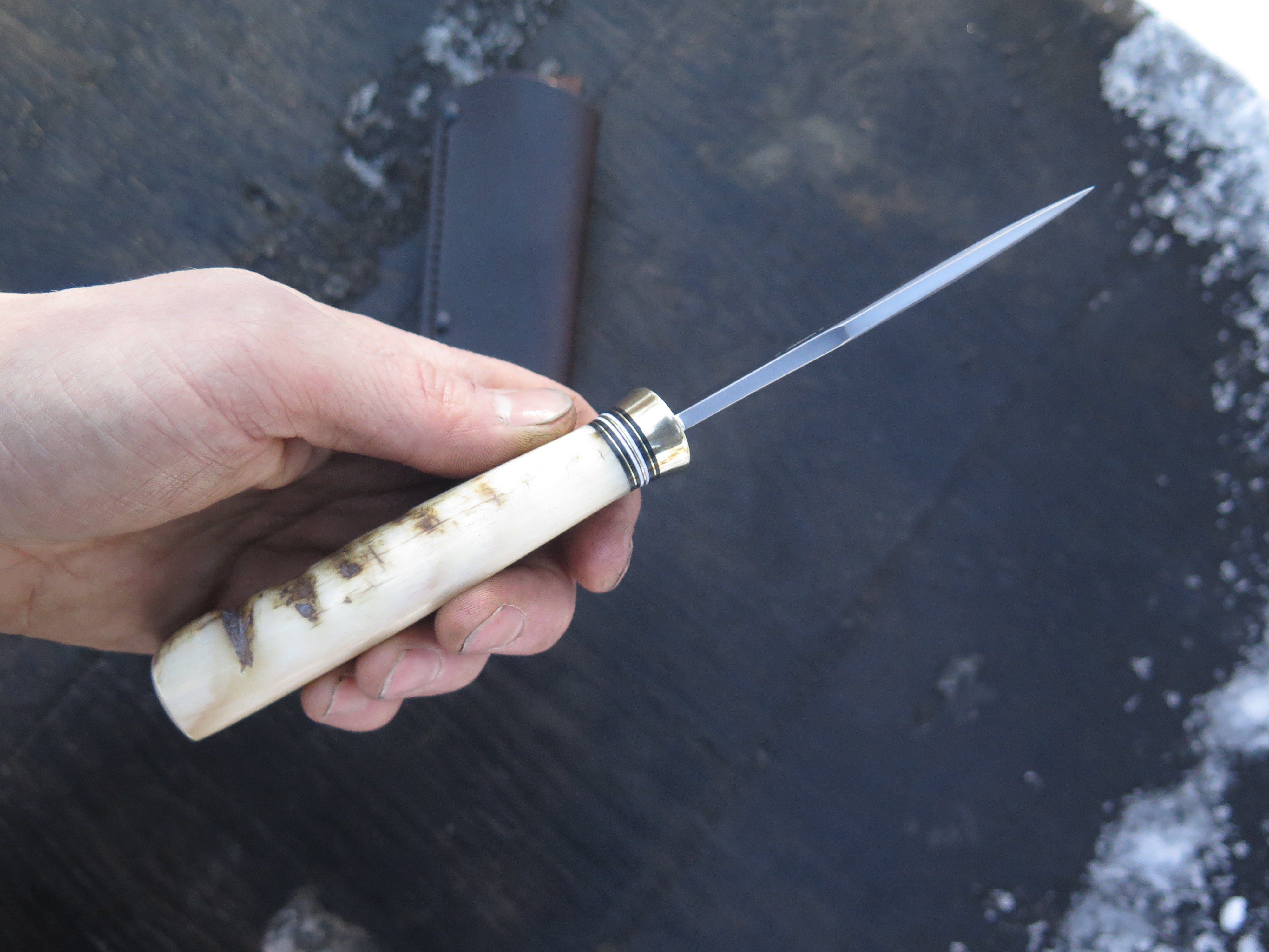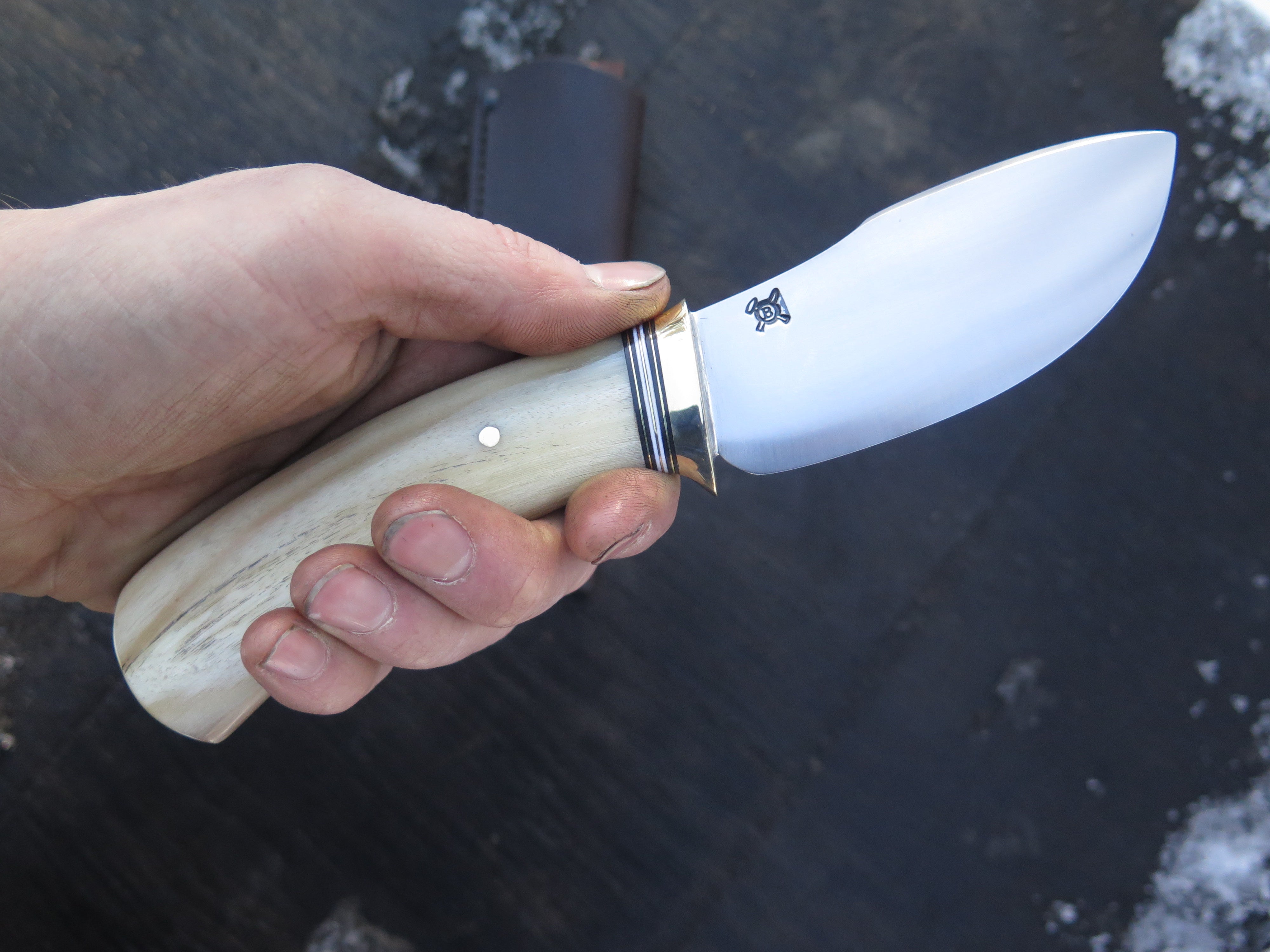 This new Canoe Knife from Behring Made© is the first to be outfitted with a Dall sheep horn handle, and what a wonderful thing it is! The blade is hand forged from 3/16" thick high carbon 01 tool steel and it measures 4 1/4" from tip to guard with a razor sharp convex grind. The brass guard is soldered in place above black and white fiber with brass spacers that top the aforementioned sheep horn handle, which is also pinned through the tang with brass. The overall length measures 8 1/2" and it comes in a classic leather belt pouch sheath.