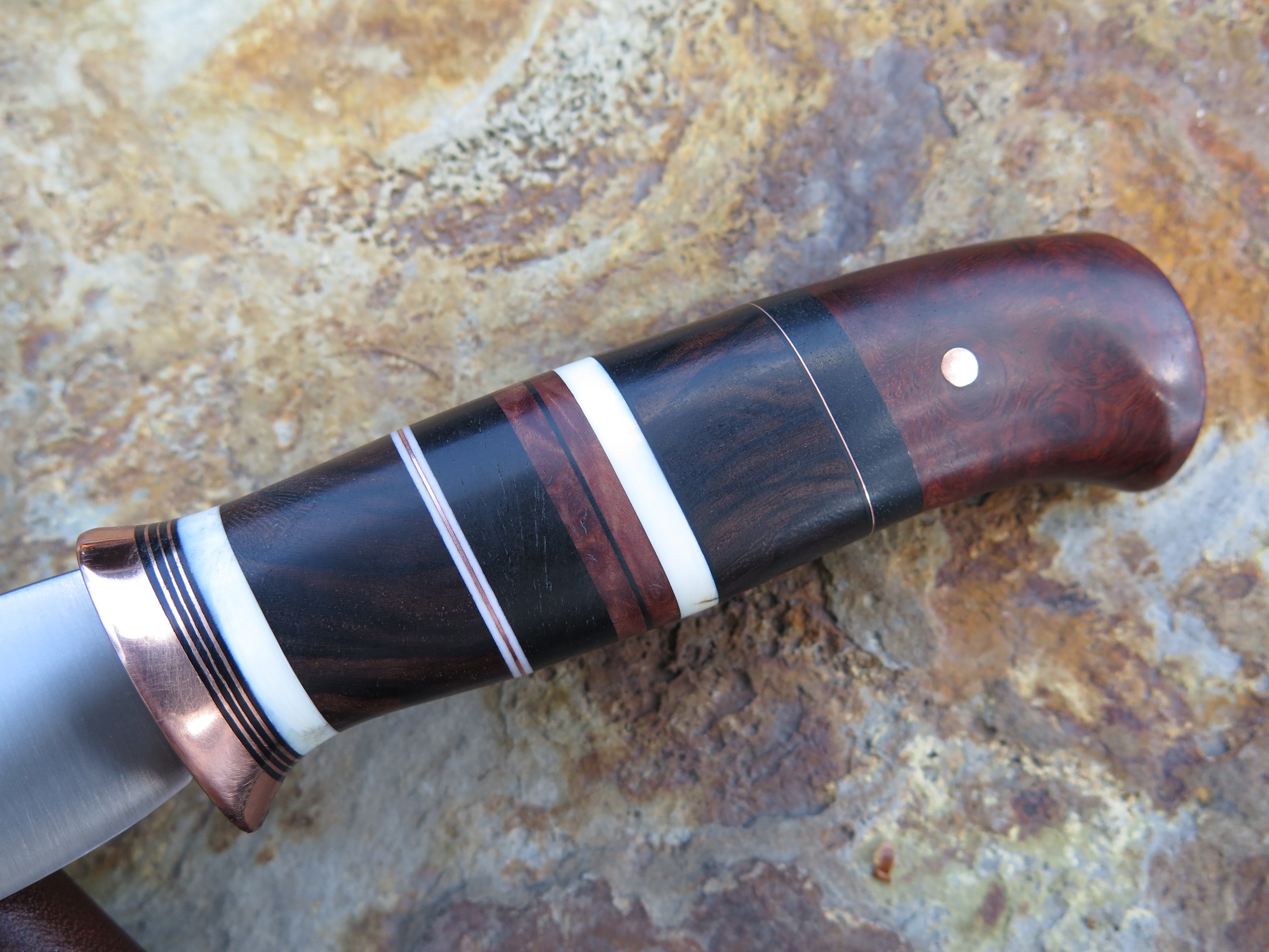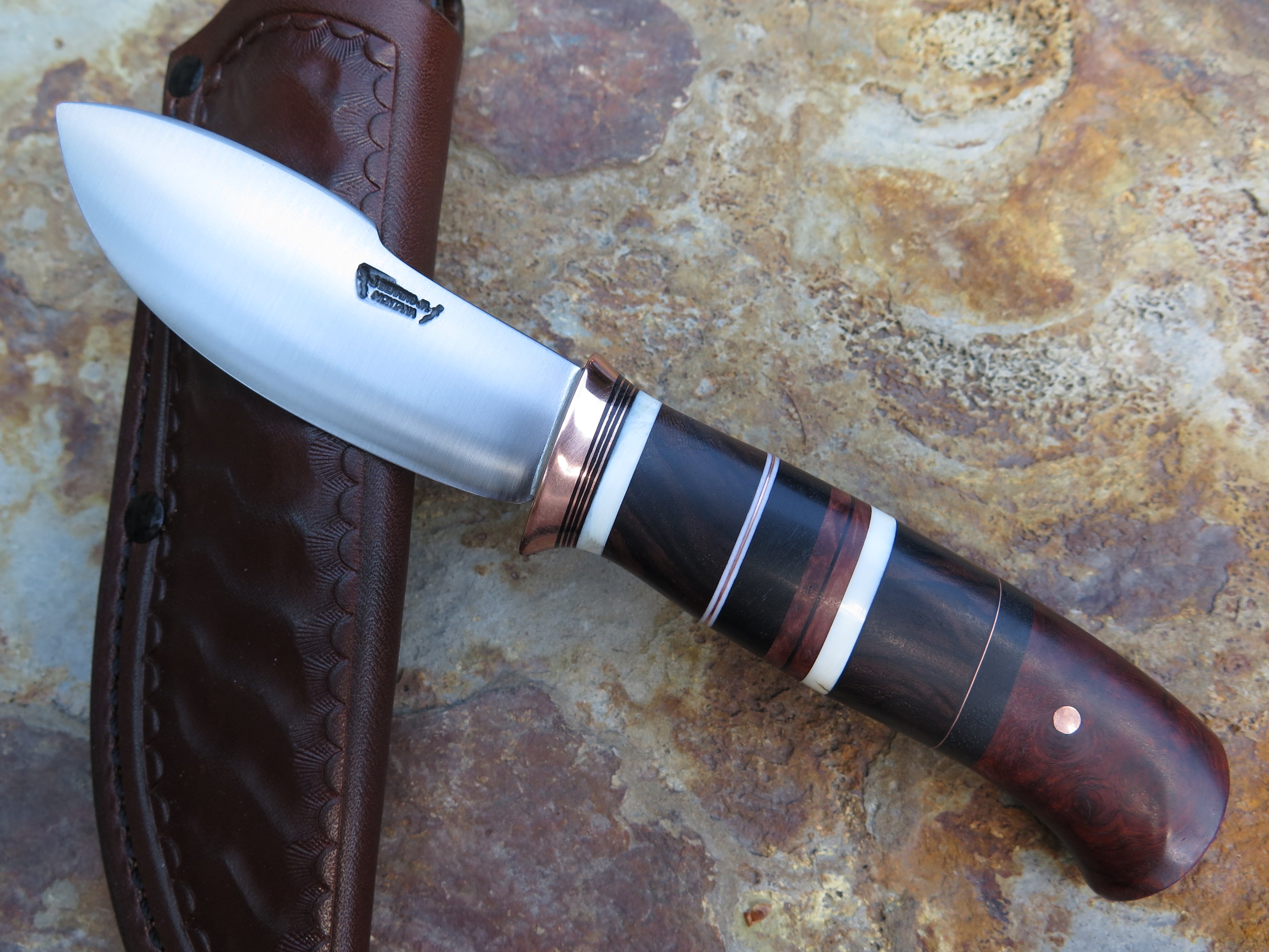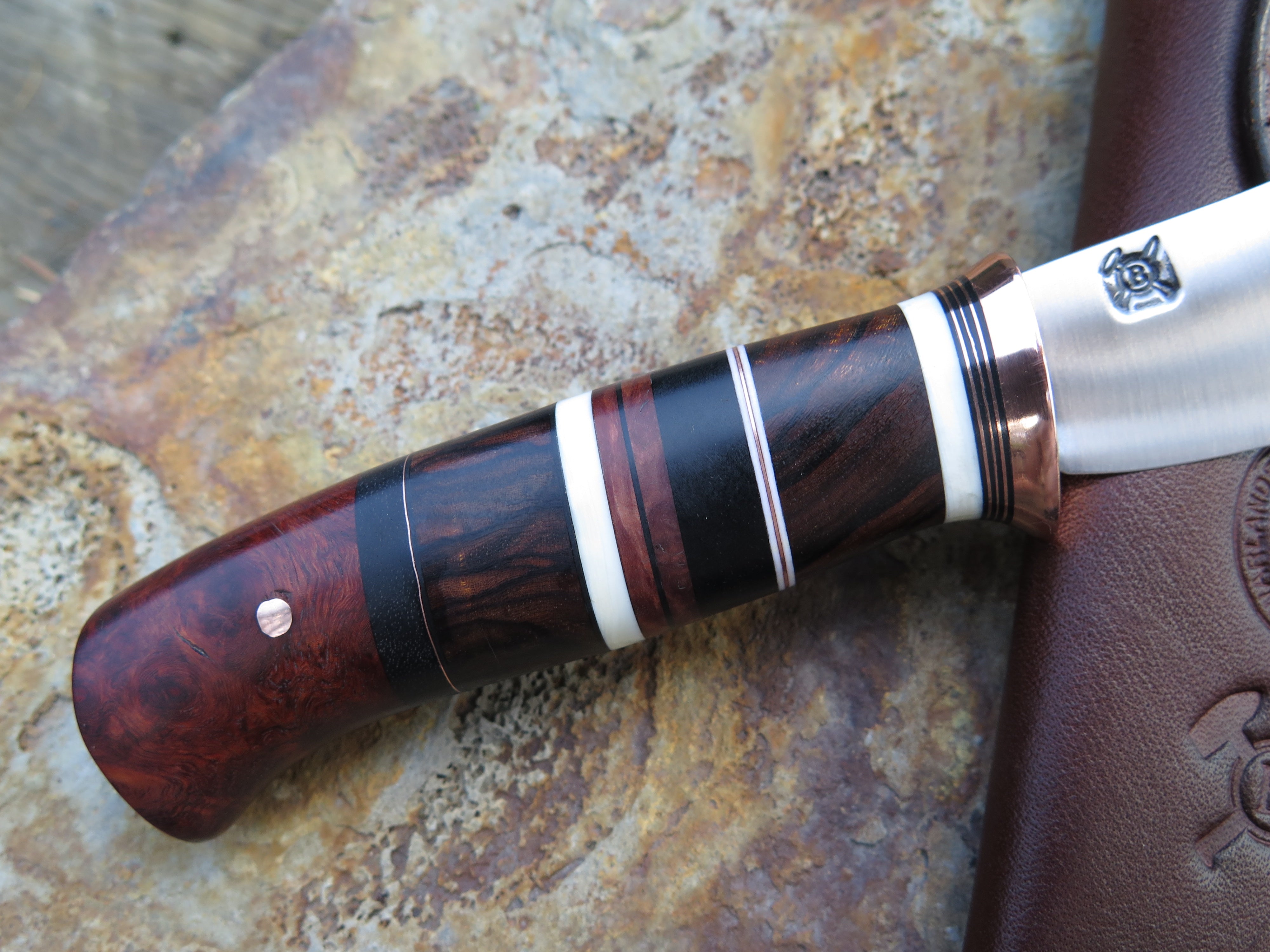This beautiful new Canoe knife from Behring Made© is hand forged from 1/8" thick high carbon 01 tool steel and it measures 3 1/2" from tip to guard with a razor sharp convex grind. The copper guard is soldered in place above black and white fiber, copper, fossil walrus, maple, African ebony, and desert ironwood spacers as well as a premium Redwood burl butt that is pinned with copper. The overall length measures 7 3/4" and it comes in a tooled leather belt pouch sheath.