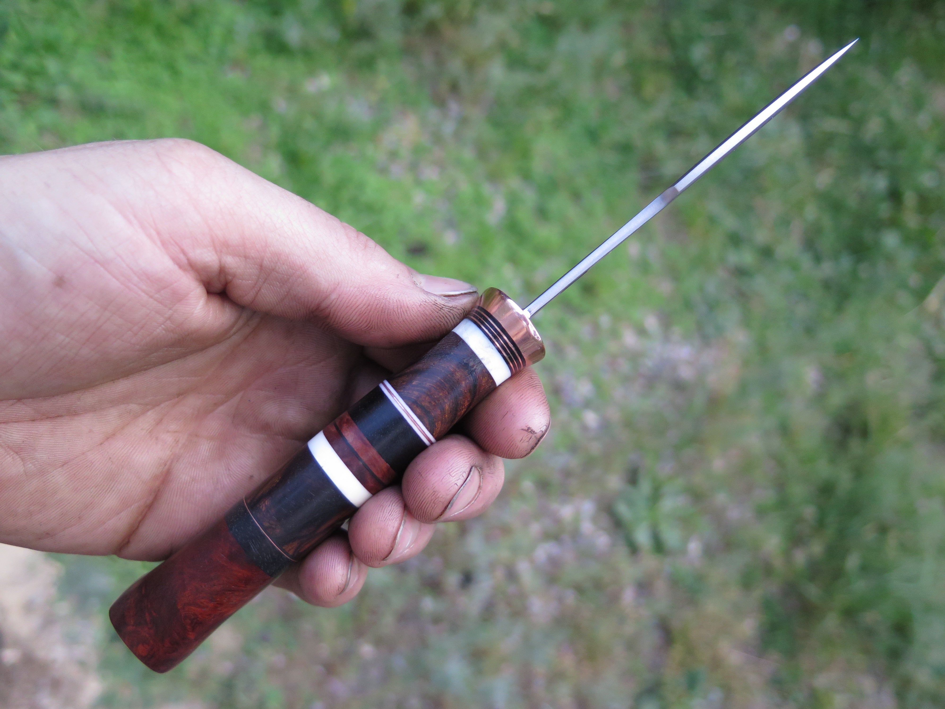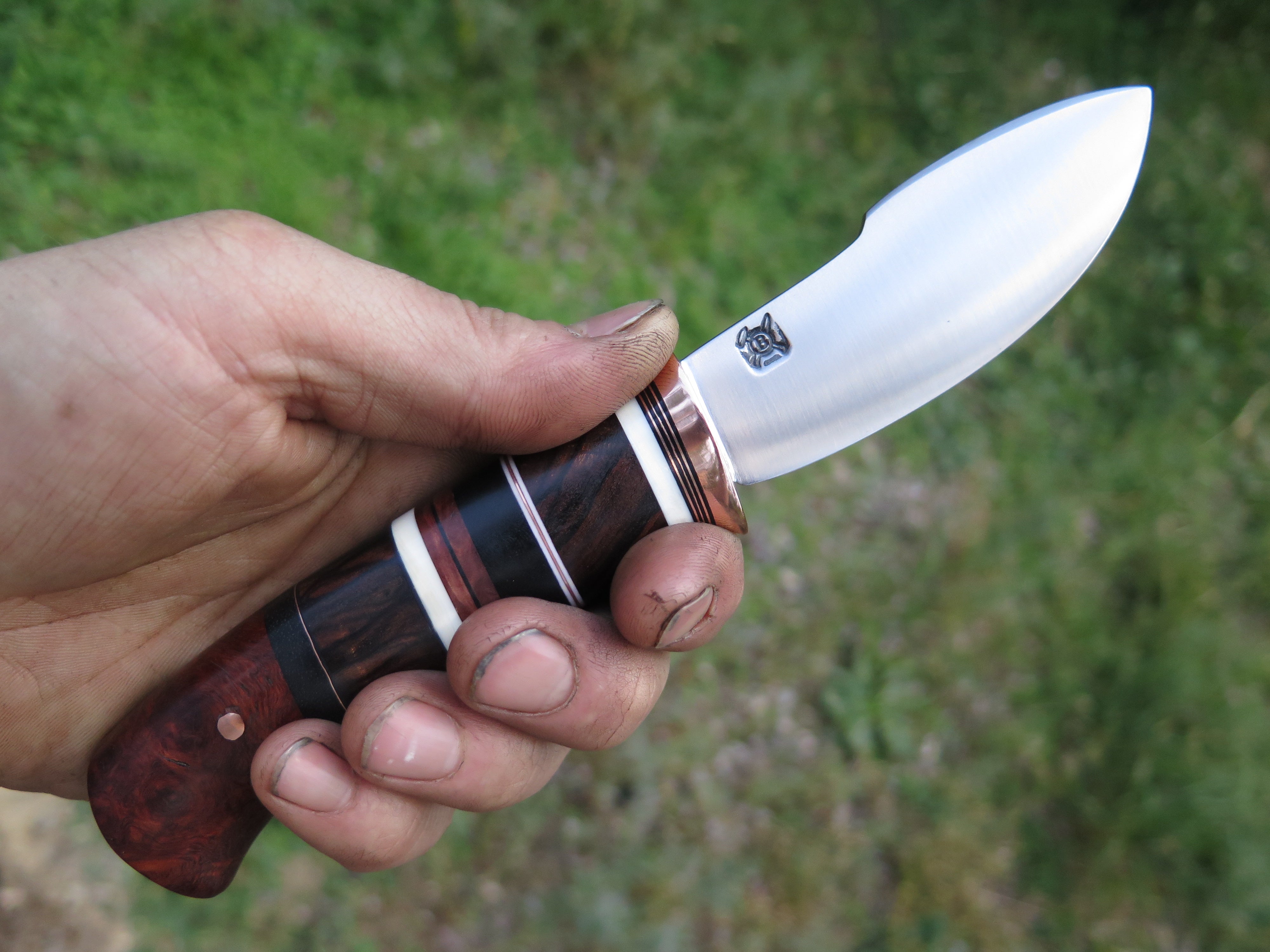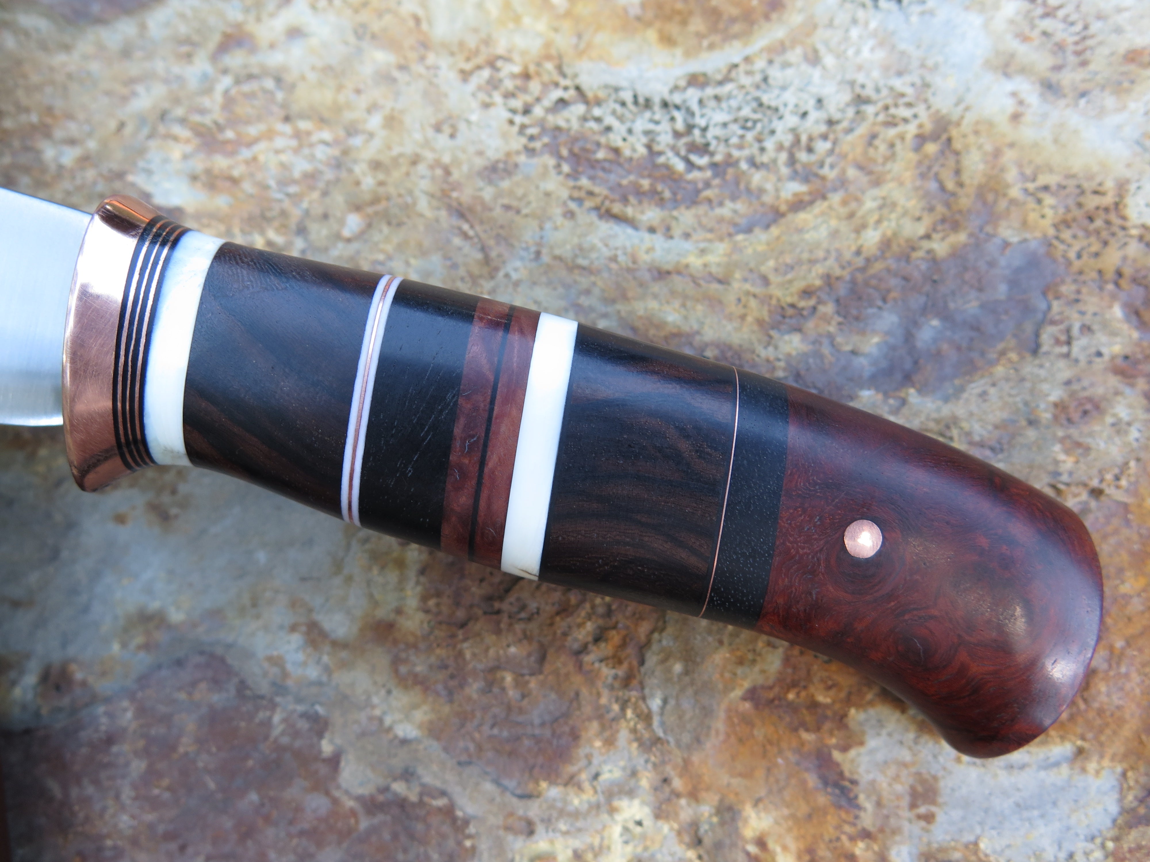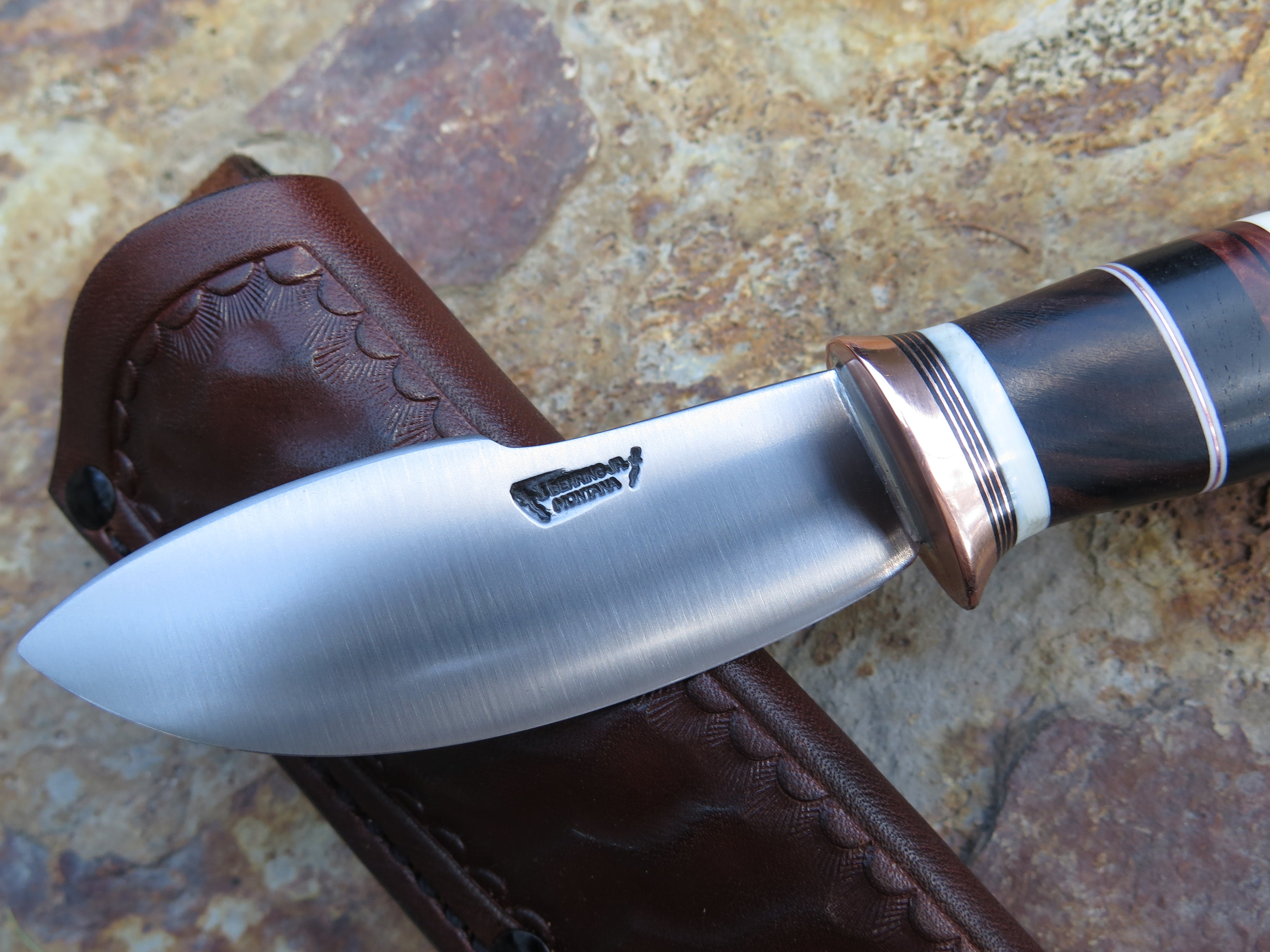 This beautiful new Canoe knife from Behring Made© is hand forged from 1/8" thick high carbon 01 tool steel and it measures 3 1/2" from tip to guard with a razor sharp convex grind. The copper guard is soldered in place above black and white fiber, copper, fossil walrus, maple, African ebony, and desert ironwood spacers as well as a premium Redwood burl butt that is pinned with copper. The overall length measures 7 3/4" and it comes in a tooled leather belt pouch sheath.