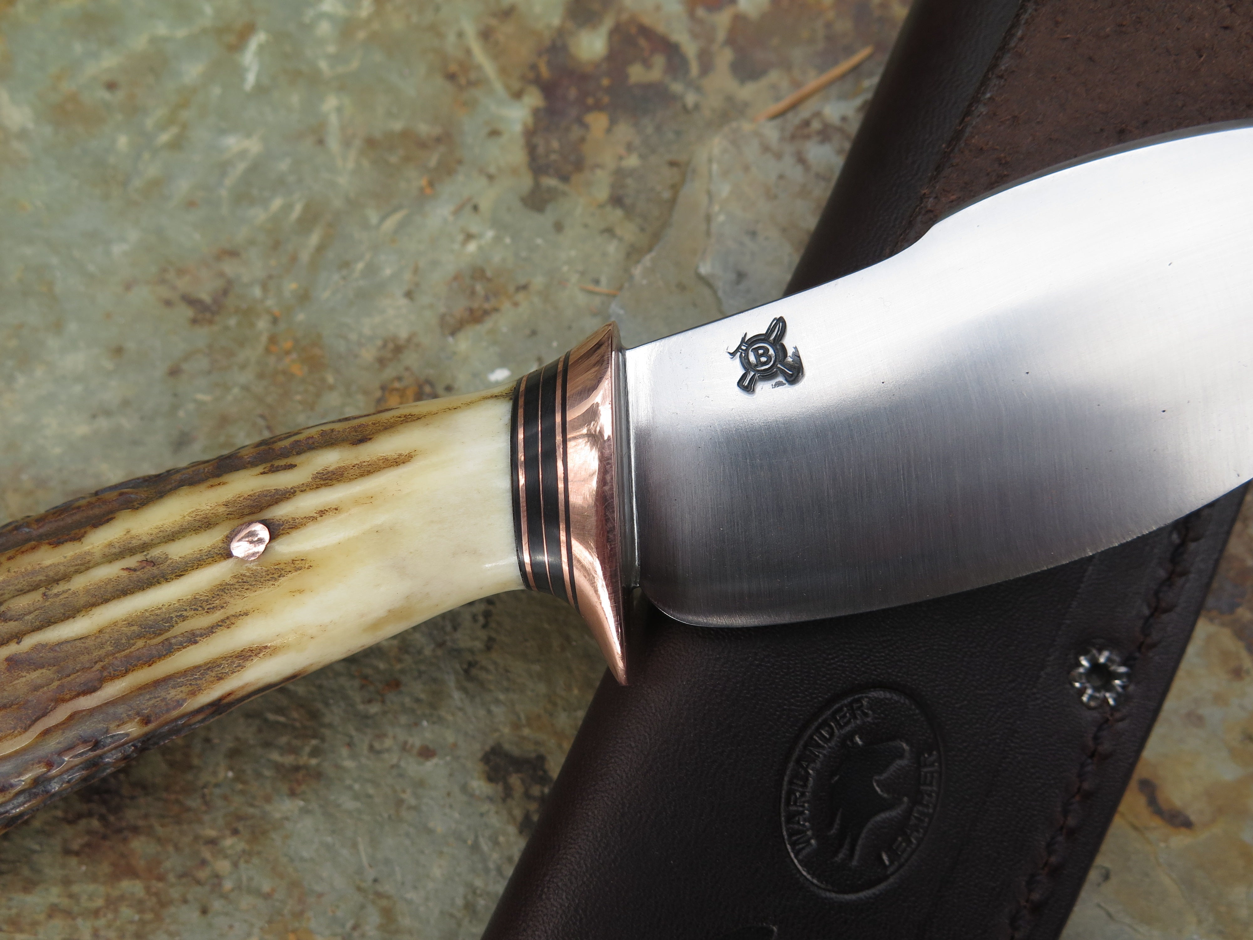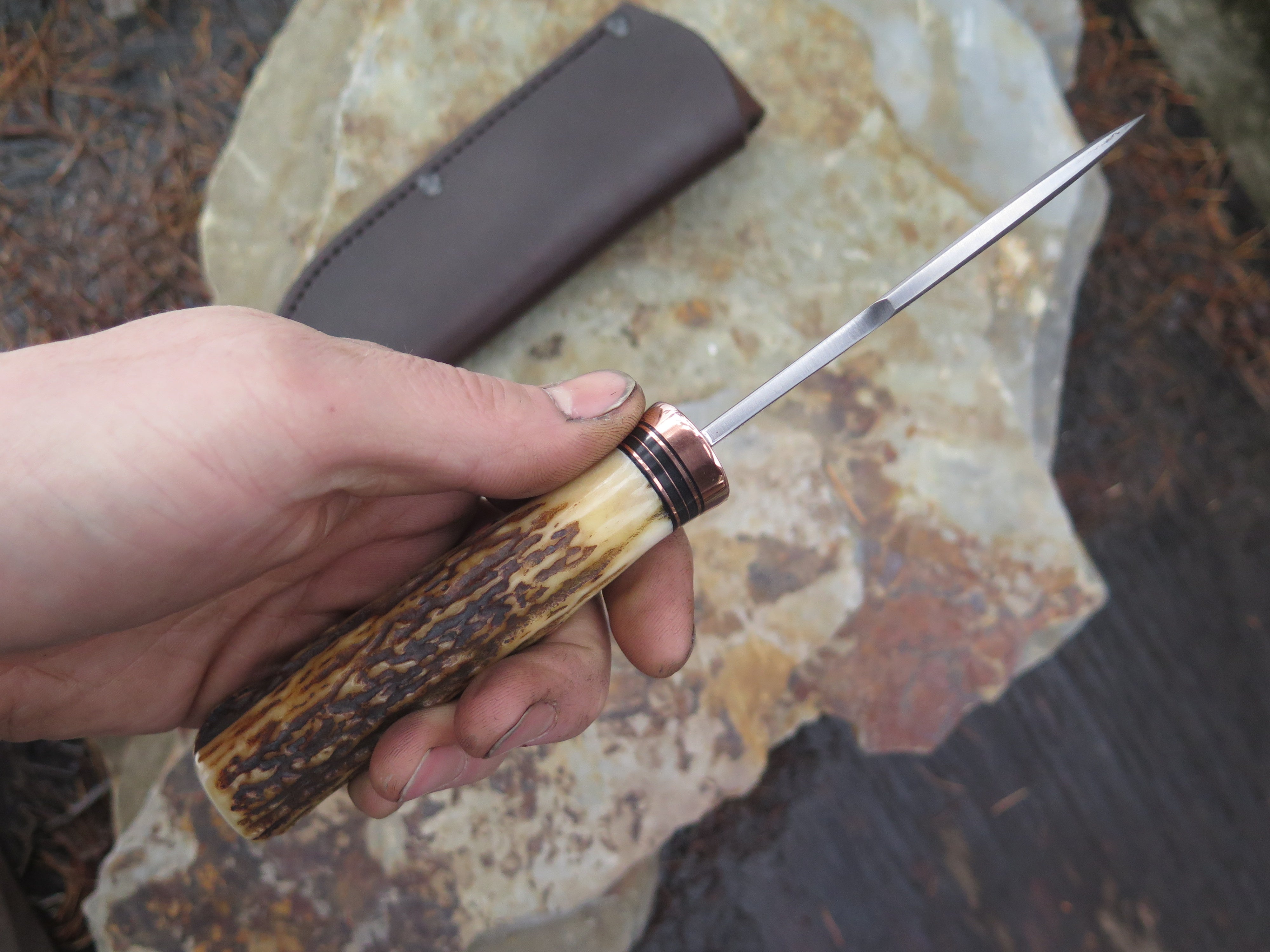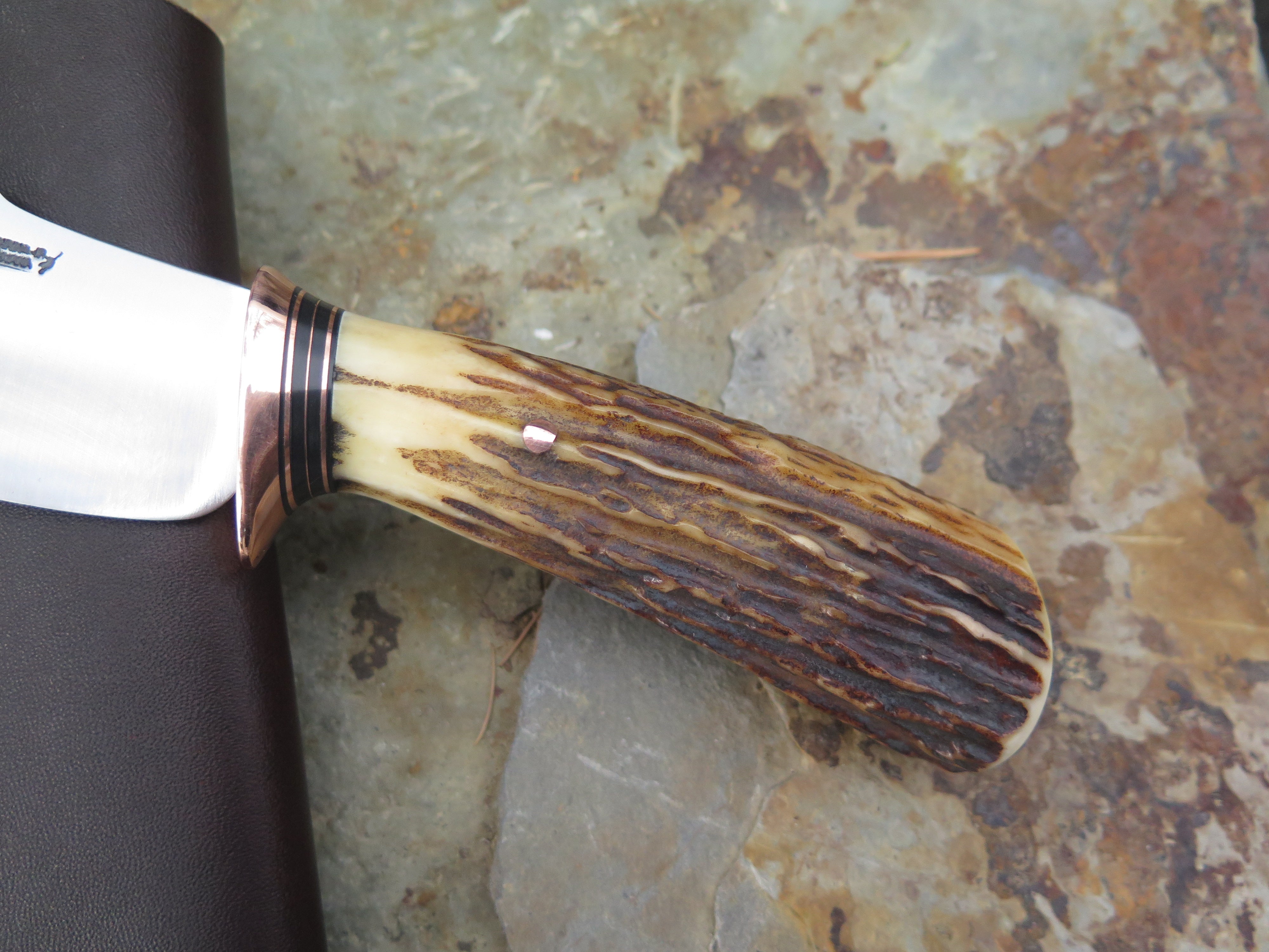 This instant classic from Behring Made© is the Canoe Knife. It's hand forged from 3/16" thick high carbon 01 tool steel and it measures 4" from tip to guard with a razor sharp true convex grind. The copper guard is soldered in place above a clean stack of black fiber and copper spacers with a premium sambar stag handle that's pinned through the tang with copper. The overall length measures 8 1/8" and it comes in a leather belt pouch sheath.