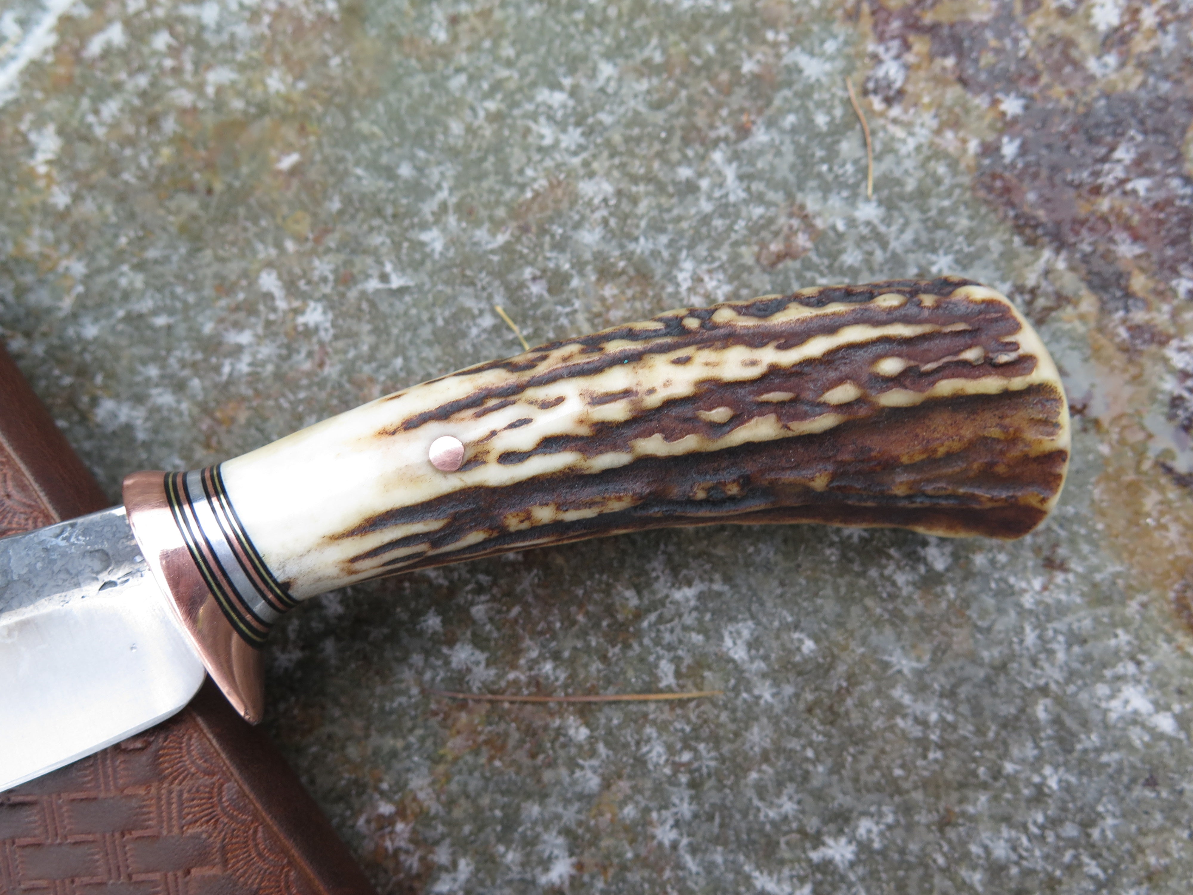 This beautiful new Canoe Knife from Behring Made© is hand forged from 3/16" thick high carbon 01 tool steel and measures 3 3/4" from tip to guard with a razor sharp hollow grind and our hammermark finish. The copper guard is soldered in place above black fiber, brass, copper and aluminum spacers as well as a premium sambar stag handle that's pinned through the tang with copper. The overall length measures right under 8" and it comes in a premium leather belt pouch sheath, though substitutions are available upon request.