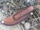 This new shape from Behring Made© is the Canoe Knife. Lightweight and versatile, it's an excellent field shape for when every ounce counts. It's hand forged from 1/8" thick high carbon 01 tool steel and measures 3 1/2" from tip to guard with a razor sharp convex grind. The brass guard is soldered in place above black, maroon and brass spacers. The premium sambar stag handle is pinned through the tang with brass and the overall length measures 7 3/4". Something as unique and cool as this could only come in a Mudbone sheath, and it will feature tooled imagery of an old handmade canoe.