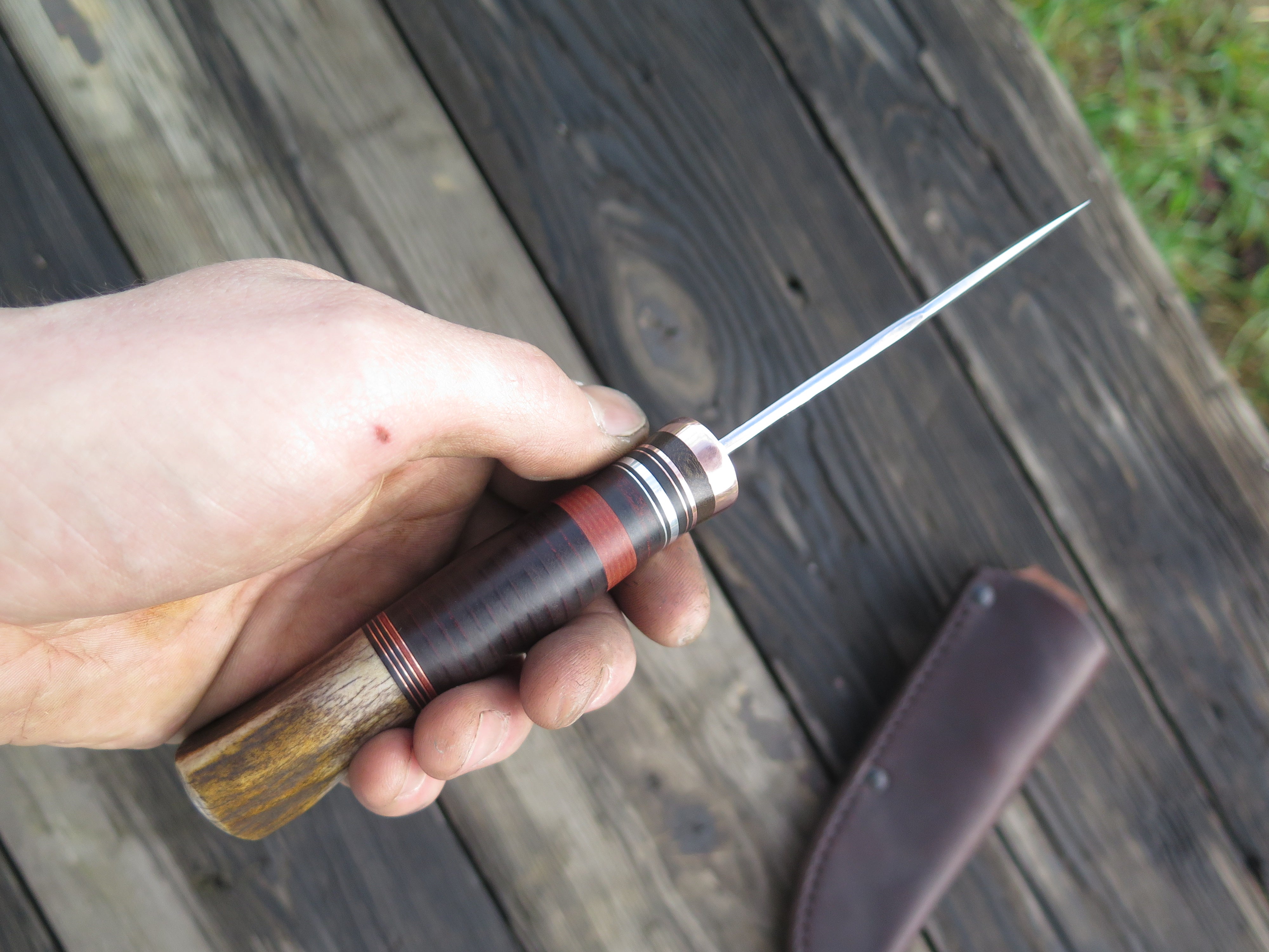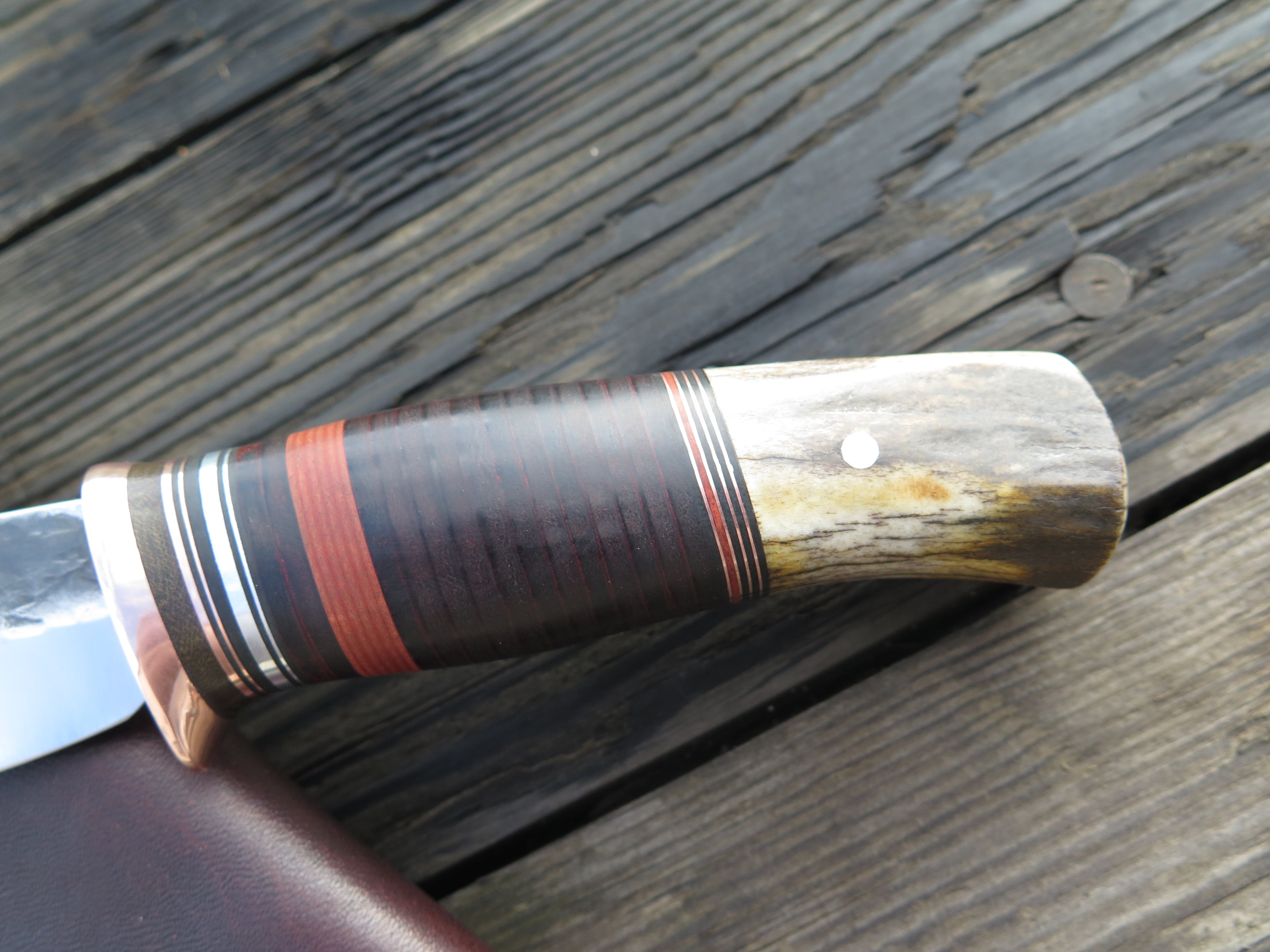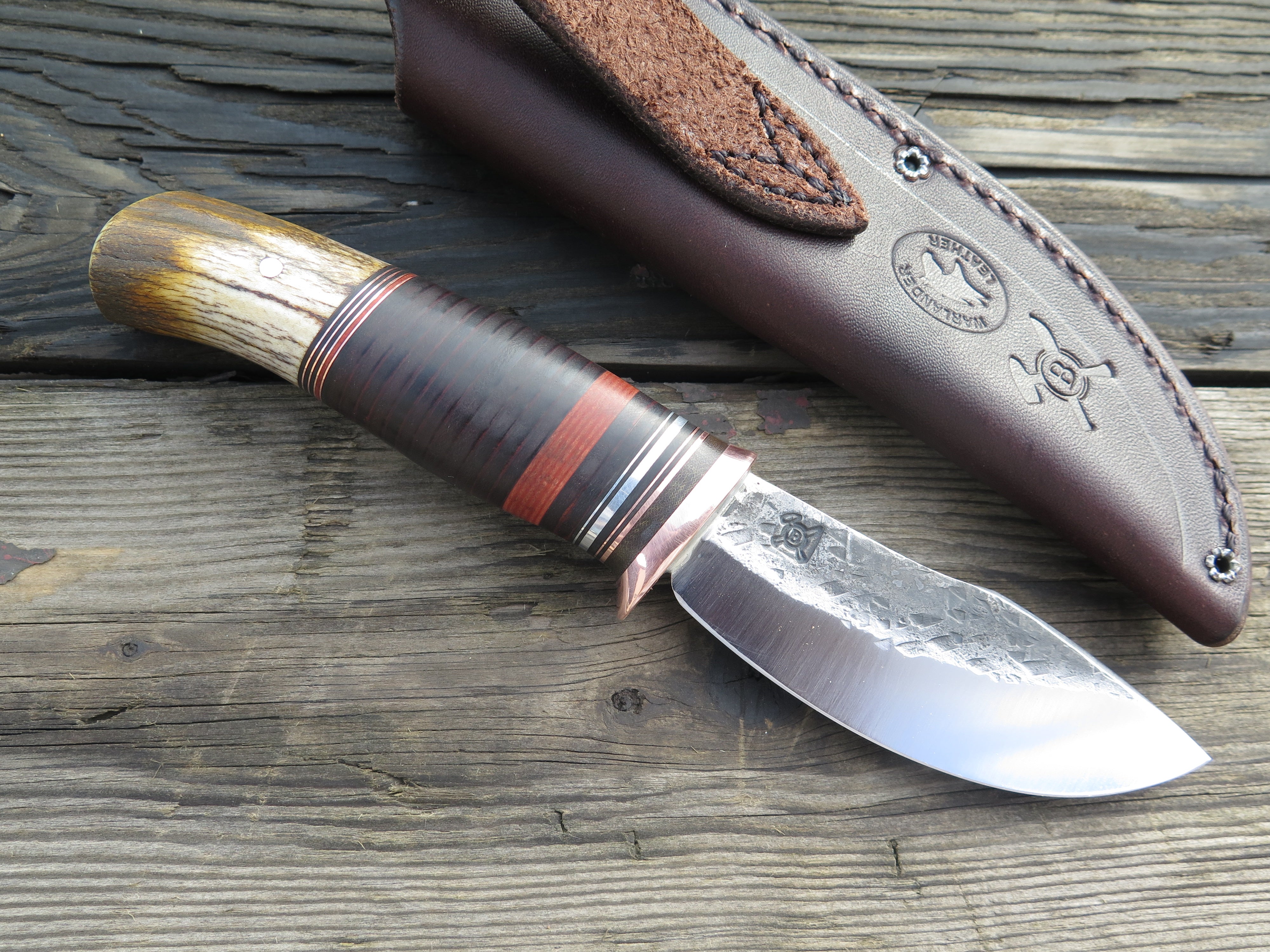 This new shape from Behring Made© is the Canoe Knife. Lightweight and versatile, it's an excellent field shape for when every ounce counts. It's hand forged from 1/8" thick high carbon 01 tool steel and measures 3 1/2" from tip to guard with a razor sharp hollow grind and our hammermark finish. The copper guard is soldered in place above green, black, maroon, aluminum and copper spacers. The premium whitetail stag handle is pinned through the tang with aluminum and the overall length measures 7 3/4". The canoe knife comes in your choice of the shown pouch sheath or an upgraded Mudbone sheath that will feature tooled imagery of an old handmade canoe.