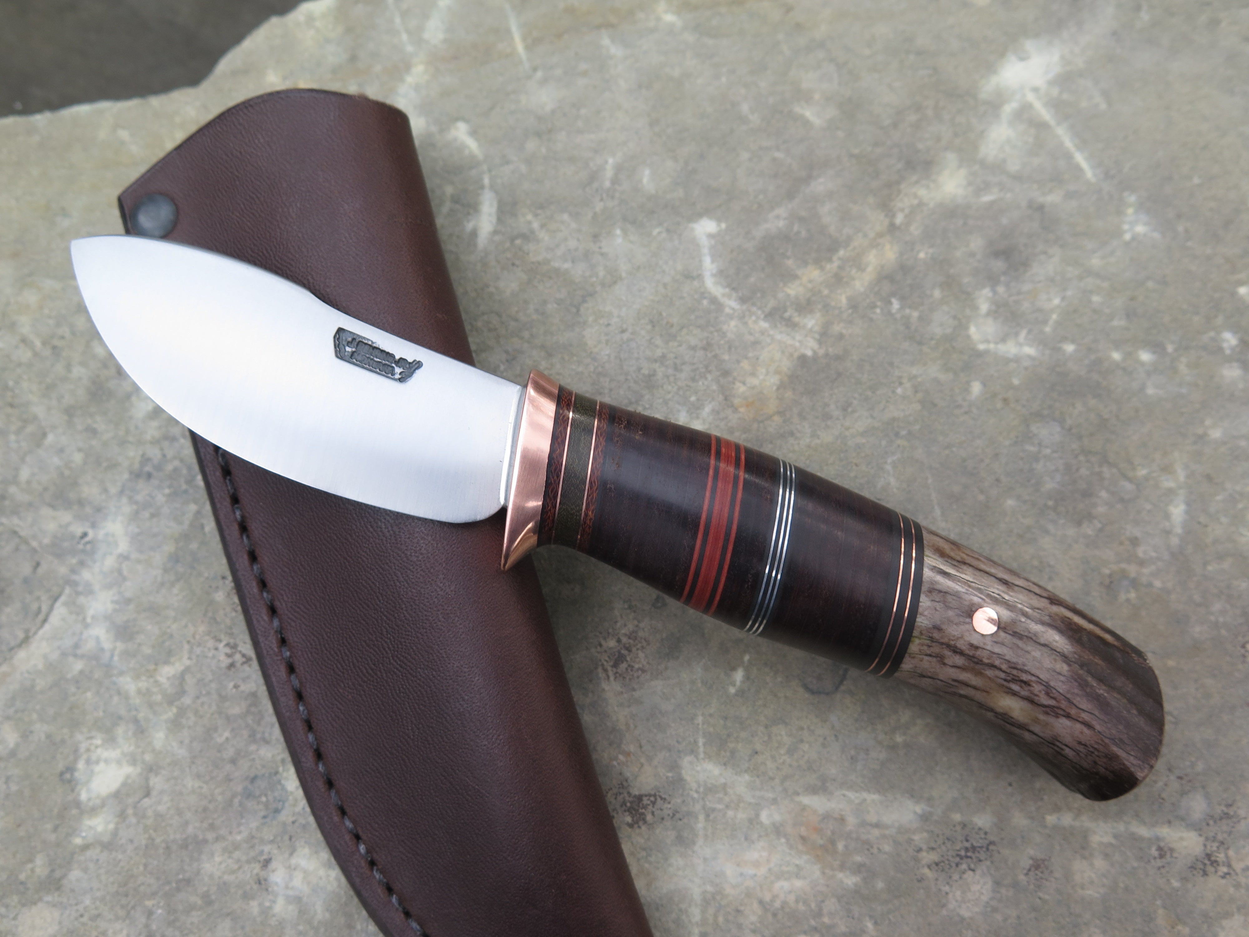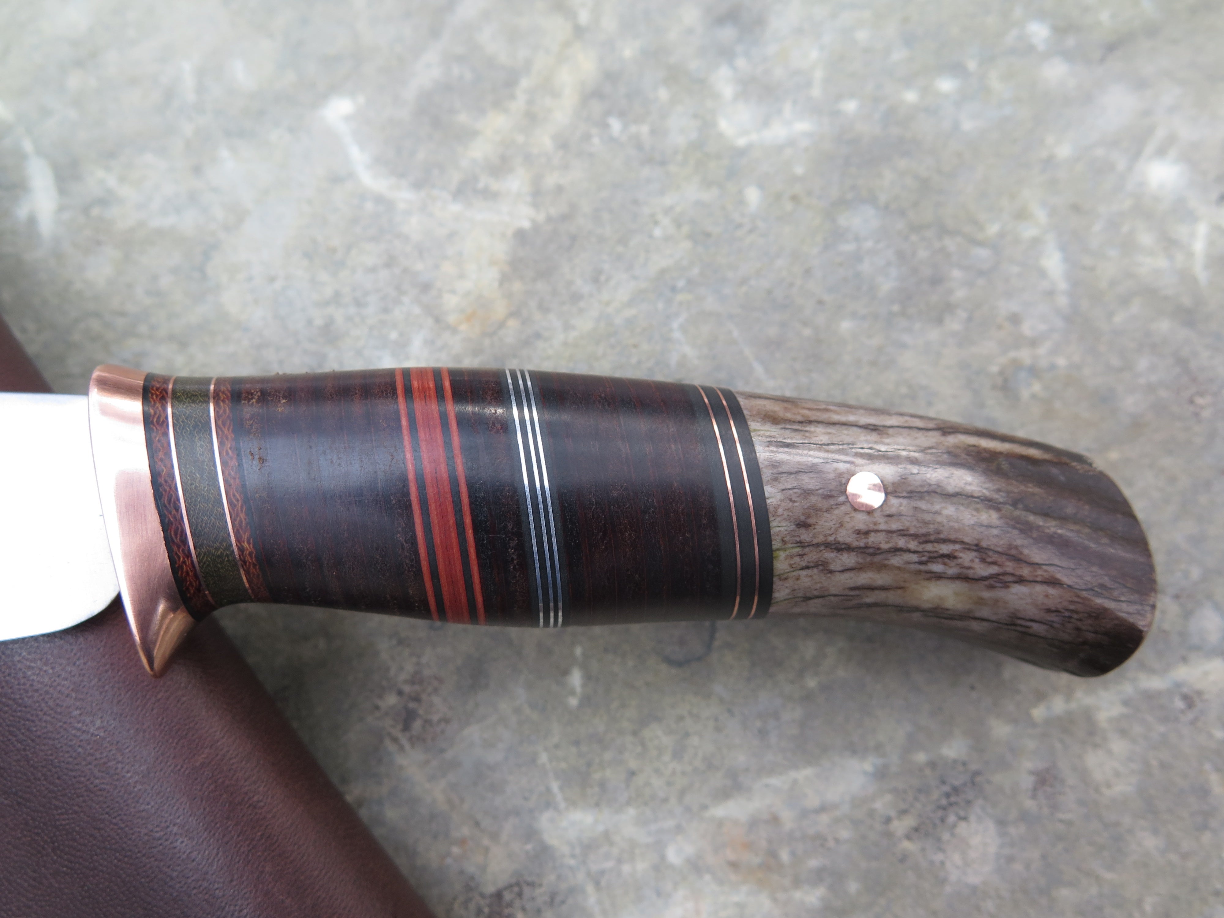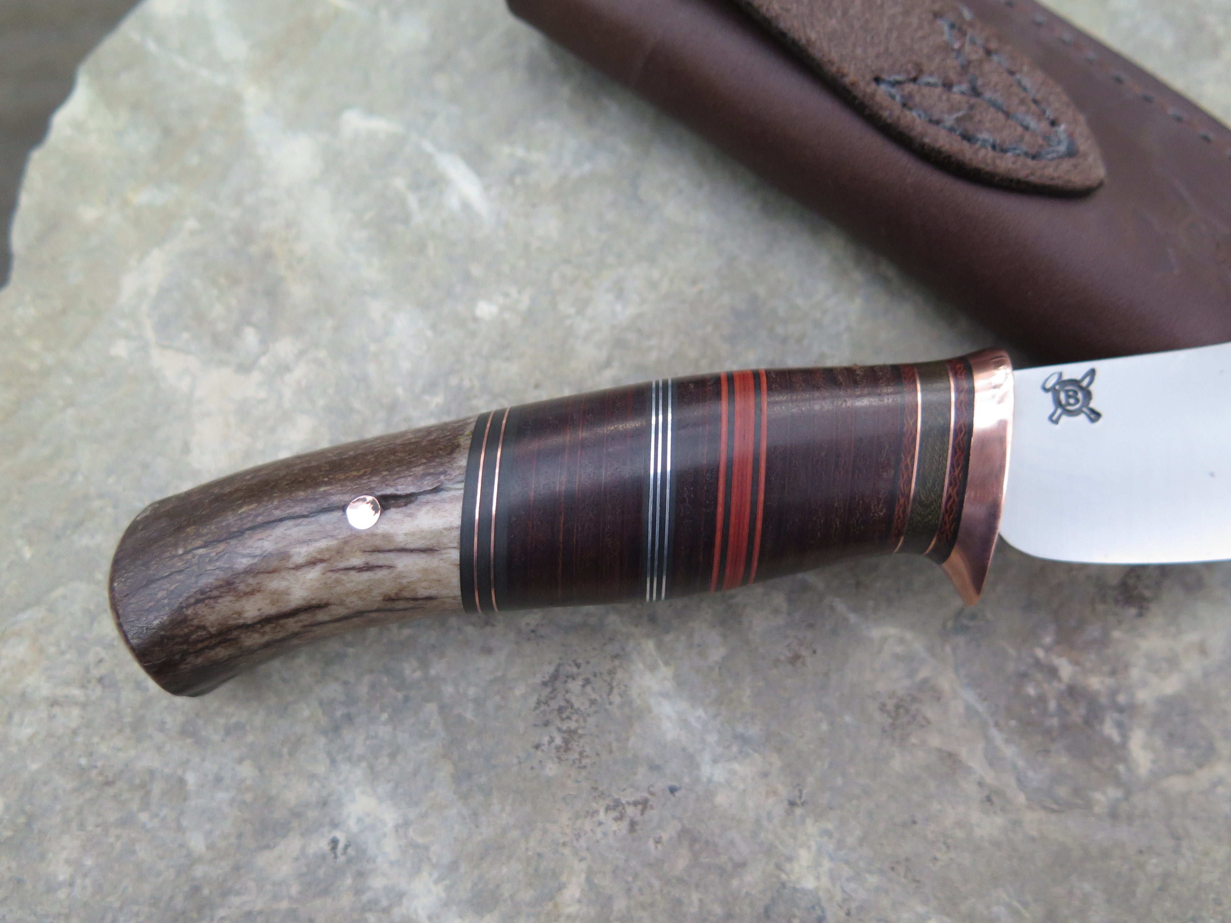 This beautiful Behring Made© Canoe Knife is hand forged from 1/8" thick high carbon 01 tool steel and it measures 3" from tip to guard with a razor sharp convex grind. The copper guard is soldered in place above black and maroon fiber, green and brown micarta, copper, aluminum and horsehide leather spacers in addition to the whitetail butt that's pinned through the tang with copper. The overall length measures 7" and it comes in a classic leather belt pouch sheath.