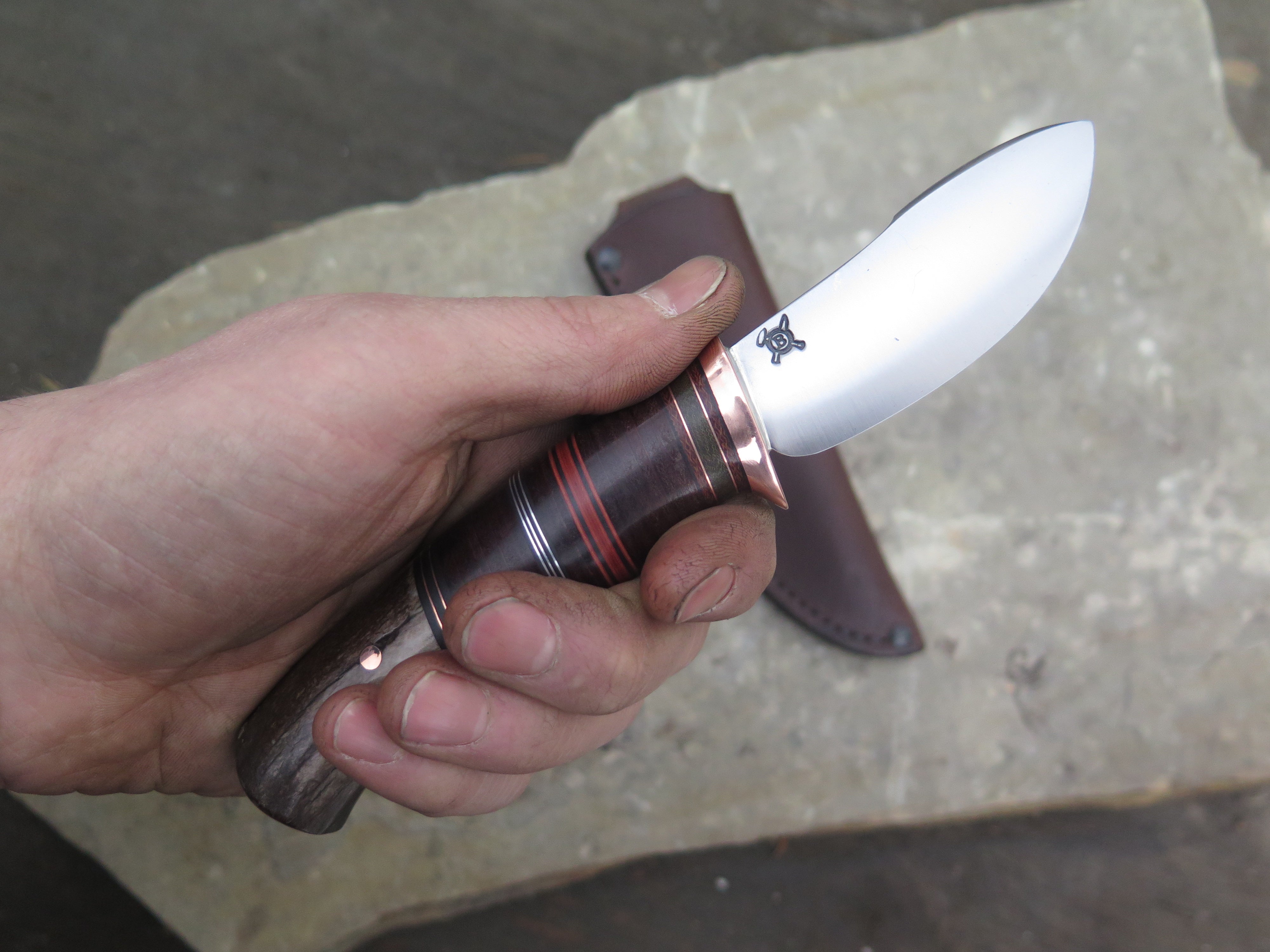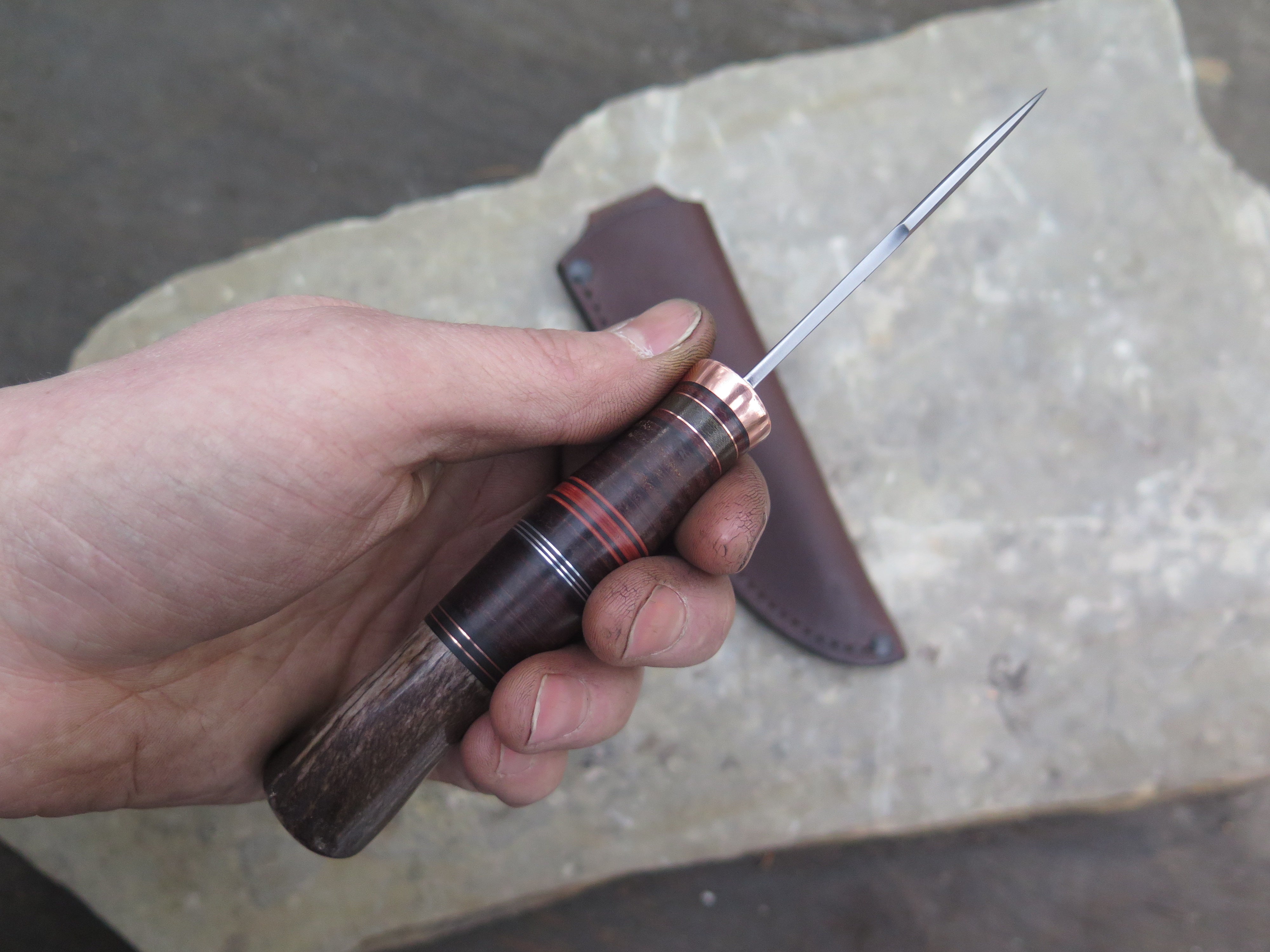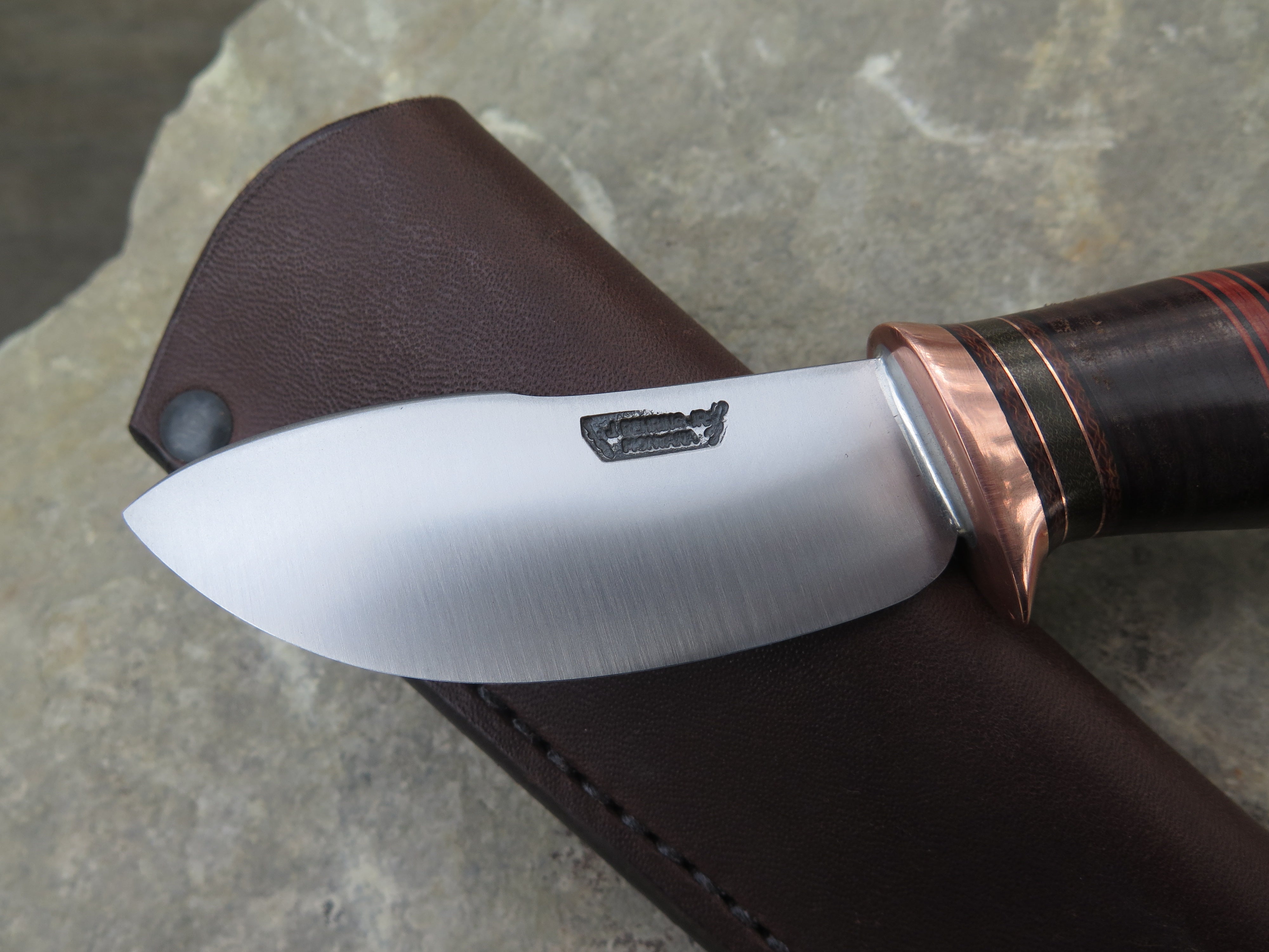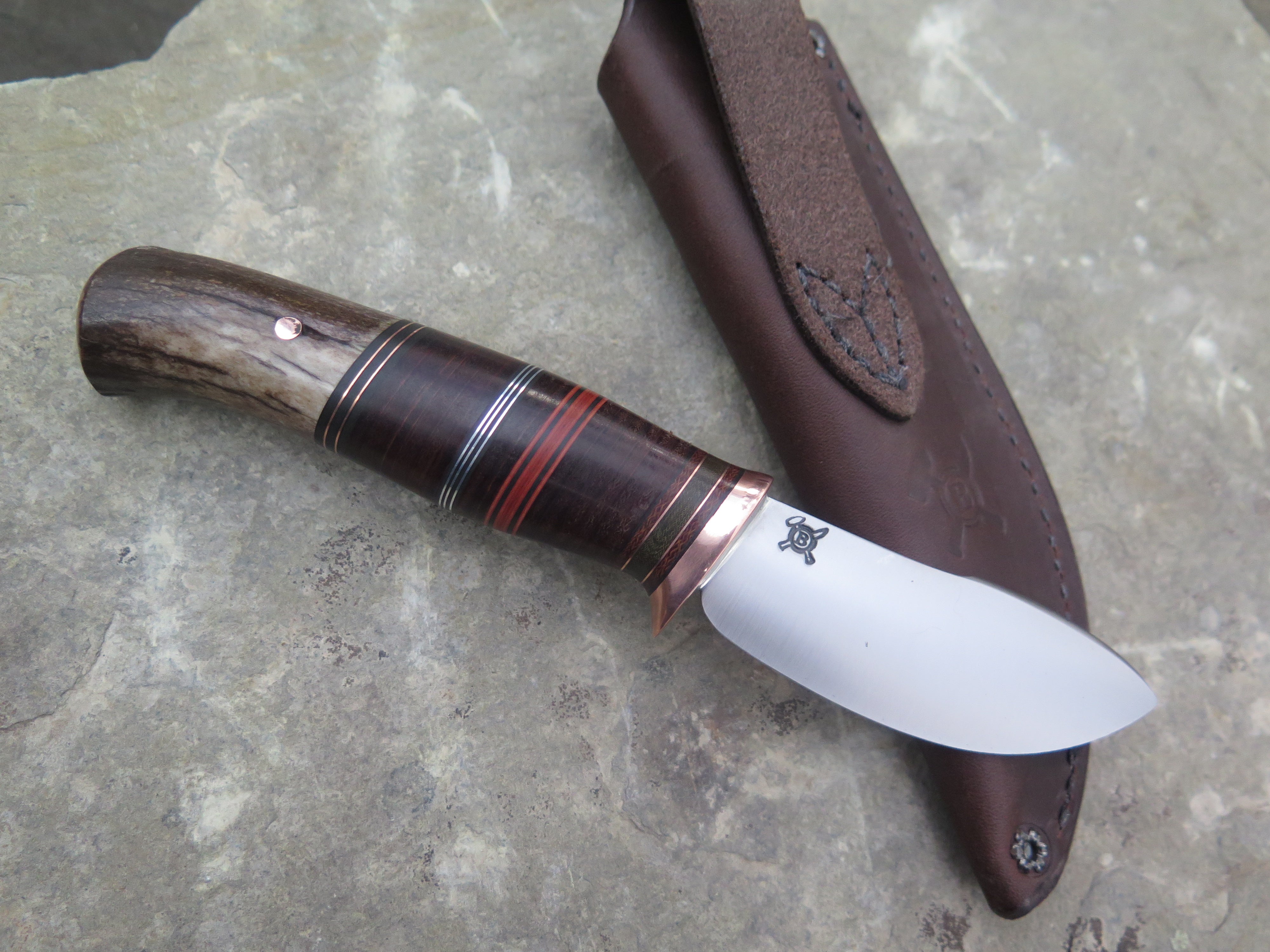 This beautiful Behring Made© Canoe Knife is hand forged from 1/8" thick high carbon 01 tool steel and it measures 3" from tip to guard with a razor sharp convex grind. The copper guard is soldered in place above black and maroon fiber, green and brown micarta, copper, aluminum and horsehide leather spacers in addition to the whitetail butt that's pinned through the tang with copper. The overall length measures 7" and it comes in a classic leather belt pouch sheath.