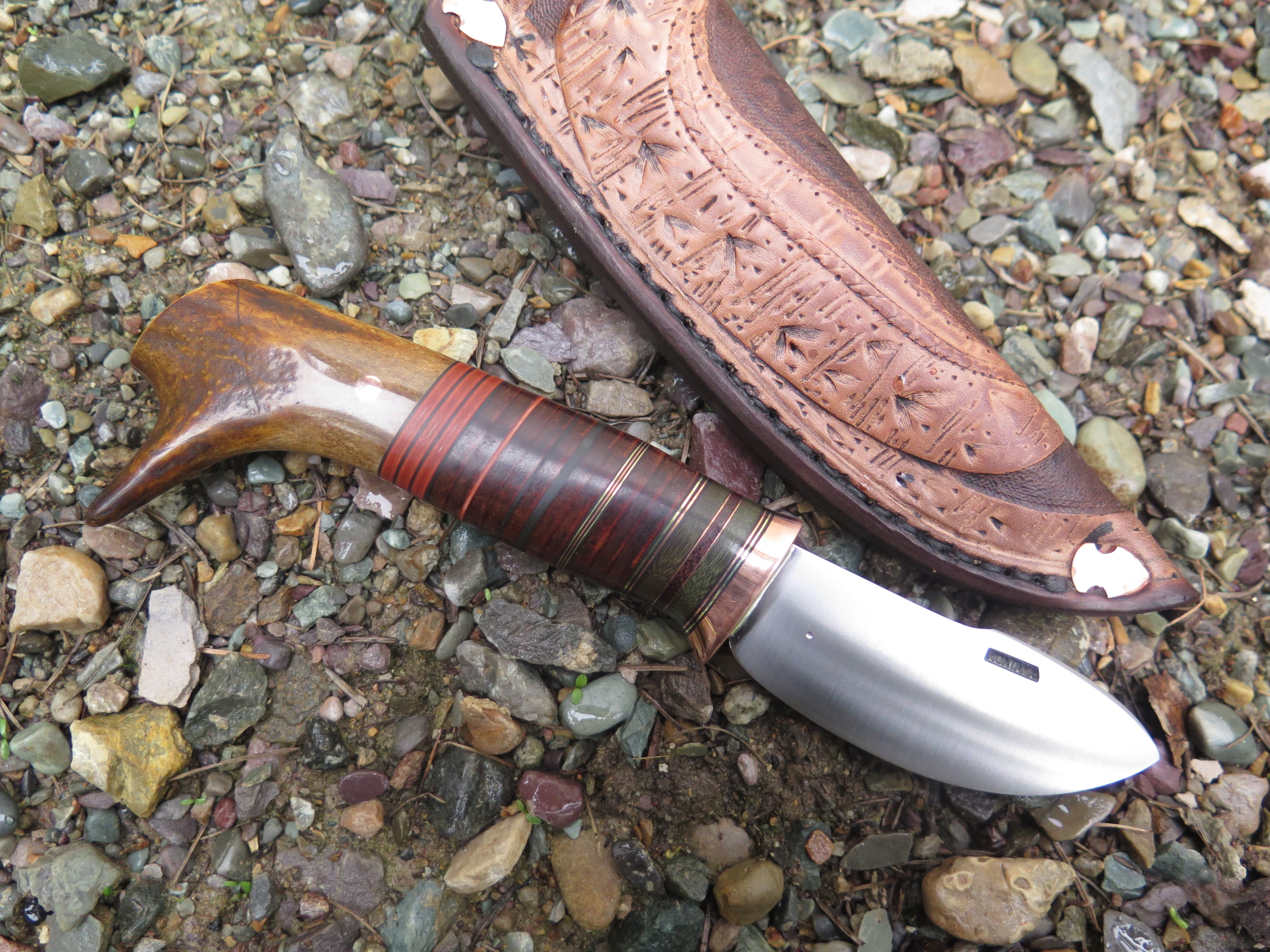 This beautiful new Canoe Knife from Behring Made© is hand forged from 1/8" thick high carbon 01 tool steel and it measures 2 3/4" from tip to guard with a razor sharp convex grind. The copper guard is soldered in place above black and maroon fiber, copper, brass, horsehide and green micarta spacers with a premium whitetail tine butt that's pinned with copper. Overall length is just about 7" and it comes in a custom Roger Mudbone Jones canoe pouch sheath.
